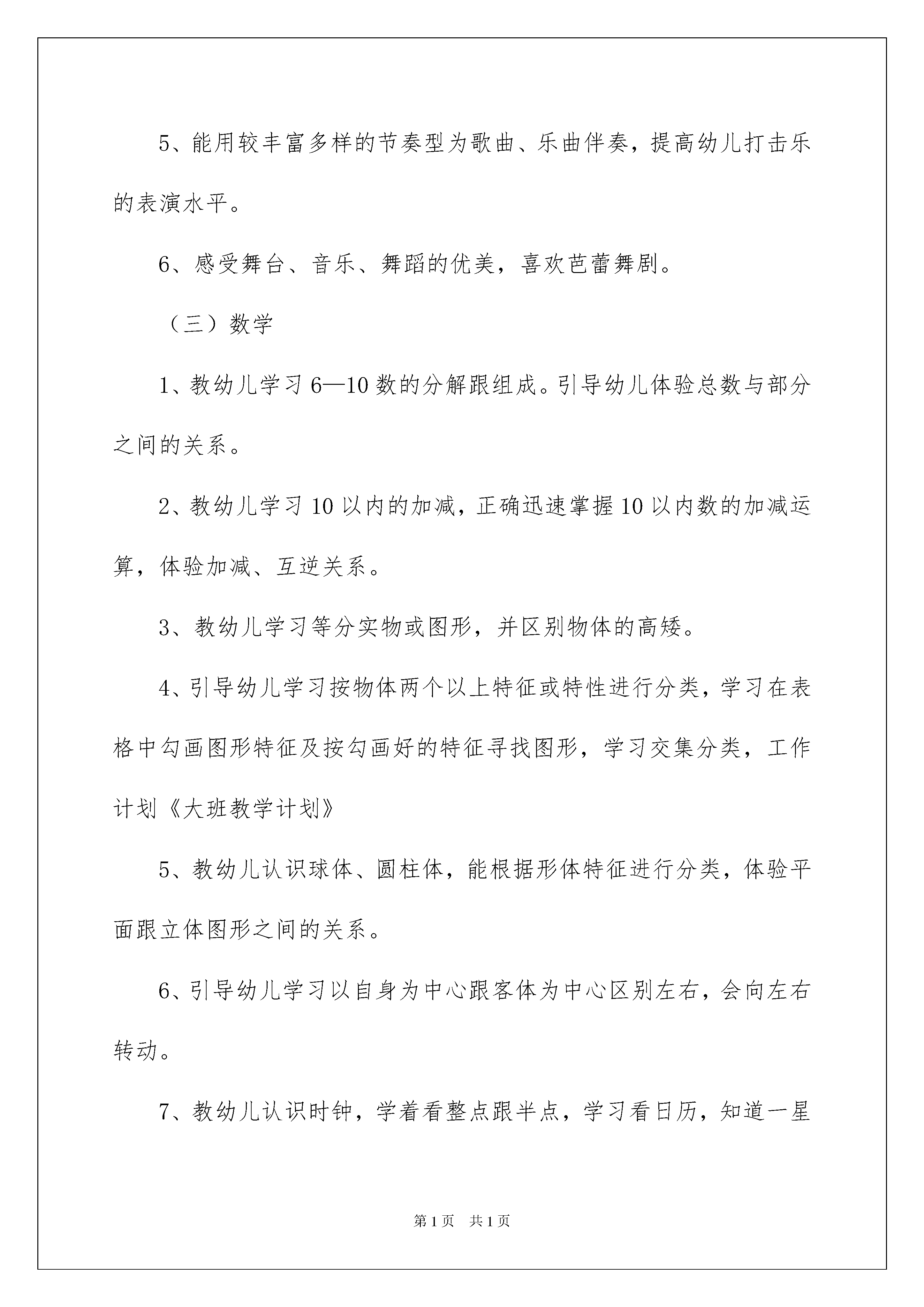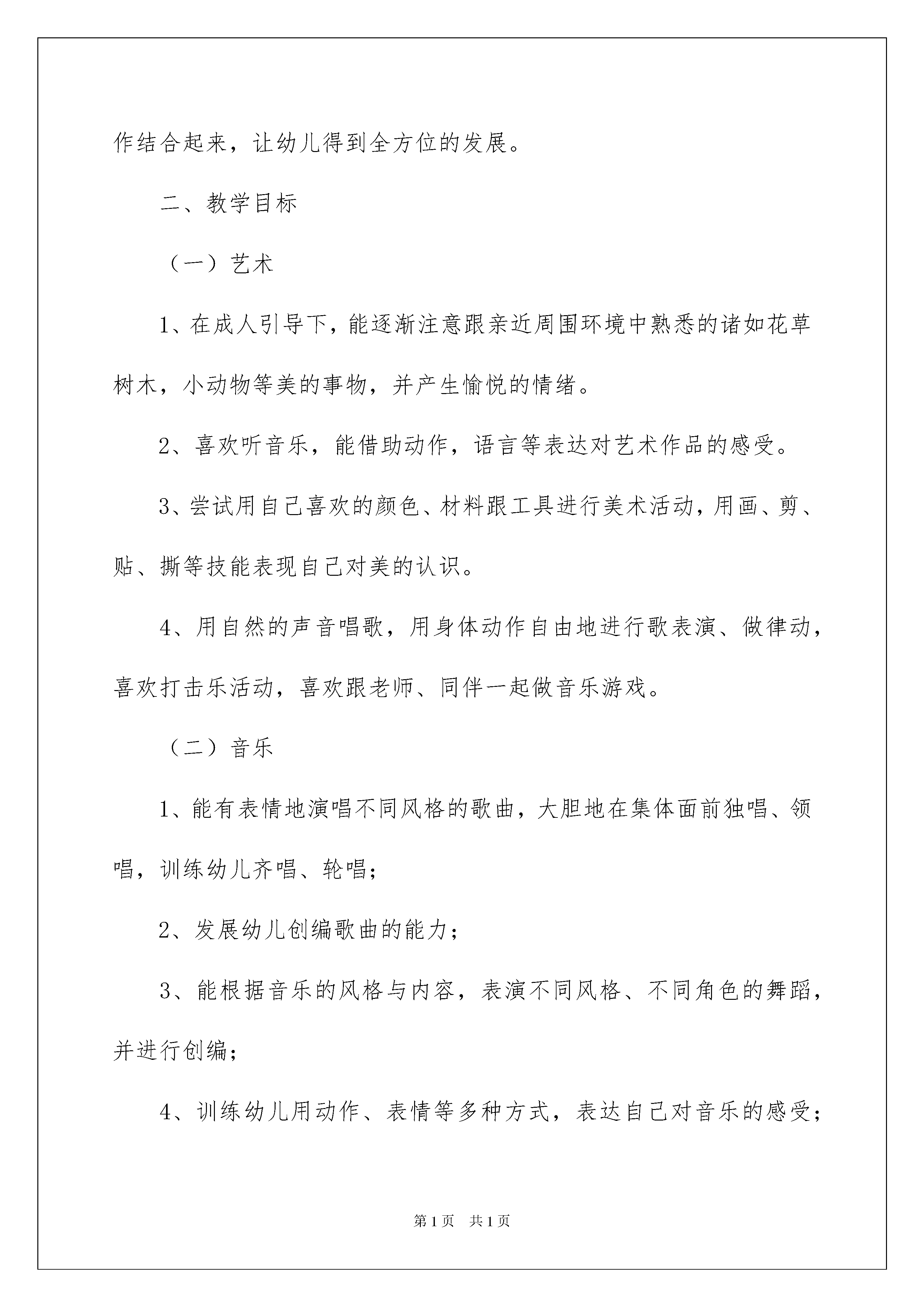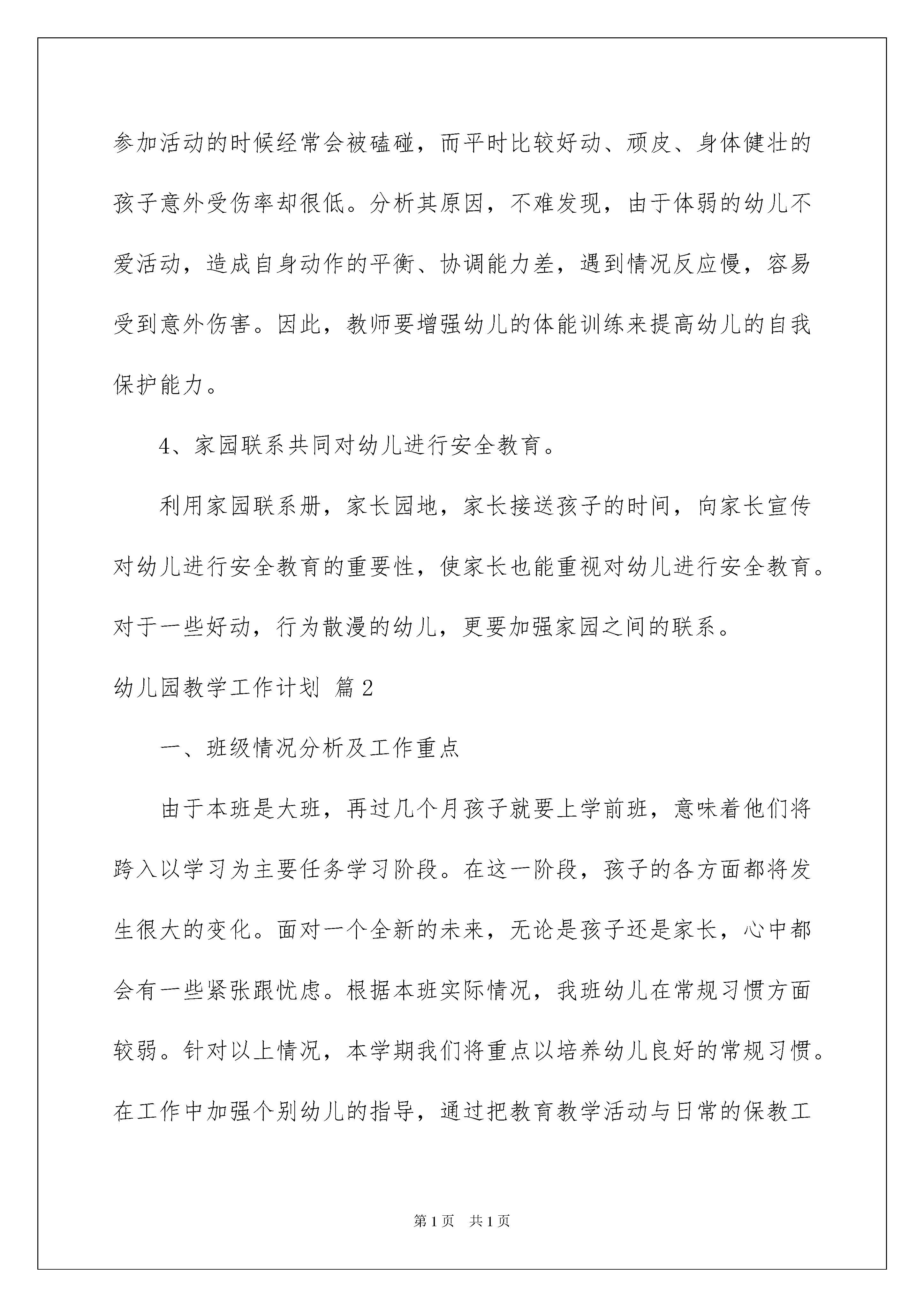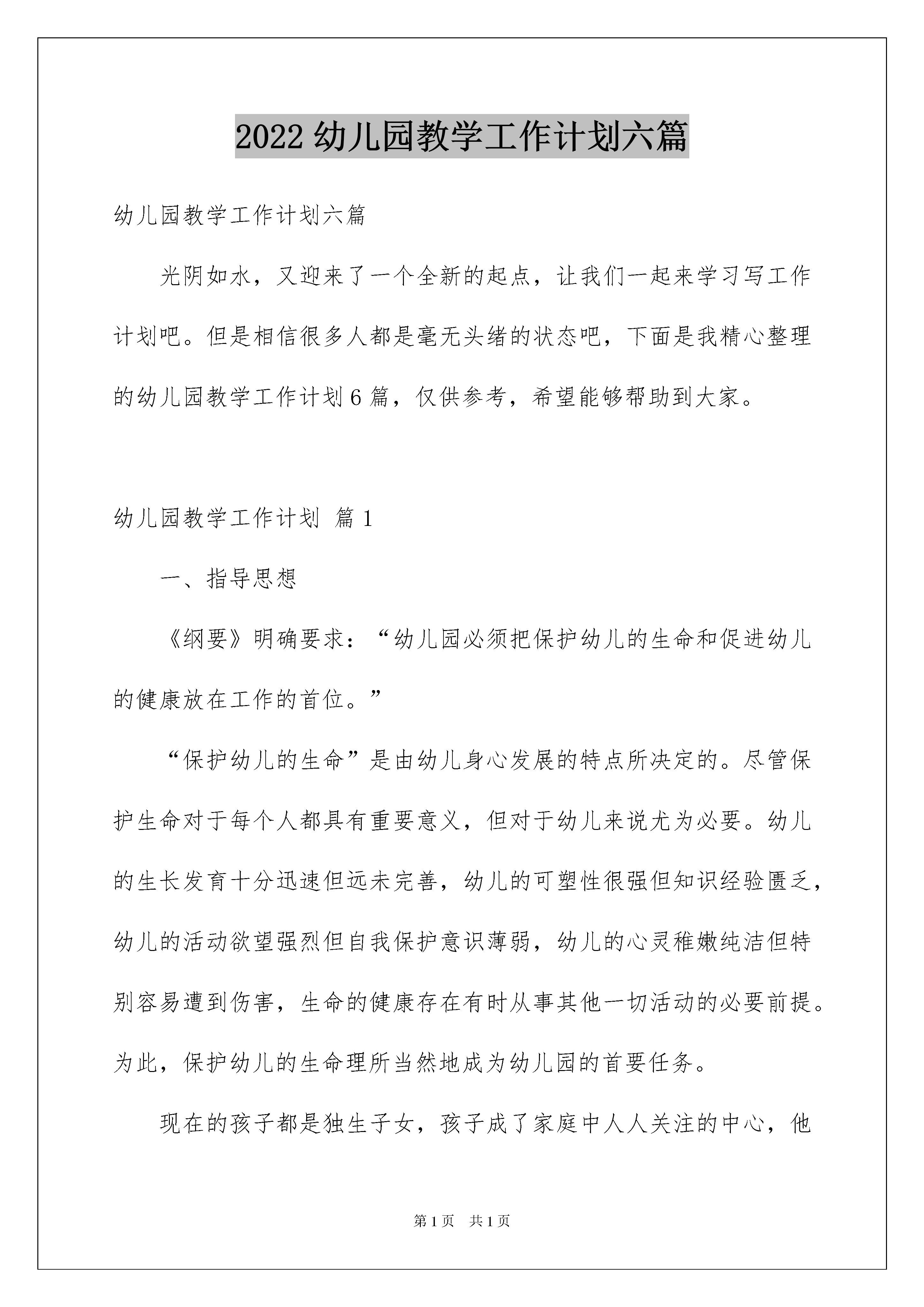 2022幼儿园教学工作计划六篇幼儿园教学工作计划六篇光阴如水,又迎来了一个全新的起点,让我们一起来学习写工作计划吧。但是相信很多人都是毫无头绪的状态吧,下面是我精心整理的幼儿园教学工作计划6篇,仅供参考,希望能够帮助到大家。幼儿园教学工作计划篇1一、指导思想《纲要》明确要求:“幼儿园必须把保护幼儿的生命和促进幼儿的健康放在工作的首位。”“保护幼儿的生命”是由幼儿身心发展的特点所决定的。尽管保护生命对于每个人都具有重要意义,但对于幼儿来说尤为必要。幼儿的生长发育十分迅速但远未完善,幼儿的可塑性很强但知识经验匮乏,幼儿的活动欲望强烈但自我保护意识薄弱,幼儿的心灵稚嫩纯洁但特别容易遭到伤害,生命的健康存在有时从事其他一切活动的必要前提。为此,保护幼儿的生命理所当然地成为幼儿园的首要任务。现在的孩子都是独生子女,孩子成了家庭中人人关注的中心,他们的健康和安全时时刻刻牵动着教师、父母和祖辈的心。为保证幼儿的身体健康和生命安全,使孩子顺利成长,我们有必要制定一个安全计划,增强幼儿的安全意识,提高幼儿的保护自身的能力。二、具体措施1、增强幼儿的自我保护意识。幼儿生活经验少,阅历浅,但又好奇,好探索,什么都想动一动、摸一摸、尝一尝,在活动中无力预测自己的行为可能引起的危险性,因此,事故常常会发生,作为教师要从防拐骗、防摔伤、防吞塞异物、防电、防交通事故等几方面进行教育,不断提高幼儿的自身保护的意识和能力。2、加强晨检力度,消除事故隐患。教师要加强晨间检查力度,教育幼儿不带危险品到幼儿园(如别针、纽扣、尖针、小刀等物),防止异物落入鼻腔、口腔等,每天晨检时要注意幼儿带的物品。定期对玩具进行检查、消毒,如发现损坏及时修补或更新。3、加强身体锻炼,增强孩子体能。在日常生活中,我们经常会发现这样的情况:一些体弱的孩子在参加活动的时候经常会被磕碰,而平时比较好动、顽皮、身体健壮的孩子意外受伤率却很低。分析其原因,不难发现,由于体弱的幼儿不爱活动,造成自身动作的平衡、协调能力差,遇到情况反应慢,容易受到意外伤害。因此,教师要增强幼儿的体能训练来提高幼儿的自我保护能力。4、家园联系共同对幼儿进行安全教育。利用家园联系册,家长园地,家长接送孩子的时间,向家长宣传对幼儿进行安全教育的重要性,使家长也能重视对幼儿进行安全教育。对于一些好动,行为散漫的幼儿,更要加强家园之间的联系。幼儿园教学工作计划篇2一、班级情况分析及工作重点由于本班是大班,再过几个月孩子就要上学前班,意味着他们将跨入以学习为主要任务学习阶段。在这一阶段,孩子的各方面都将发生很大的变化。面对一个全新的未来,无论是孩子还是家长,心中都会有一些紧张跟忧虑。根据本班实际情况,我班幼儿在常规习惯方面较弱。针对以上情况,本学期我们将重点以培养幼儿良好的常规习惯。在工作中加强个别幼儿的指导,通过把教育教学活动与日常的保教工作结合起来,让幼儿得到全方位的发展。二、教学目标(一)艺术1、在成人引导下,能逐渐注意跟亲近周围环境中熟悉的诸如花草树木,小动物等美的事物,并产生愉悦的情绪。2、喜欢听音乐,能借助动作,语言等表达对艺术作品的感受。3、尝试用自己喜欢的颜色、材料跟工具进行美术活动,用画、剪、贴、撕等技能表现自己对美的认识。4、用自然的声音唱歌,用身体动作自由地进行歌表演、做律动,喜欢打击乐活动,喜欢跟老师、同伴一起做音乐游戏。(二)音乐1、能有表情地演唱不同风格的歌曲,大胆地在集体面前独唱、领唱,训练幼儿齐唱、轮唱;2、发展幼儿创编歌曲的能力;3、能根据音乐的风格与内容,表演不同风格、不同角色的舞蹈,并进行创编;4、训练幼儿用动作、表情等多种方式,表达自己对音乐的感受;5、能用较丰富多样的节奏型为歌曲、乐曲伴奏,提高幼儿打击乐的表演水平。6、感受舞台、音乐、舞蹈的优美,喜欢芭蕾舞剧。(三)数学1、教幼儿学习6—10数的分解跟组成。引导幼儿体验总数与部分之间的关系。2、教幼儿学习10以内的加减,正确迅速掌握10以内数的加减运算,体验加减、互逆关系。3、教幼儿学习等分实物或图形,并区别物体的高矮。4、引导幼儿学习按物体两个以上特征或特性进行分类,学习在表格中勾画图形特征及按勾画好的特征寻找图形,学习交集分类,工作计划《大班教学计划》5、教幼儿认识球体、圆柱体,能根据形体特征进行分类,体验平面跟立体图形之间的关系。6、引导幼儿学习以自身为中心跟客体为中心区别左右,会向左右转动。7、教幼儿认识时钟,学着看整点跟半点,学习看日历,知道一星期中每天的名称跟顺序。8、培养幼儿能清楚讲述操作活动的过程跟结果。9、培养幼儿积极主动的进行数学活动,学会迅速,有条理的摆放、