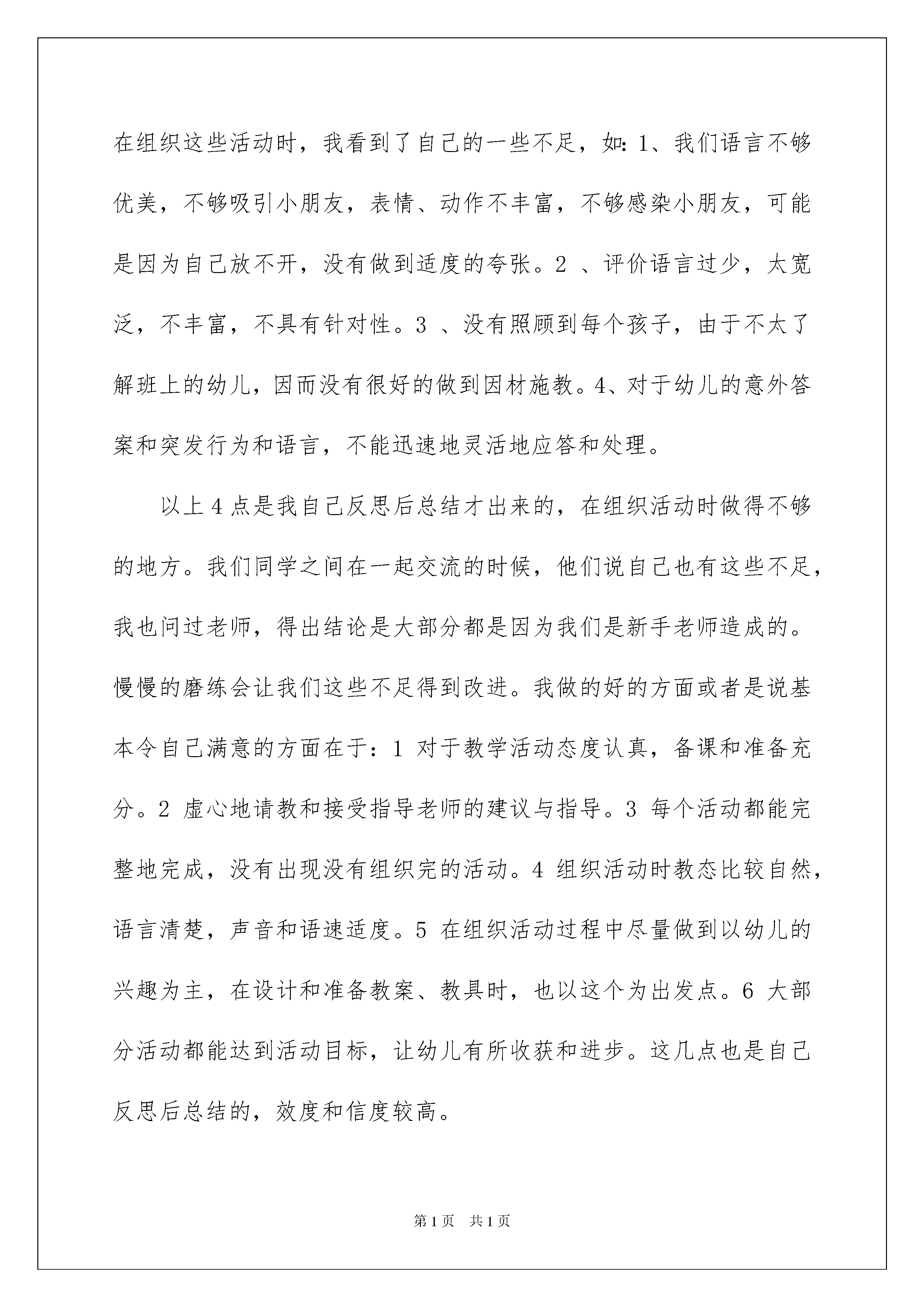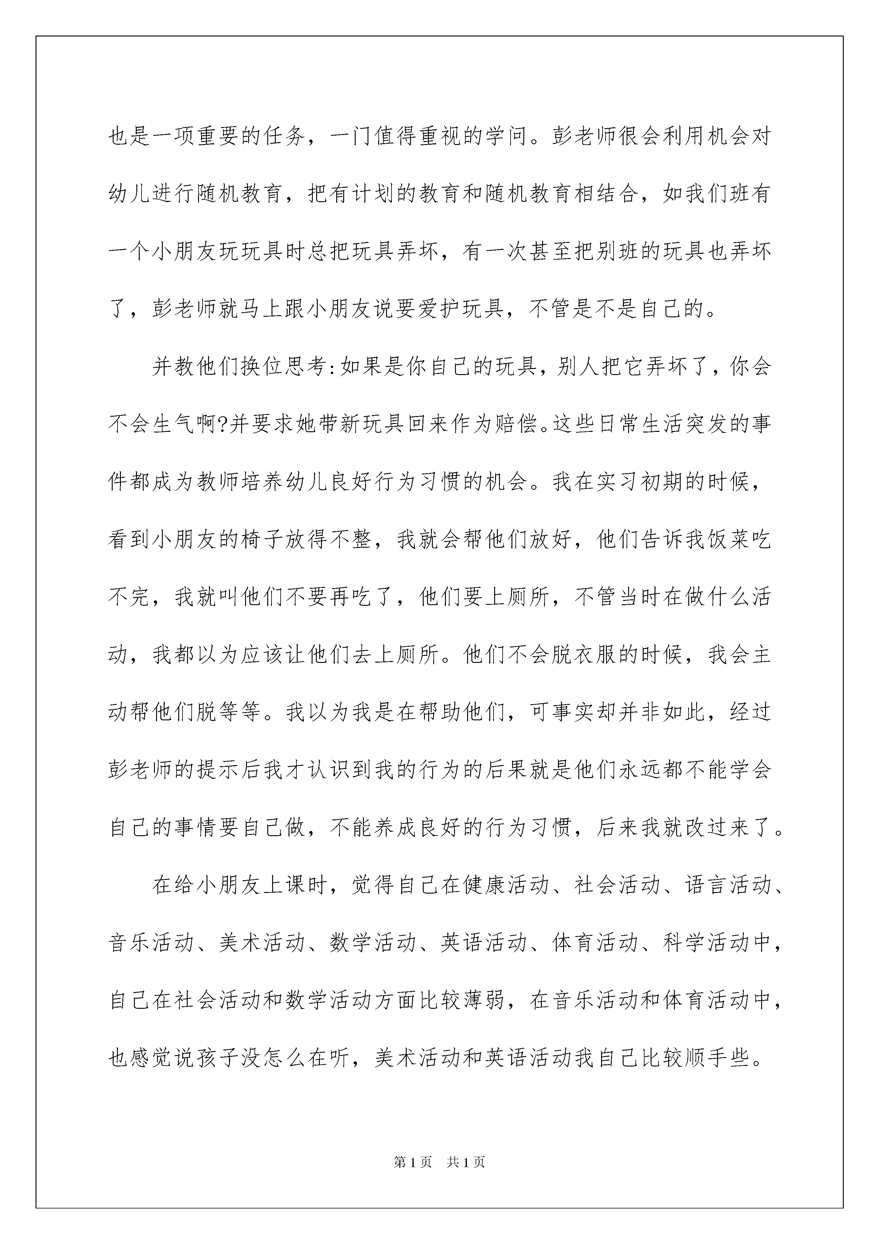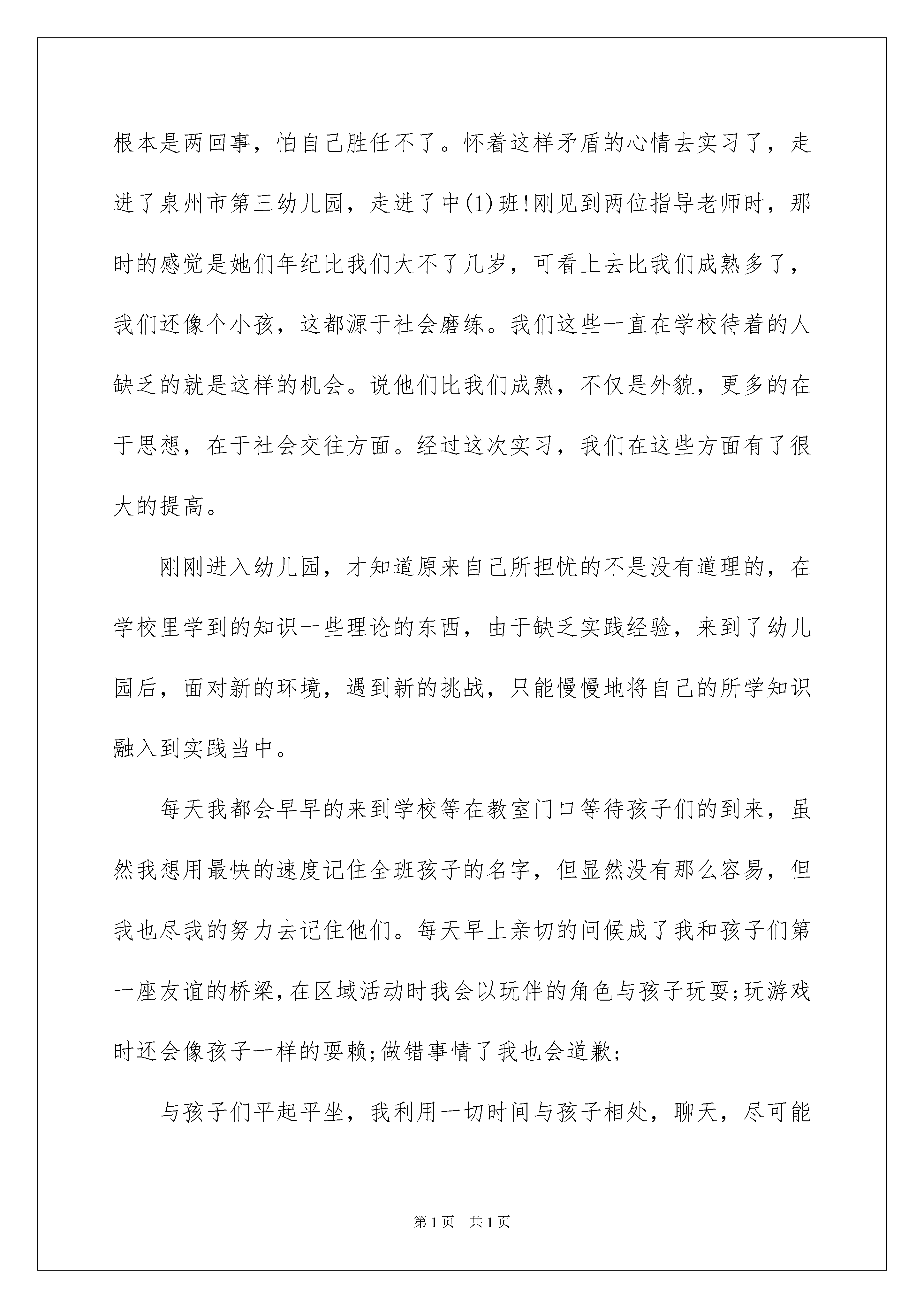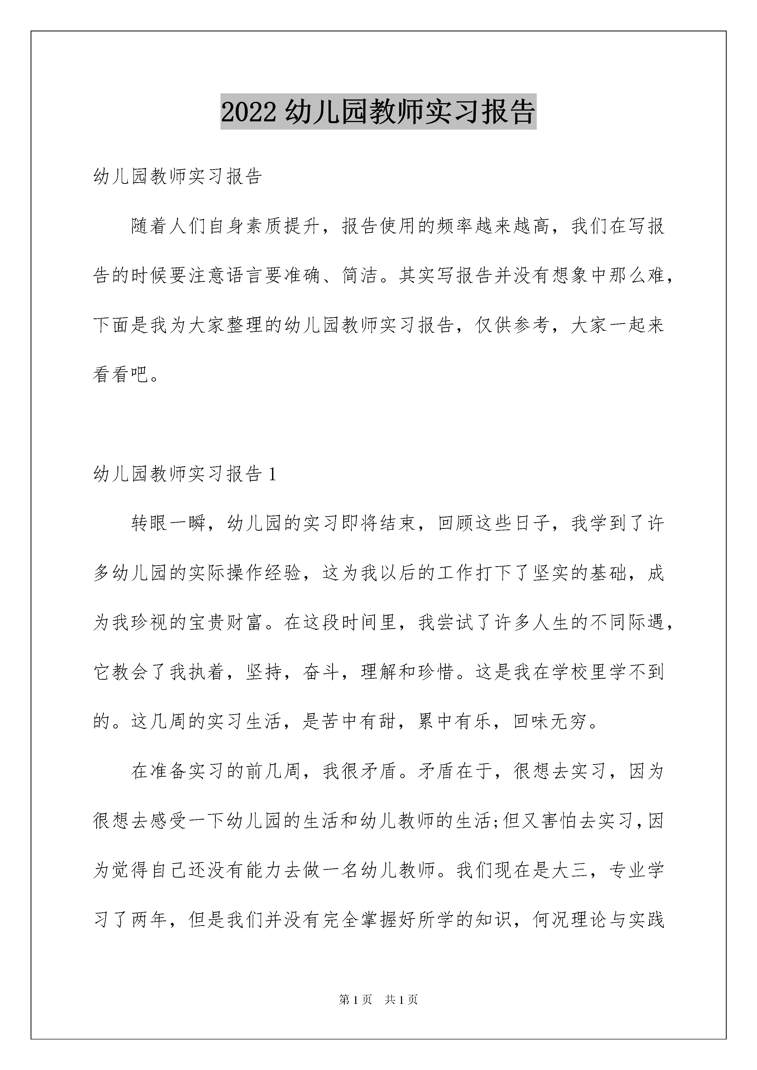 2022幼儿园教师实习报告幼儿园教师实习报告随着人们自身素质提升,报告使用的频率越来越高,我们在写报告的时候要注意语言要准确、简洁。其实写报告并没有想象中那么难,下面是我为大家整理的幼儿园教师实习报告,仅供参考,大家一起来看看吧。幼儿园教师实习报告1转眼一瞬,幼儿园的实习即将结束,回顾这些日子,我学到了许多幼儿园的实际操作经验,这为我以后的工作打下了坚实的基础,成为我珍视的宝贵财富。在这段时间里,我尝试了许多人生的不同际遇,它教会了我执着,坚持,奋斗,理解和珍惜。这是我在学校里学不到的。这几周的实习生活,是苦中有甜,累中有乐,回味无穷。在准备实习的前几周,我很矛盾。矛盾在于,很想去实习,因为很想去感受一下幼儿园的生活和幼儿教师的生活;但又害怕去实习,因为觉得自己还没有能力去做一名幼儿教师。我们现在是大三,专业学习了两年,但是我们并没有完全掌握好所学的知识,何况理论与实践根本是两回事,怕自己胜任不了。怀着这样矛盾的心情去实习了,走进了泉州市第三幼儿园,走进了中(1)班!刚见到两位指导老师时,那时的感觉是她们年纪比我们大不了几岁,可看上去比我们成熟多了,我们还像个小孩,这都源于社会磨练。我们这些一直在学校待着的人缺乏的就是这样的机会。说他们比我们成熟,不仅是外貌,更多的在于思想,在于社会交往方面。经过这次实习,我们在这些方面有了很大的提高。刚刚进入幼儿园,才知道原来自己所担忧的不是没有道理的,在学校里学到的知识一些理论的东西,由于缺乏实践经验,来到了幼儿园后,面对新的环境,遇到新的挑战,只能慢慢地将自己的所学知识融入到实践当中。每天我都会早早的来到学校等在教室门口等待孩子们的到来,虽然我想用最快的速度记住全班孩子的名字,但显然没有那么容易,但我也尽我的努力去记住他们。每天早上亲切的问候成了我和孩子们第一座友谊的桥梁,在区域活动时我会以玩伴的角色与孩子玩耍;玩游戏时还会像孩子一样的耍赖;做错事情了我也会道歉;与孩子们平起平坐,我利用一切时间与孩子相处,聊天,尽可能地走进孩子的心灵,了解他们的内心世界。渐渐地孩子们记住了我的名字;跟前跟后地缠着我问东问西;放学时他们记得和我道一声再见。我的努力有了收获,看着孩子们天真烂漫的笑脸我会心的笑了。但开始,老师就跟我们说过说不要跟孩子玩得太疯,否则上课时就没人会听你的。这也在接下去我的课上得到了应验……幼儿的心灵是纯洁无暇的,当他们接受了你就会真心的喜欢你、崇拜你、信任你。孩子的爱是最真实、最纯真的。当我看着孩子们一张张天真烂漫的笑脸时我的内心充满了幸福,我愿意弯下腰走进孩子、倾听孩子内心的声音。了解孩子,关心孩子。在实习中,使我更深刻的了解到了一个幼儿教师的工作;更深刻了解和掌握了中班这一年龄阶段的幼儿的身心发展特点及其在保教工作方面与大班、小班幼儿的区别,也认识到了作为一个幼儿教师,除了做好幼儿的教育工作外,如何做好与保育员、其他教师及家长的合作、协调工作也具有同样重要的地位。以前我比较注重于对有关幼儿身心发展特点及国内外幼儿教育研究的理论学习,常常忽略了对幼儿生活常规的关注。这次在幼儿园实习,第一次完整的观察了幼儿园一日的生活,发现其实训练幼儿的生活常规培养他们的行为习惯及自理能力也是一项重要的任务,一门值得重视的学问。彭老师很会利用机会对幼儿进行随机教育,把有计划的教育和随机教育相结合,如我们班有一个小朋友玩玩具时总把玩具弄坏,有一次甚至把别班的玩具也弄坏了,彭老师就马上跟小朋友说要爱护玩具,不管是不是自己的。并教他们换位思考:如果是你自己的玩具,别人把它弄坏了,你会不会生气啊?并要求她带新玩具回来作为赔偿。这些日常生活突发的事件都成为教师培养幼儿良好行为习惯的机会。我在实习初期的时候,看到小朋友的椅子放得不整,我就会帮他们放好,他们告诉我饭菜吃不完,我就叫他们不要再吃了,他们要上厕所,不管当时在做什么活动,我都以为应该让他们去上厕所。他们不会脱衣服的时候,我会主动帮他们脱等等。我以为我是在帮助他们,可事实却并非如此,经过彭老师的提示后我才认识到我的行为的后果就是他们永远都不能学会自己的事情要自己做,不能养成良好的行为习惯,后来我就改过来了。在给小朋友上课时,觉得自己在健康活动、社会活动、语言活动、音乐活动、美术活动、数学活动、英语活动、体育活动、科学活动中,自己在社会活动和数学活动方面比较薄弱,在音乐活动和体育活动中,也感觉说孩子没怎么在听,美术活动和英语活动我自己比较顺手些。在组织这些活动时,我看到了自己的一些不足,如:1、我们语言不够优美,不够吸引小朋友,表情、动作不丰富,不够感染小朋友,可能是因为自己放不开,没有做到适度的