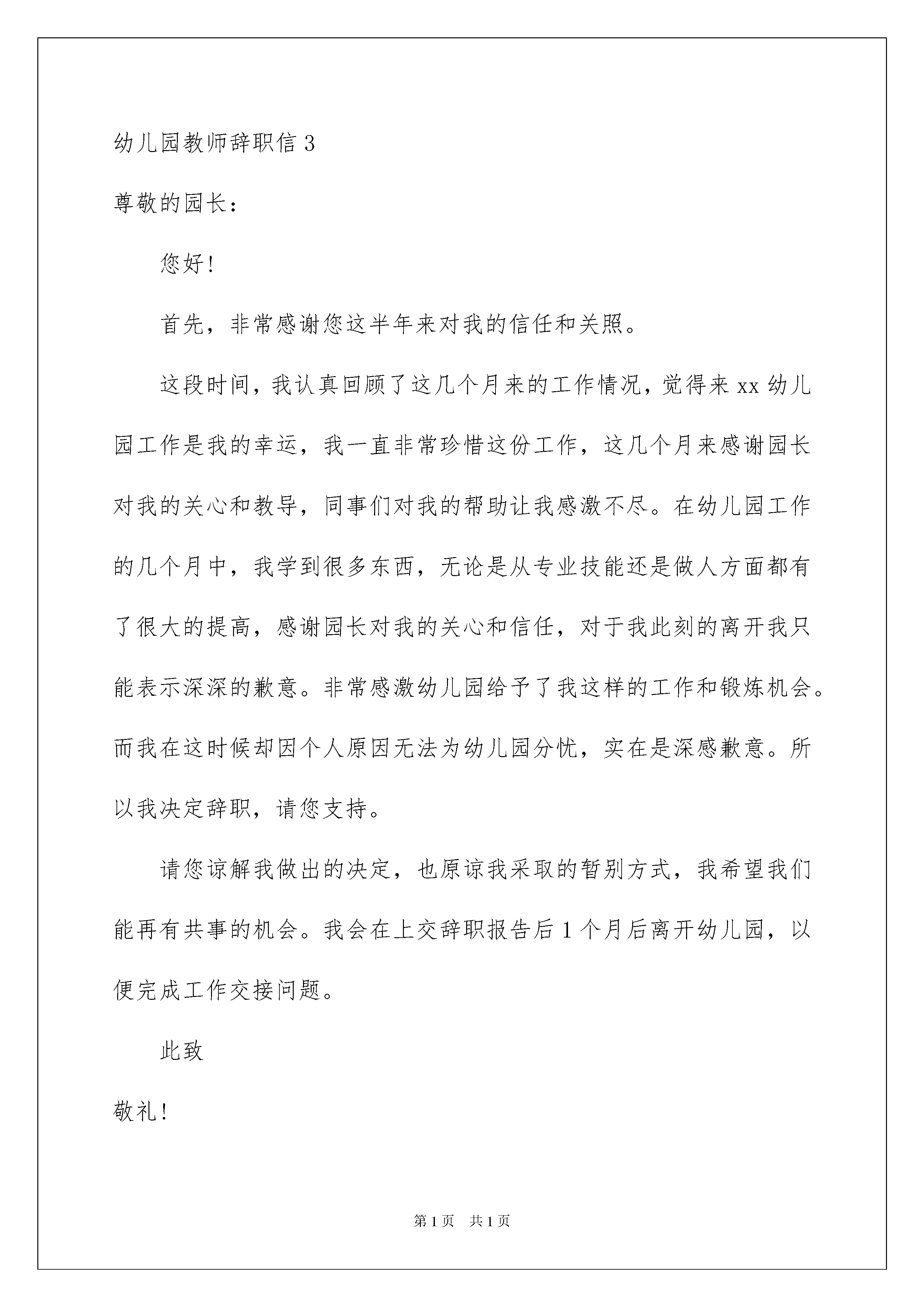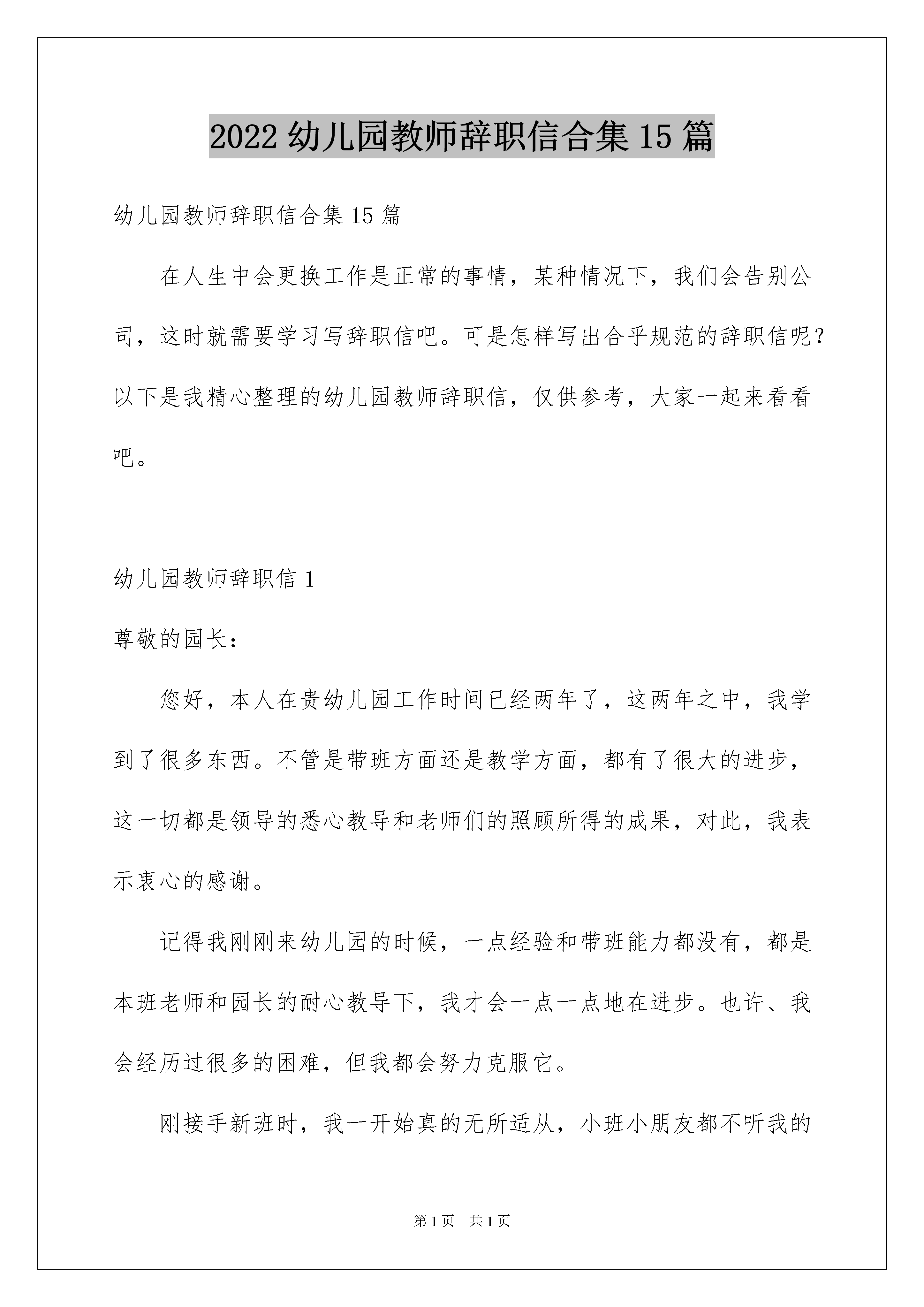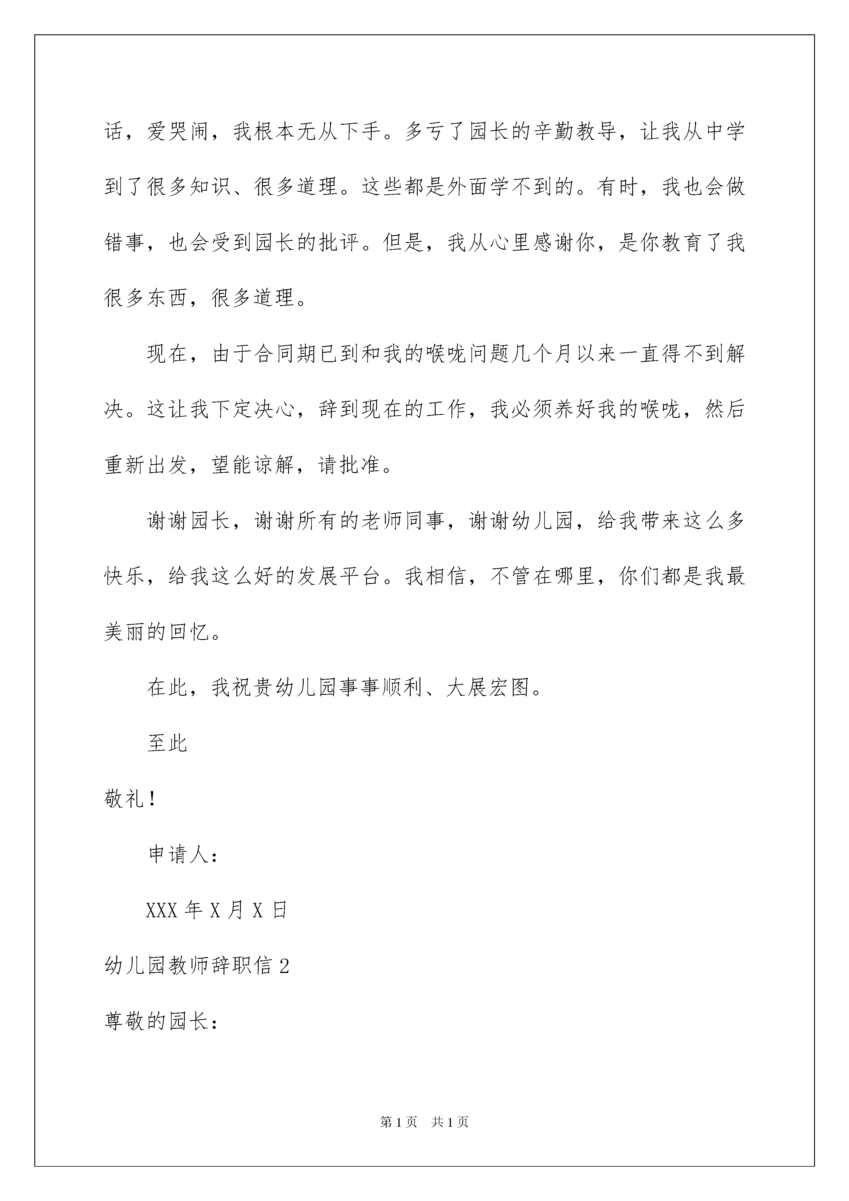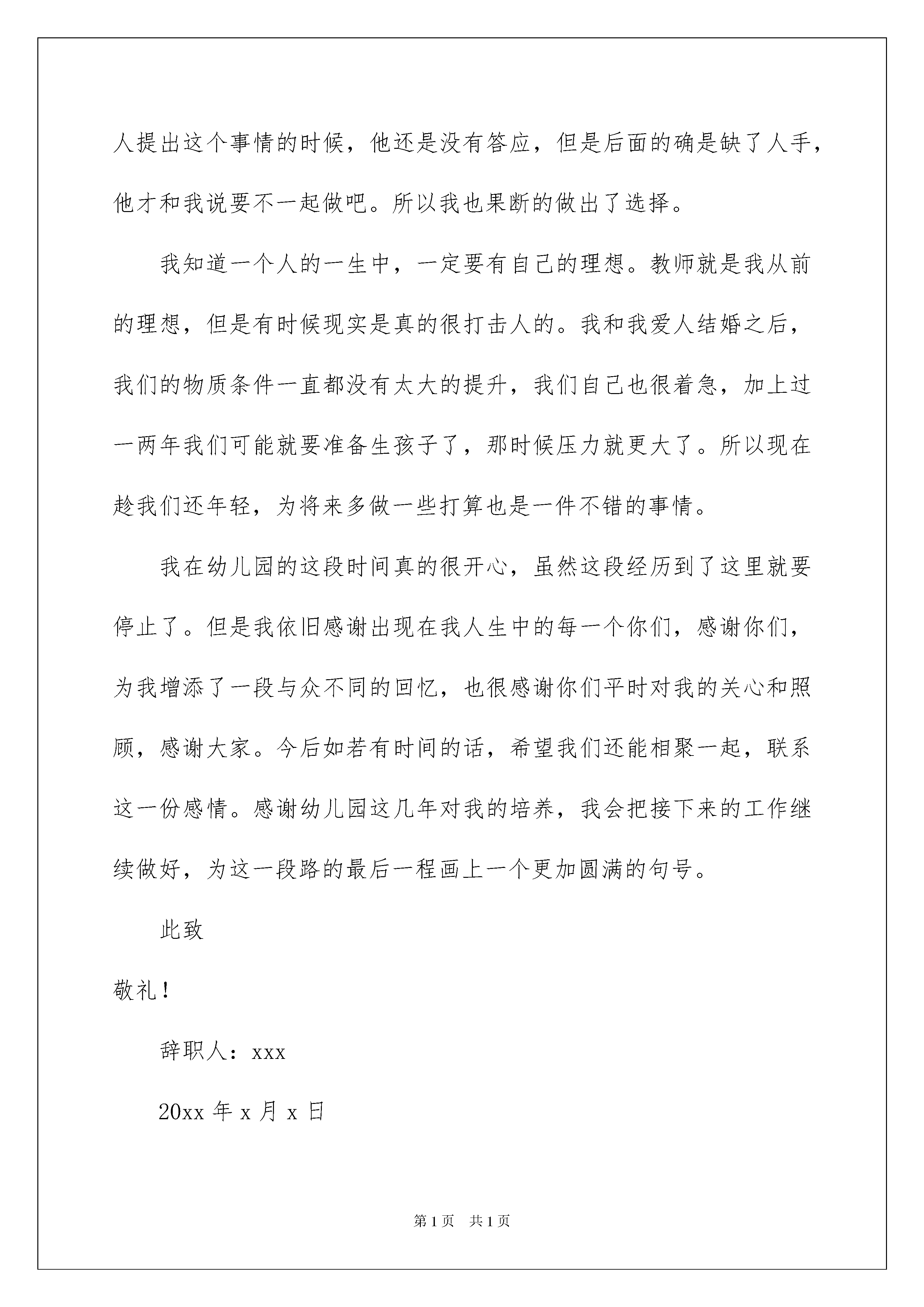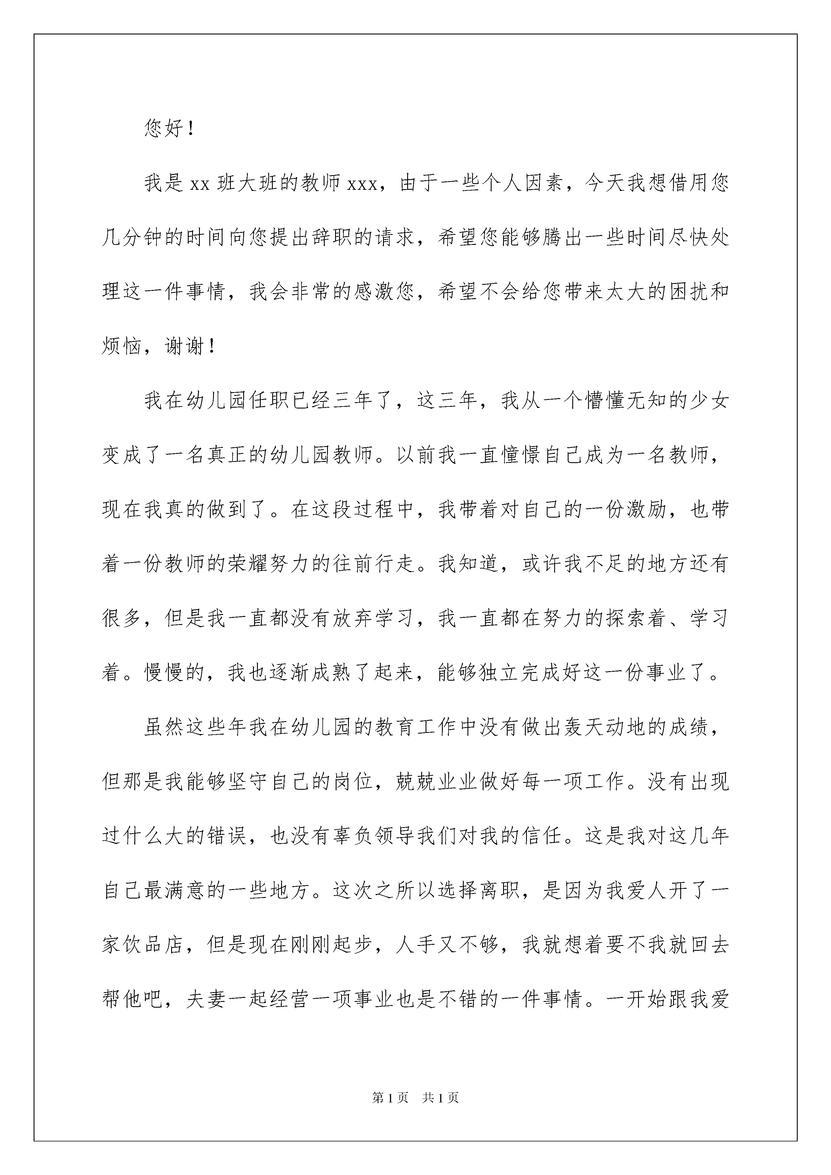 2022幼儿园教师辞职信合集15篇幼儿园教师辞职信合集15篇在人生中会更换工作是正常的事情,某种情况下,我们会告别公司,这时就需要学习写辞职信吧。可是怎样写出合乎规范的辞职信呢?以下是我精心整理的幼儿园教师辞职信,仅供参考,大家一起来看看吧。幼儿园教师辞职信1尊敬的园长:您好,本人在贵幼儿园工作时间已经两年了,这两年之中,我学到了很多东西。不管是带班方面还是教学方面,都有了很大的进步,这一切都是领导的悉心教导和老师们的照顾所得的成果,对此,我表示衷心的感谢。记得我刚刚来幼儿园的时候,一点经验和带班能力都没有,都是本班老师和园长的耐心教导下,我才会一点一点地在进步。也许、我会经历过很多的困难,但我都会努力克服它。刚接手新班时,我一开始真的无所适从,小班小朋友都不听我的话,爱哭闹,我根本无从下手。多亏了园长的辛勤教导,让我从中学到了很多知识、很多道理。这些都是外面学不到的。有时,我也会做错事,也会受到园长的批评。但是,我从心里感谢你,是你教育了我很多东西,很多道理。现在,由于合同期已到和我的喉咙问题几个月以来一直得不到解决。这让我下定决心,辞到现在的工作,我必须养好我的喉咙,然后重新出发,望能谅解,请批准。谢谢园长,谢谢所有的老师同事,谢谢幼儿园,给我带来这么多快乐,给我这么好的发展平台。我相信,不管在哪里,你们都是我最美丽的回忆。在此,我祝贵幼儿园事事顺利、大展宏图。至此敬礼!申请人:XXX年X月X日幼儿园教师辞职信2尊敬的园长:您好!我是xx班大班的教师xxx,由于一些个人因素,今天我想借用您几分钟的时间向您提出辞职的请求,希望您能够腾出一些时间尽快处理这一件事情,我会非常的感激您,希望不会给您带来太大的困扰和烦恼,谢谢!我在幼儿园任职已经三年了,这三年,我从一个懵懂无知的少女变成了一名真正的幼儿园教师。以前我一直憧憬自己成为一名教师,现在我真的做到了。在这段过程中,我带着对自己的一份激励,也带着一份教师的荣耀努力的往前行走。我知道,或许我不足的地方还有很多,但是我一直都没有放弃学习,我一直都在努力的探索着、学习着。慢慢的,我也逐渐成熟了起来,能够独立完成好这一份事业了。虽然这些年我在幼儿园的教育工作中没有做出轰天动地的成绩,但那是我能够坚守自己的岗位,兢兢业业做好每一项工作。没有出现过什么大的错误,也没有辜负领导我们对我的信任。这是我对这几年自己最满意的一些地方。这次之所以选择离职,是因为我爱人开了一家饮品店,但是现在刚刚起步,人手又不够,我就想着要不我就回去帮他吧,夫妻一起经营一项事业也是不错的一件事情。一开始跟我爱人提出这个事情的时候,他还是没有答应,但是后面的确是缺了人手,他才和我说要不一起做吧。所以我也果断的做出了选择。我知道一个人的一生中,一定要有自己的理想。教师就是我从前的理想,但是有时候现实是真的很打击人的。我和我爱人结婚之后,我们的物质条件一直都没有太大的提升,我们自己也很着急,加上过一两年我们可能就要准备生孩子了,那时候压力就更大了。所以现在趁我们还年轻,为将来多做一些打算也是一件不错的事情。我在幼儿园的这段时间真的很开心,虽然这段经历到了这里就要停止了。但是我依旧感谢出现在我人生中的每一个你们,感谢你们,为我增添了一段与众不同的回忆,也很感谢你们平时对我的关心和照顾,感谢大家。今后如若有时间的话,希望我们还能相聚一起,联系这一份感情。感谢幼儿园这几年对我的培养,我会把接下来的工作继续做好,为这一段路的最后一程画上一个更加圆满的句号。此致敬礼!辞职人:xxx20xx年x月x日幼儿园教师辞职信3尊敬的园长:您好!首先,非常感谢您这半年来对我的信任和关照。这段时间,我认真回顾了这几个月来的工作情况,觉得来xx幼儿园工作是我的幸运,我一直非常珍惜这份工作,这几个月来感谢园长对我的关心和教导,同事们对我的帮助让我感激不尽。在幼儿园工作的几个月中,我学到很多东西,无论是从专业技能还是做人方面都有了很大的提高,感谢园长对我的关心和信任,对于我此刻的离开我只能表示深深的歉意。非常感激幼儿园给予了我这样的工作和锻炼机会。而我在这时候却因个人原因无法为幼儿园分忧,实在是深感歉意。所以我决定辞职,请您支持。请您谅解我做出的决定,也原谅我采取的暂别方式,我希望我们能再有共事的机会。我会在上交辞职报告后1个月后离开幼儿园,以便完成工作交接问题。此致敬礼!辞职人:xx20xx年xx月xx日幼儿园教师辞职信4尊敬的领导:您好!时间的流逝还真的是快啊!转眼之间我已经在xx幼儿园待了x年了,在这里工作的这一段时间,我是很开心的,也学到了很多。但是有很多的事情是我们不能阻止的,而天下也