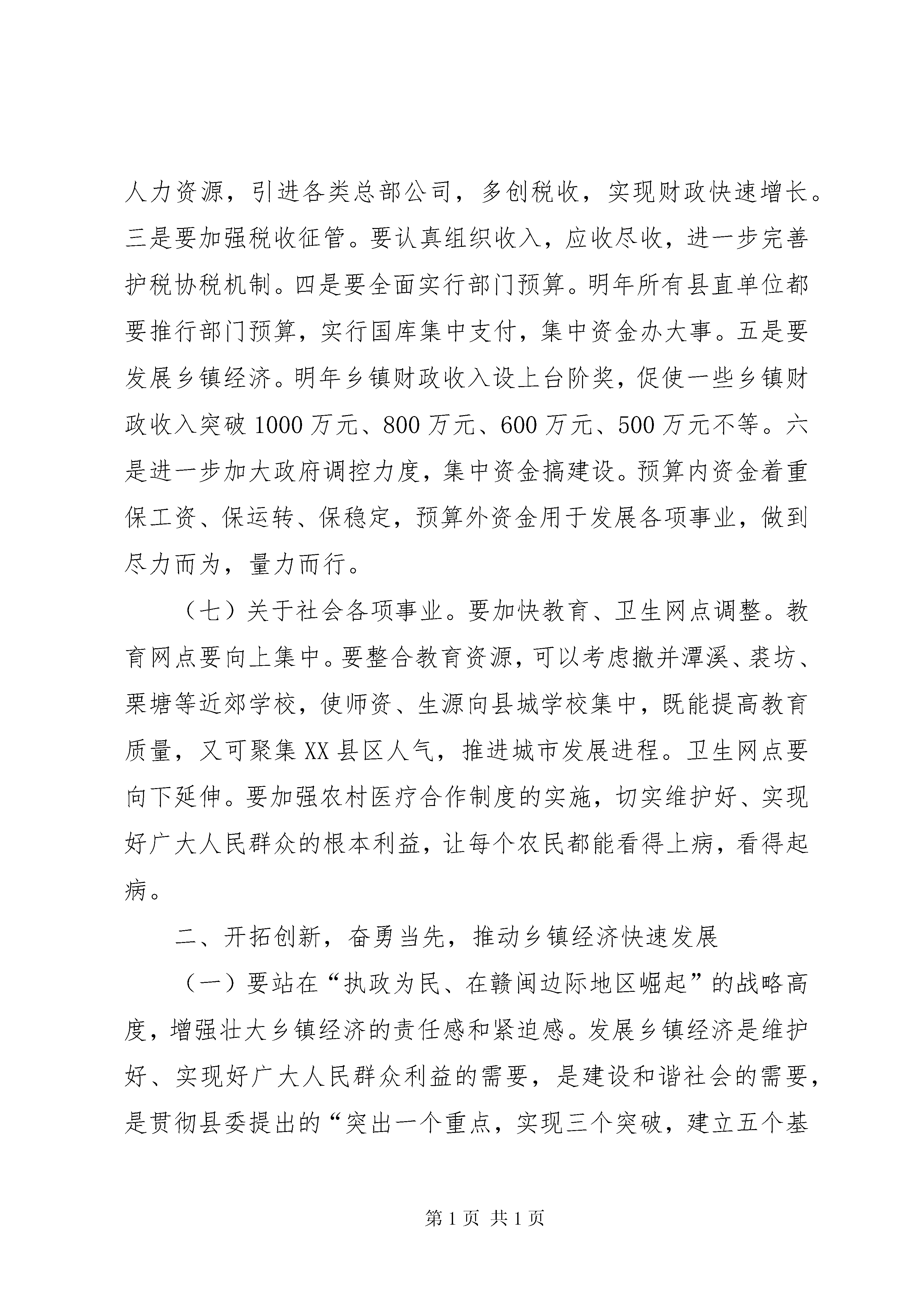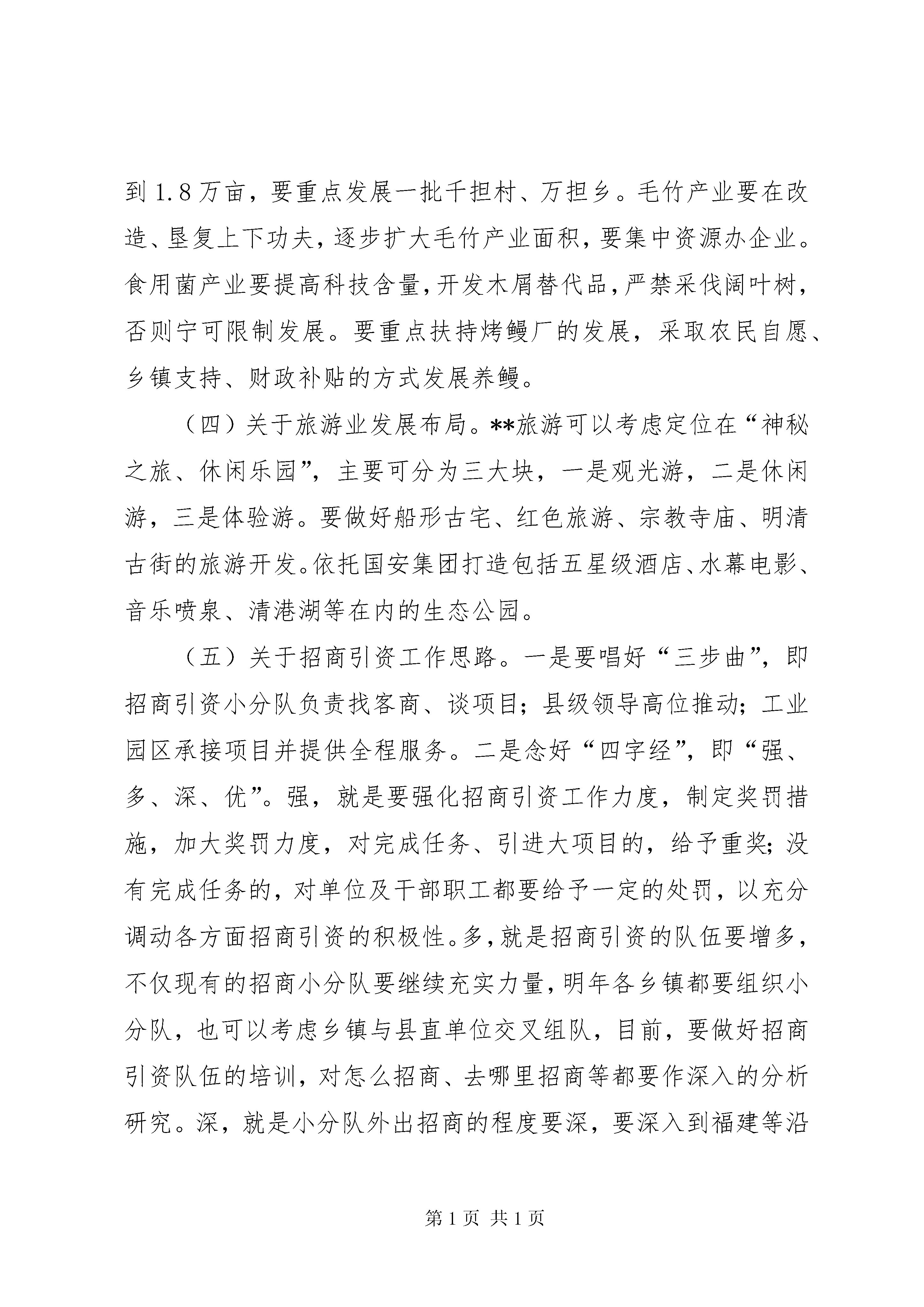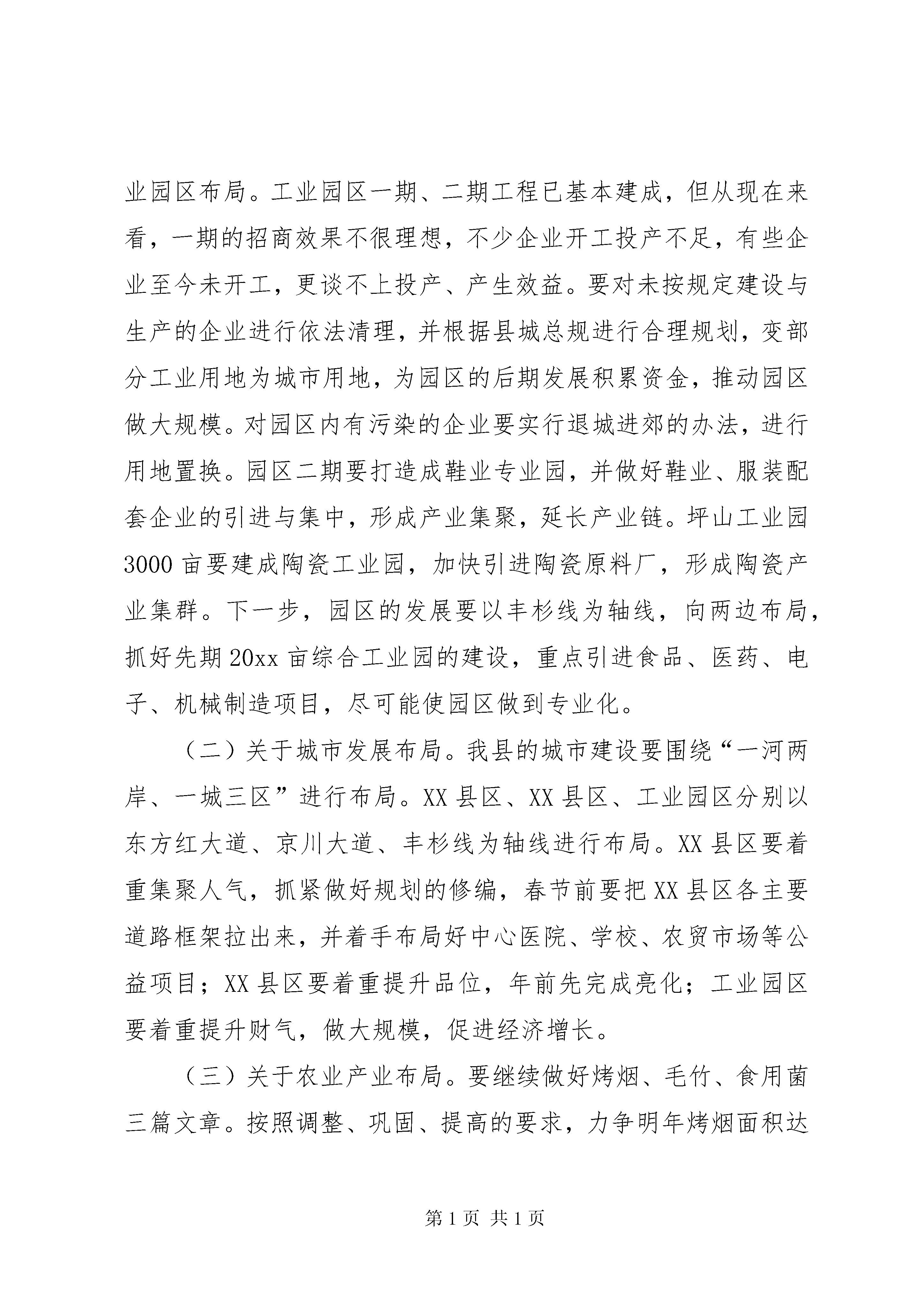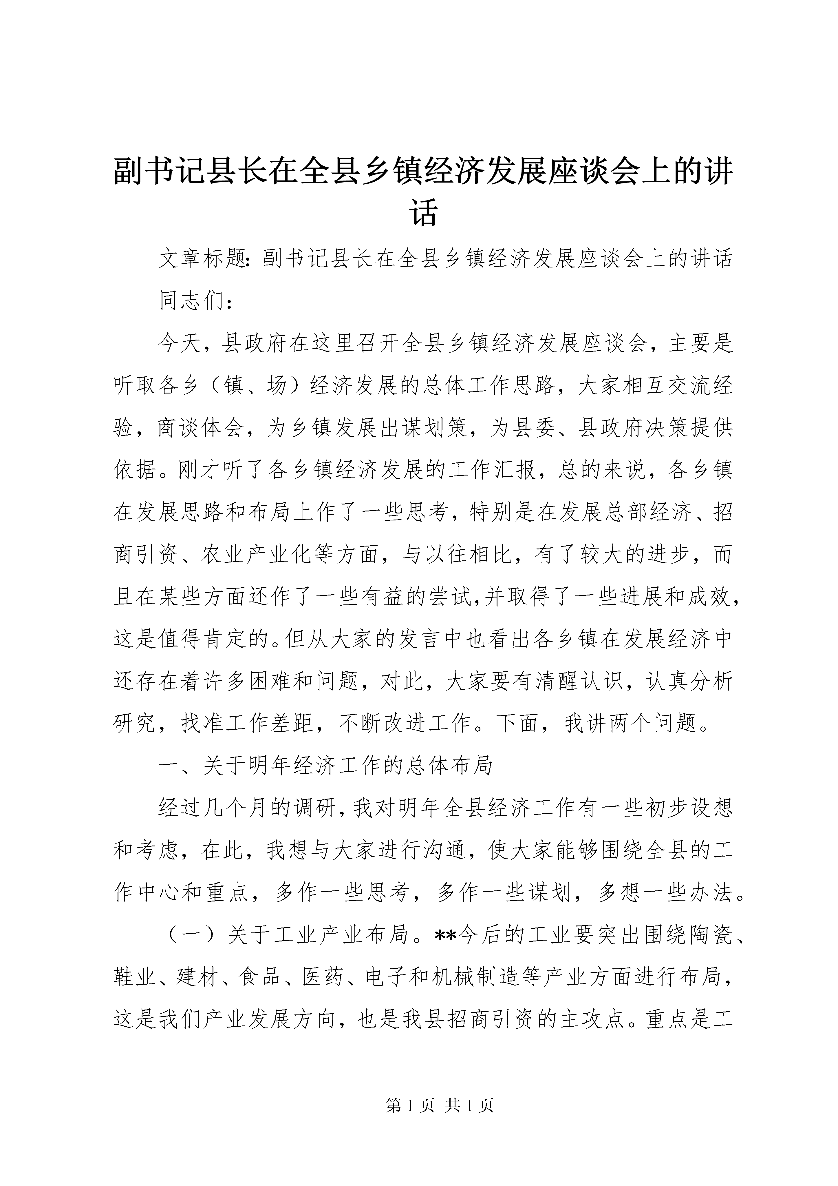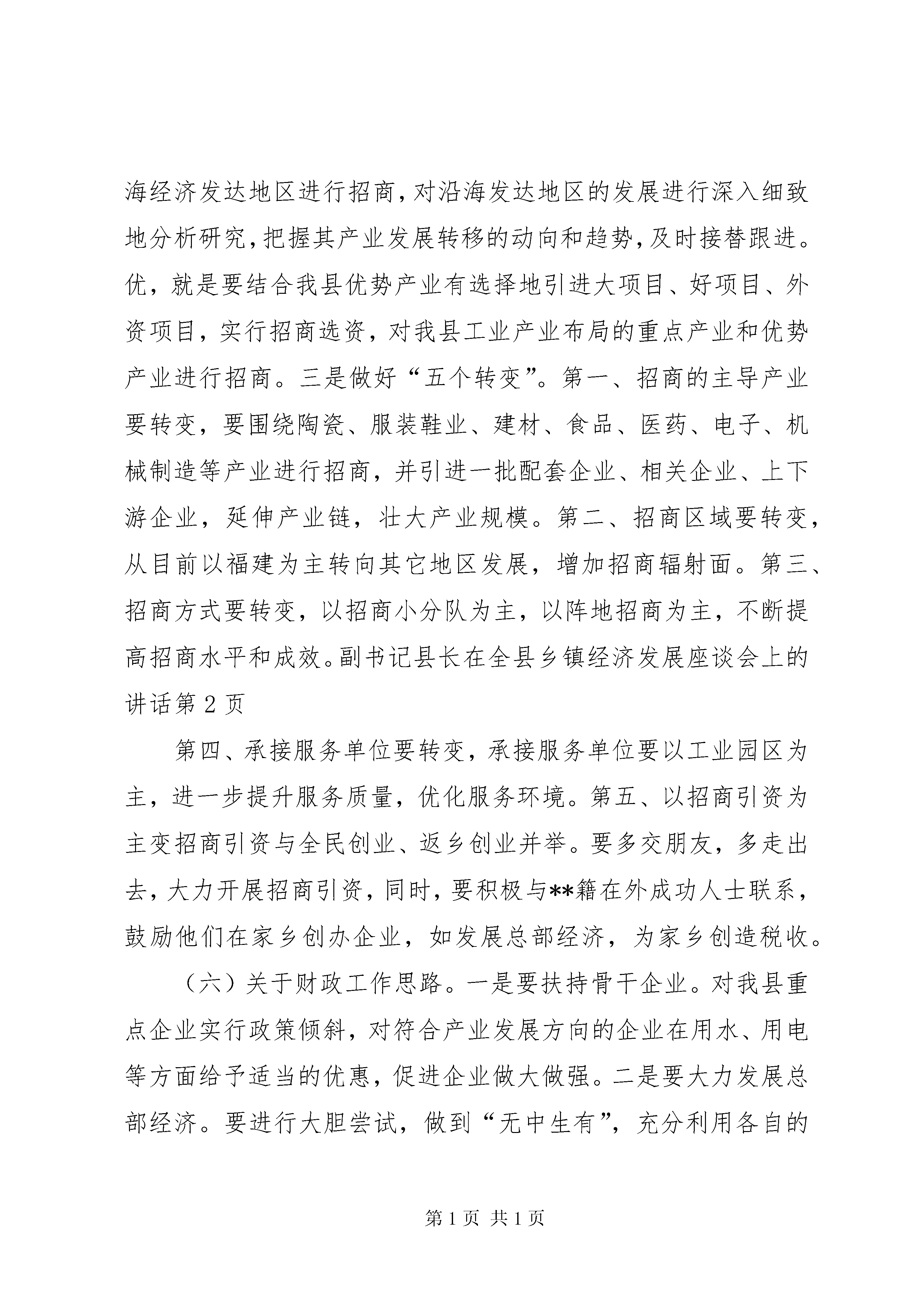 副书记县长在全县乡镇经济发展座谈会上的讲话文章标题:副书记县长在全县乡镇经济发展座谈会上的讲话同志们:今天,县政府在这里召开全县乡镇经济发展座谈会,主要是听取各乡(镇、场)经济发展的总体工作思路,大家相互交流经验,商谈体会,为乡镇发展出谋划策,为县委、县政府决策提供依据。刚才听了各乡镇经济发展的工作汇报,总的来说,各乡镇在发展思路和布局上作了一些思考,特别是在发展总部经济、招商引资、农业产业化等方面,与以往相比,有了较大的进步,而且在某些方面还作了一些有益的尝试,并取得了一些进展和成效,这是值得肯定的。但从大家的发言中也看出各乡镇在发展经济中还存在着许多困难和问题,对此,大家要有清醒认识,认真分析研究,找准工作差距,不断改进工作。下面,我讲两个问题。一、关于明年经济工作的总体布局经过几个月的调研,我对明年全县经济工作有一些初步设想和考虑,在此,我想与大家进行沟通,使大家能够围绕全县的工作中心和重点,多作一些思考,多作一些谋划,多想一些办法。(一)关于工业产业布局。**今后的工业要突出围绕陶瓷、鞋业、建材、食品、医药、电子和机械制造等产业方面进行布局,这是我们产业发展方向,也是我县招商引资的主攻点。重点是工业园区布局。工业园区一期、二期工程已基本建成,但从现在来看,一期的招商效果不很理想,不少企业开工投产不足,有些企业至今未开工,更谈不上投产、产生效益。要对未按规定建设与生产的企业进行依法清理,并根据县城总规进行合理规划,变部分工业用地为城市用地,为园区的后期发展积累资金,推动园区做大规模。对园区内有污染的企业要实行退城进郊的办法,进行用地置换。园区二期要打造成鞋业专业园,并做好鞋业、服装配套企业的引进与集中,形成产业集聚,延长产业链。坪山工业园3000亩要建成陶瓷工业园,加快引进陶瓷原料厂,形成陶瓷产业集群。下一步,园区的发展要以丰杉线为轴线,向两边布局,抓好先期20xx亩综合工业园的建设,重点引进食品、医药、电子、机械制造项目,尽可能使园区做到专业化。(二)关于城市发展布局。我县的城市建设要围绕“一河两岸、一城三区”进行布局。XX县区、XX县区、工业园区分别以东方红大道、京川大道、丰杉线为轴线进行布局。XX县区要着重集聚人气,抓紧做好规划的修编,春节前要把XX县区各主要道路框架拉出来,并着手布局好中心医院、学校、农贸市场等公益项目;XX县区要着重提升品位,年前先完成亮化;工业园区要着重提升财气,做大规模,促进经济增长。(三)关于农业产业布局。要继续做好烤烟、毛竹、食用菌三篇文章。按照调整、巩固、提高的要求,力争明年烤烟面积达到1.8万亩,要重点发展一批千担村、万担乡。毛竹产业要在改造、垦复上下功夫,逐步扩大毛竹产业面积,要集中资源办企业。食用菌产业要提高科技含量,开发木屑替代品,严禁采伐阔叶树,否则宁可限制发展。要重点扶持烤鳗厂的发展,采取农民自愿、乡镇支持、财政补贴的方式发展养鳗。(四)关于旅游业发展布局。**旅游可以考虑定位在“神秘之旅、休闲乐园”,主要可分为三大块,一是观光游,二是休闲游,三是体验游。要做好船形古宅、红色旅游、宗教寺庙、明清古街的旅游开发。依托国安集团打造包括五星级酒店、水幕电影、音乐喷泉、清港湖等在内的生态公园。(五)关于招商引资工作思路。一是要唱好“三步曲”,即招商引资小分队负责找客商、谈项目;县级领导高位推动;工业园区承接项目并提供全程服务。二是念好“四字经”,即“强、多、深、优”。强,就是要强化招商引资工作力度,制定奖罚措施,加大奖罚力度,对完成任务、引进大项目的,给予重奖;没有完成任务的,对单位及干部职工都要给予一定的处罚,以充分调动各方面招商引资的积极性。多,就是招商引资的队伍要增多,不仅现有的招商小分队要继续充实力量,明年各乡镇都要组织小分队,也可以考虑乡镇与县直单位交叉组队,目前,要做好招商引资队伍的培训,对怎么招商、去哪里招商等都要作深入的分析研究。深,就是小分队外出招商的程度要深,要深入到福建等沿海经济发达地区进行招商,对沿海发达地区的发展进行深入细致地分析研究,把握其产业发展转移的动向和趋势,及时接替跟进。优,就是要结合我县优势产业有选择地引进大项目、好项目、外资项目,实行招商选资,对我县工业产业布局的重点产业和优势产业进行招商。三是做好“五个转变”。第一、招商的主导产业要转变,要围绕陶瓷、服装鞋业、建材、食品、医药、电子、机械制造等产业进行招商,并引进一批配套企业、相关企业、上下游企业,延伸产业链,壮大产业规模。第二、招商区域要转变,从目前以福建为主转向其它地区发展,增加招商辐射面。第三、招商方式要转变,以招商小分队为主,以阵地招商为主,不断提高招商水平和成效。副书记县长在全县乡镇经济发展座谈会上的讲话第四、承接服务单位要转变,承接服务单位要以工业