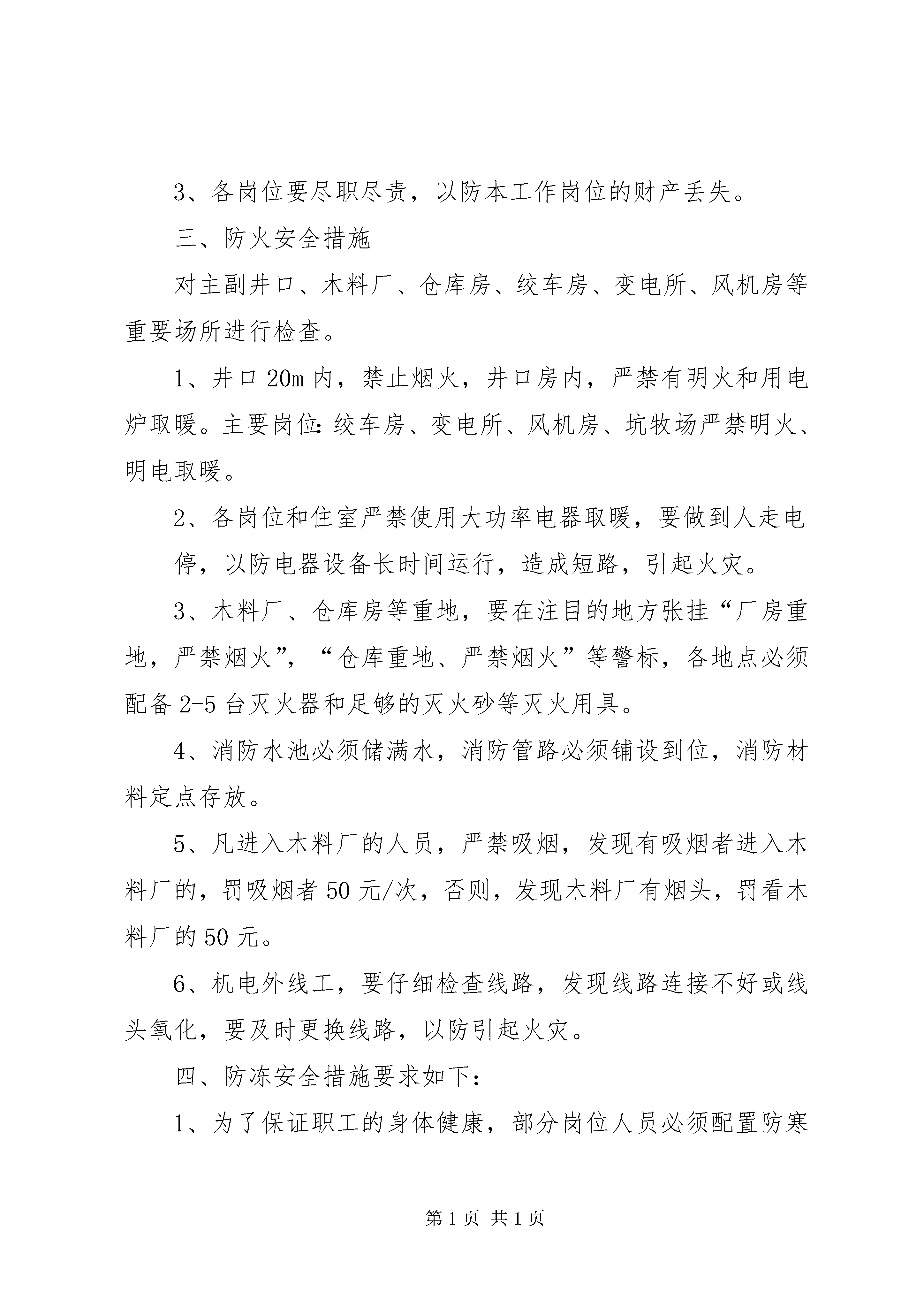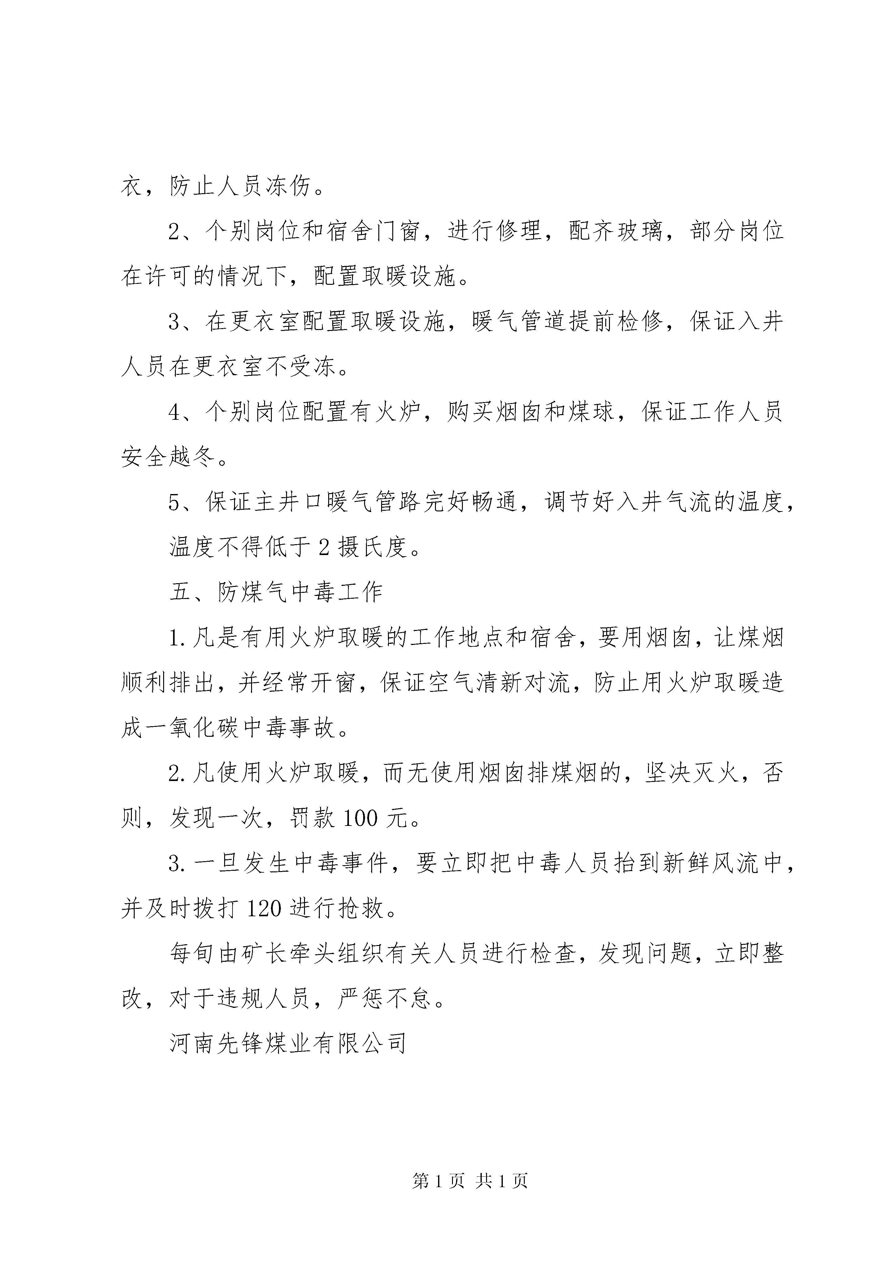冬季四防工作情况汇报河南先锋煤业有限公司冬季“四防”安全措施将要进入严冬时节,为了做好“防盗、防火、防冻、防煤气中毒”工作,确保公司财产不受损失,保障职工的人身安全。一、成立冬季“四防”领导小组组长:李鸡晓副组长:王垒李伟郭明信魏宏杰刘进发成员:二、防盗安全措施1、门卫要尽职尽守,仔细检查来往可疑人员,以防公司财产丢失。2、保卫人员夜间要加强巡逻,重点防范,以防外来人员流窜作案,进行盗窃活动。3、各岗位要尽职尽责,以防本工作岗位的财产丢失。三、防火安全措施对主副井口、木料厂、仓库房、绞车房、变电所、风机房等重要场所进行检查。1、井口20m内,禁止烟火,井口房内,严禁有明火和用电炉取暖。主要岗位:绞车房、变电所、风机房、坑牧场严禁明火、明电取暖。2、各岗位和住室严禁使用大功率电器取暖,要做到人走电停,以防电器设备长时间运行,造成短路,引起火灾。3、木料厂、仓库房等重地,要在注目的地方张挂“厂房重地,严禁烟火”,“仓库重地、严禁烟火”等警标,各地点必须配备2-5台灭火器和足够的灭火砂等灭火用具。4、消防水池必须储满水,消防管路必须铺设到位,消防材料定点存放。5、凡进入木料厂的人员,严禁吸烟,发现有吸烟者进入木料厂的,罚吸烟者50元/次,否则,发现木料厂有烟头,罚看木料厂的50元。6、机电外线工,要仔细检查线路,发现线路连接不好或线头氧化,要及时更换线路,以防引起火灾。四、防冻安全措施要求如下:1、为了保证职工的身体健康,部分岗位人员必须配置防寒衣,防止人员冻伤。2、个别岗位和宿舍门窗,进行修理,配齐玻璃,部分岗位在许可的情况下,配置取暖设施。3、在更衣室配置取暖设施,暖气管道提前检修,保证入井人员在更衣室不受冻。4、个别岗位配置有火炉,购买烟囱和煤球,保证工作人员安全越冬。5、保证主井口暖气管路完好畅通,调节好入井气流的温度,温度不得低于2摄氏度。五、防煤气中毒工作1.凡是有用火炉取暖的工作地点和宿舍,要用烟囱,让煤烟顺利排出,并经常开窗,保证空气清新对流,防止用火炉取暖造成一氧化碳中毒事故。2.凡使用火炉取暖,而无使用烟囱排煤烟的,坚决灭火,否则,发现一次,罚款100元。3.一旦发生中毒事件,要立即把中毒人员抬到新鲜风流中,并及时拨打120进行抢救。每旬由矿长牵头组织有关人员进行检查,发现问题,立即整改,对于违规人员,严惩不怠。河南先锋煤业有限公司2011年1115月日
