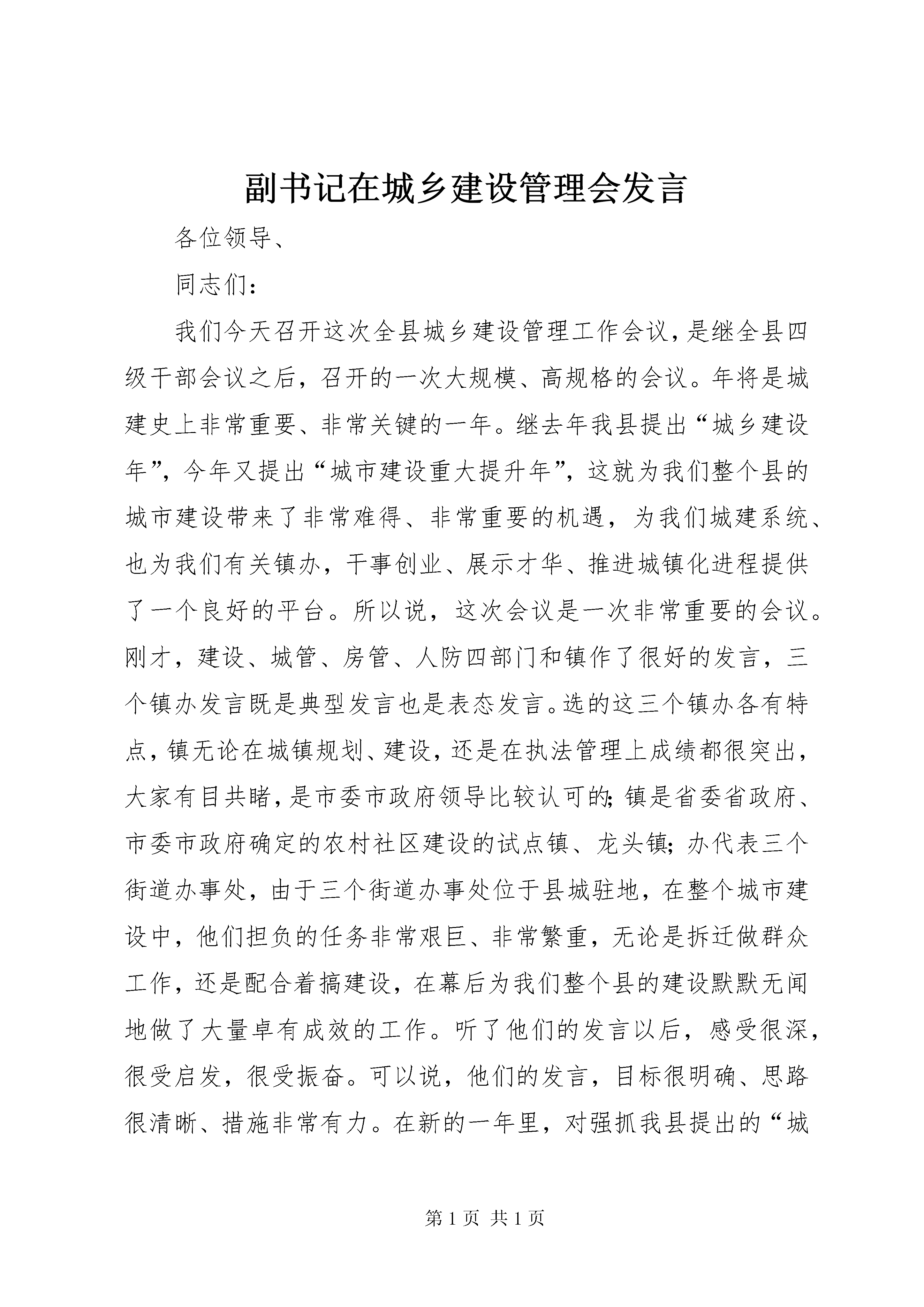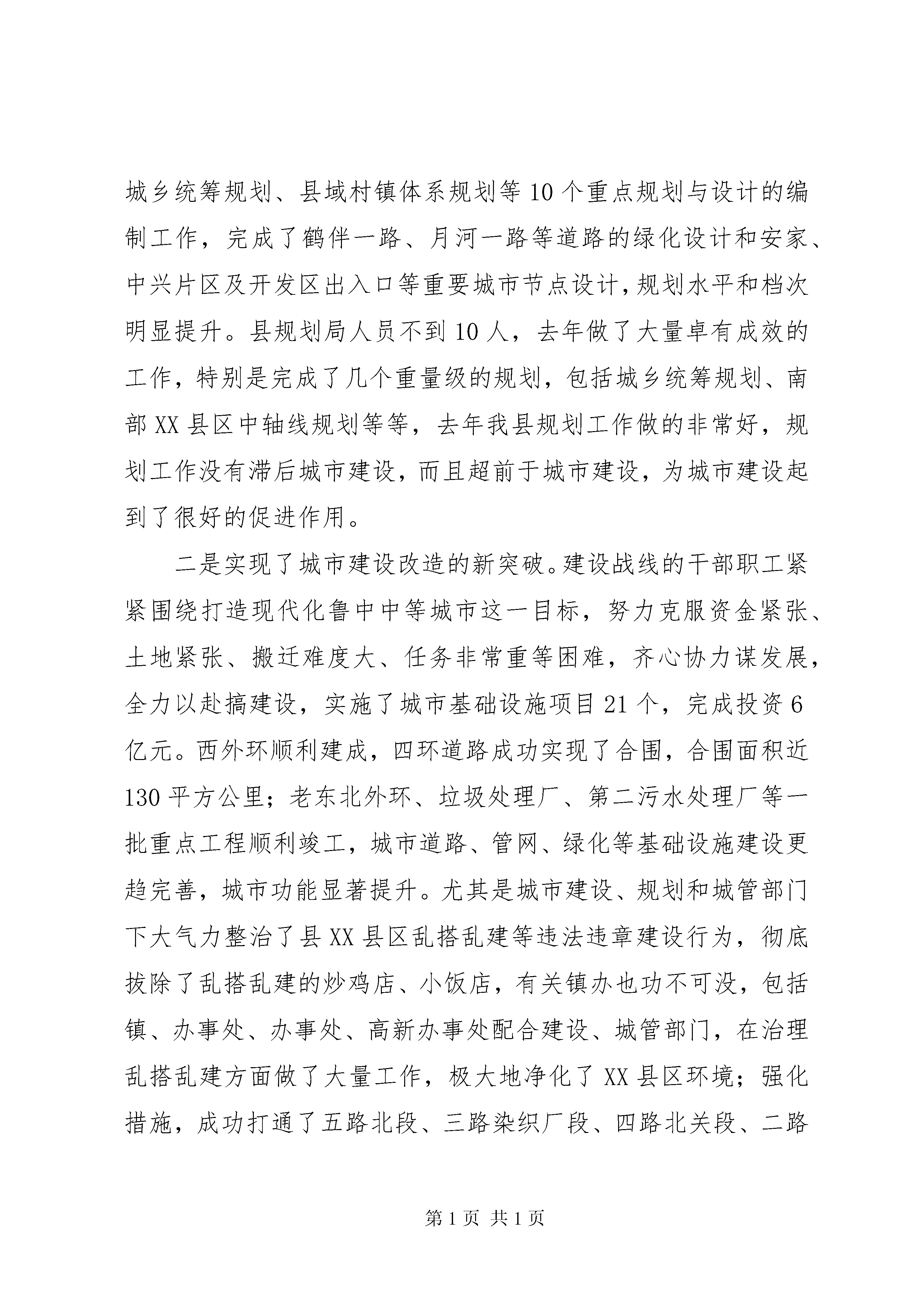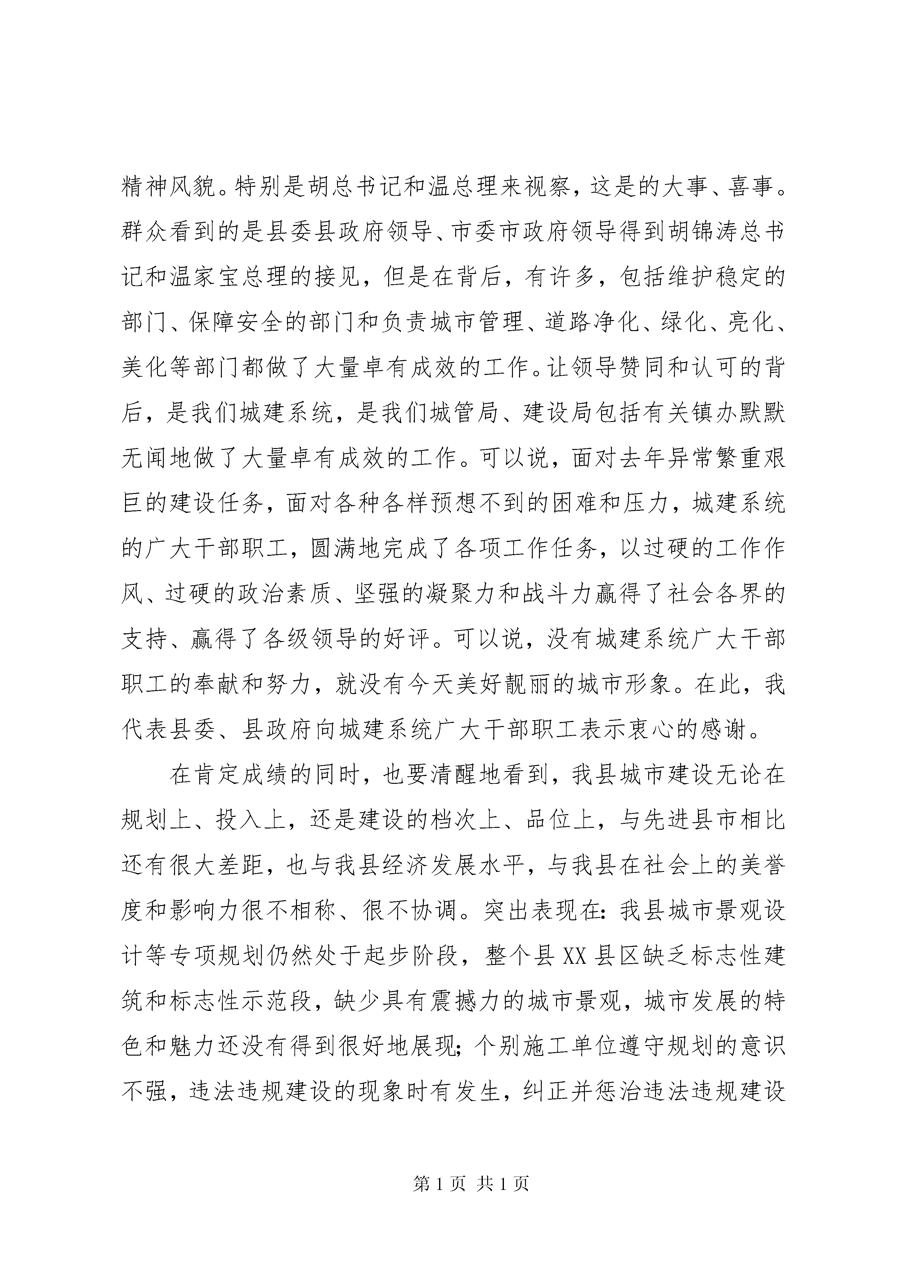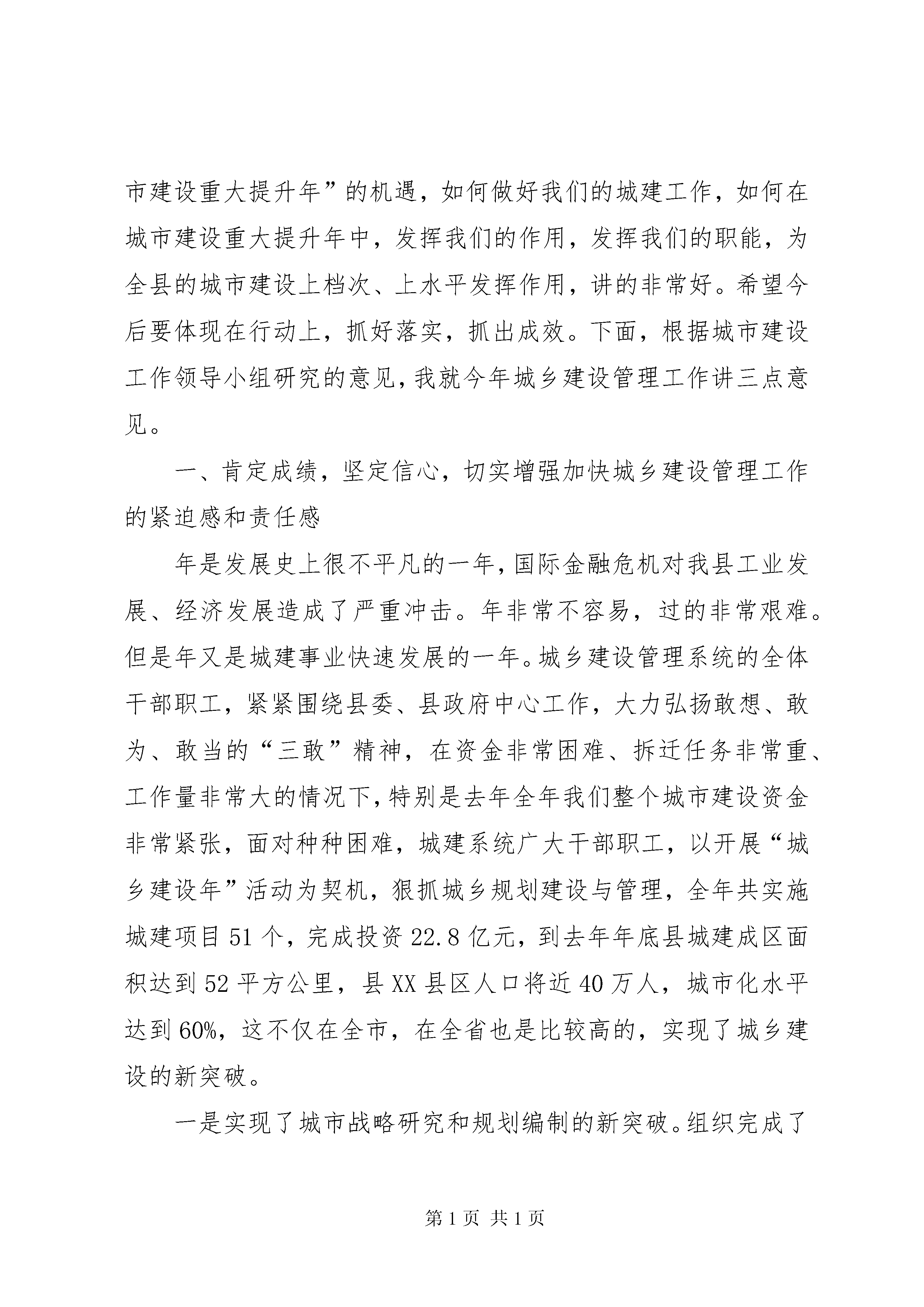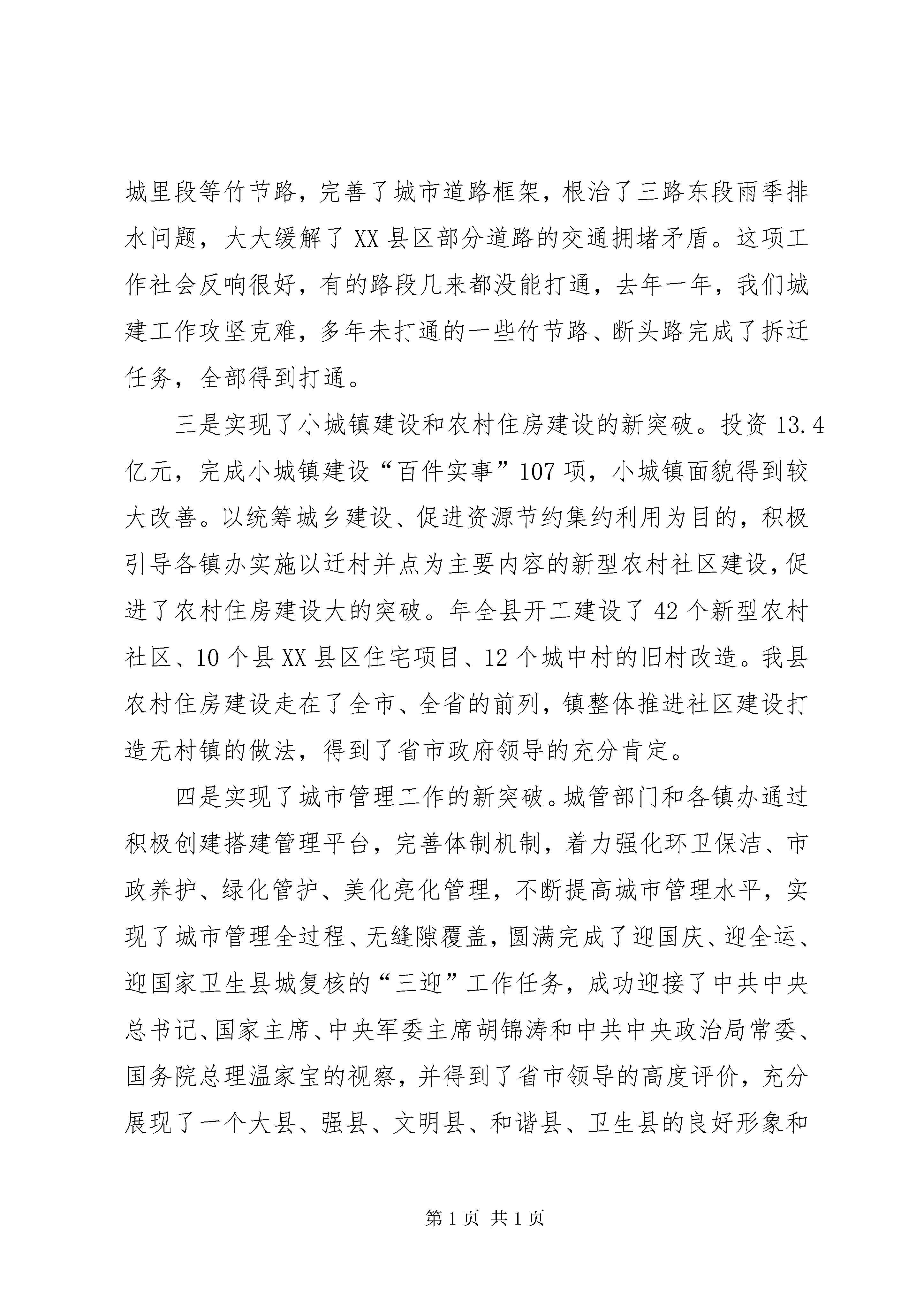 副书记在城乡建设管理会发言各位领导、同志们:我们今天召开这次全县城乡建设管理工作会议,是继全县四级干部会议之后,召开的一次大规模、高规格的会议。年将是城建史上非常重要、非常关键的一年。继去年我县提出“城乡建设年”,今年又提出“城市建设重大提升年”,这就为我们整个县的城市建设带来了非常难得、非常重要的机遇,为我们城建系统、也为我们有关镇办,干事创业、展示才华、推进城镇化进程提供了一个良好的平台。所以说,这次会议是一次非常重要的会议。刚才,建设、城管、房管、人防四部门和镇作了很好的发言,三个镇办发言既是典型发言也是表态发言。选的这三个镇办各有特点,镇无论在城镇规划、建设,还是在执法管理上成绩都很突出,大家有目共睹,是市委市政府领导比较认可的;镇是省委省政府、市委市政府确定的农村社区建设的试点镇、龙头镇;办代表三个街道办事处,由于三个街道办事处位于县城驻地,在整个城市建设中,他们担负的任务非常艰巨、非常繁重,无论是拆迁做群众工作,还是配合着搞建设,在幕后为我们整个县的建设默默无闻地做了大量卓有成效的工作。听了他们的发言以后,感受很深,很受启发,很受振奋。可以说,他们的发言,目标很明确、思路很清晰、措施非常有力。在新的一年里,对强抓我县提出的“城市建设重大提升年”的机遇,如何做好我们的城建工作,如何在城市建设重大提升年中,发挥我们的作用,发挥我们的职能,为全县的城市建设上档次、上水平发挥作用,讲的非常好。希望今后要体现在行动上,抓好落实,抓出成效。下面,根据城市建设工作领导小组研究的意见,我就今年城乡建设管理工作讲三点意见。一、肯定成绩,坚定信心,切实增强加快城乡建设管理工作的紧迫感和责任感年是发展史上很不平凡的一年,国际金融危机对我县工业发展、经济发展造成了严重冲击。年非常不容易,过的非常艰难。但是年又是城建事业快速发展的一年。城乡建设管理系统的全体干部职工,紧紧围绕县委、县政府中心工作,大力弘扬敢想、敢为、敢当的“三敢”精神,在资金非常困难、拆迁任务非常重、工作量非常大的情况下,特别是去年全年我们整个城市建设资金非常紧张,面对种种困难,城建系统广大干部职工,以开展“城乡建设年”活动为契机,狠抓城乡规划建设与管理,全年共实施城建项目51个,完成投资22.8亿元,到去年年底县城建成区面积达到52平方公里,县XX县区人口将近40万人,城市化水平达到60%,这不仅在全市,在全省也是比较高的,实现了城乡建设的新突破。一是实现了城市战略研究和规划编制的新突破。组织完成了城乡统筹规划、县域村镇体系规划等10个重点规划与设计的编制工作,完成了鹤伴一路、月河一路等道路的绿化设计和安家、中兴片区及开发区出入口等重要城市节点设计,规划水平和档次明显提升。县规划局人员不到10人,去年做了大量卓有成效的工作,特别是完成了几个重量级的规划,包括城乡统筹规划、南部XX县区中轴线规划等等,去年我县规划工作做的非常好,规划工作没有滞后城市建设,而且超前于城市建设,为城市建设起到了很好的促进作用。二是实现了城市建设改造的新突破。建设战线的干部职工紧紧围绕打造现代化鲁中中等城市这一目标,努力克服资金紧张、土地紧张、搬迁难度大、任务非常重等困难,齐心协力谋发展,全力以赴搞建设,实施了城市基础设施项目21个,完成投资6亿元。西外环顺利建成,四环道路成功实现了合围,合围面积近130平方公里;老东北外环、垃圾处理厂、第二污水处理厂等一批重点工程顺利竣工,城市道路、管网、绿化等基础设施建设更趋完善,城市功能显著提升。尤其是城市建设、规划和城管部门下大气力整治了县XX县区乱搭乱建等违法违章建设行为,彻底拔除了乱搭乱建的炒鸡店、小饭店,有关镇办也功不可没,包括镇、办事处、办事处、高新办事处配合建设、城管部门,在治理乱搭乱建方面做了大量工作,极大地净化了XX县区环境;强化措施,成功打通了五路北段、三路染织厂段、四路北关段、二路城里段等竹节路,完善了城市道路框架,根治了三路东段雨季排水问题,大大缓解了XX县区部分道路的交通拥堵矛盾。这项工作社会反响很好,有的路段几来都没能打通,去年一年,我们城建工作攻坚克难,多年未打通的一些竹节路、断头路完成了拆迁任务,全部得到打通。三是实现了小城镇建设和农村住房建设的新突破。投资13.4亿元,完成小城镇建设“百件实事”107项,小城镇面貌得到较大改善。以统筹城乡建设、促进资源节约集约利用为目的,积极引导各镇办实施以迁村并点为主要内容的新型农村社区建设,促进了农村住房建设大的突破。年全县开工建设了42个新型农村社区、10个县XX县区住宅项目、12个城中村的旧村改造。我县农村住房建设走在了全市、全省的前列,镇整体推进社区建设打造无村镇的做法,得到了省市政府领导的充分肯定。四是实现了城市管理工作的新突破。城管部门和各镇办通过积极创