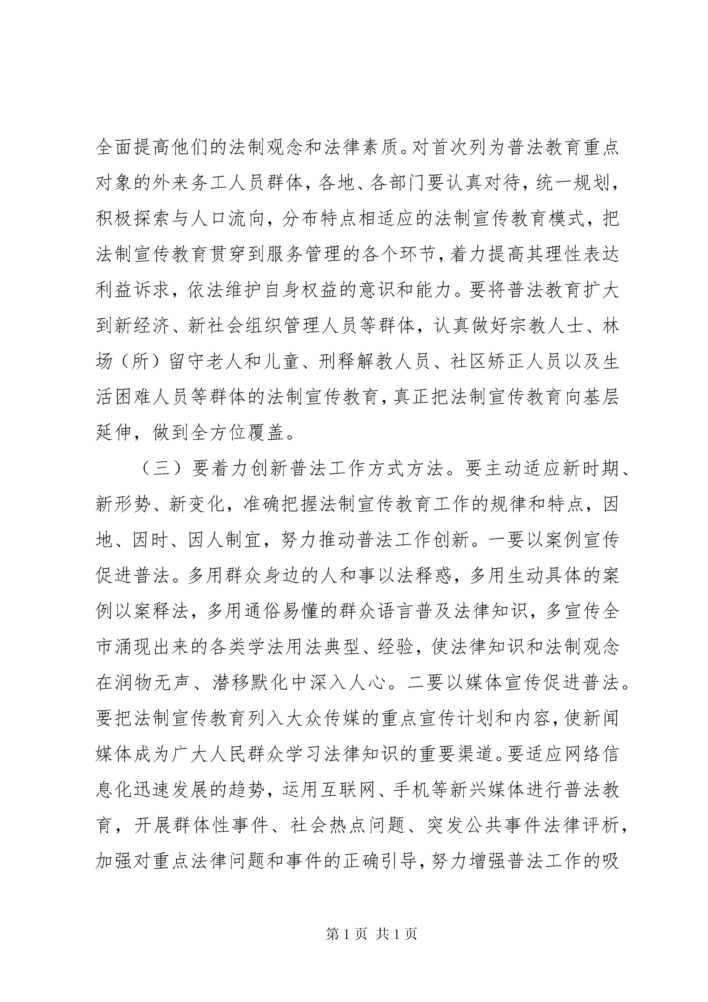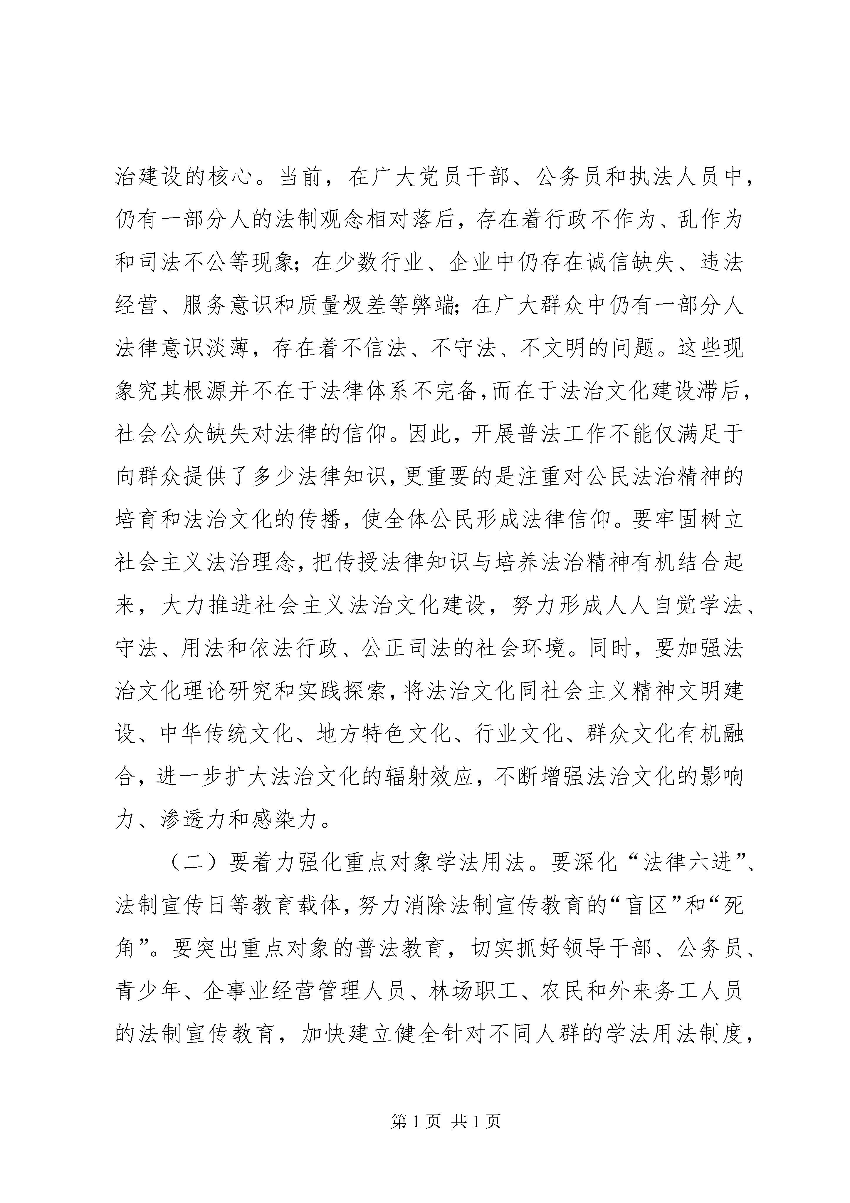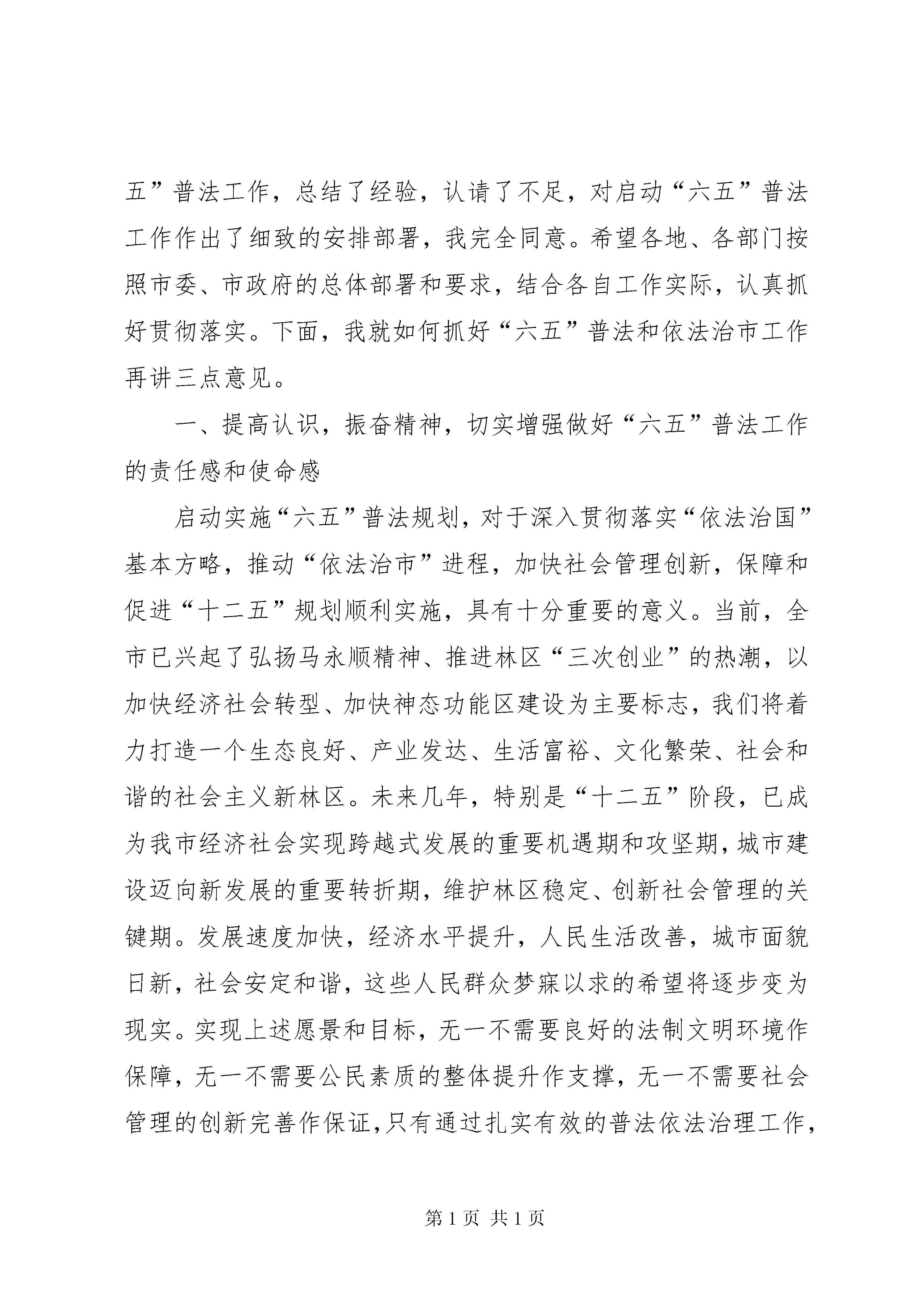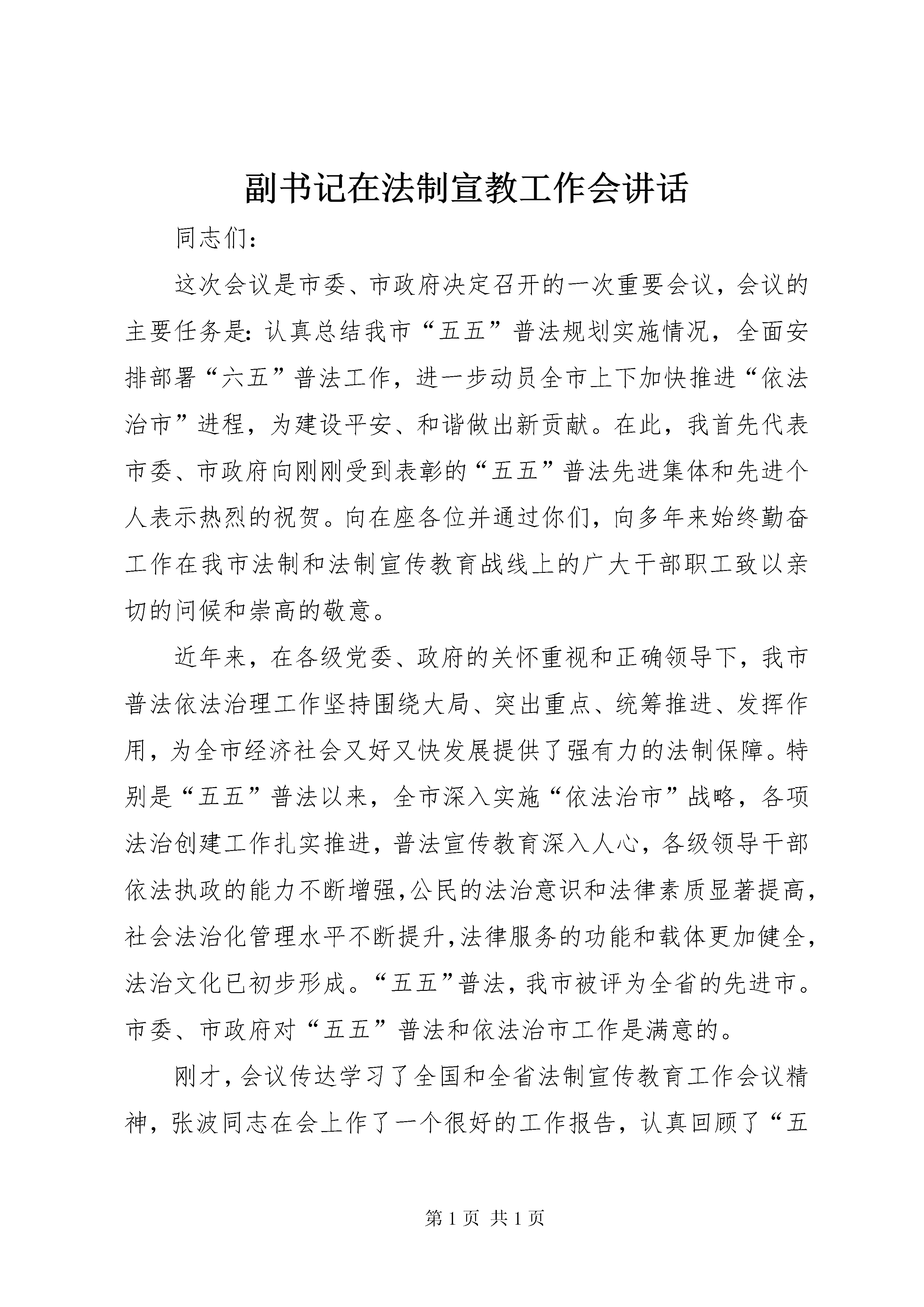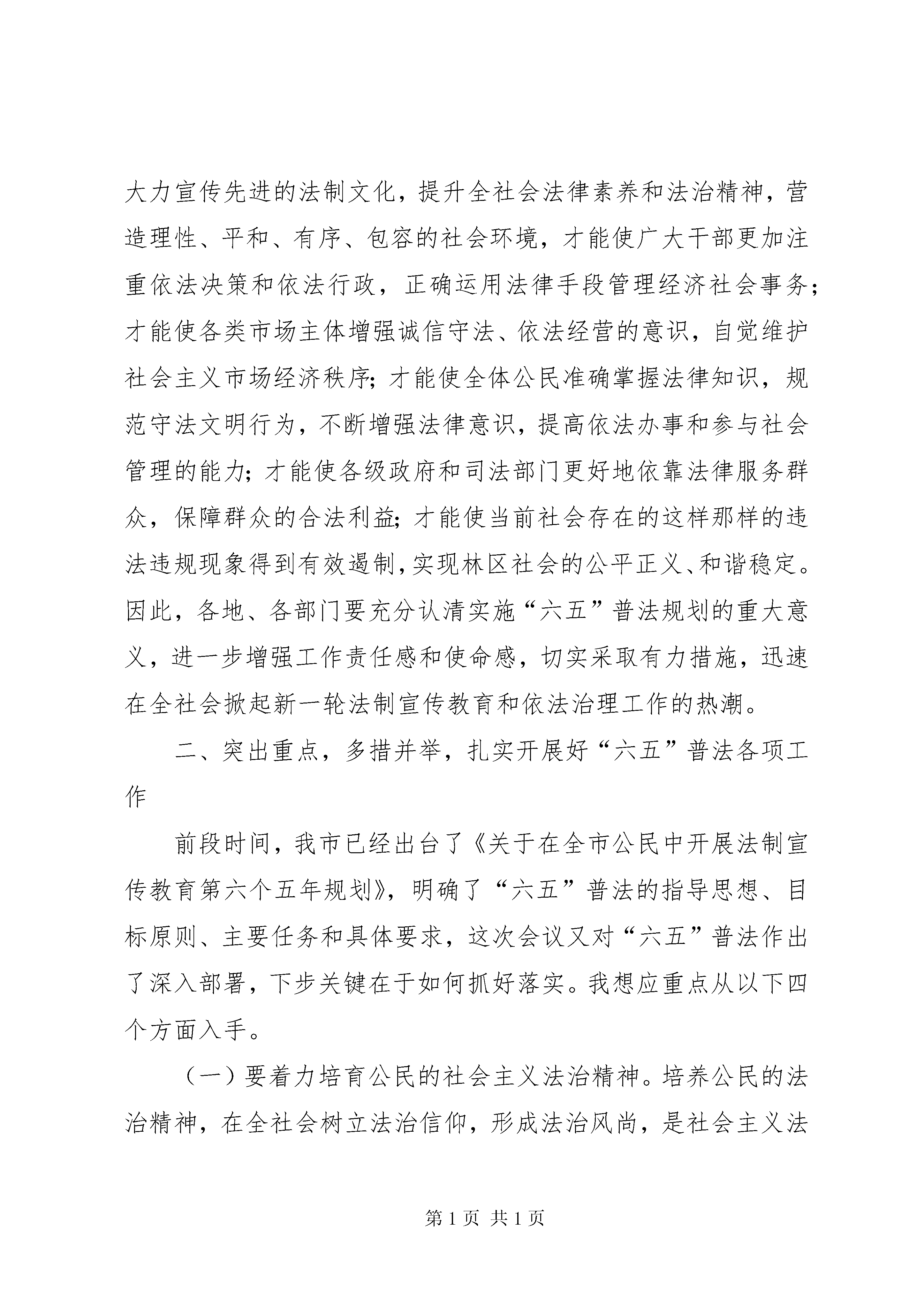 副书记在法制宣教工作会讲话同志们:这次会议是市委、市政府决定召开的一次重要会议,会议的主要任务是:认真总结我市“五五”普法规划实施情况,全面安排部署“六五”普法工作,进一步动员全市上下加快推进“依法治市”进程,为建设平安、和谐做出新贡献。在此,我首先代表市委、市政府向刚刚受到表彰的“五五”普法先进集体和先进个人表示热烈的祝贺。向在座各位并通过你们,向多年来始终勤奋工作在我市法制和法制宣传教育战线上的广大干部职工致以亲切的问候和崇高的敬意。近年来,在各级党委、政府的关怀重视和正确领导下,我市普法依法治理工作坚持围绕大局、突出重点、统筹推进、发挥作用,为全市经济社会又好又快发展提供了强有力的法制保障。特别是“五五”普法以来,全市深入实施“依法治市”战略,各项法治创建工作扎实推进,普法宣传教育深入人心,各级领导干部依法执政的能力不断增强,公民的法治意识和法律素质显著提高,社会法治化管理水平不断提升,法律服务的功能和载体更加健全,法治文化已初步形成。“五五”普法,我市被评为全省的先进市。市委、市政府对“五五”普法和依法治市工作是满意的。刚才,会议传达学习了全国和全省法制宣传教育工作会议精神,张波同志在会上作了一个很好的工作报告,认真回顾了“五五”普法工作,总结了经验,认请了不足,对启动“六五”普法工作作出了细致的安排部署,我完全同意。希望各地、各部门按照市委、市政府的总体部署和要求,结合各自工作实际,认真抓好贯彻落实。下面,我就如何抓好“六五”普法和依法治市工作再讲三点意见。一、提高认识,振奋精神,切实增强做好“六五”普法工作的责任感和使命感启动实施“六五”普法规划,对于深入贯彻落实“依法治国”基本方略,推动“依法治市”进程,加快社会管理创新,保障和促进“十二五”规划顺利实施,具有十分重要的意义。当前,全市已兴起了弘扬马永顺精神、推进林区“三次创业”的热潮,以加快经济社会转型、加快神态功能区建设为主要标志,我们将着力打造一个生态良好、产业发达、生活富裕、文化繁荣、社会和谐的社会主义新林区。未来几年,特别是“十二五”阶段,已成为我市经济社会实现跨越式发展的重要机遇期和攻坚期,城市建设迈向新发展的重要转折期,维护林区稳定、创新社会管理的关键期。发展速度加快,经济水平提升,人民生活改善,城市面貌日新,社会安定和谐,这些人民群众梦寐以求的希望将逐步变为现实。实现上述愿景和目标,无一不需要良好的法制文明环境作保障,无一不需要公民素质的整体提升作支撑,无一不需要社会管理的创新完善作保证,只有通过扎实有效的普法依法治理工作,大力宣传先进的法制文化,提升全社会法律素养和法治精神,营造理性、平和、有序、包容的社会环境,才能使广大干部更加注重依法决策和依法行政,正确运用法律手段管理经济社会事务;才能使各类市场主体增强诚信守法、依法经营的意识,自觉维护社会主义市场经济秩序;才能使全体公民准确掌握法律知识,规范守法文明行为,不断增强法律意识,提高依法办事和参与社会管理的能力;才能使各级政府和司法部门更好地依靠法律服务群众,保障群众的合法利益;才能使当前社会存在的这样那样的违法违规现象得到有效遏制,实现林区社会的公平正义、和谐稳定。因此,各地、各部门要充分认清实施“六五”普法规划的重大意义,进一步增强工作责任感和使命感,切实采取有力措施,迅速在全社会掀起新一轮法制宣传教育和依法治理工作的热潮。二、突出重点,多措并举,扎实开展好“六五”普法各项工作前段时间,我市已经出台了《关于在全市公民中开展法制宣传教育第六个五年规划》,明确了“六五”普法的指导思想、目标原则、主要任务和具体要求,这次会议又对“六五”普法作出了深入部署,下步关键在于如何抓好落实。我想应重点从以下四个方面入手。(一)要着力培育公民的社会主义法治精神。培养公民的法治精神,在全社会树立法治信仰,形成法治风尚,是社会主义法治建设的核心。当前,在广大党员干部、公务员和执法人员中,仍有一部分人的法制观念相对落后,存在着行政不作为、乱作为和司法不公等现象;在少数行业、企业中仍存在诚信缺失、违法经营、服务意识和质量极差等弊端;在广大群众中仍有一部分人法律意识淡薄,存在着不信法、不守法、不文明的问题。这些现象究其根源并不在于法律体系不完备,而在于法治文化建设滞后,社会公众缺失对法律的信仰。因此,开展普法工作不能仅满足于向群众提供了多少法律知识,更重要的是注重对公民法治精神的培育和法治文化的传播,使全体公民形成法律信仰。要牢固树立社会主义法治理念,把传授法律知识与培养法治精神有机结合起来,大力推进社会主义法治文化建设,努力形成人人自觉学法、守法、用法和依法行政、公正司法的社会环境。同时,要加强法治文化理论研究和实践探索,将法治文化同社会主义精神文明建设、中华传统文化、地方特色文化、行业文化