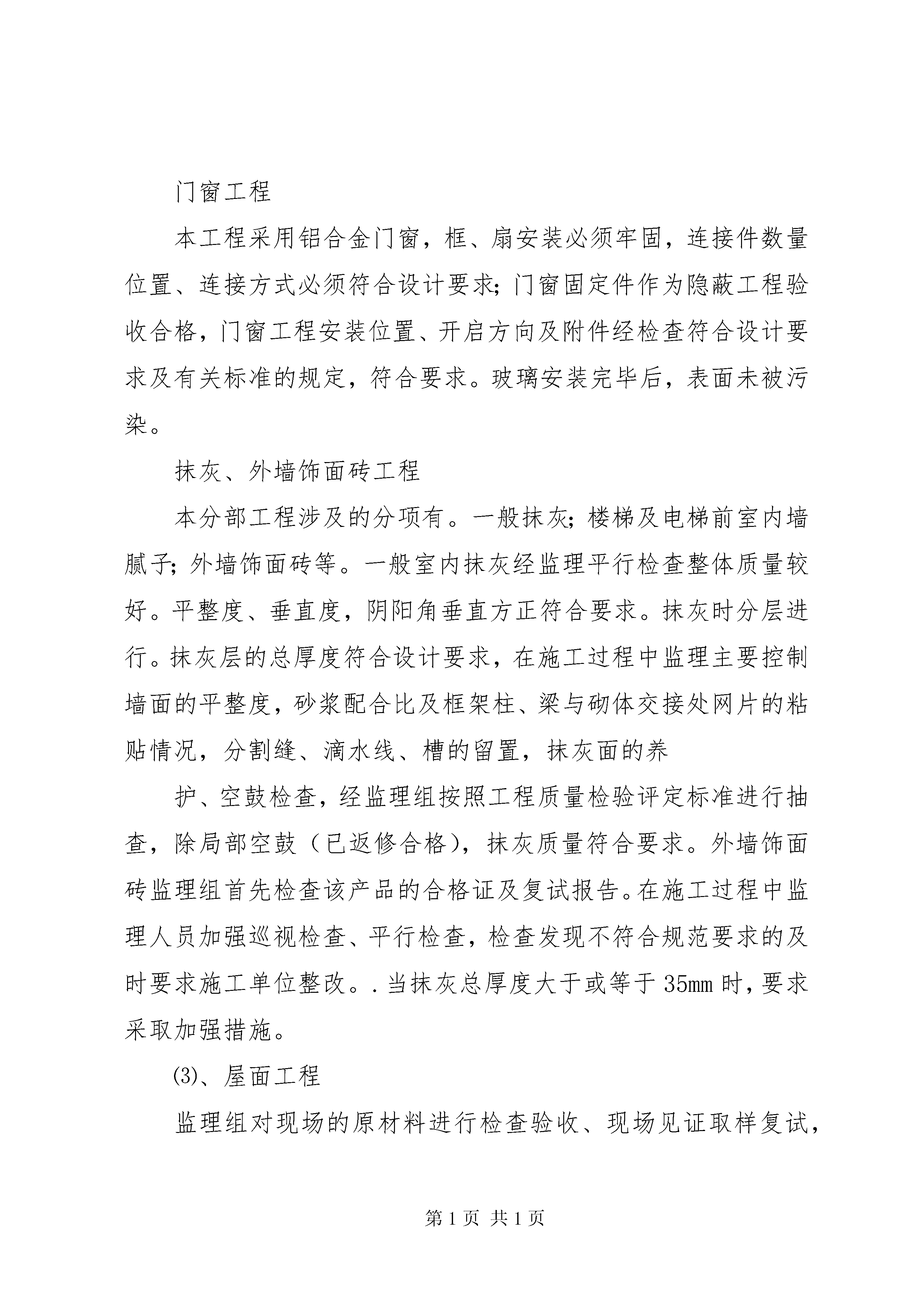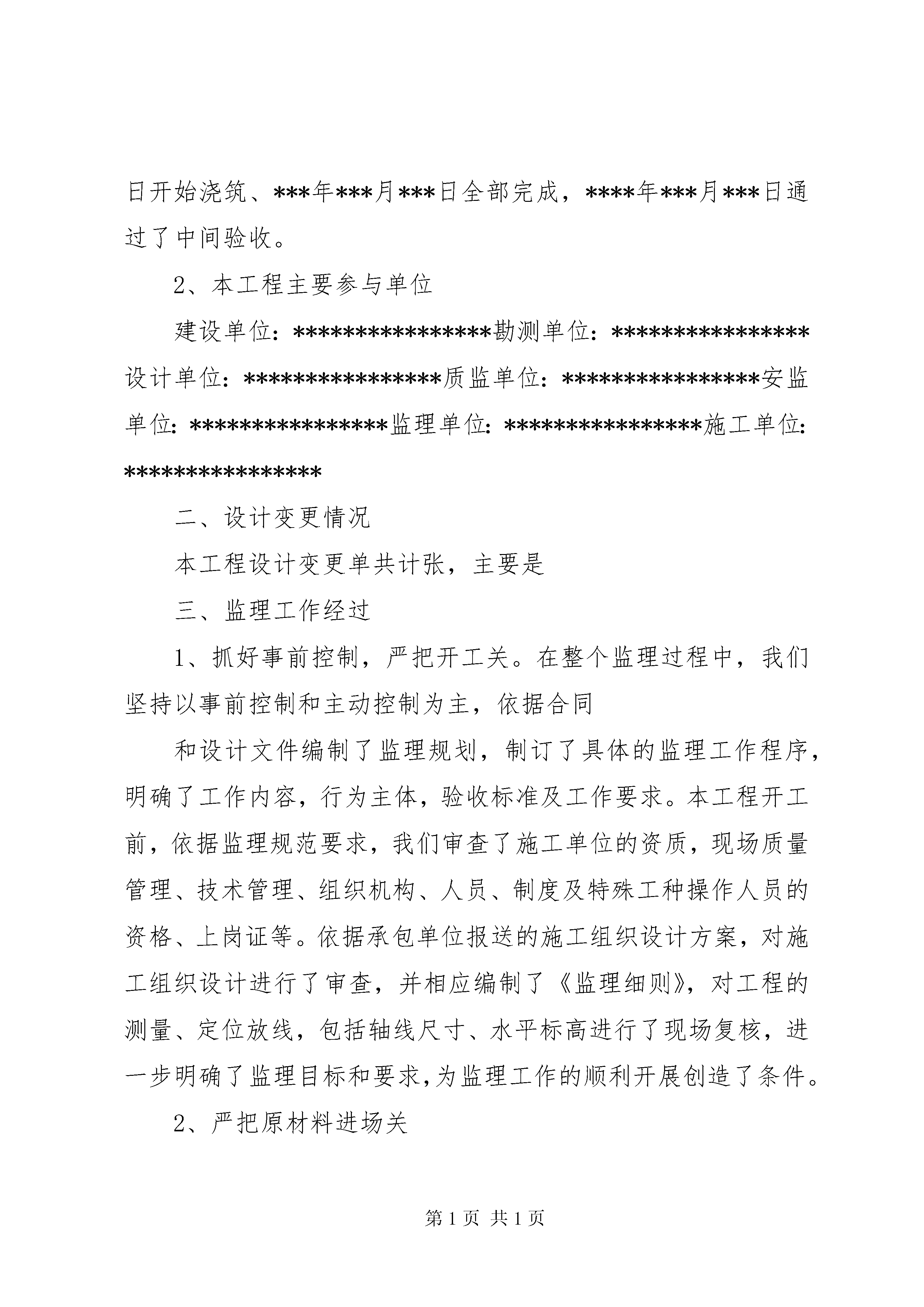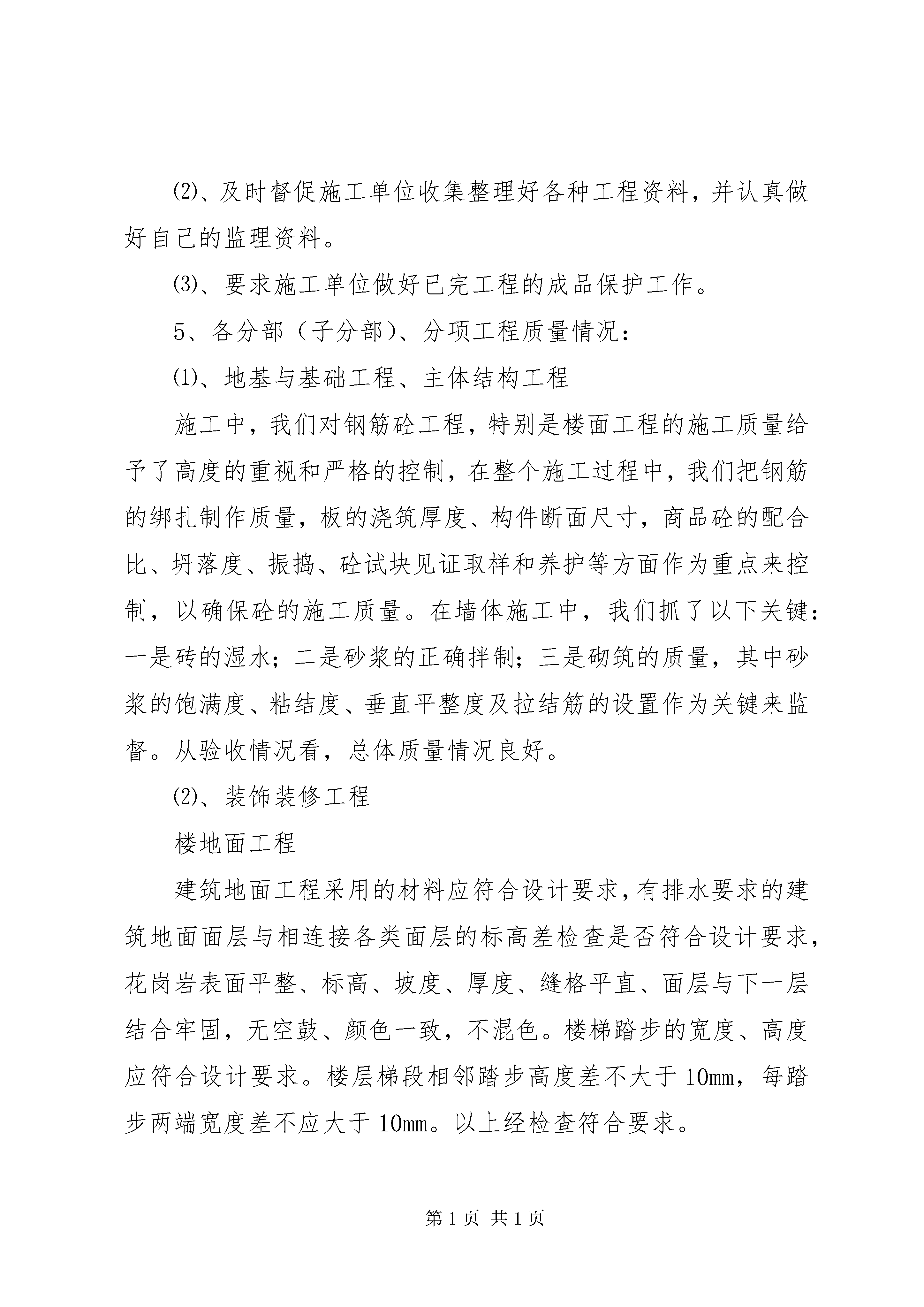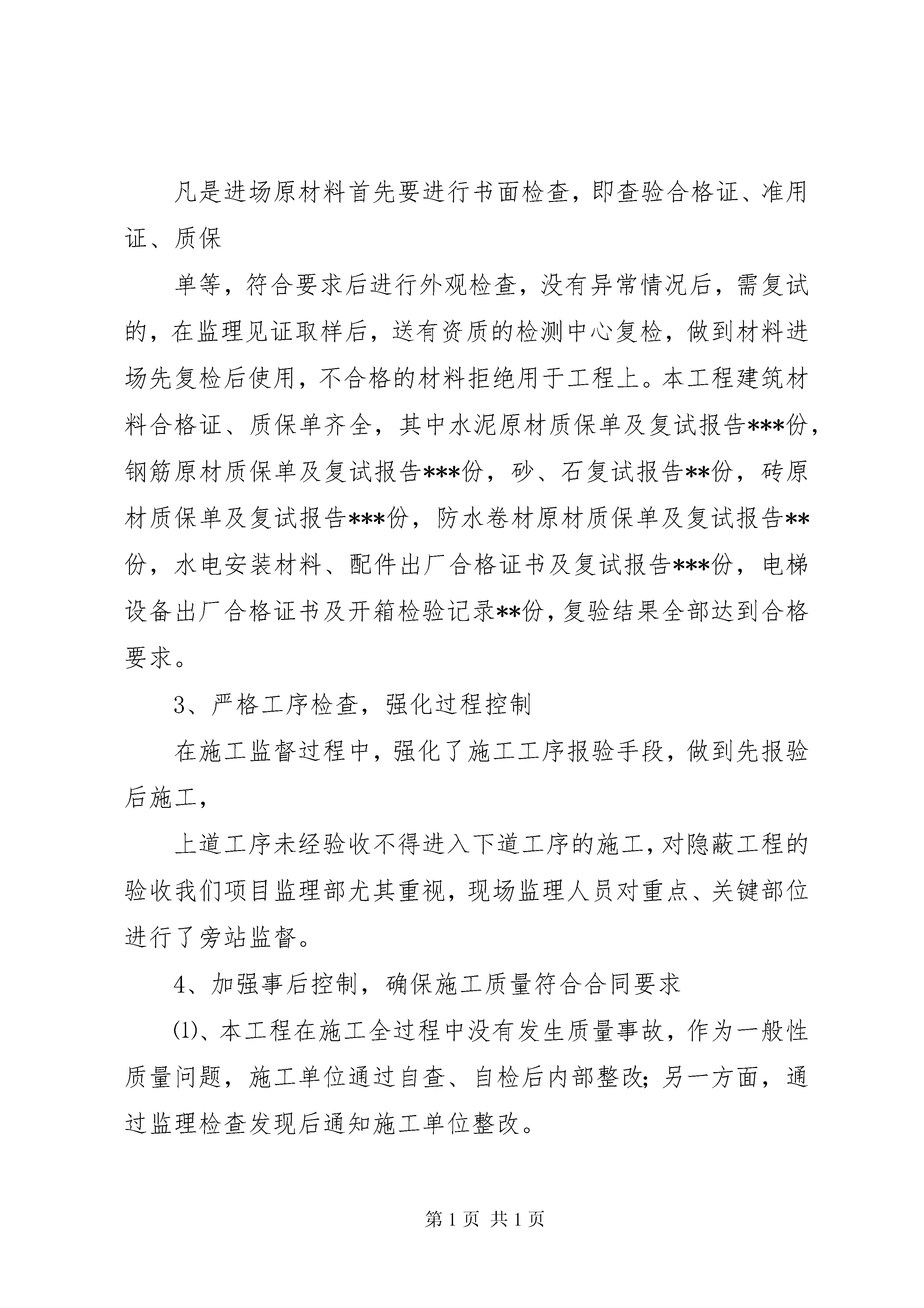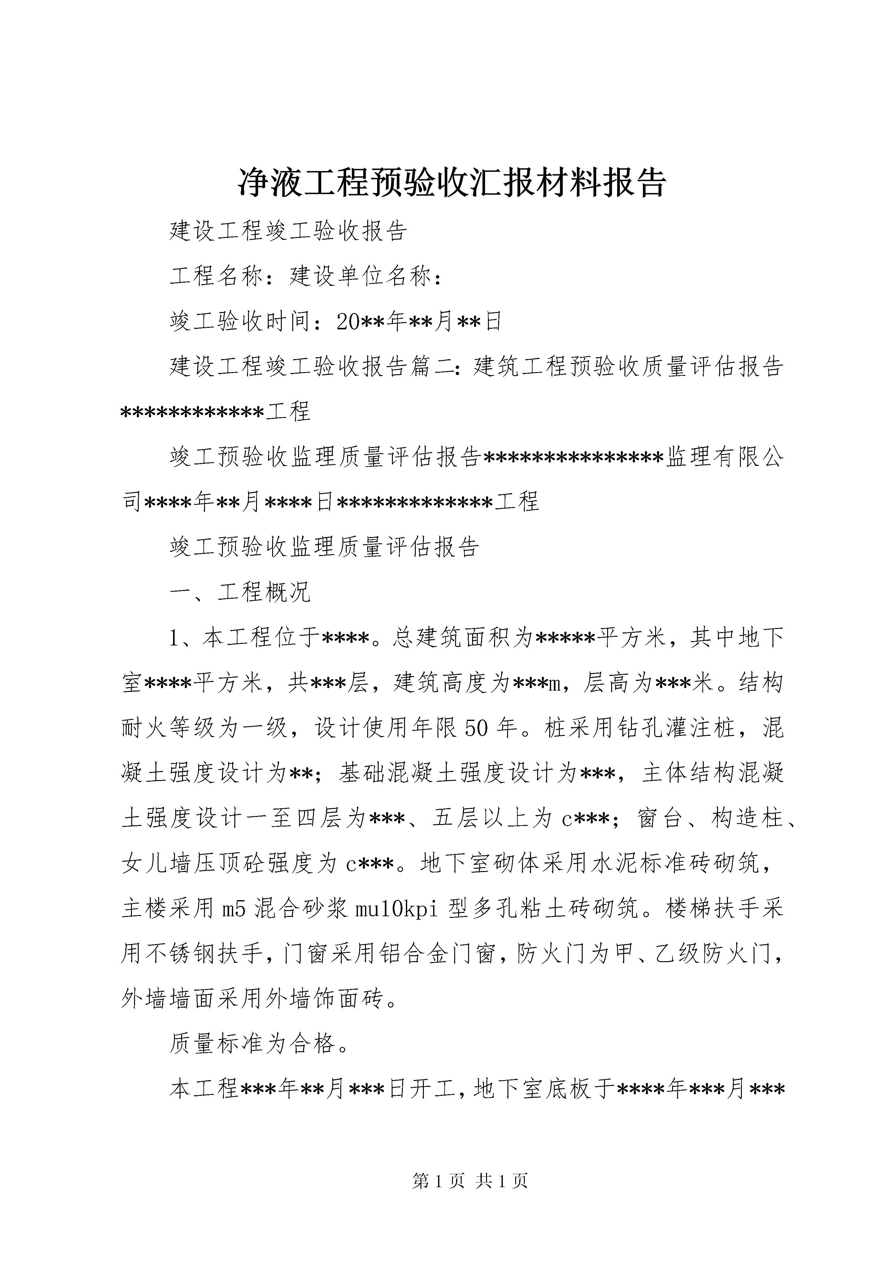 净液工程预验收汇报材料报告建设工程竣工验收报告工程名称:建设单位名称:竣工验收时间:20**年**月**日建设工程竣工验收报告篇二:建筑工程预验收质量评估报告************工程竣工预验收监理质量评估报告***************监理有限公司****年**月****日*************工程竣工预验收监理质量评估报告一、工程概况1、本工程位于****。总建筑面积为*****平方米,其中地下室****平方米,共***层,建筑高度为***m,层高为***米。结构耐火等级为一级,设计使用年限50年。桩采用钻孔灌注桩,混凝土强度设计为**;基础混凝土强度设计为***,主体结构混凝土强度设计一至四层为***、五层以上为c***;窗台、构造柱、女儿墙压顶砼强度为c***。地下室砌体采用水泥标准砖砌筑,主楼采用m5混合砂浆mu10kpi型多孔粘土砖砌筑。楼梯扶手采用不锈钢扶手,门窗采用铝合金门窗,防火门为甲、乙级防火门,外墙墙面采用外墙饰面砖。质量标准为合格。本工程***年**月***日开工,地下室底板于****年***月***日开始浇筑、***年***月***日全部完成,****年***月***日通过了中间验收。2、本工程主要参与单位建设单位:****************勘测单位:****************设计单位:****************质监单位:****************安监单位:****************监理单位:****************施工单位:****************二、设计变更情况本工程设计变更单共计张,主要是三、监理工作经过1、抓好事前控制,严把开工关。在整个监理过程中,我们坚持以事前控制和主动控制为主,依据合同和设计文件编制了监理规划,制订了具体的监理工作程序,明确了工作内容,行为主体,验收标准及工作要求。本工程开工前,依据监理规范要求,我们审查了施工单位的资质,现场质量管理、技术管理、组织机构、人员、制度及特殊工种操作人员的资格、上岗证等。依据承包单位报送的施工组织设计方案,对施工组织设计进行了审查,并相应编制了《监理细则》,对工程的测量、定位放线,包括轴线尺寸、水平标高进行了现场复核,进一步明确了监理目标和要求,为监理工作的顺利开展创造了条件。2、严把原材料进场关凡是进场原材料首先要进行书面检查,即查验合格证、准用证、质保单等,符合要求后进行外观检查,没有异常情况后,需复试的,在监理见证取样后,送有资质的检测中心复检,做到材料进场先复检后使用,不合格的材料拒绝用于工程上。本工程建筑材料合格证、质保单齐全,其中水泥原材质保单及复试报告***份,钢筋原材质保单及复试报告***份,砂、石复试报告**份,砖原材质保单及复试报告***份,防水卷材原材质保单及复试报告**份,水电安装材料、配件出厂合格证书及复试报告***份,电梯设备出厂合格证书及开箱检验记录**份,复验结果全部达到合格要求。3、严格工序检查,强化过程控制在施工监督过程中,强化了施工工序报验手段,做到先报验后施工,上道工序未经验收不得进入下道工序的施工,对隐蔽工程的验收我们项目监理部尤其重视,现场监理人员对重点、关键部位进行了旁站监督。4、加强事后控制,确保施工质量符合合同要求⑴、本工程在施工全过程中没有发生质量事故,作为一般性质量问题,施工单位通过自查、自检后内部整改;另一方面,通过监理检查发现后通知施工单位整改。⑵、及时督促施工单位收集整理好各种工程资料,并认真做好自己的监理资料。⑶、要求施工单位做好已完工程的成品保护工作。5、各分部(子分部)、分项工程质量情况:⑴、地基与基础工程、主体结构工程施工中,我们对钢筋砼工程,特别是楼面工程的施工质量给予了高度的重视和严格的控制,在整个施工过程中,我们把钢筋的绑扎制作质量,板的浇筑厚度、构件断面尺寸,商品砼的配合比、坍落度、振捣、砼试块见证取样和养护等方面作为重点来控制,以确保砼的施工质量。在墙体施工中,我们抓了以下关键:一是砖的湿水;二是砂浆的正确拌制;三是砌筑的质量,其中砂浆的饱满度、粘结度、垂直平整度及拉结筋的设置作为关键来监督。从验收情况看,总体质量情况良好。⑵、装饰装修工程楼地面工程建筑地面工程采用的材料应符合设计要求,有排水要求的建筑地面面层与相连接各类面层的标高差检查是否符合设计要求,花岗岩表面平整、标高、坡度、厚度、缝格平直、面层与下一层结合牢固,无空鼓、颜色一致,不混色。楼梯踏步的宽度、高度应符合设计要求。楼层梯段相邻踏步高度差不大于10mm,每踏步两端宽度差不应大于10mm。以上经检查符合要求。门窗工程本工程采用铝合金门窗,框、扇安装必须牢固,连接件数量位置、连接方式必须符合设计要求;门窗固定件作为隐蔽工程验收