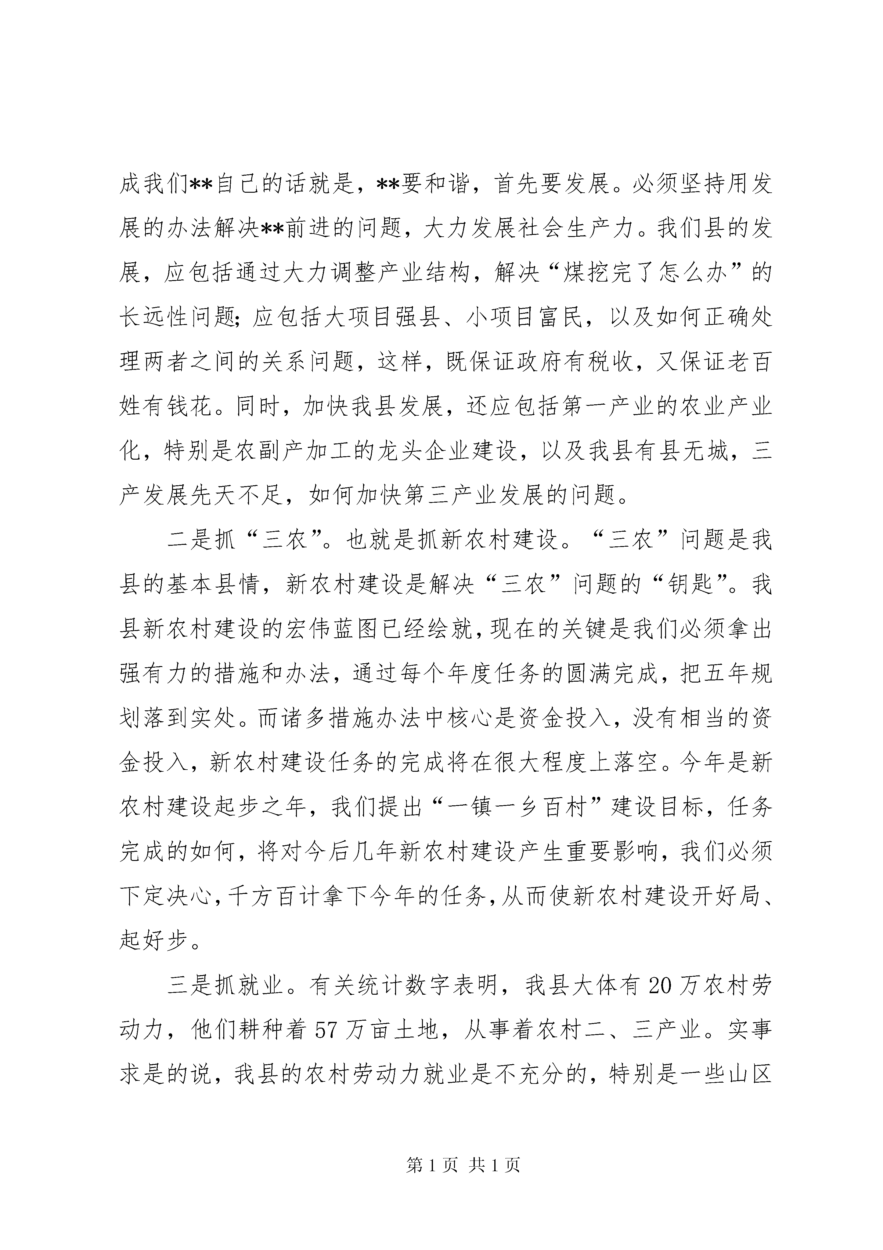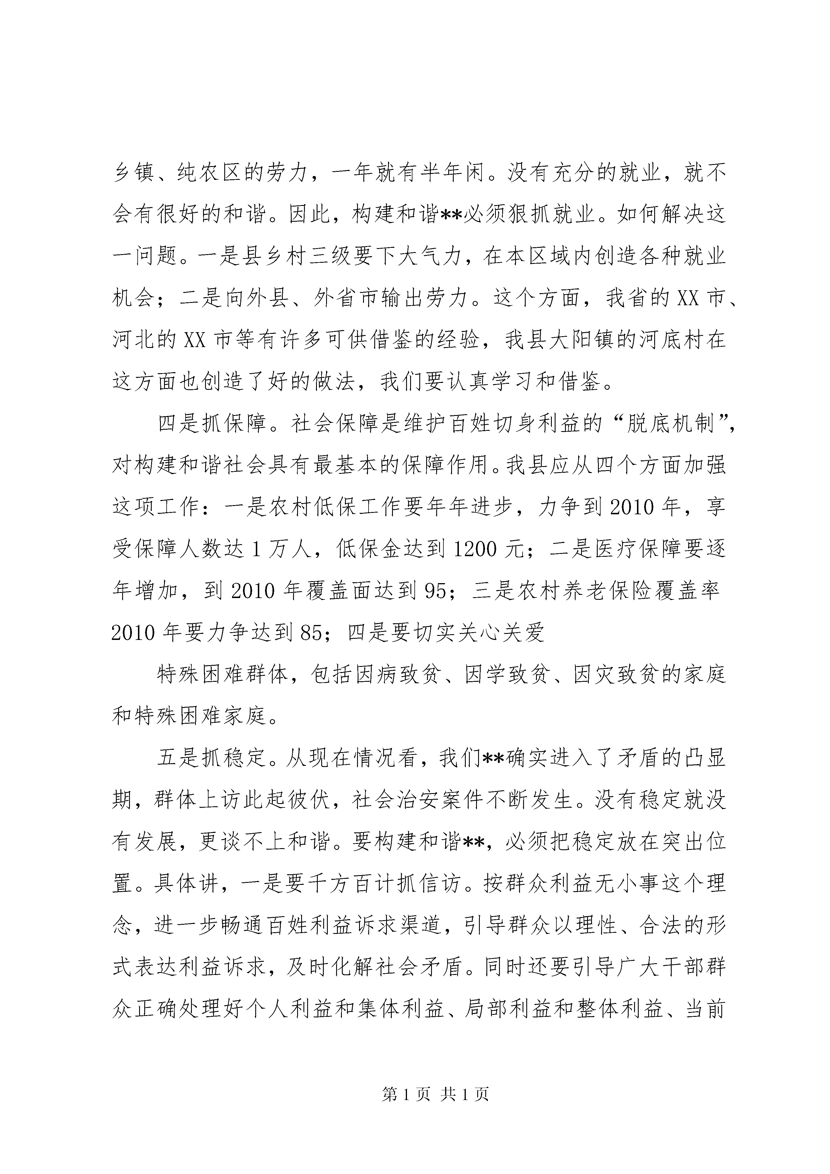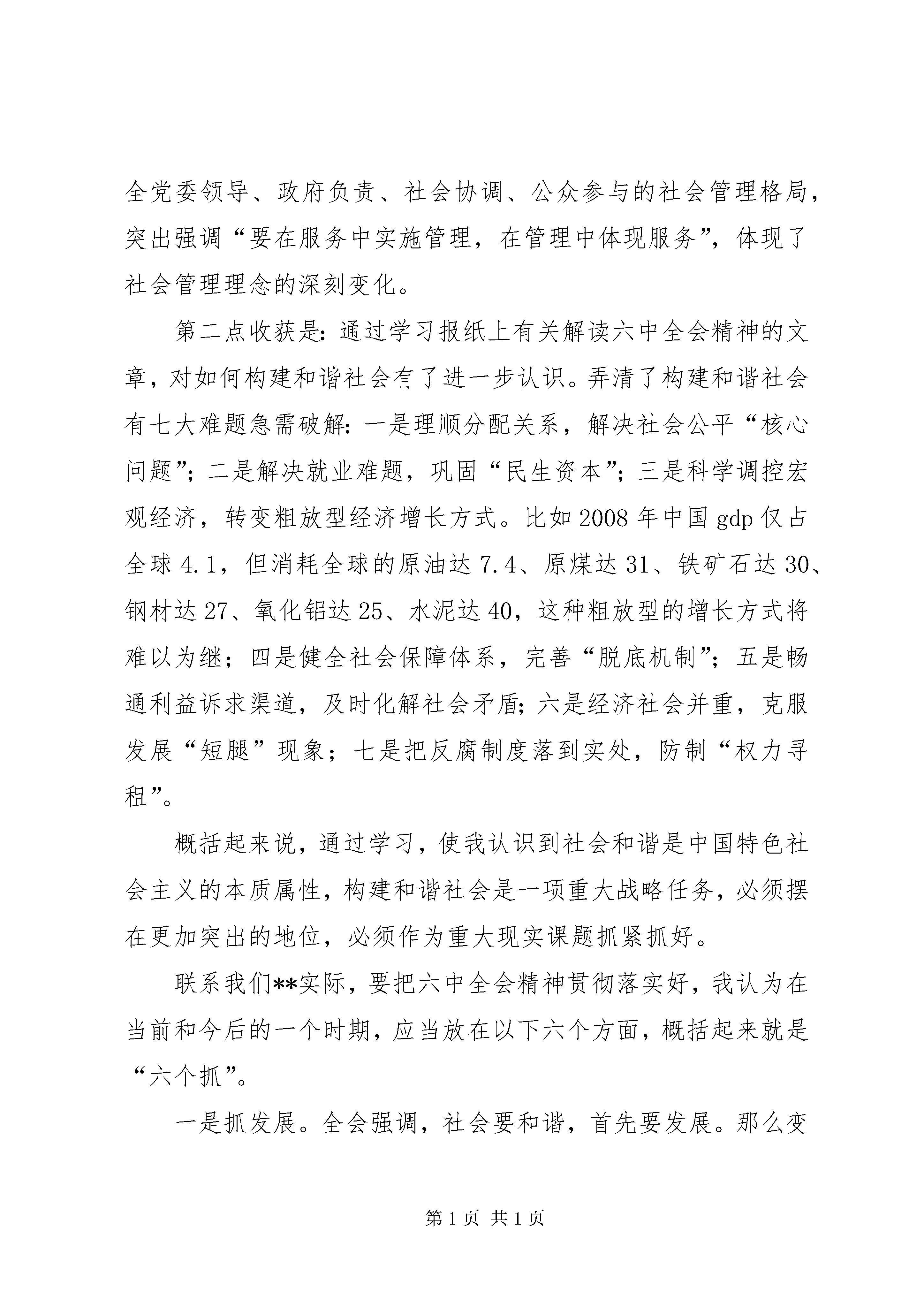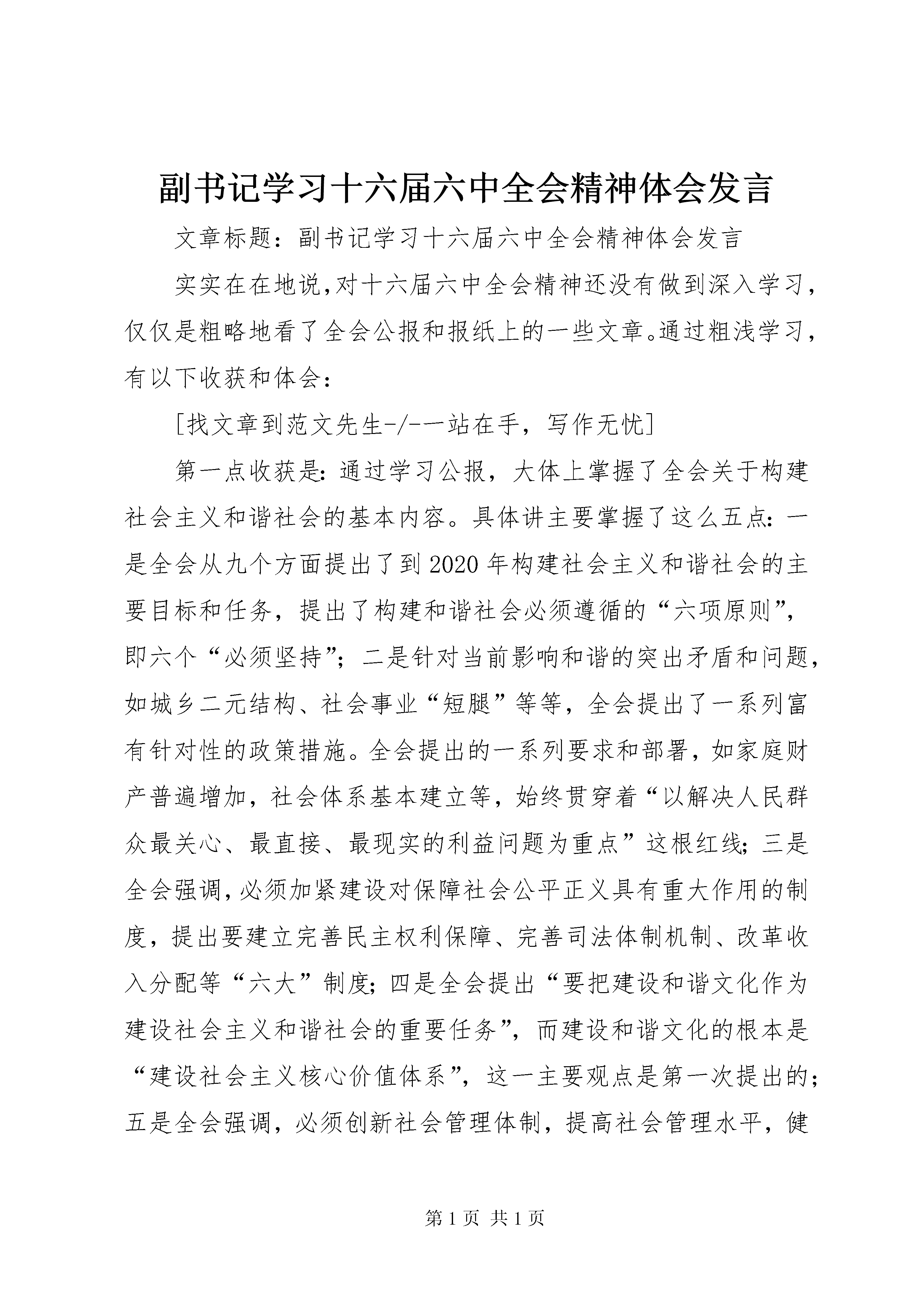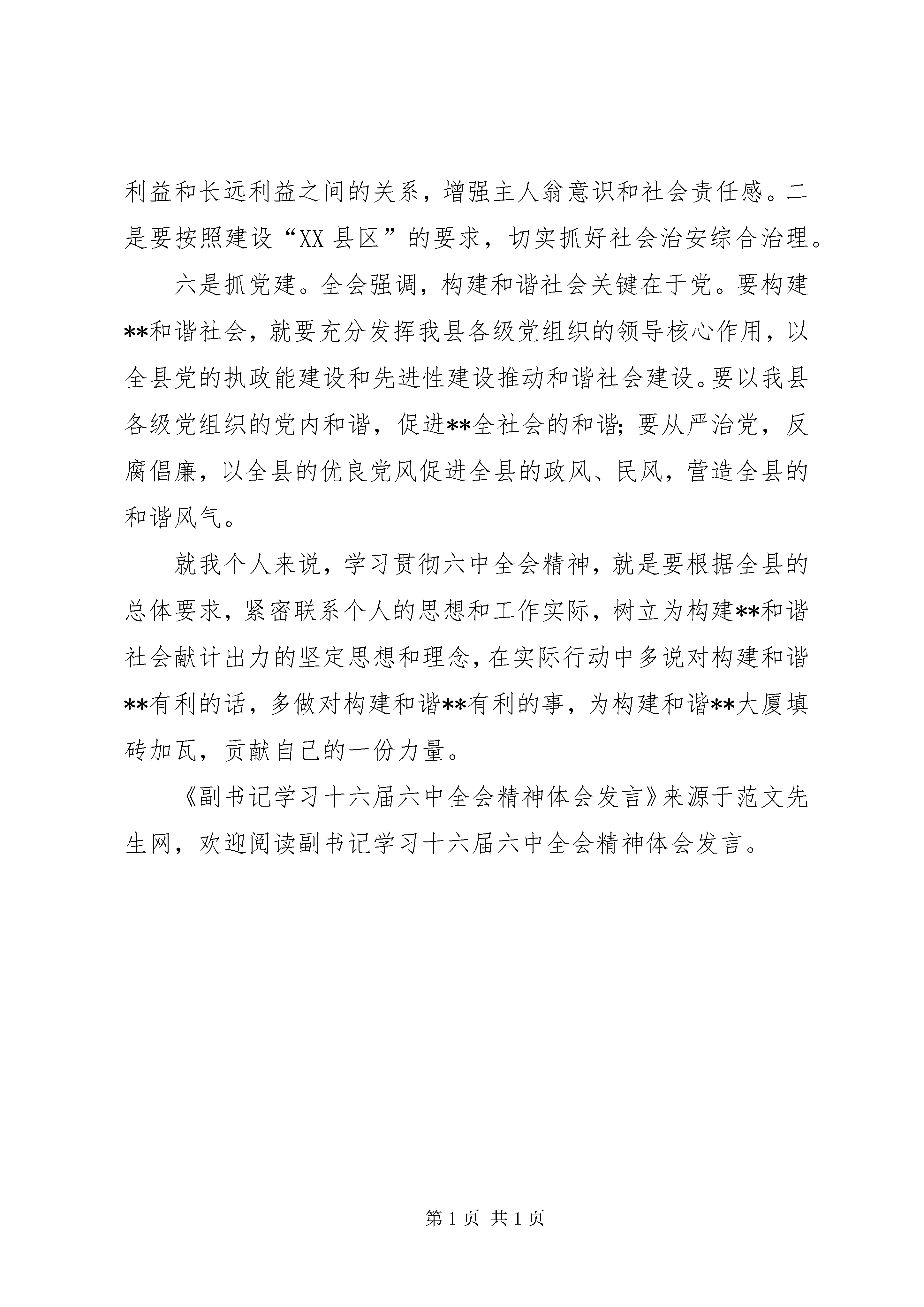 副书记学习十六届六中全会精神体会发言文章标题:副书记学习十六届六中全会精神体会发言实实在在地说,对十六届六中全会精神还没有做到深入学习,仅仅是粗略地看了全会公报和报纸上的一些文章。通过粗浅学习,有以下收获和体会:[找文章到范文先生-/-一站在手,写作无忧]第一点收获是:通过学习公报,大体上掌握了全会关于构建社会主义和谐社会的基本内容。具体讲主要掌握了这么五点:一是全会从九个方面提出了到2020年构建社会主义和谐社会的主要目标和任务,提出了构建和谐社会必须遵循的“六项原则”,即六个“必须坚持”;二是针对当前影响和谐的突出矛盾和问题,如城乡二元结构、社会事业“短腿”等等,全会提出了一系列富有针对性的政策措施。全会提出的一系列要求和部署,如家庭财产普遍增加,社会体系基本建立等,始终贯穿着“以解决人民群众最关心、最直接、最现实的利益问题为重点”这根红线;三是全会强调,必须加紧建设对保障社会公平正义具有重大作用的制度,提出要建立完善民主权利保障、完善司法体制机制、改革收入分配等“六大”制度;四是全会提出“要把建设和谐文化作为建设社会主义和谐社会的重要任务”,而建设和谐文化的根本是“建设社会主义核心价值体系”,这一主要观点是第一次提出的;五是全会强调,必须创新社会管理体制,提高社会管理水平,健全党委领导、政府负责、社会协调、公众参与的社会管理格局,突出强调“要在服务中实施管理,在管理中体现服务”,体现了社会管理理念的深刻变化。第二点收获是:通过学习报纸上有关解读六中全会精神的文章,对如何构建和谐社会有了进一步认识。弄清了构建和谐社会有七大难题急需破解:一是理顺分配关系,解决社会公平“核心问题”;二是解决就业难题,巩固“民生资本”;三是科学调控宏观经济,转变粗放型经济增长方式。比如2008年中国gdp仅占全球4.1,但消耗全球的原油达7.4、原煤达31、铁矿石达30、钢材达27、氧化铝达25、水泥达40,这种粗放型的增长方式将难以为继;四是健全社会保障体系,完善“脱底机制”;五是畅通利益诉求渠道,及时化解社会矛盾;六是经济社会并重,克服发展“短腿”现象;七是把反腐制度落到实处,防制“权力寻租”。概括起来说,通过学习,使我认识到社会和谐是中国特色社会主义的本质属性,构建和谐社会是一项重大战略任务,必须摆在更加突出的地位,必须作为重大现实课题抓紧抓好。联系我们**实际,要把六中全会精神贯彻落实好,我认为在当前和今后的一个时期,应当放在以下六个方面,概括起来就是“六个抓”。一是抓发展。全会强调,社会要和谐,首先要发展。那么变成我们**自己的话就是,**要和谐,首先要发展。必须坚持用发展的办法解决**前进的问题,大力发展社会生产力。我们县的发展,应包括通过大力调整产业结构,解决“煤挖完了怎么办”的长远性问题;应包括大项目强县、小项目富民,以及如何正确处理两者之间的关系问题,这样,既保证政府有税收,又保证老百姓有钱花。同时,加快我县发展,还应包括第一产业的农业产业化,特别是农副产加工的龙头企业建设,以及我县有县无城,三产发展先天不足,如何加快第三产业发展的问题。二是抓“三农”。也就是抓新农村建设。“三农”问题是我县的基本县情,新农村建设是解决“三农”问题的“钥匙”。我县新农村建设的宏伟蓝图已经绘就,现在的关键是我们必须拿出强有力的措施和办法,通过每个年度任务的圆满完成,把五年规划落到实处。而诸多措施办法中核心是资金投入,没有相当的资金投入,新农村建设任务的完成将在很大程度上落空。今年是新农村建设起步之年,我们提出“一镇一乡百村”建设目标,任务完成的如何,将对今后几年新农村建设产生重要影响,我们必须下定决心,千方百计拿下今年的任务,从而使新农村建设开好局、起好步。三是抓就业。有关统计数字表明,我县大体有20万农村劳动力,他们耕种着57万亩土地,从事着农村二、三产业。实事求是的说,我县的农村劳动力就业是不充分的,特别是一些山区乡镇、纯农区的劳力,一年就有半年闲。没有充分的就业,就不会有很好的和谐。因此,构建和谐**必须狠抓就业。如何解决这一问题。一是县乡村三级要下大气力,在本区域内创造各种就业机会;二是向外县、外省市输出劳力。这个方面,我省的XX市、河北的XX市等有许多可供借鉴的经验,我县大阳镇的河底村在这方面也创造了好的做法,我们要认真学习和借鉴。四是抓保障。社会保障是维护百姓切身利益的“脱底机制”,对构建和谐社会具有最基本的保障作用。我县应从四个方面加强这项工作:一是农村低保工作要年年进步,力争到2010年,享受保障人数达1万人,低保金达到1200元;二是医疗保障要逐年增加,到2010年覆盖面达到95;三是农村养老保险覆盖率2010年要力争达到85;四是要切实关心关爱特殊困难群体,包括因病致贫、因学致贫、因灾致贫的家庭和特殊