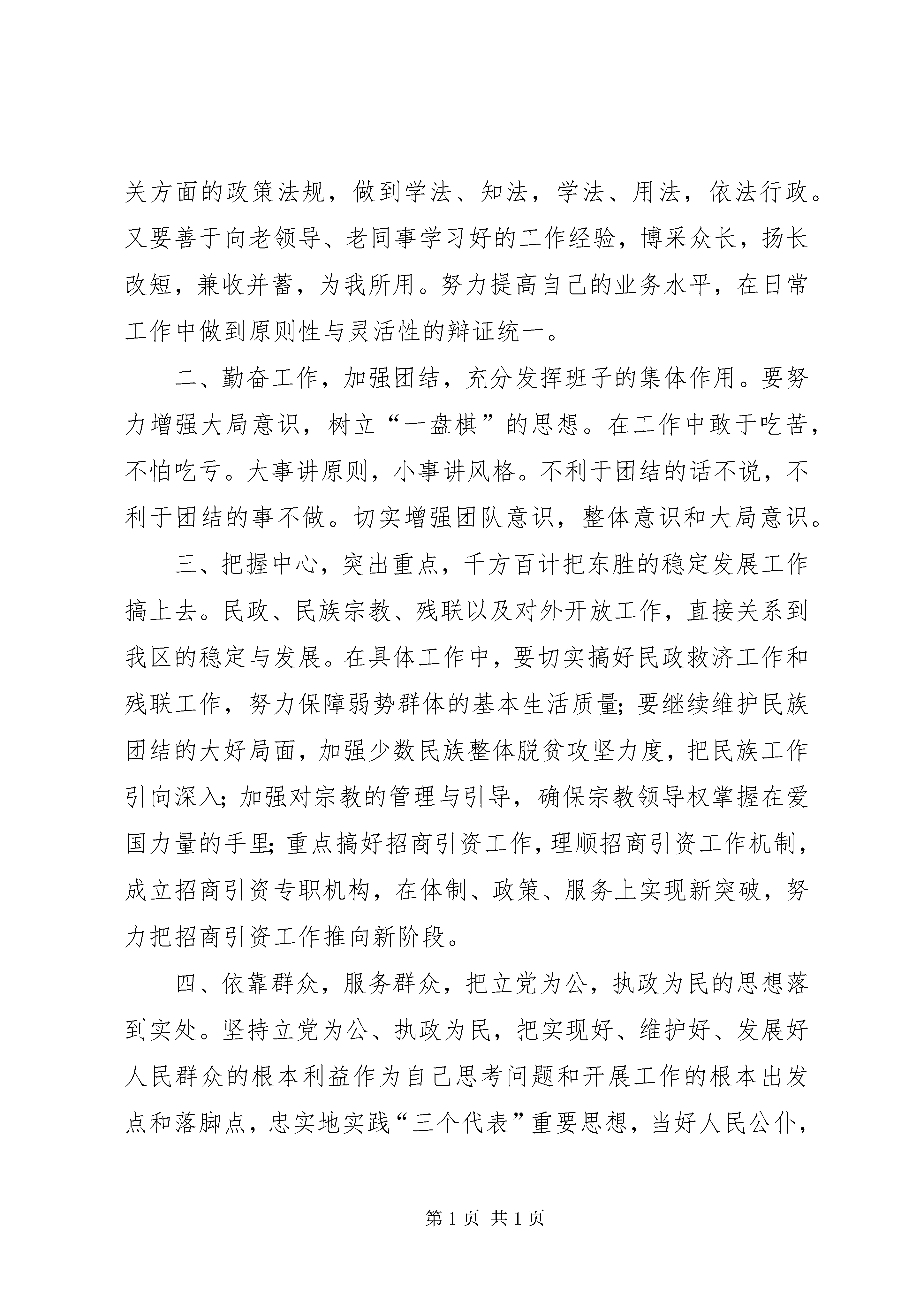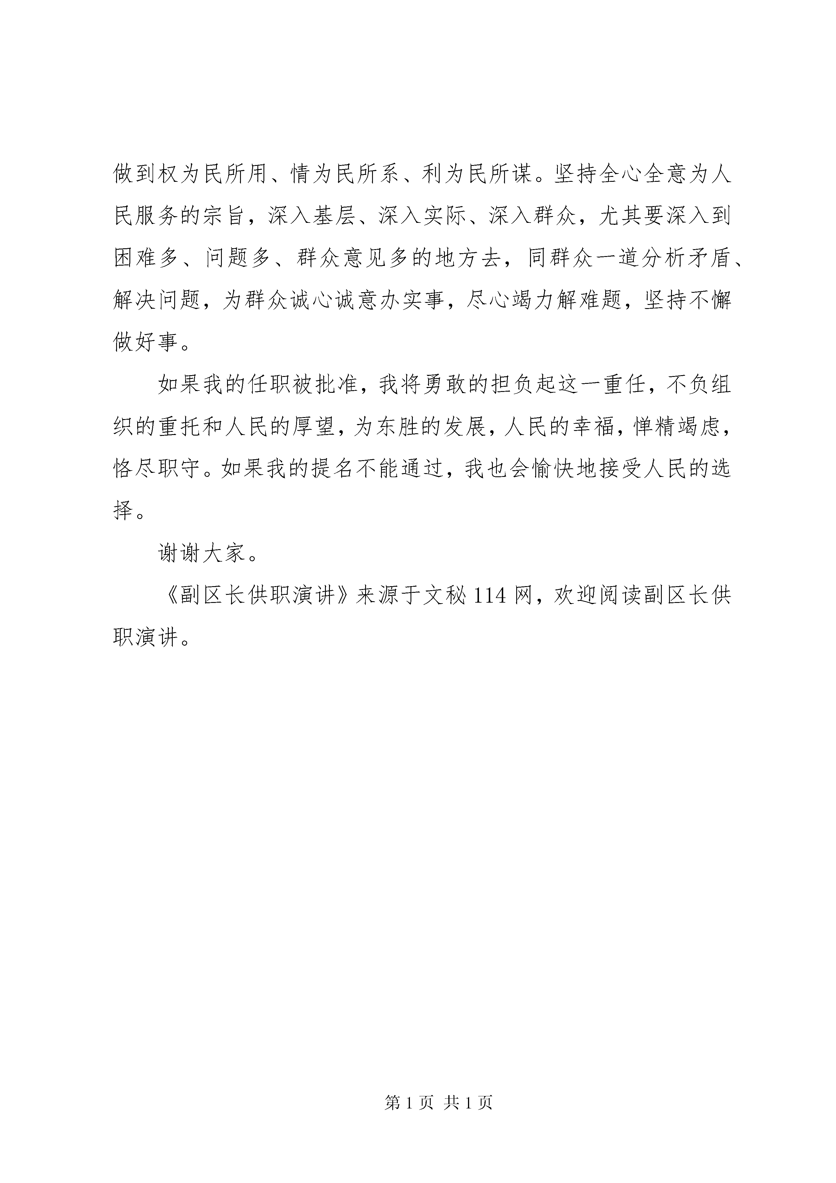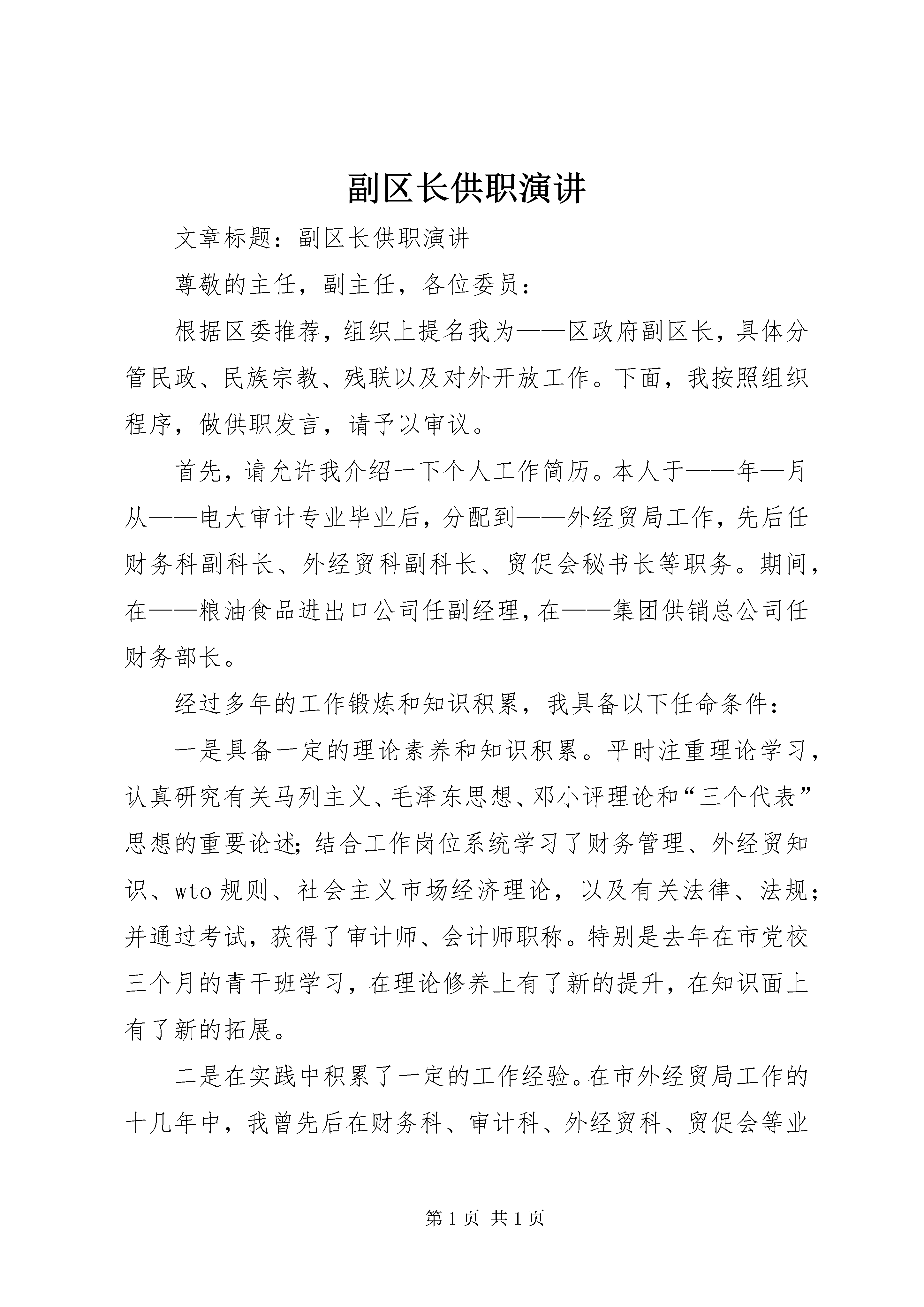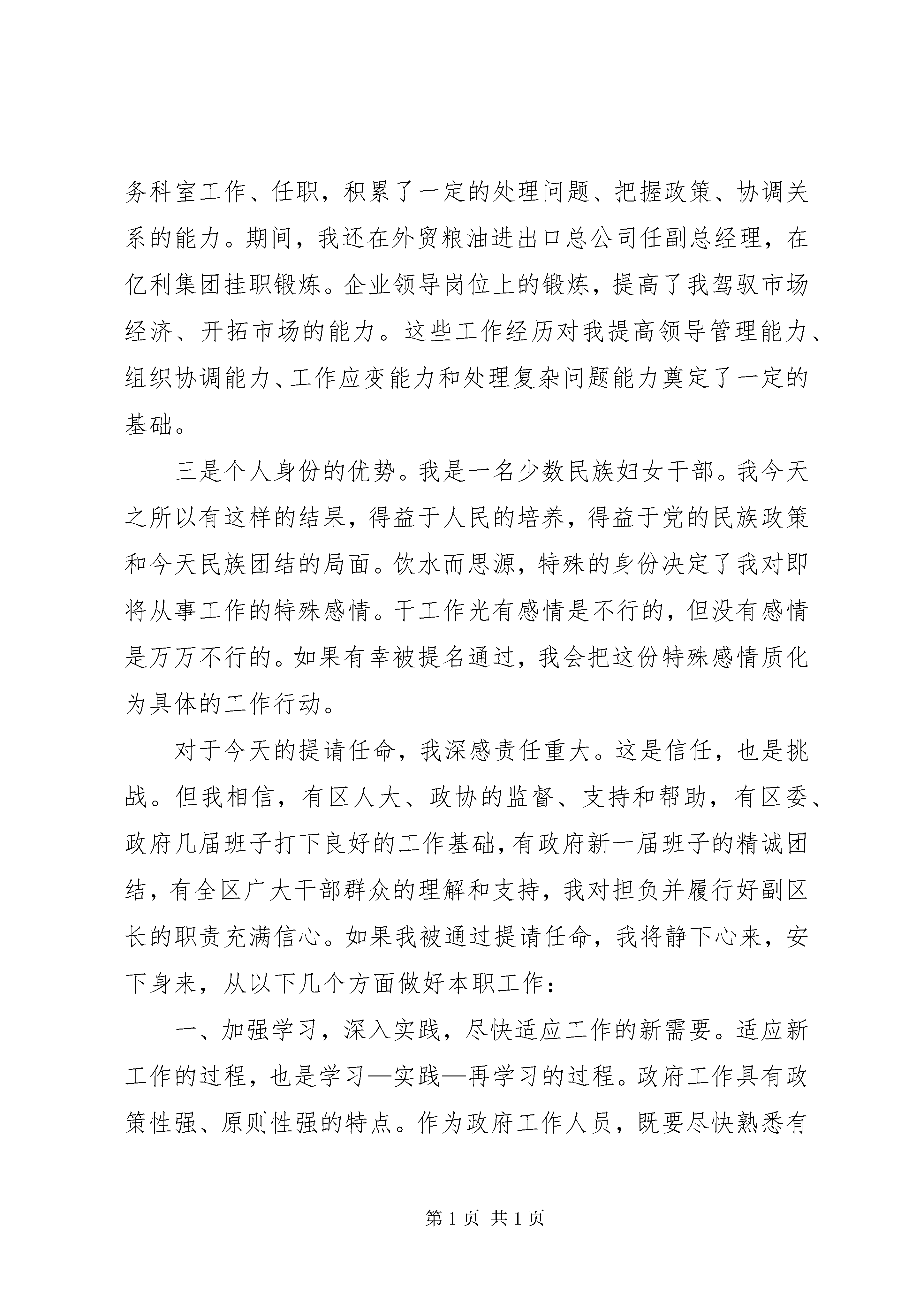 副区长供职演讲文章标题:副区长供职演讲尊敬的主任,副主任,各位委员:根据区委推荐,组织上提名我为——区政府副区长,具体分管民政、民族宗教、残联以及对外开放工作。下面,我按照组织程序,做供职发言,请予以审议。首先,请允许我介绍一下个人工作简历。本人于——年—月从——电大审计专业毕业后,分配到——外经贸局工作,先后任财务科副科长、外经贸科副科长、贸促会秘书长等职务。期间,在——粮油食品进出口公司任副经理,在——集团供销总公司任财务部长。经过多年的工作锻炼和知识积累,我具备以下任命条件:一是具备一定的理论素养和知识积累。平时注重理论学习,认真研究有关马列主义、毛泽东思想、邓小评理论和“三个代表”思想的重要论述;结合工作岗位系统学习了财务管理、外经贸知识、wto规则、社会主义市场经济理论,以及有关法律、法规;并通过考试,获得了审计师、会计师职称。特别是去年在市党校三个月的青干班学习,在理论修养上有了新的提升,在知识面上有了新的拓展。二是在实践中积累了一定的工作经验。在市外经贸局工作的十几年中,我曾先后在财务科、审计科、外经贸科、贸促会等业务科室工作、任职,积累了一定的处理问题、把握政策、协调关系的能力。期间,我还在外贸粮油进出口总公司任副总经理,在亿利集团挂职锻炼。企业领导岗位上的锻炼,提高了我驾驭市场经济、开拓市场的能力。这些工作经历对我提高领导管理能力、组织协调能力、工作应变能力和处理复杂问题能力奠定了一定的基础。三是个人身份的优势。我是一名少数民族妇女干部。我今天之所以有这样的结果,得益于人民的培养,得益于党的民族政策和今天民族团结的局面。饮水而思源,特殊的身份决定了我对即将从事工作的特殊感情。干工作光有感情是不行的,但没有感情是万万不行的。如果有幸被提名通过,我会把这份特殊感情质化为具体的工作行动。对于今天的提请任命,我深感责任重大。这是信任,也是挑战。但我相信,有区人大、政协的监督、支持和帮助,有区委、政府几届班子打下良好的工作基础,有政府新一届班子的精诚团结,有全区广大干部群众的理解和支持,我对担负并履行好副区长的职责充满信心。如果我被通过提请任命,我将静下心来,安下身来,从以下几个方面做好本职工作:一、加强学习,深入实践,尽快适应工作的新需要。适应新工作的过程,也是学习—实践—再学习的过程。政府工作具有政策性强、原则性强的特点。作为政府工作人员,既要尽快熟悉有关方面的政策法规,做到学法、知法,学法、用法,依法行政。又要善于向老领导、老同事学习好的工作经验,博采众长,扬长改短,兼收并蓄,为我所用。努力提高自己的业务水平,在日常工作中做到原则性与灵活性的辩证统一。二、勤奋工作,加强团结,充分发挥班子的集体作用。要努力增强大局意识,树立“一盘棋”的思想。在工作中敢于吃苦,不怕吃亏。大事讲原则,小事讲风格。不利于团结的话不说,不利于团结的事不做。切实增强团队意识,整体意识和大局意识。三、把握中心,突出重点,千方百计把东胜的稳定发展工作搞上去。民政、民族宗教、残联以及对外开放工作,直接关系到我区的稳定与发展。在具体工作中,要切实搞好民政救济工作和残联工作,努力保障弱势群体的基本生活质量;要继续维护民族团结的大好局面,加强少数民族整体脱贫攻坚力度,把民族工作引向深入;加强对宗教的管理与引导,确保宗教领导权掌握在爱国力量的手里;重点搞好招商引资工作,理顺招商引资工作机制,成立招商引资专职机构,在体制、政策、服务上实现新突破,努力把招商引资工作推向新阶段。四、依靠群众,服务群众,把立党为公,执政为民的思想落到实处。坚持立党为公、执政为民,把实现好、维护好、发展好人民群众的根本利益作为自己思考问题和开展工作的根本出发点和落脚点,忠实地实践“三个代表”重要思想,当好人民公仆,做到权为民所用、情为民所系、利为民所谋。坚持全心全意为人民服务的宗旨,深入基层、深入实际、深入群众,尤其要深入到困难多、问题多、群众意见多的地方去,同群众一道分析矛盾、解决问题,为群众诚心诚意办实事,尽心竭力解难题,坚持不懈做好事。如果我的任职被批准,我将勇敢的担负起这一重任,不负组织的重托和人民的厚望,为东胜的发展,人民的幸福,惮精竭虑,恪尽职守。如果我的提名不能通过,我也会愉快地接受人民的选择。谢谢大家。《副区长供职演讲》来源于文秘114网,欢迎阅读副区长供职演讲。