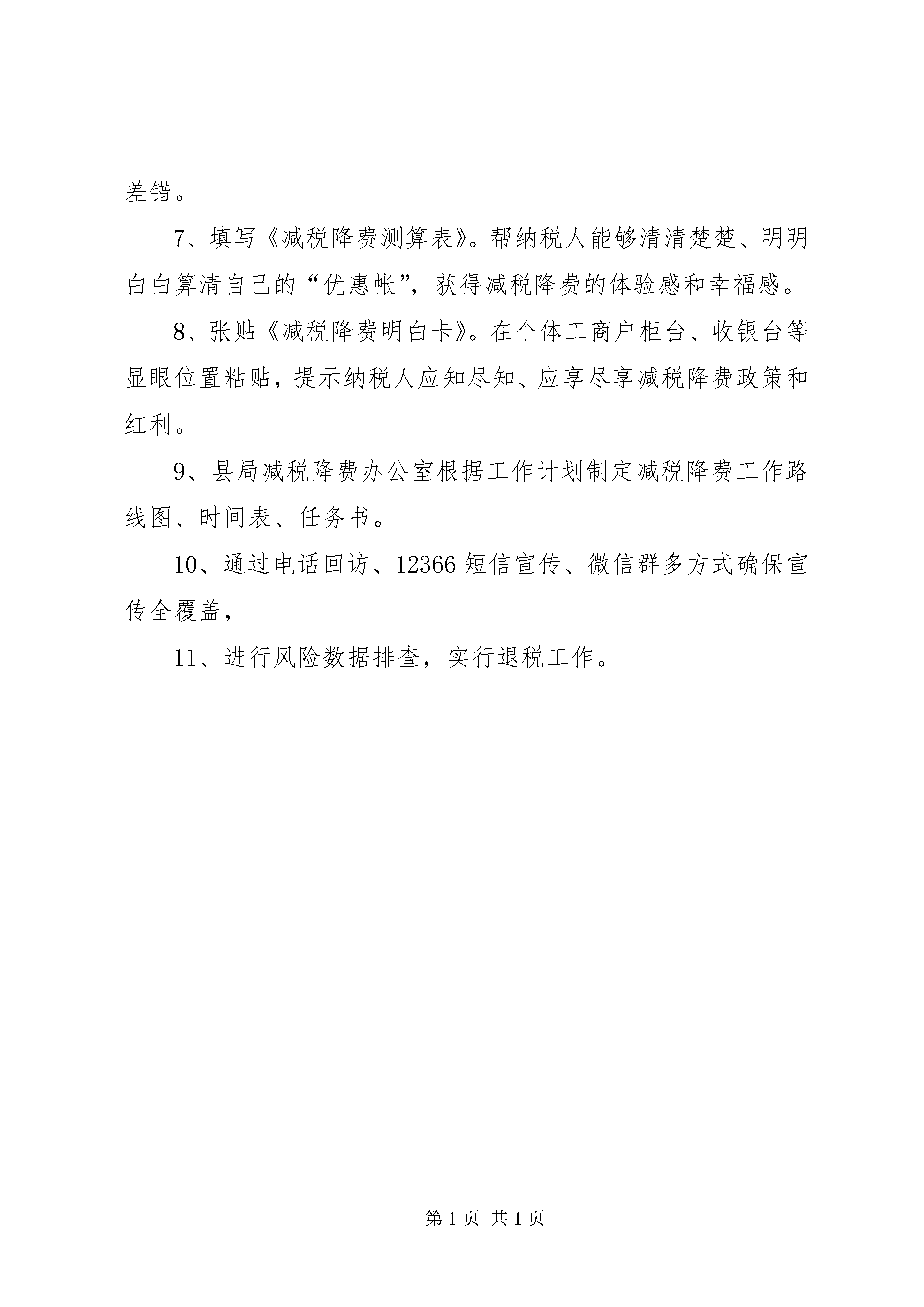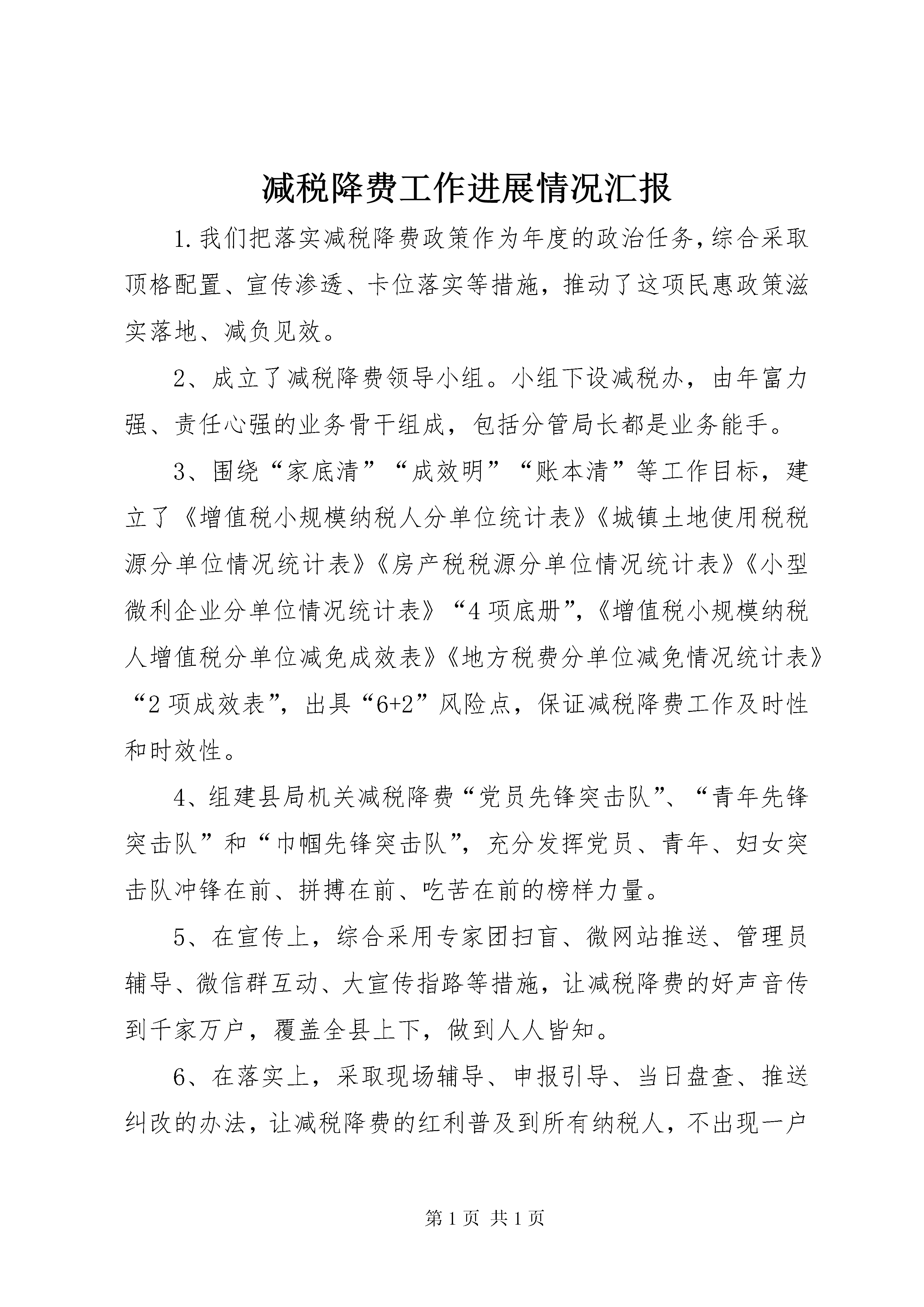 减税降费工作进展情况汇报1.我们把落实减税降费政策作为年度的政治任务,综合采取顶格配置、宣传渗透、卡位落实等措施,推动了这项民惠政策滋实落地、减负见效。2、成立了减税降费领导小组。小组下设减税办,由年富力强、责任心强的业务骨干组成,包括分管局长都是业务能手。3、围绕“家底清”“成效明”“账本清”等工作目标,建立了《增值税小规模纳税人分单位统计表》《城镇土地使用税税源分单位情况统计表》《房产税税源分单位情况统计表》《小型微利企业分单位情况统计表》“4项底册”,《增值税小规模纳税人增值税分单位减免成效表》《地方税费分单位减免情况统计表》“2项成效表”,出具“6+2”风险点,保证减税降费工作及时性和时效性。4、组建县局机关减税降费“党员先锋突击队”、“青年先锋突击队”和“巾帼先锋突击队”,充分发挥党员、青年、妇女突击队冲锋在前、拼搏在前、吃苦在前的榜样力量。5、在宣传上,综合采用专家团扫盲、微网站推送、管理员辅导、微信群互动、大宣传指路等措施,让减税降费的好声音传到千家万户,覆盖全县上下,做到人人皆知。6、在落实上,采取现场辅导、申报引导、当日盘查、推送纠改的办法,让减税降费的红利普及到所有纳税人,不出现一户差错。7、填写《减税降费测算表》。帮纳税人能够清清楚楚、明明白白算清自己的“优惠帐”,获得减税降费的体验感和幸福感。8、张贴《减税降费明白卡》。在个体工商户柜台、收银台等显眼位置粘贴,提示纳税人应知尽知、应享尽享减税降费政策和红利。9、县局减税降费办公室根据工作计划制定减税降费工作路线图、时间表、任务书。10、通过电话回访、12366短信宣传、微信群多方式确保宣传全覆盖,11、进行风险数据排查,实行退税工作。