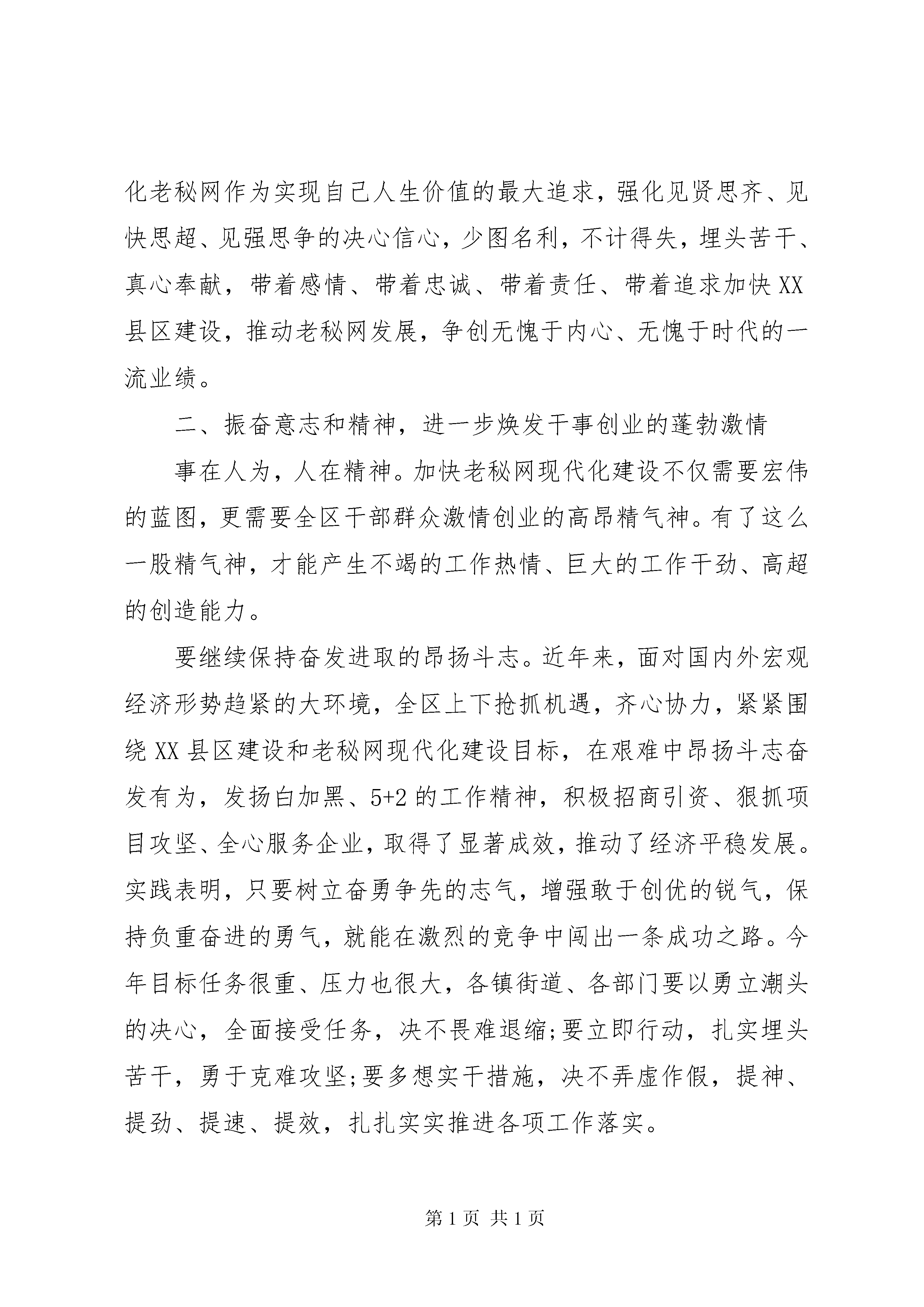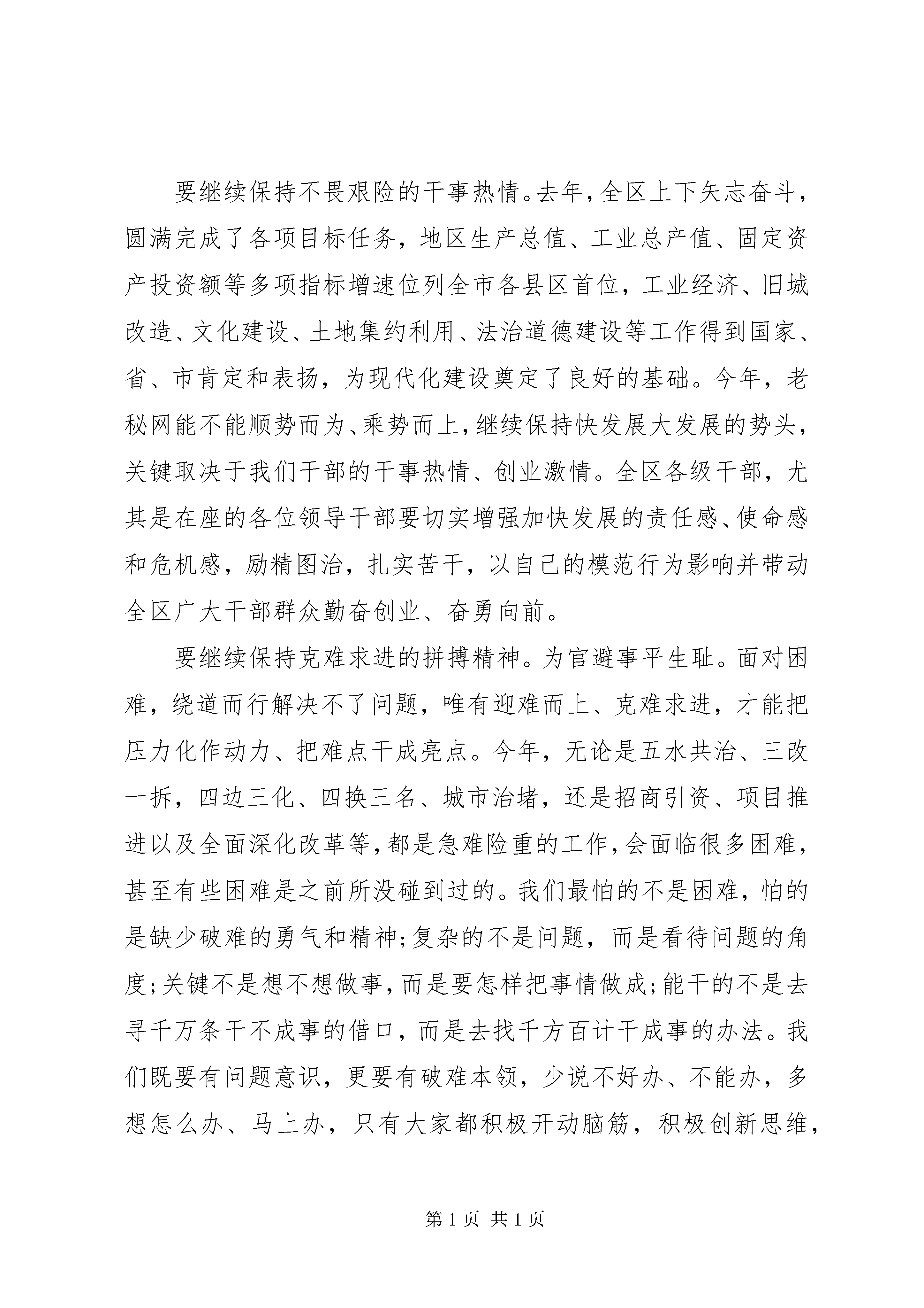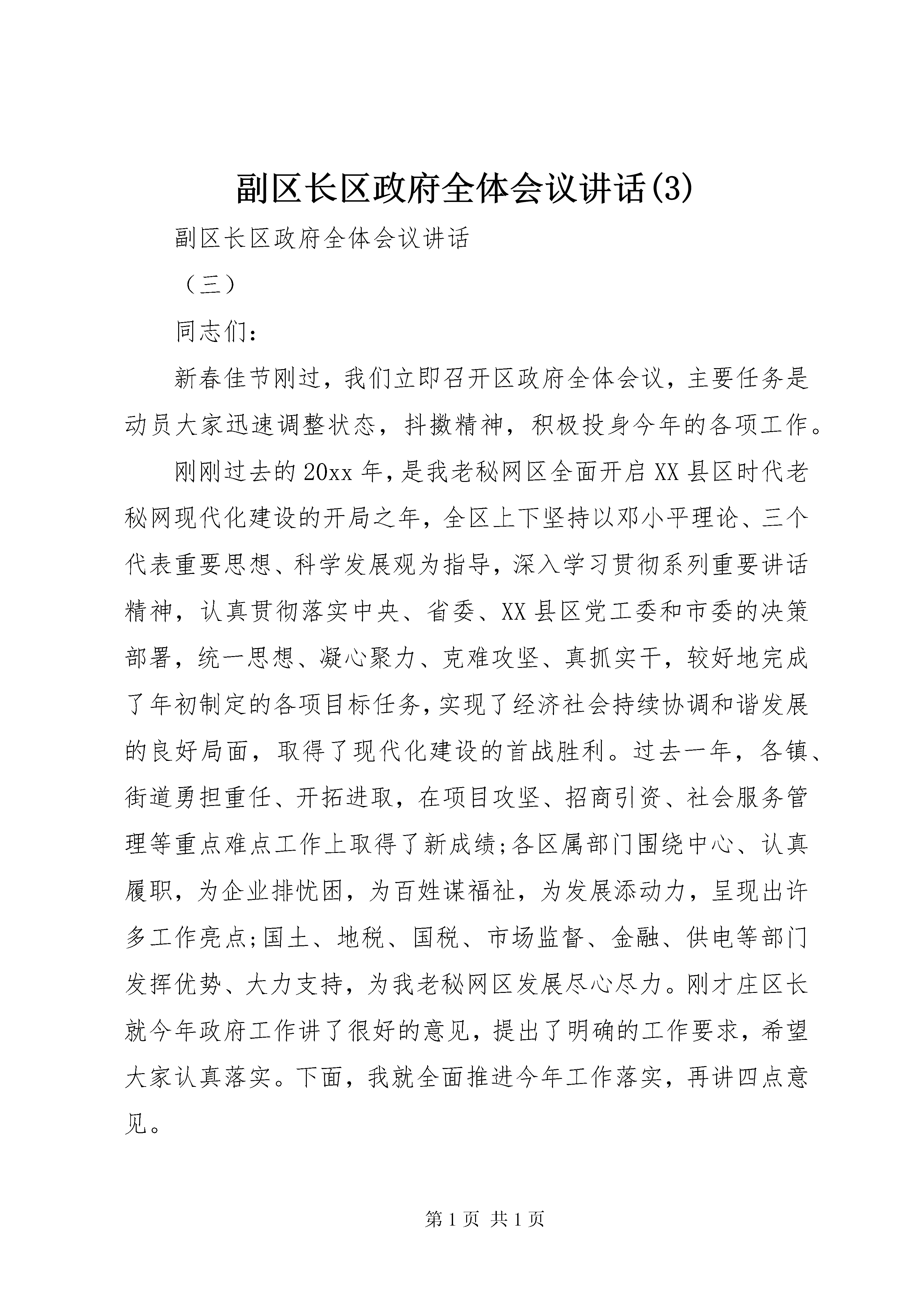 副区长区政府全体会议讲话(3)副区长区政府全体会议讲话(三)同志们:新春佳节刚过,我们立即召开区政府全体会议,主要任务是动员大家迅速调整状态,抖擞精神,积极投身今年的各项工作。刚刚过去的20xx年,是我老秘网区全面开启XX县区时代老秘网现代化建设的开局之年,全区上下坚持以邓小平理论、三个代表重要思想、科学发展观为指导,深入学习贯彻系列重要讲话精神,认真贯彻落实中央、省委、XX县区党工委和市委的决策部署,统一思想、凝心聚力、克难攻坚、真抓实干,较好地完成了年初制定的各项目标任务,实现了经济社会持续协调和谐发展的良好局面,取得了现代化建设的首战胜利。过去一年,各镇、街道勇担重任、开拓进取,在项目攻坚、招商引资、社会服务管理等重点难点工作上取得了新成绩;各区属部门围绕中心、认真履职,为企业排忧困,为百姓谋福祉,为发展添动力,呈现出许多工作亮点;国土、地税、国税、市场监督、金融、供电等部门发挥优势、大力支持,为我老秘网区发展尽心尽力。刚才庄区长就今年政府工作讲了很好的意见,提出了明确的工作要求,希望大家认真落实。下面,我就全面推进今年工作落实,再讲四点意见。一、牢记使命和责任,义无反顾担当起建设现代化老秘网的重任今年,是全面贯彻党的十八届三中全会精神,全面深化改革的起始之年,也是深入实施XX县区建设三年行动计划,推进XX县区时代老秘网现代化建设承前启后的关键一年。夏宝龙书记在调研老秘时强调,XX县区建设要加快速度,XX县区工作的节奏要加快、责任要落实;李强省长在参加省十二届人大二次会议老秘代表团审议时强调,XX县区要在新字上做文章,构建新体制、推动新开放、打造新优势,都给我们的工作提出了明确要求。老秘网作为XX县区建设的主战场,理应承担起加快XX县区建设的重任。今年,围绕XX县区时代老秘网现代化建设的战略目标,我们明确了七个方面重点工作,提出了打造六个老秘网的目标任务。在新的发展时期,上级对老秘网寄予厚望、要求更高,广大干部群众对老秘网的未来翘首以盼、充满期待。建设XX县区时代现代化老秘网,既是保持老秘网当前大好发展势头的客观需要,更是我们抢抓战略机遇、谋求更大跨越的必然要求;既是我们自加压力、乘势而上的战略选择,更是我们义不容辞的时代责任。我们唯有再接再厉、加倍努力,才能在XX县区建设中更有作为、更有地位,才能更好地实现老秘网经济社会的大发展、大跨越。我们要抱着对历史负责、对发展负责、对老秘网人民负责的态度,深刻认识自己肩上担负的责任,把加快XX县区发展、建设现代化老秘网作为实现自己人生价值的最大追求,强化见贤思齐、见快思超、见强思争的决心信心,少图名利,不计得失,埋头苦干、真心奉献,带着感情、带着忠诚、带着责任、带着追求加快XX县区建设,推动老秘网发展,争创无愧于内心、无愧于时代的一流业绩。二、振奋意志和精神,进一步焕发干事创业的蓬勃激情事在人为,人在精神。加快老秘网现代化建设不仅需要宏伟的蓝图,更需要全区干部群众激情创业的高昂精气神。有了这么一股精气神,才能产生不竭的工作热情、巨大的工作干劲、高超的创造能力。要继续保持奋发进取的昂扬斗志。近年来,面对国内外宏观经济形势趋紧的大环境,全区上下抢抓机遇,齐心协力,紧紧围绕XX县区建设和老秘网现代化建设目标,在艰难中昂扬斗志奋发有为,发扬白加黑、5+2的工作精神,积极招商引资、狠抓项目攻坚、全心服务企业,取得了显著成效,推动了经济平稳发展。实践表明,只要树立奋勇争先的志气,增强敢于创优的锐气,保持负重奋进的勇气,就能在激烈的竞争中闯出一条成功之路。今年目标任务很重、压力也很大,各镇街道、各部门要以勇立潮头的决心,全面接受任务,决不畏难退缩;要立即行动,扎实埋头苦干,勇于克难攻坚;要多想实干措施,决不弄虚作假,提神、提劲、提速、提效,扎扎实实推进各项工作落实。要继续保持不畏艰险的干事热情。去年,全区上下矢志奋斗,圆满完成了各项目标任务,地区生产总值、工业总产值、固定资产投资额等多项指标增速位列全市各县区首位,工业经济、旧城改造、文化建设、土地集约利用、法治道德建设等工作得到国家、省、市肯定和表扬,为现代化建设奠定了良好的基础。今年,老秘网能不能顺势而为、乘势而上,继续保持快发展大发展的势头,关键取决于我们干部的干事热情、创业激情。全区各级干部,尤其是在座的各位领导干部要切实增强加快发展的责任感、使命感和危机感,励精图治,扎实苦干,以自己的模范行为影响并带动全区广大干部群众勤奋创业、奋勇向前。要继续保持克难求进的拼搏精神。为官避事平生耻。面对困难,绕道而行解决不了问题,唯有迎难而上、克难求进,才能把压力化作动力、把难点干成亮点。今年,无论是五水共治、三改一拆,四边三化、四换三名、城市治堵,还是招商引资、项目推进以及全面深化改革等,都是急难险重的工作,会面临很多困难