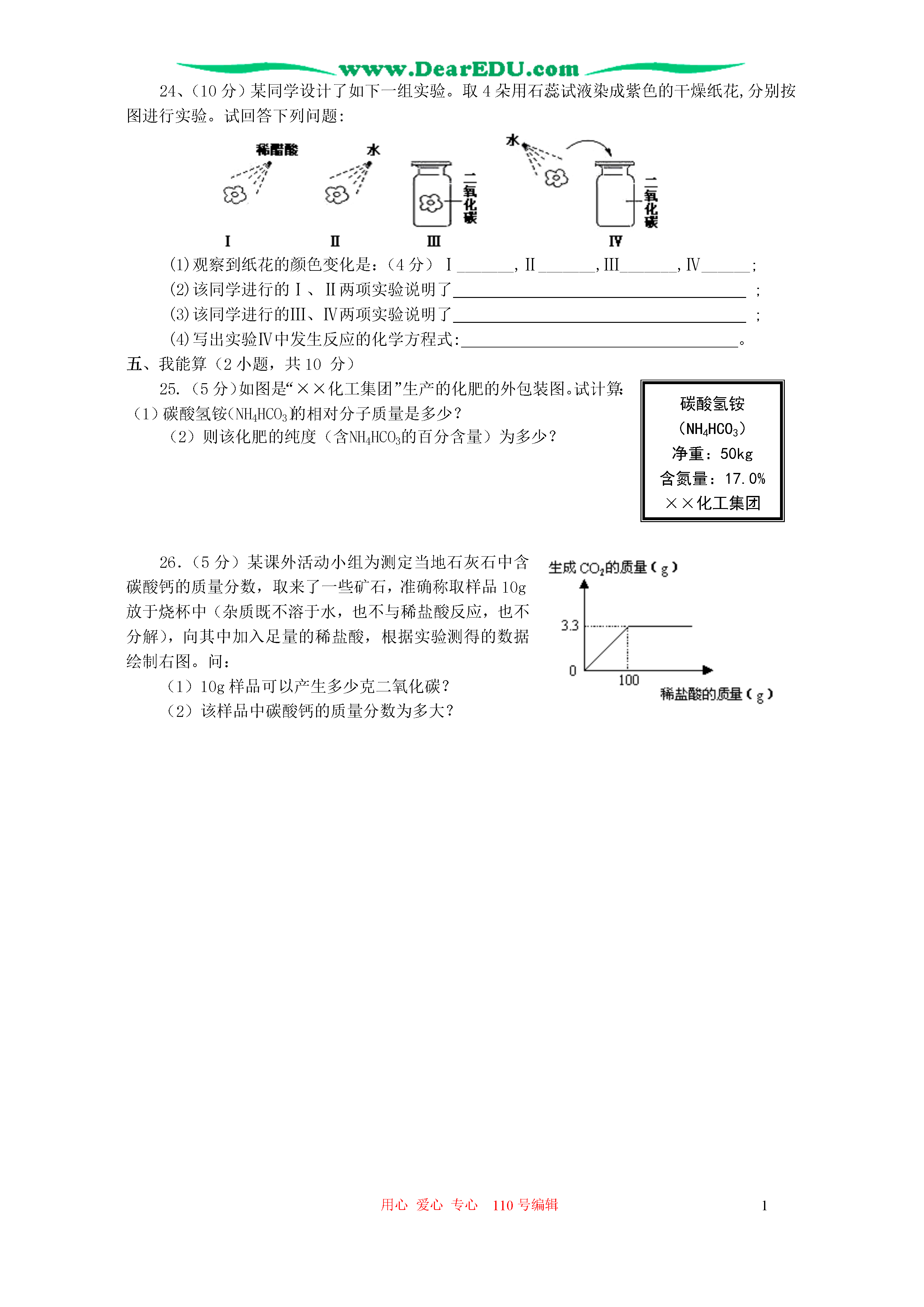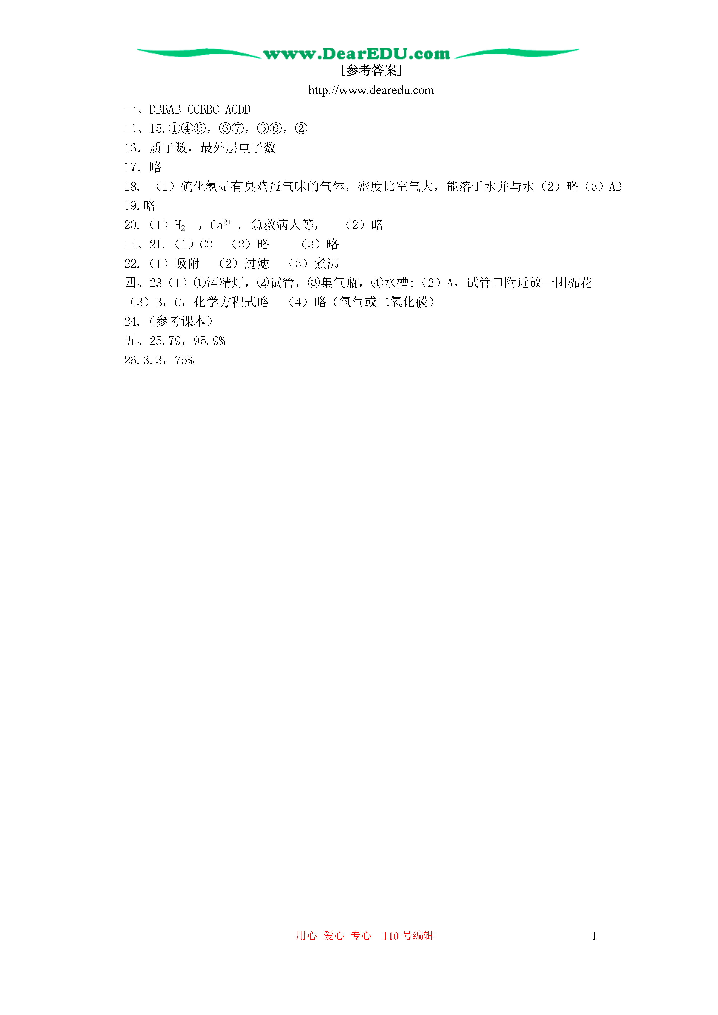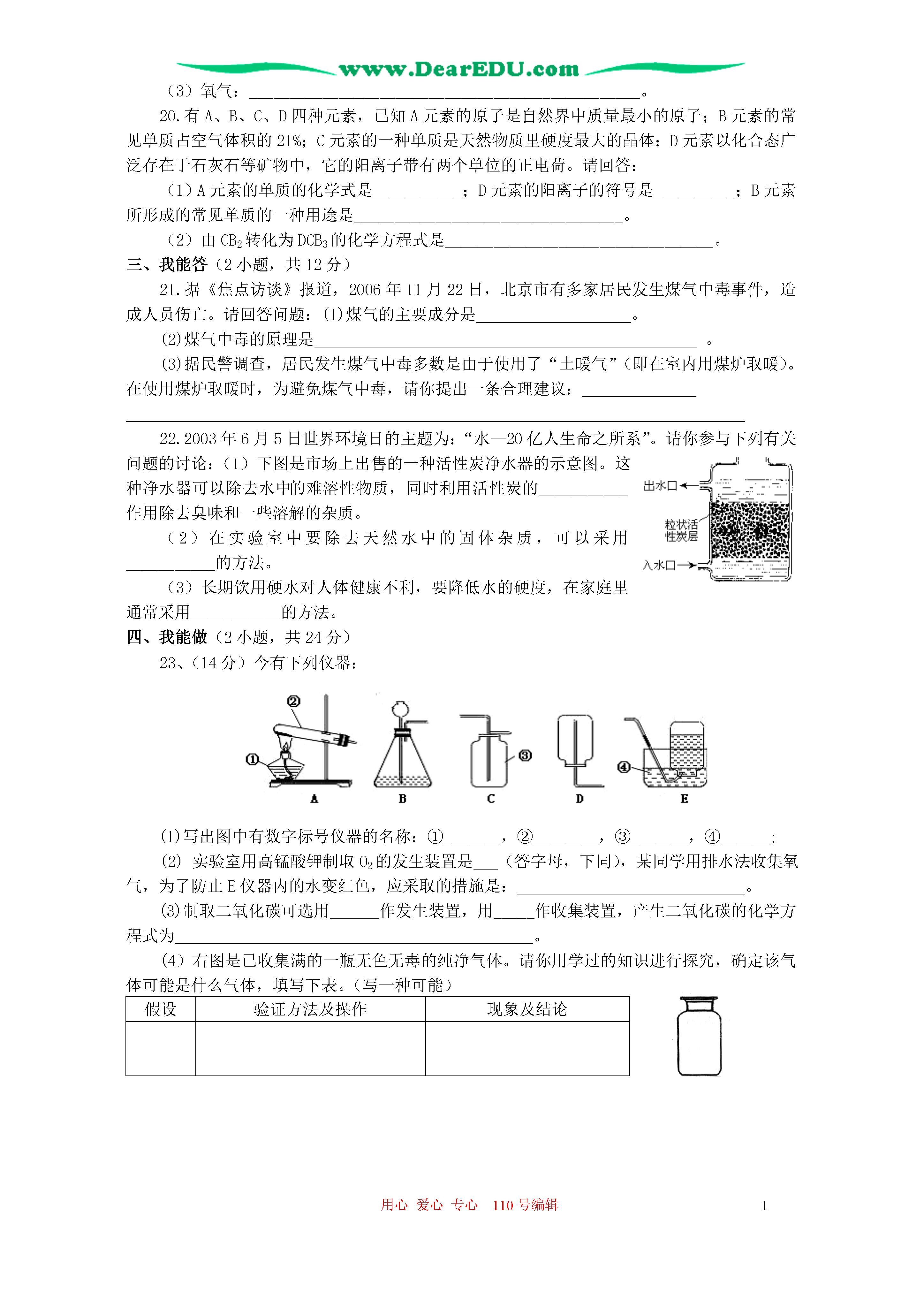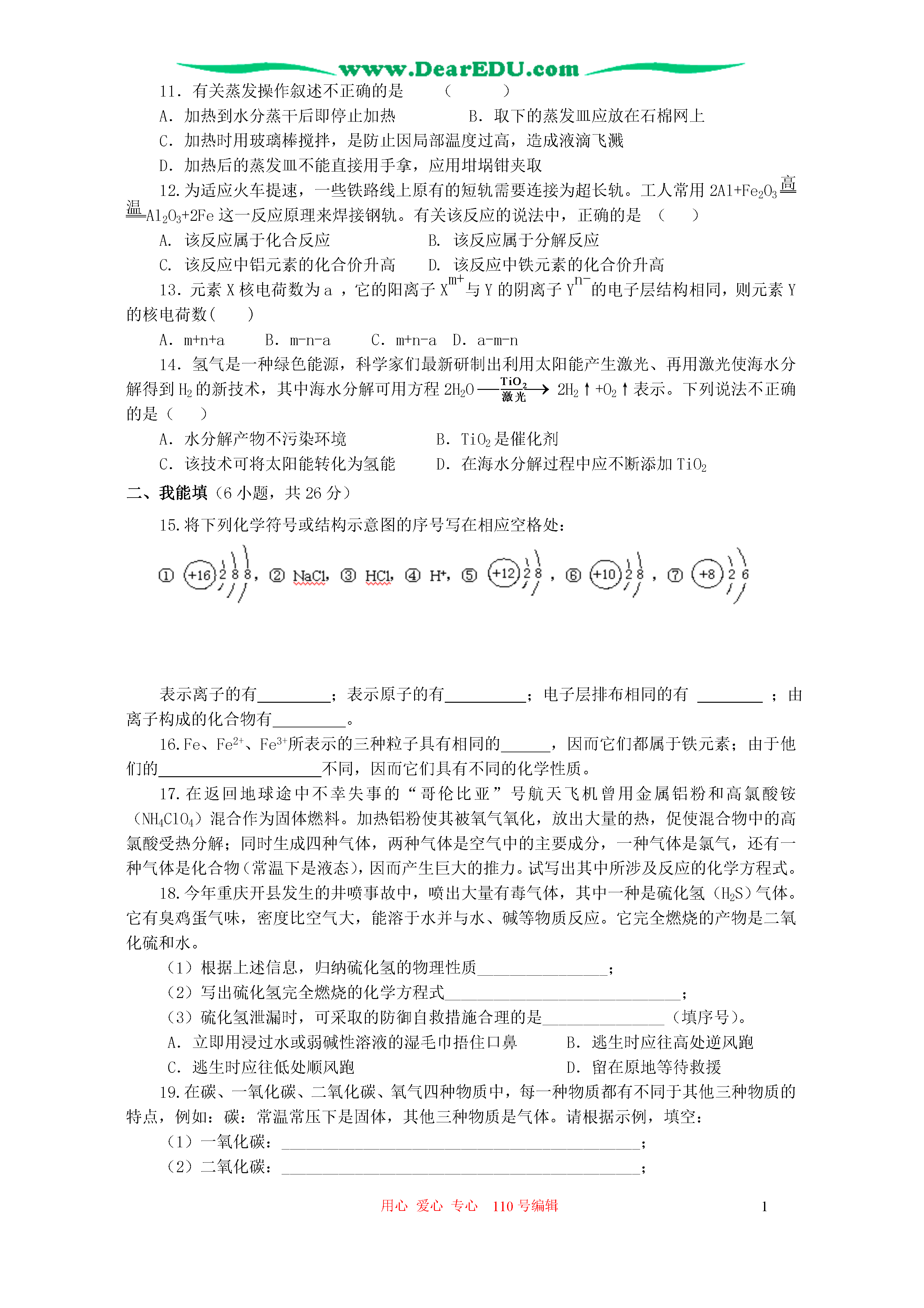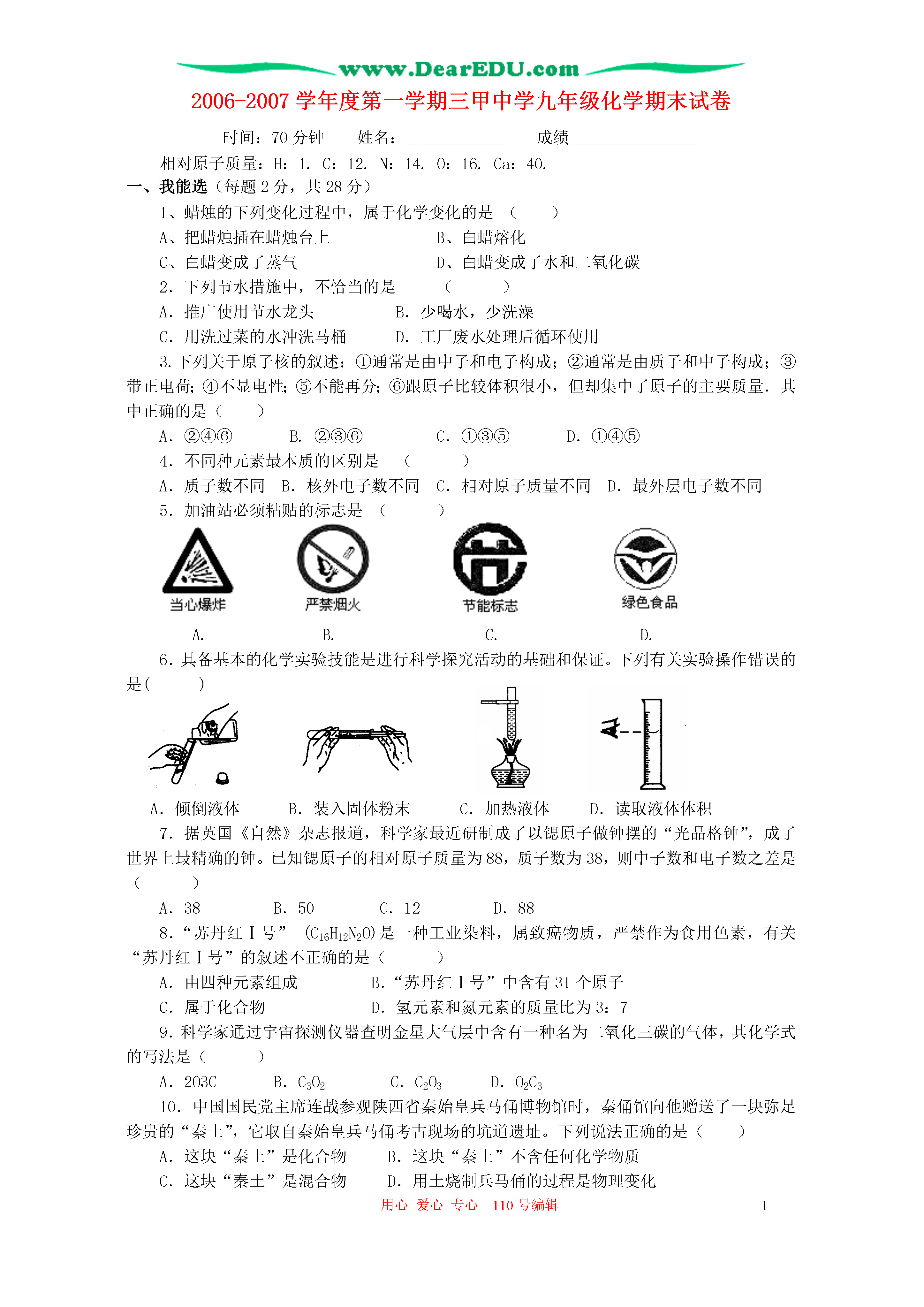 用心爱心专心110号编辑12006-2007学年度第一学期三甲中学九年级化学期末试卷时间:70分钟姓名:______成绩________相对原子质量:H:1.C:12.N:14.O:16.Ca:40.一、我能选(每题2分,共28分)1、蜡烛的下列变化过程中,属于化学变化的是()A、把蜡烛插在蜡烛台上B、白蜡熔化C、白蜡变成了蒸气D、白蜡变成了水和二氧化碳2.下列节水措施中,不恰当的是()A.推广使用节水龙头B.少喝水,少洗澡C.用洗过菜的水冲洗马桶D.工厂废水处理后循环使用3.下列关于原子核的叙述:①通常是由中子和电子构成;②通常是由质子和中子构成;③带正电荷;④不显电性;⑤不能再分;⑥跟原子比较体积很小,但却集中了原子的主要质量.其中正确的是()A.②④⑥B.②③⑥C.①③⑤D.①④⑤4.不同种元素最本质的区别是()A.质子数不同B.核外电子数不同C.相对原子质量不同D.最外层电子数不同5.加油站必须粘贴的标志是()A.B.C.D.6.具备基本的化学实验技能是进行科学探究活动的基础和保证。下列有关实验操作错误的是()A.倾倒液体B.装入固体粉末C.加热液体D.读取液体体积7.据英国《自然》杂志报道,科学家最近研制成了以锶原子做钟摆的“光晶格钟”,成了世界上最精确的钟。已知锶原子的相对原子质量为88,质子数为38,则中子数和电子数之差是()A.38B.50C.12D.888.“苏丹红Ⅰ号”(C16H12N2O)是一种工业染料,属致癌物质,严禁作为食用色素,有关“苏丹红Ⅰ号”的叙述不正确的是()A.由四种元素组成B.“苏丹红Ⅰ号”中含有31个原子C.属于化合物D.氢元素和氮元素的质量比为3:79.科学家通过宇宙探测仪器查明金星大气层中含有一种名为二氧化三碳的气体,其化学式的写法是()A.2O3CB.C3O2C.C2O3D.O2C310.中国国民党主席连战参观陕西省秦始皇兵马俑博物馆时,秦俑馆向他赠送了一块弥足珍贵的“秦土”,它取自秦始皇兵马俑考古现场的坑道遗址。下列说法正确的是()A.这块“秦土”是化合物B.这块“秦土”不含任何化学物质C.这块“秦土”是混合物D.用土烧制兵马俑的过程是物理变化11.有关蒸发操作叙述不正确的是()A.加热到水分蒸干后即停止加热B.取下的蒸发皿应放在石棉网上C.加热时用玻璃棒搅拌,是防止因局部温度过高,造成液滴飞溅D.加热后的蒸发皿不能直接用手拿,应用坩埚钳夹取12.为适应火车提速,一些铁路线上原有的短轨需要连接为超长轨。工人常用2Al+Fe2O3高温Al2O3+2Fe这一反应原理来焊接钢轨。有关该反应的说法中,正确的是()A.该反应属于化合反应B.该反应属于分解反应C.该反应中铝元素的化合价升高D.该反应中铁元素的化合价升高13.元素X核电荷数为a,它的阳离子Xm+与Y的阴离子Yn-的电子层结构相同,则元素Y的核电荷数()A.m+n+aB.m-n-aC.m+n-aD.a-m-n14.氢气是一种绿色能源,科学家们最新研制出利用太阳能产生激光、再用激光使海水分解得到H2的新技术,其中海水分解可用方程2H2O2H2↑+O2↑表示。下列说法不正确的是()A.水分解产物不污染环境B.TiO2是催化剂C.该技术可将太阳能转化为氢能D.在海水分解过程中应不断添加TiO2二、我能填(6小题,共26分)15.将下列化学符号或结构示意图的序号写在相应空格处:表示离子的有;表示原子的有;电子层排布相同的有;由离子构成的化合物有。16.Fe、Fe2+、Fe3+所表示的三种粒子具有相同的,因而它们都属于铁元素;由于他们的不同,因而它们具有不同的化学性质。17.在返回地球途中不幸失事的“哥伦比亚”号航天飞机曾用金属铝粉和高氯酸铵(NH4ClO4)混合作为固体燃料。加热铝粉使其被氧气氧化,放出大量的热,促使混合物中的高氯酸受热分解;同时生成四种气体,两种气体是空气中的主要成分,一种气体是氯气,还有一种气体是化合物(常温下是液态),因而产生巨大的推力。试写出其中所涉及反应的化学方程式。18.今年重庆开县发生的井喷事故中,喷出大量有毒气体,其中一种是硫化氢(H2S)气体。它有臭鸡蛋气味,密度比空气大,能溶于水并与水、碱等物质反应。它完全燃烧的产物是二氧化硫和水。(1)根据上述信息,归纳硫化氢的物理性质________________;(2)写出硫化氢完全燃烧的化学方程式_____________________________;(3)硫化氢泄漏时,可采取的防御自救措施合理的是_______________(填序号)。A.立即用浸过水或弱碱性溶液的湿毛巾捂住口鼻B.逃生时应往高处逆风跑C.逃生