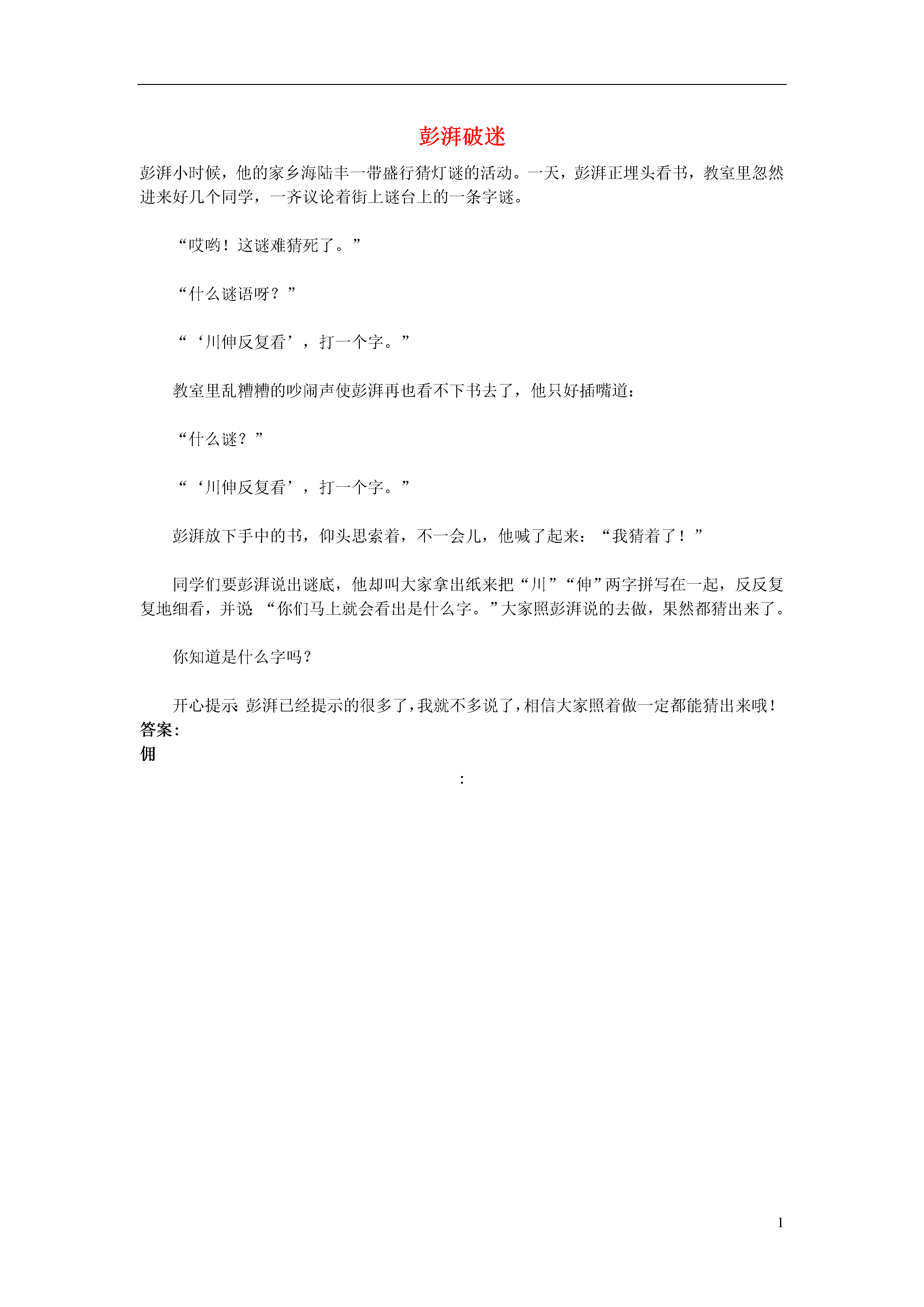 1彭湃破迷彭湃小时候,他的家乡海陆丰一带盛行猜灯谜的活动。一天,彭湃正埋头看书,教室里忽然进来好几个同学,一齐议论着街上谜台上的一条字谜。“哎哟!这谜难猜死了。”“什么谜语呀?”“‘川伸反复看’,打一个字。”教室里乱糟糟的吵闹声使彭湃再也看不下书去了,他只好插嘴道:“什么谜?”“‘川伸反复看’,打一个字。”彭湃放下手中的书,仰头思索着,不一会儿,他喊了起来:“我猜着了!”同学们要彭湃说出谜底,他却叫大家拿出纸来把“川”“伸”两字拼写在一起,反反复复地细看,并说:“你们马上就会看出是什么字。”大家照彭湃说的去做,果然都猜出来了。你知道是什么字吗?开心提示:彭湃已经提示的很多了,我就不多说了,相信大家照着做一定都能猜出来哦!答案:佣: