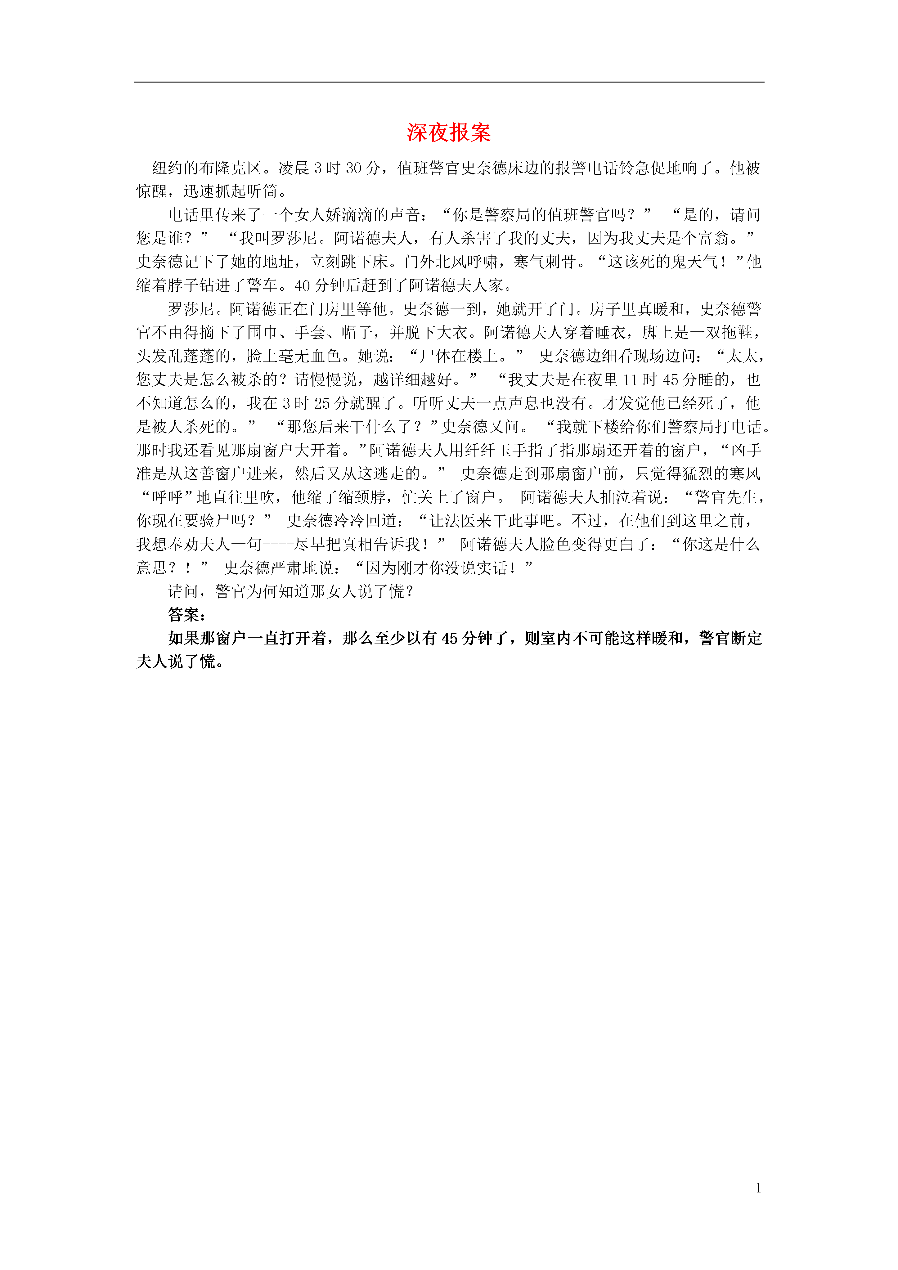 1深夜报案纽约的布隆克区。凌晨3时30分,值班警官史奈德床边的报警电话铃急促地响了。他被惊醒,迅速抓起听筒。电话里传来了一个女人娇滴滴的声音:“你是警察局的值班警官吗?”“是的,请问您是谁?”“我叫罗莎尼。阿诺德夫人,有人杀害了我的丈夫,因为我丈夫是个富翁。”史奈德记下了她的地址,立刻跳下床。门外北风呼啸,寒气刺骨。“这该死的鬼天气!”他缩着脖子钻进了警车。40分钟后赶到了阿诺德夫人家。罗莎尼。阿诺德正在门房里等他。史奈德一到,她就开了门。房子里真暖和,史奈德警官不由得摘下了围巾、手套、帽子,并脱下大衣。阿诺德夫人穿着睡衣,脚上是一双拖鞋,头发乱蓬蓬的,脸上毫无血色。她说:“尸体在楼上。”史奈德边细看现场边问:“太太,您丈夫是怎么被杀的?请慢慢说,越详细越好。”“我丈夫是在夜里11时45分睡的,也不知道怎么的,我在3时25分就醒了。听听丈夫一点声息也没有。才发觉他已经死了,他是被人杀死的。”“那您后来干什么了?”史奈德又问。“我就下楼给你们警察局打电话。那时我还看见那扇窗户大开着。”阿诺德夫人用纤纤玉手指了指那扇还开着的窗户,“凶手准是从这善窗户进来,然后又从这逃走的。”史奈德走到那扇窗户前,只觉得猛烈的寒风“呼呼”地直往里吹,他缩了缩颈脖,忙关上了窗户。阿诺德夫人抽泣着说:“警官先生,你现在要验尸吗?”史奈德冷冷回道:“让法医来干此事吧。不过,在他们到这里之前,我想奉劝夫人一句----尽早把真相告诉我!”阿诺德夫人脸色变得更白了:“你这是什么意思?!”史奈德严肃地说:“因为刚才你没说实话!”请问,警官为何知道那女人说了慌?答案:如果那窗户一直打开着,那么至少以有45分钟了,则室内不可能这样暖和,警官断定夫人说了慌。