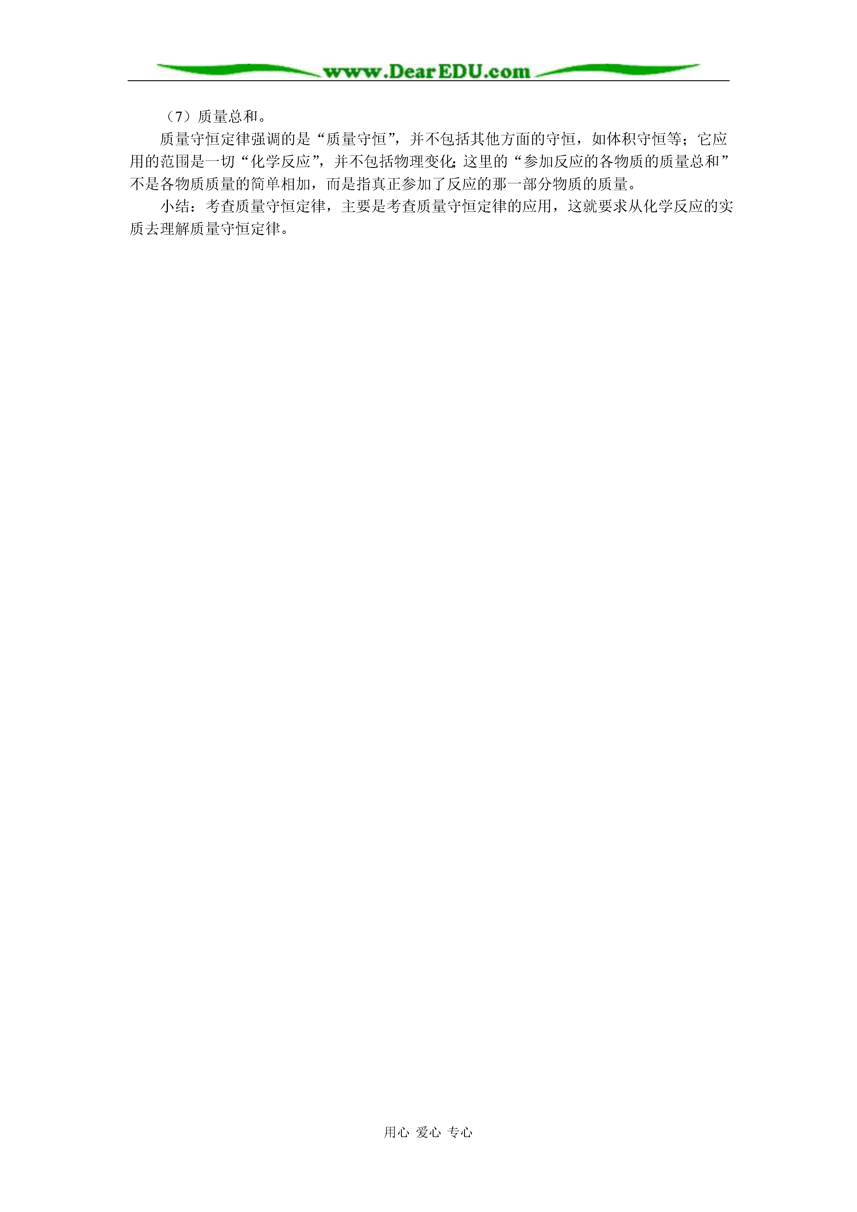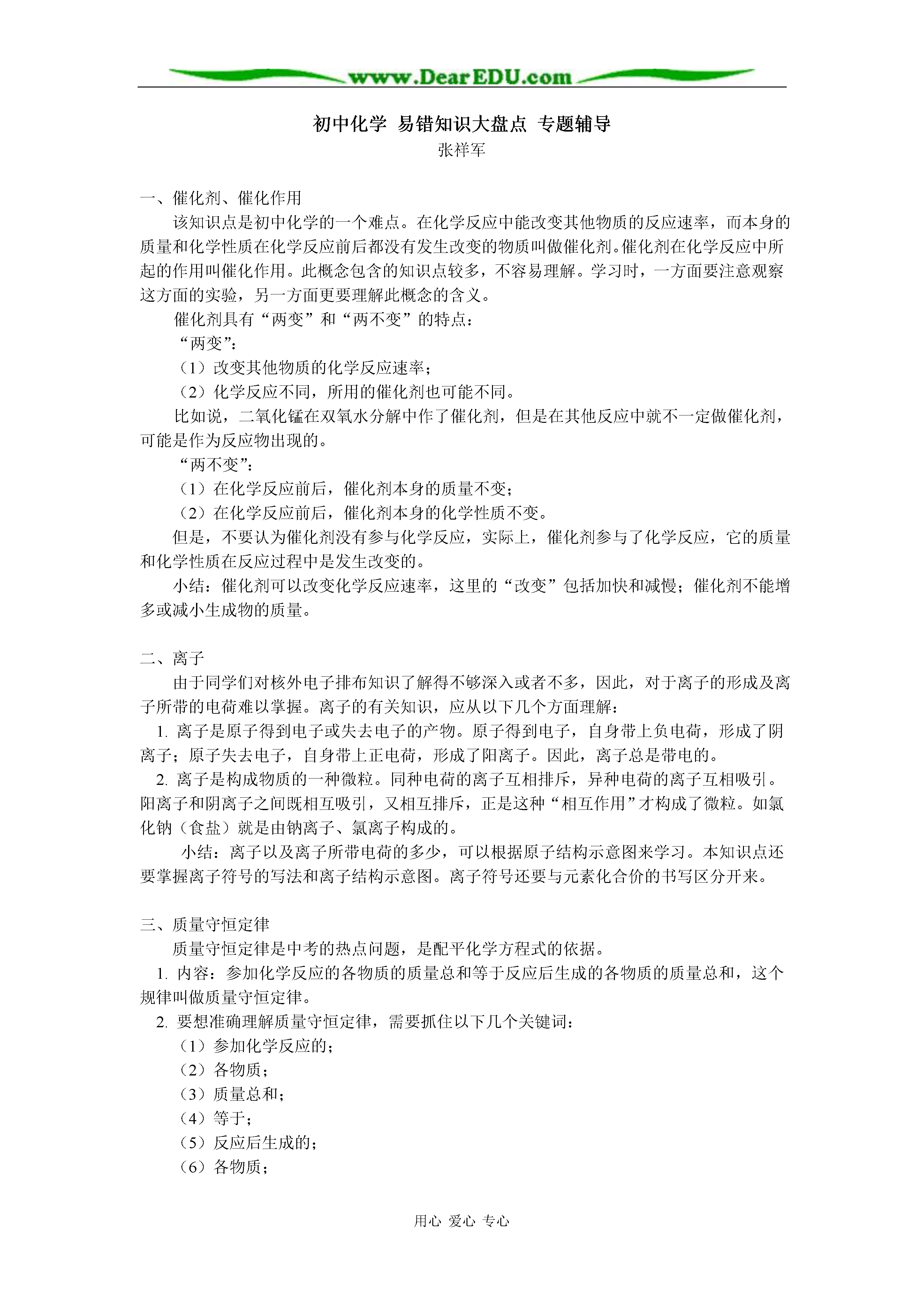 用心爱心专心初中化学易错知识大盘点专题辅导张祥军一、催化剂、催化作用该知识点是初中化学的一个难点。在化学反应中能改变其他物质的反应速率,而本身的质量和化学性质在化学反应前后都没有发生改变的物质叫做催化剂。催化剂在化学反应中所起的作用叫催化作用。此概念包含的知识点较多,不容易理解。学习时,一方面要注意观察这方面的实验,另一方面更要理解此概念的含义。催化剂具有“两变”和“两不变”的特点:“两变”:(1)改变其他物质的化学反应速率;(2)化学反应不同,所用的催化剂也可能不同。比如说,二氧化锰在双氧水分解中作了催化剂,但是在其他反应中就不一定做催化剂,可能是作为反应物出现的。“两不变”:(1)在化学反应前后,催化剂本身的质量不变;(2)在化学反应前后,催化剂本身的化学性质不变。但是,不要认为催化剂没有参与化学反应,实际上,催化剂参与了化学反应,它的质量和化学性质在反应过程中是发生改变的。小结:催化剂可以改变化学反应速率,这里的“改变”包括加快和减慢;催化剂不能增多或减小生成物的质量。二、离子由于同学们对核外电子排布知识了解得不够深入或者不多,因此,对于离子的形成及离子所带的电荷难以掌握。离子的有关知识,应从以下几个方面理解:1.离子是原子得到电子或失去电子的产物。原子得到电子,自身带上负电荷,形成了阴离子;原子失去电子,自身带上正电荷,形成了阳离子。因此,离子总是带电的。2.离子是构成物质的一种微粒。同种电荷的离子互相排斥,异种电荷的离子互相吸引。阳离子和阴离子之间既相互吸引,又相互排斥,正是这种“相互作用”才构成了微粒。如氯化钠(食盐)就是由钠离子、氯离子构成的。小结:离子以及离子所带电荷的多少,可以根据原子结构示意图来学习。本知识点还要掌握离子符号的写法和离子结构示意图。离子符号还要与元素化合价的书写区分开来。三、质量守恒定律质量守恒定律是中考的热点问题,是配平化学方程式的依据。1.内容:参加化学反应的各物质的质量总和等于反应后生成的各物质的质量总和,这个规律叫做质量守恒定律。2.要想准确理解质量守恒定律,需要抓住以下几个关键词:(1)参加化学反应的;(2)各物质;(3)质量总和;(4)等于;(5)反应后生成的;(6)各物质;(7)质量总和。质量守恒定律强调的是“质量守恒”,并不包括其他方面的守恒,如体积守恒等;它应用的范围是一切“化学反应”,并不包括物理变化;这里的“参加反应的各物质的质量总和”不是各物质质量的简单相加,而是指真正参加了反应的那一部分物质的质量。小结:考查质量守恒定律,主要是考查质量守恒定律的应用,这就要求从化学反应的实质去理解质量守恒定律。