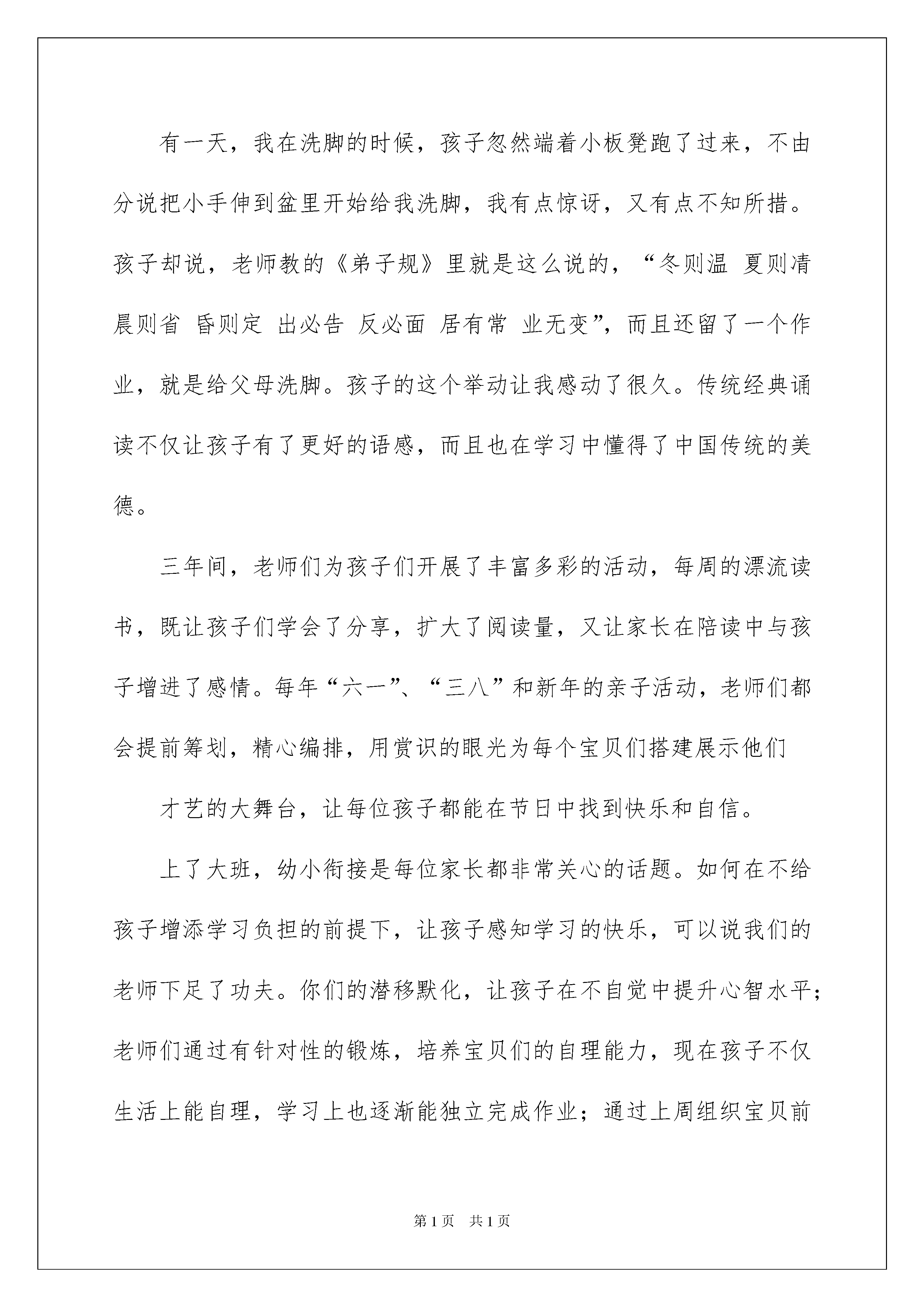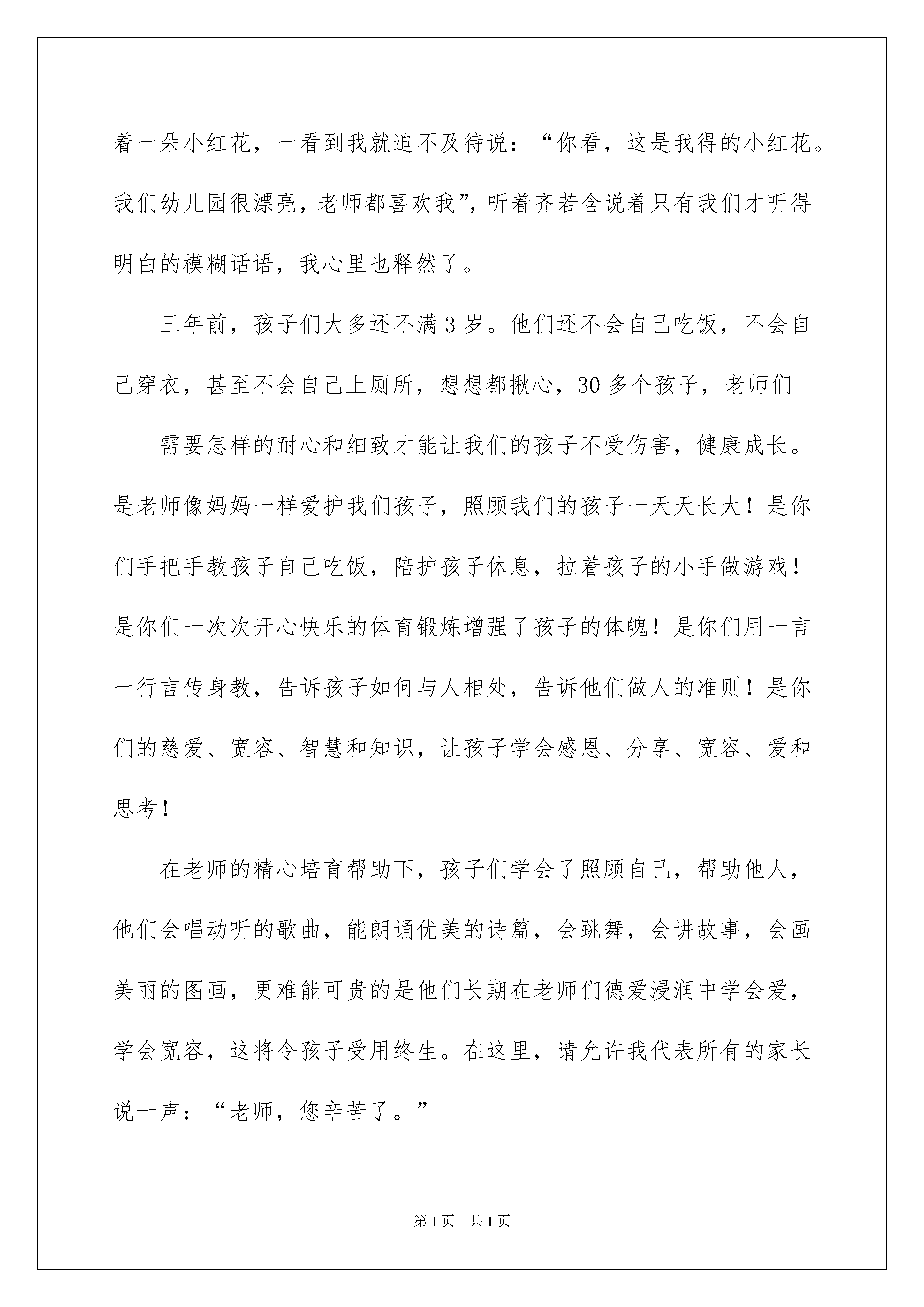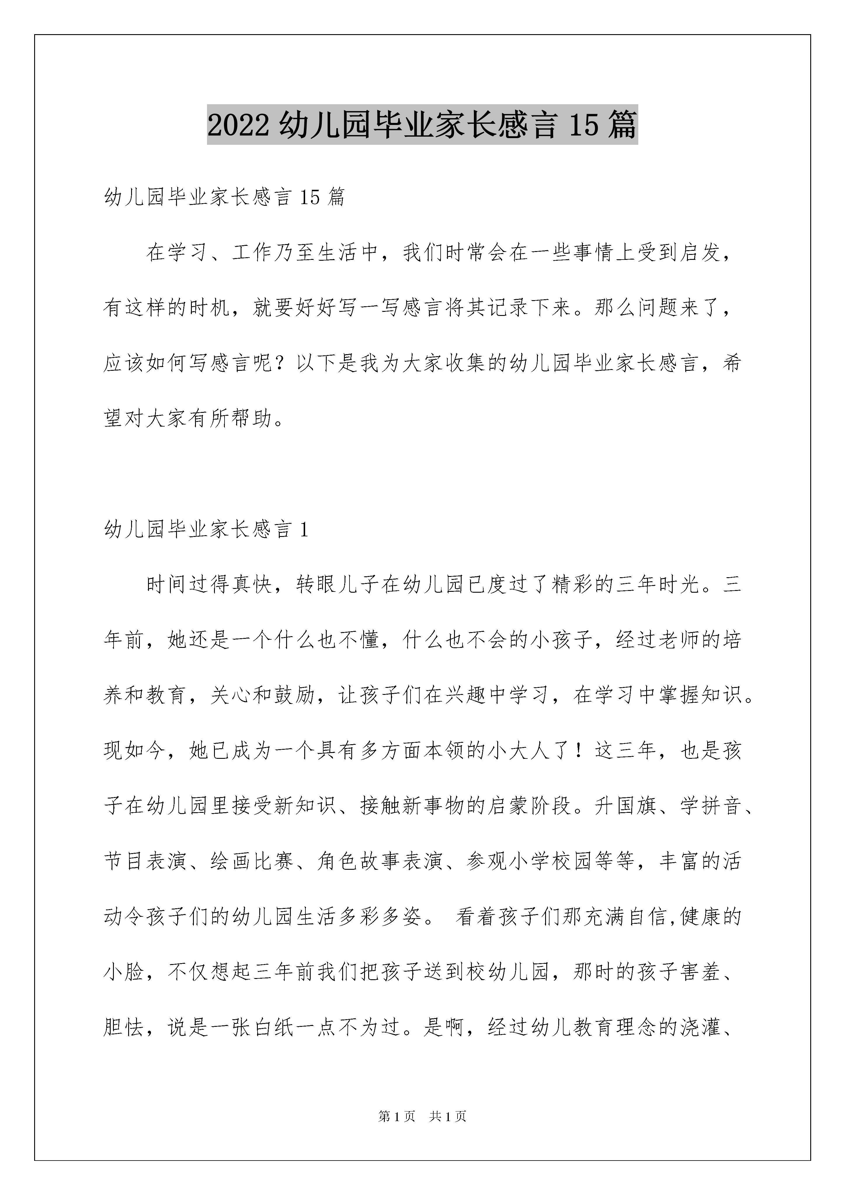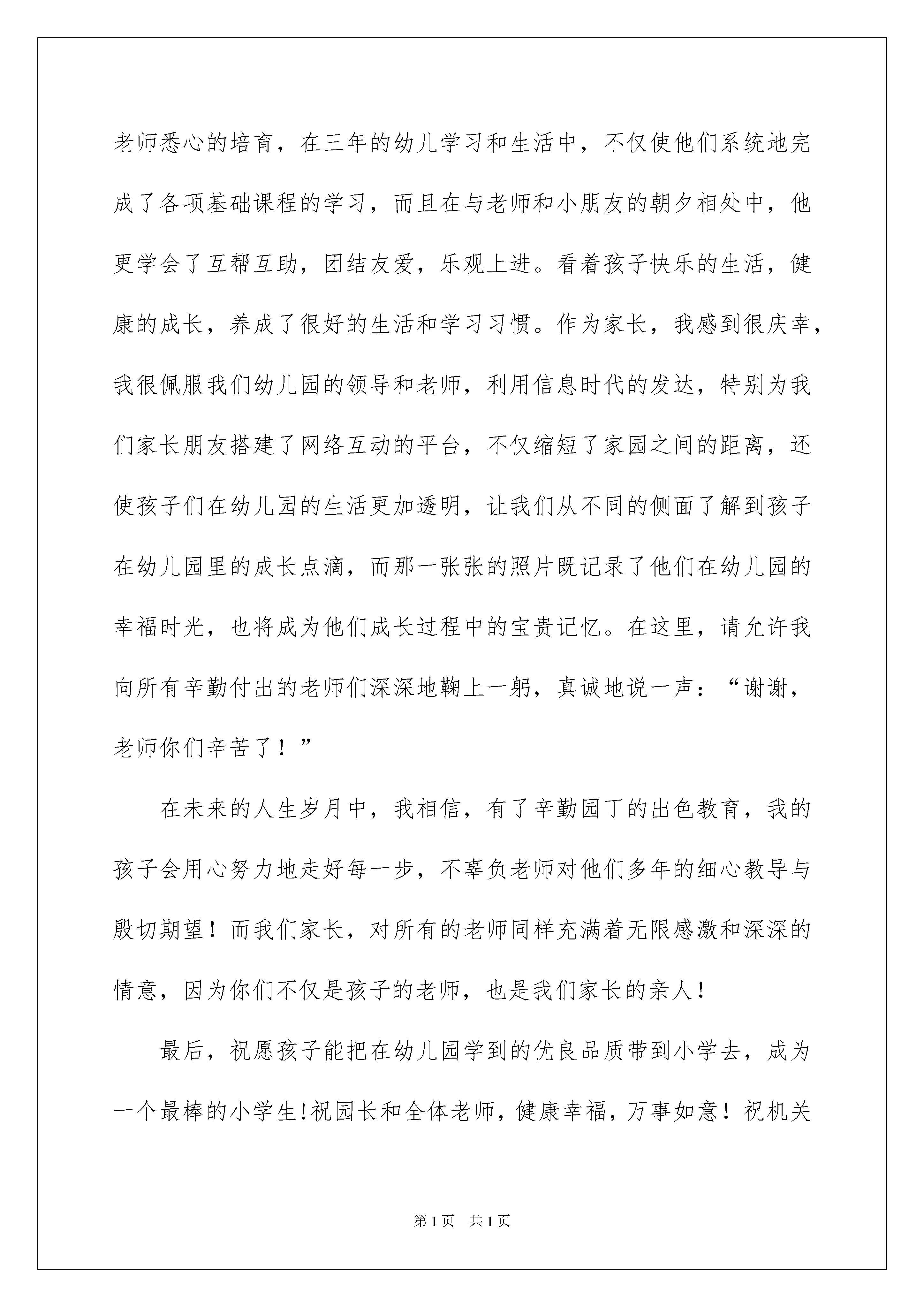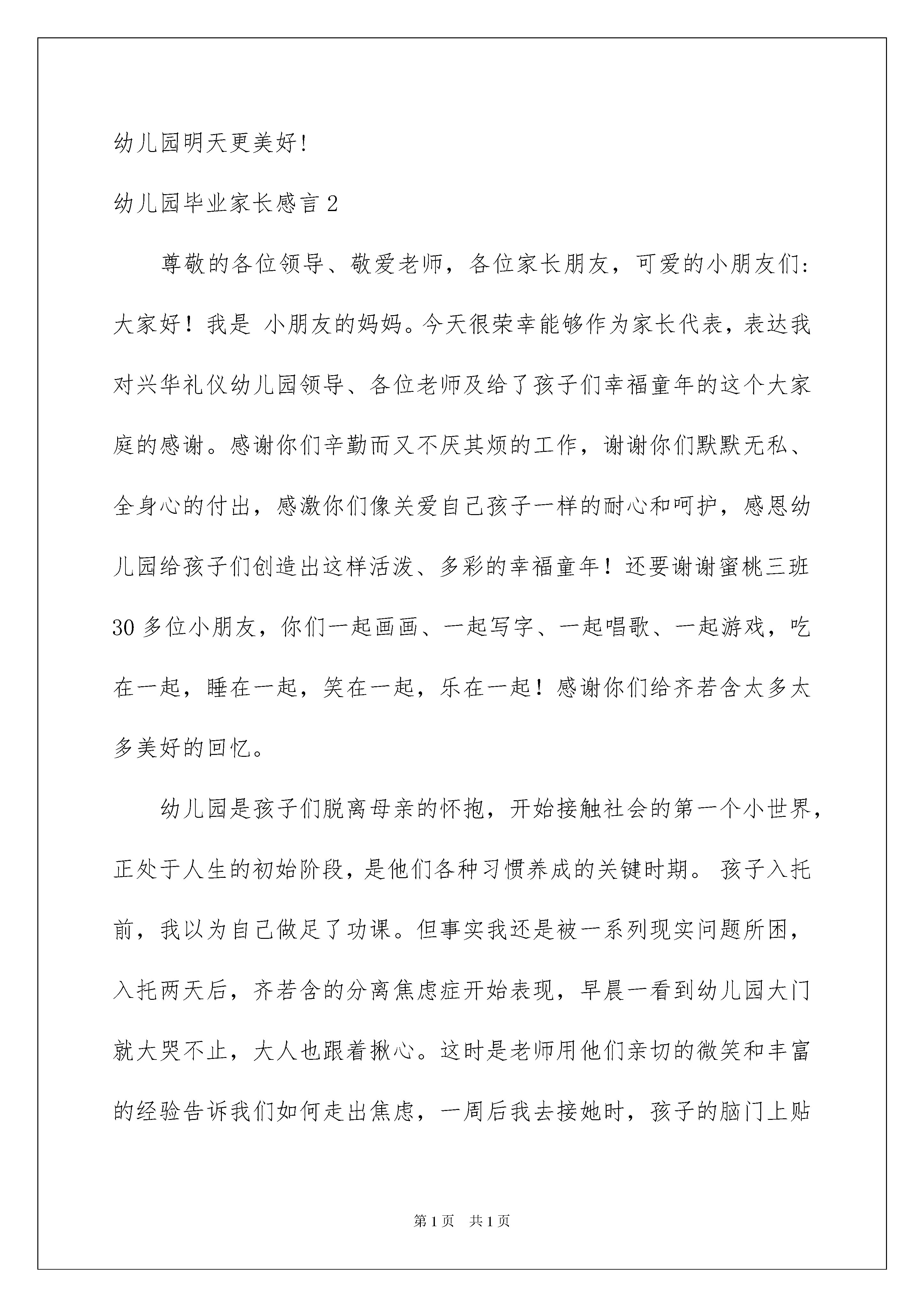 2022幼儿园毕业家长感言15篇幼儿园毕业家长感言15篇在学习、工作乃至生活中,我们时常会在一些事情上受到启发,有这样的时机,就要好好写一写感言将其记录下来。那么问题来了,应该如何写感言呢?以下是我为大家收集的幼儿园毕业家长感言,希望对大家有所帮助。幼儿园毕业家长感言1时间过得真快,转眼儿子在幼儿园已度过了精彩的三年时光。三年前,她还是一个什么也不懂,什么也不会的小孩子,经过老师的培养和教育,关心和鼓励,让孩子们在兴趣中学习,在学习中掌握知识。现如今,她已成为一个具有多方面本领的小大人了!这三年,也是孩子在幼儿园里接受新知识、接触新事物的启蒙阶段。升国旗、学拼音、节目表演、绘画比赛、角色故事表演、参观小学校园等等,丰富的活动令孩子们的幼儿园生活多彩多姿。看着孩子们那充满自信,健康的小脸,不仅想起三年前我们把孩子送到校幼儿园,那时的孩子害羞、胆怯,说是一张白纸一点不为过。是啊,经过幼儿教育理念的浇灌、老师悉心的培育,在三年的幼儿学习和生活中,不仅使他们系统地完成了各项基础课程的学习,而且在与老师和小朋友的朝夕相处中,他更学会了互帮互助,团结友爱,乐观上进。看着孩子快乐的生活,健康的成长,养成了很好的生活和学习习惯。作为家长,我感到很庆幸,我很佩服我们幼儿园的领导和老师,利用信息时代的发达,特别为我们家长朋友搭建了网络互动的平台,不仅缩短了家园之间的距离,还使孩子们在幼儿园的生活更加透明,让我们从不同的侧面了解到孩子在幼儿园里的成长点滴,而那一张张的照片既记录了他们在幼儿园的幸福时光,也将成为他们成长过程中的宝贵记忆。在这里,请允许我向所有辛勤付出的老师们深深地鞠上一躬,真诚地说一声:“谢谢,老师你们辛苦了!”在未来的人生岁月中,我相信,有了辛勤园丁的出色教育,我的孩子会用心努力地走好每一步,不辜负老师对他们多年的细心教导与殷切期望!而我们家长,对所有的老师同样充满着无限感激和深深的情意,因为你们不仅是孩子的老师,也是我们家长的亲人!最后,祝愿孩子能把在幼儿园学到的优良品质带到小学去,成为一个最棒的小学生!祝园长和全体老师,健康幸福,万事如意!祝机关幼儿园明天更美好!幼儿园毕业家长感言2尊敬的各位领导、敬爱老师,各位家长朋友,可爱的小朋友们:大家好!我是小朋友的妈妈。今天很荣幸能够作为家长代表,表达我对兴华礼仪幼儿园领导、各位老师及给了孩子们幸福童年的这个大家庭的感谢。感谢你们辛勤而又不厌其烦的工作,谢谢你们默默无私、全身心的付出,感激你们像关爱自己孩子一样的耐心和呵护,感恩幼儿园给孩子们创造出这样活泼、多彩的幸福童年!还要谢谢蜜桃三班30多位小朋友,你们一起画画、一起写字、一起唱歌、一起游戏,吃在一起,睡在一起,笑在一起,乐在一起!感谢你们给齐若含太多太多美好的回忆。幼儿园是孩子们脱离母亲的怀抱,开始接触社会的第一个小世界,正处于人生的初始阶段,是他们各种习惯养成的关键时期。孩子入托前,我以为自己做足了功课。但事实我还是被一系列现实问题所困,入托两天后,齐若含的分离焦虑症开始表现,早晨一看到幼儿园大门就大哭不止,大人也跟着揪心。这时是老师用他们亲切的微笑和丰富的经验告诉我们如何走出焦虑,一周后我去接她时,孩子的脑门上贴着一朵小红花,一看到我就迫不及待说:“你看,这是我得的小红花。我们幼儿园很漂亮,老师都喜欢我”,听着齐若含说着只有我们才听得明白的模糊话语,我心里也释然了。三年前,孩子们大多还不满3岁。他们还不会自己吃饭,不会自己穿衣,甚至不会自己上厕所,想想都揪心,30多个孩子,老师们需要怎样的耐心和细致才能让我们的孩子不受伤害,健康成长。是老师像妈妈一样爱护我们孩子,照顾我们的孩子一天天长大!是你们手把手教孩子自己吃饭,陪护孩子休息,拉着孩子的小手做游戏!是你们一次次开心快乐的体育锻炼增强了孩子的体魄!是你们用一言一行言传身教,告诉孩子如何与人相处,告诉他们做人的准则!是你们的慈爱、宽容、智慧和知识,让孩子学会感恩、分享、宽容、爱和思考!在老师的精心培育帮助下,孩子们学会了照顾自己,帮助他人,他们会唱动听的歌曲,能朗诵优美的诗篇,会跳舞,会讲故事,会画美丽的图画,更难能可贵的是他们长期在老师们德爱浸润中学会爱,学会宽容,这将令孩子受用终生。在这里,请允许我代表所有的家长说一声:“老师,您辛苦了。”有一天,我在洗脚的时候,孩子忽然端着小板凳跑了过来,不由分说把小手伸到盆里开始给我洗脚,我有点惊讶,又有点不知所措。孩子却说,老师教的《弟子规》里就是这么说的,“冬则温夏则凊晨则省昏则定出必告反必面居有常业无变”,而且还留了一个作业,就是给父母洗脚。孩子的这个举动让我感动了很久。