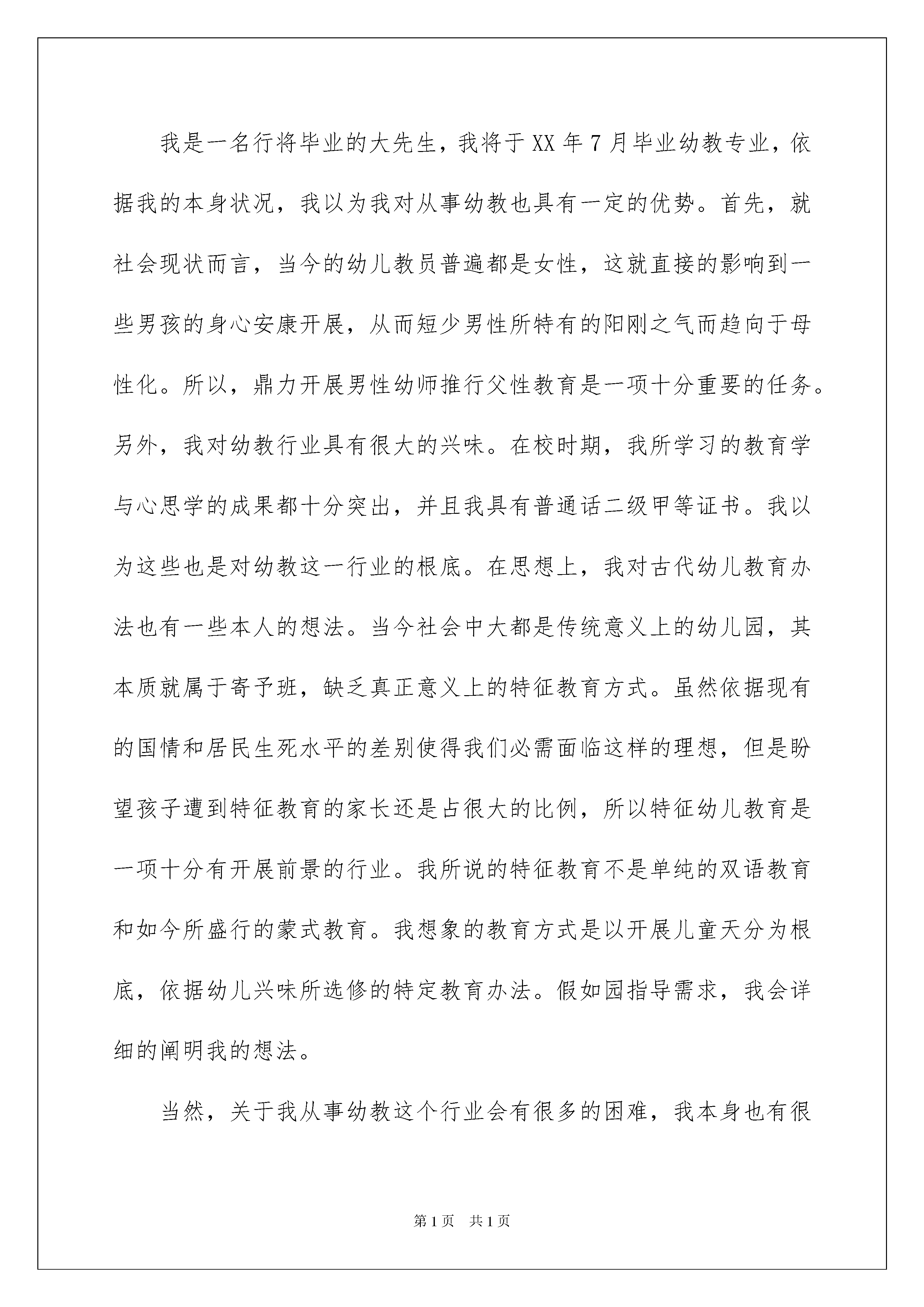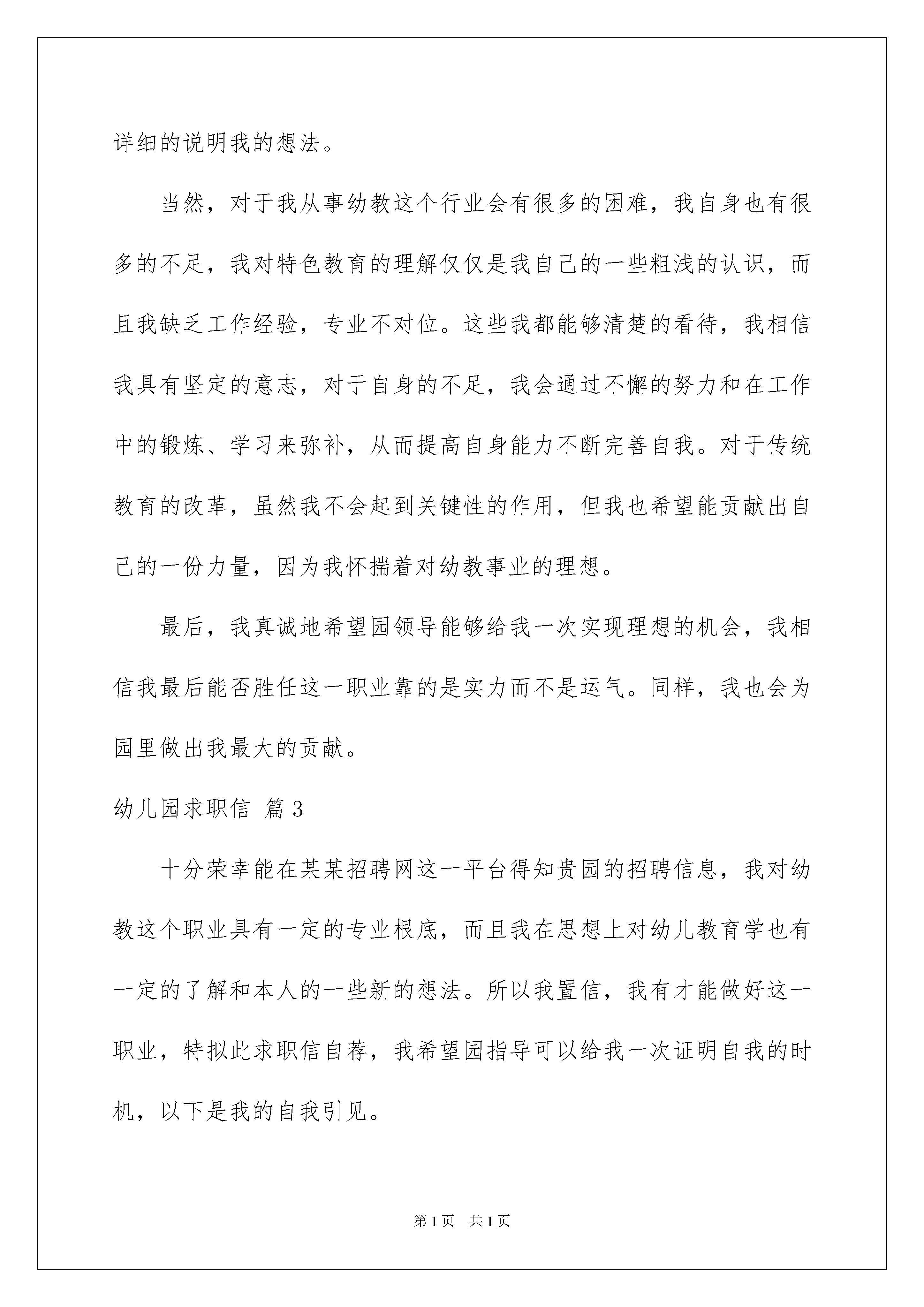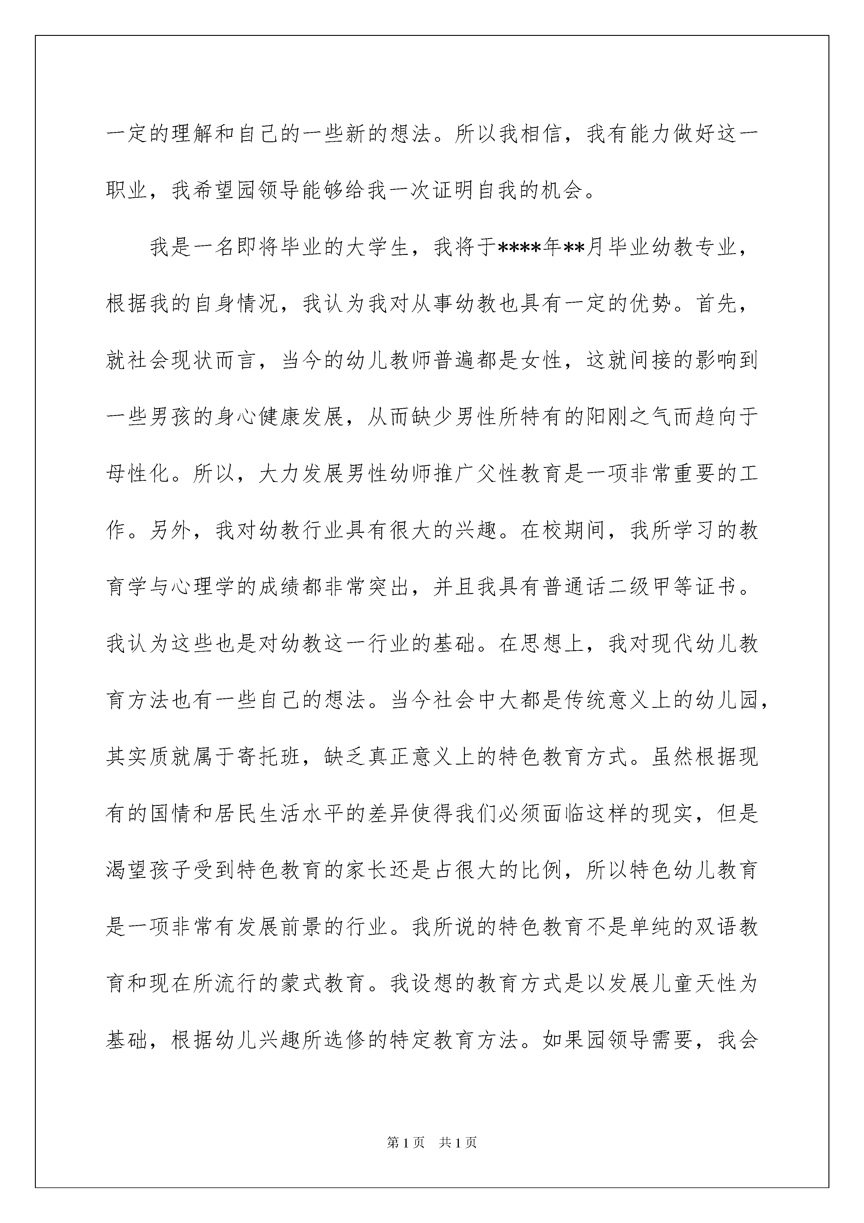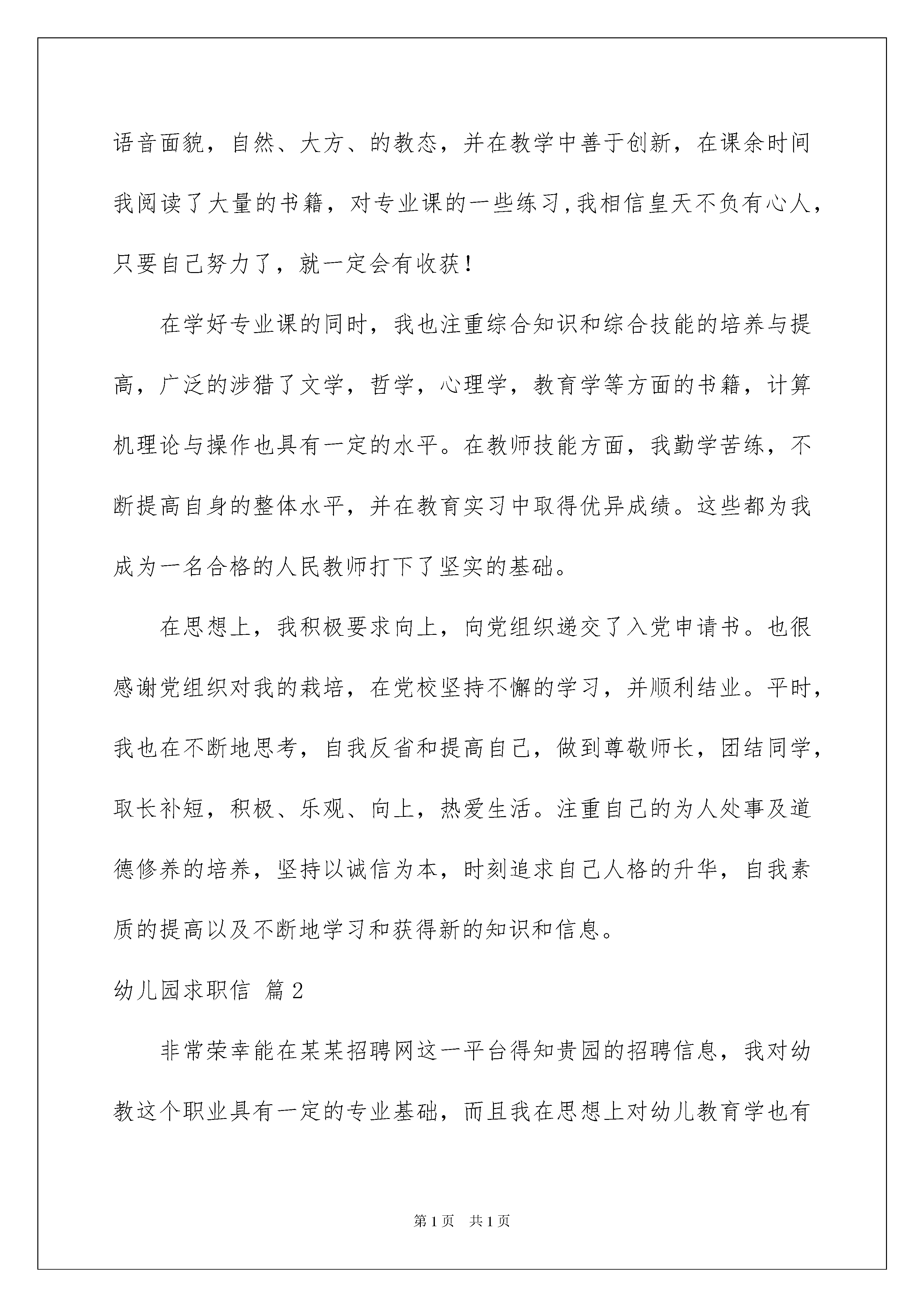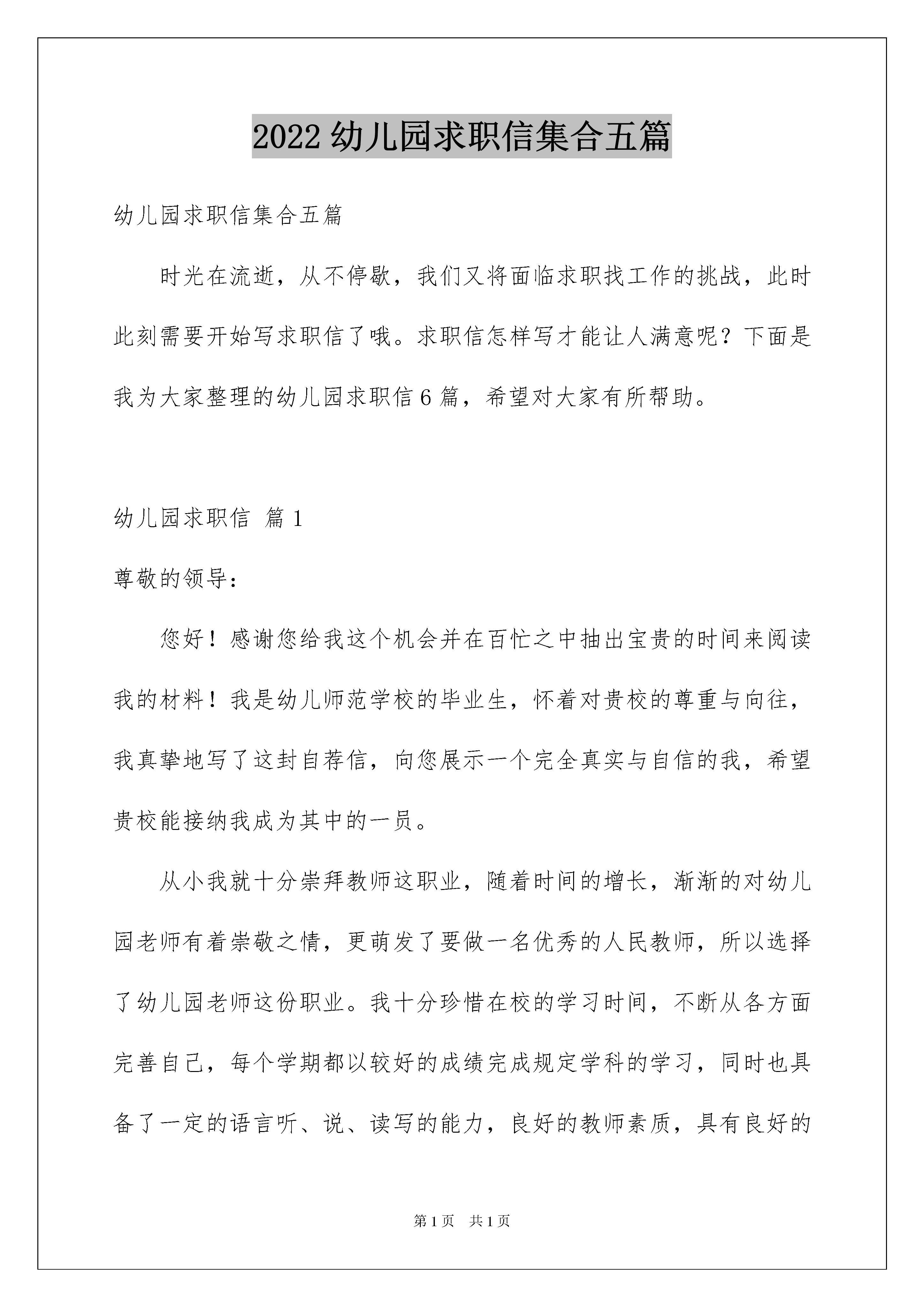 2022幼儿园求职信集合五篇幼儿园求职信集合五篇时光在流逝,从不停歇,我们又将面临求职找工作的挑战,此时此刻需要开始写求职信了哦。求职信怎样写才能让人满意呢?下面是我为大家整理的幼儿园求职信6篇,希望对大家有所帮助。幼儿园求职信篇1尊敬的领导:您好!感谢您给我这个机会并在百忙之中抽出宝贵的时间来阅读我的材料!我是幼儿师范学校的毕业生,怀着对贵校的尊重与向往,我真挚地写了这封自荐信,向您展示一个完全真实与自信的我,希望贵校能接纳我成为其中的一员。从小我就十分崇拜教师这职业,随着时间的增长,渐渐的对幼儿园老师有着崇敬之情,更萌发了要做一名优秀的人民教师,所以选择了幼儿园老师这份职业。我十分珍惜在校的学习时间,不断从各方面完善自己,每个学期都以较好的成绩完成规定学科的学习,同时也具备了一定的语言听、说、读写的能力,良好的教师素质,具有良好的语音面貌,自然、大方、的教态,并在教学中善于创新,在课余时间我阅读了大量的书籍,对专业课的一些练习,我相信皇天不负有心人,只要自己努力了,就一定会有收获!在学好专业课的同时,我也注重综合知识和综合技能的培养与提高,广泛的涉猎了文学,哲学,心理学,教育学等方面的书籍,计算机理论与操作也具有一定的水平。在教师技能方面,我勤学苦练,不断提高自身的整体水平,并在教育实习中取得优异成绩。这些都为我成为一名合格的人民教师打下了坚实的基础。在思想上,我积极要求向上,向党组织递交了入党申请书。也很感谢党组织对我的栽培,在党校坚持不懈的学习,并顺利结业。平时,我也在不断地思考,自我反省和提高自己,做到尊敬师长,团结同学,取长补短,积极、乐观、向上,热爱生活。注重自己的为人处事及道德修养的培养,坚持以诚信为本,时刻追求自己人格的升华,自我素质的提高以及不断地学习和获得新的知识和信息。幼儿园求职信篇2非常荣幸能在某某招聘网这一平台得知贵园的招聘信息,我对幼教这个职业具有一定的专业基础,而且我在思想上对幼儿教育学也有一定的理解和自己的一些新的想法。所以我相信,我有能力做好这一职业,我希望园领导能够给我一次证明自我的机会。我是一名即将毕业的大学生,我将于****年**月毕业幼教专业,根据我的自身情况,我认为我对从事幼教也具有一定的优势。首先,就社会现状而言,当今的幼儿教师普遍都是女性,这就间接的影响到一些男孩的身心健康发展,从而缺少男性所特有的阳刚之气而趋向于母性化。所以,大力发展男性幼师推广父性教育是一项非常重要的工作。另外,我对幼教行业具有很大的兴趣。在校期间,我所学习的教育学与心理学的成绩都非常突出,并且我具有普通话二级甲等证书。我认为这些也是对幼教这一行业的基础。在思想上,我对现代幼儿教育方法也有一些自己的想法。当今社会中大都是传统意义上的幼儿园,其实质就属于寄托班,缺乏真正意义上的特色教育方式。虽然根据现有的国情和居民生活水平的差异使得我们必须面临这样的现实,但是渴望孩子受到特色教育的家长还是占很大的比例,所以特色幼儿教育是一项非常有发展前景的行业。我所说的特色教育不是单纯的双语教育和现在所流行的蒙式教育。我设想的教育方式是以发展儿童天性为基础,根据幼儿兴趣所选修的特定教育方法。如果园领导需要,我会详细的说明我的想法。当然,对于我从事幼教这个行业会有很多的困难,我自身也有很多的不足,我对特色教育的理解仅仅是我自己的一些粗浅的认识,而且我缺乏工作经验,专业不对位。这些我都能够清楚的看待,我相信我具有坚定的意志,对于自身的不足,我会通过不懈的努力和在工作中的锻炼、学习来弥补,从而提高自身能力不断完善自我。对于传统教育的改革,虽然我不会起到关键性的作用,但我也希望能贡献出自己的一份力量,因为我怀揣着对幼教事业的理想。最后,我真诚地希望园领导能够给我一次实现理想的机会,我相信我最后能否胜任这一职业靠的是实力而不是运气。同样,我也会为园里做出我最大的贡献。幼儿园求职信篇3十分荣幸能在某某招聘网这一平台得知贵园的招聘信息,我对幼教这个职业具有一定的专业根底,而且我在思想上对幼儿教育学也有一定的了解和本人的一些新的想法。所以我置信,我有才能做好这一职业,特拟此求职信自荐,我希望园指导可以给我一次证明自我的时机,以下是我的自我引见。我是一名行将毕业的大先生,我将于XX年7月毕业幼教专业,依据我的本身状况,我以为我对从事幼教也具有一定的优势。首先,就社会现状而言,当今的幼儿教员普遍都是女性,这就直接的影响到一些男孩的身心安康开展,从而短少男性所特有的阳刚之气而趋向于母性化。所以,鼎力开展男性幼师推行父性教育是一项十分重要的任务。另外,我对幼教行业具有很大的兴味。在校时期,我所