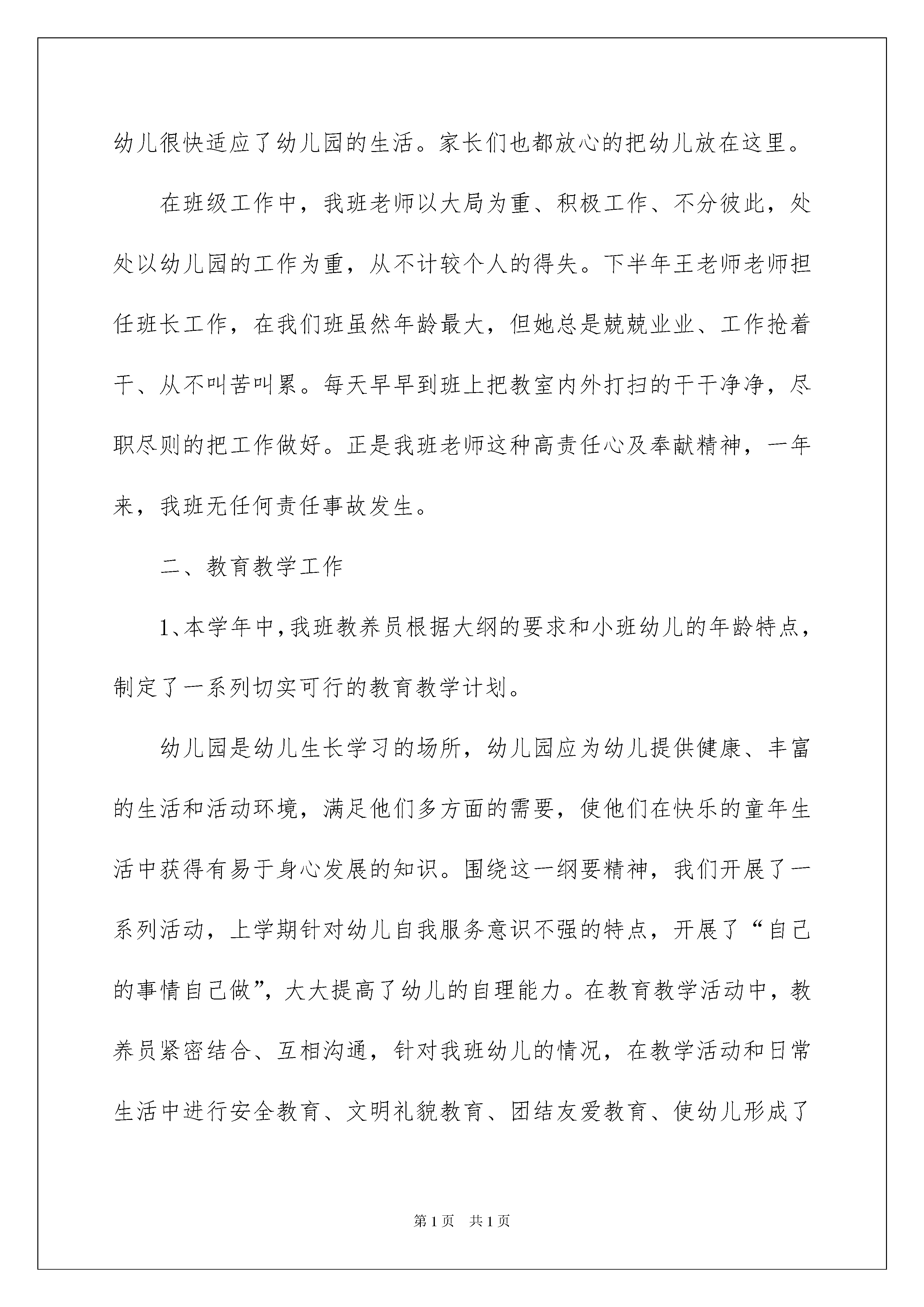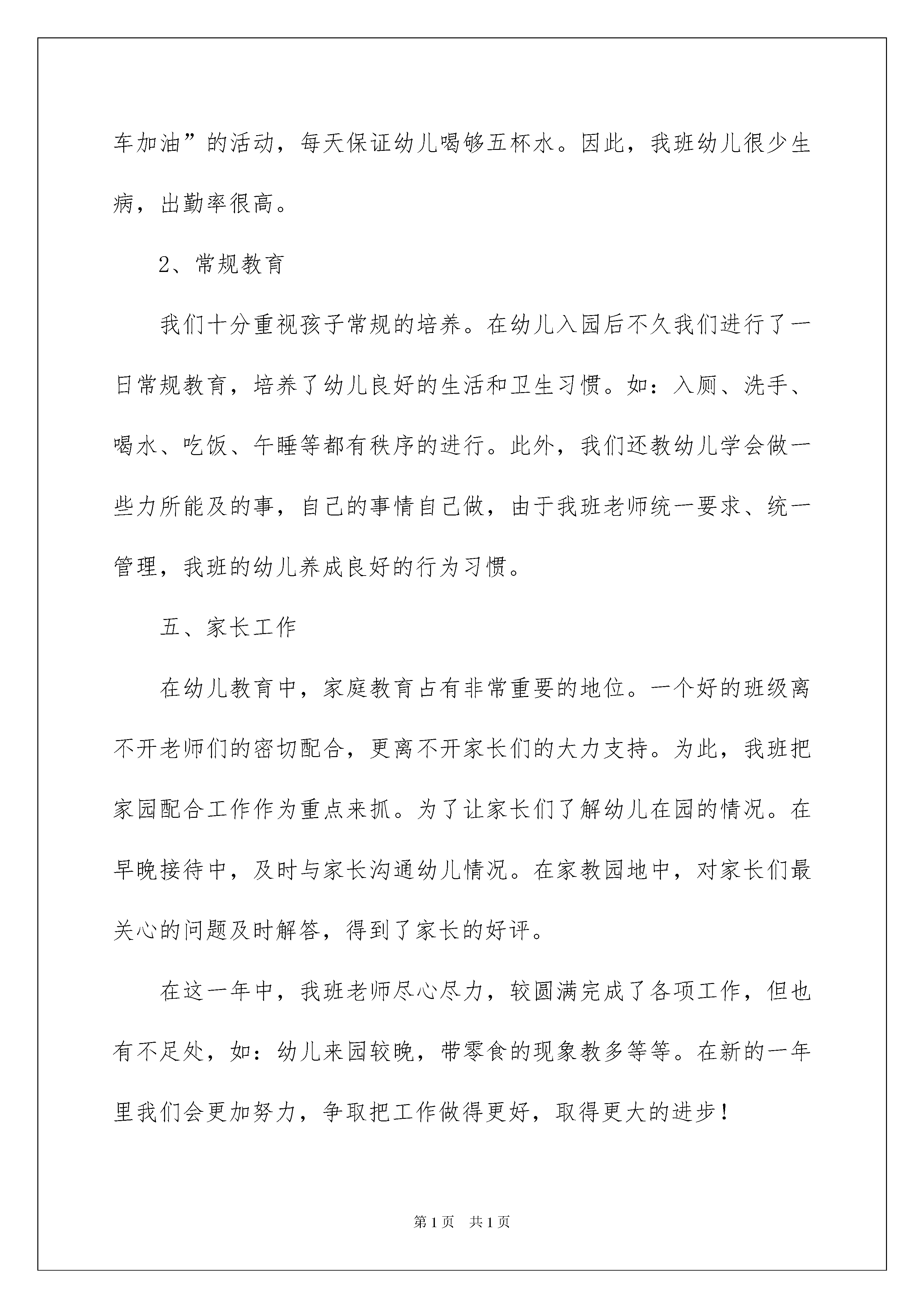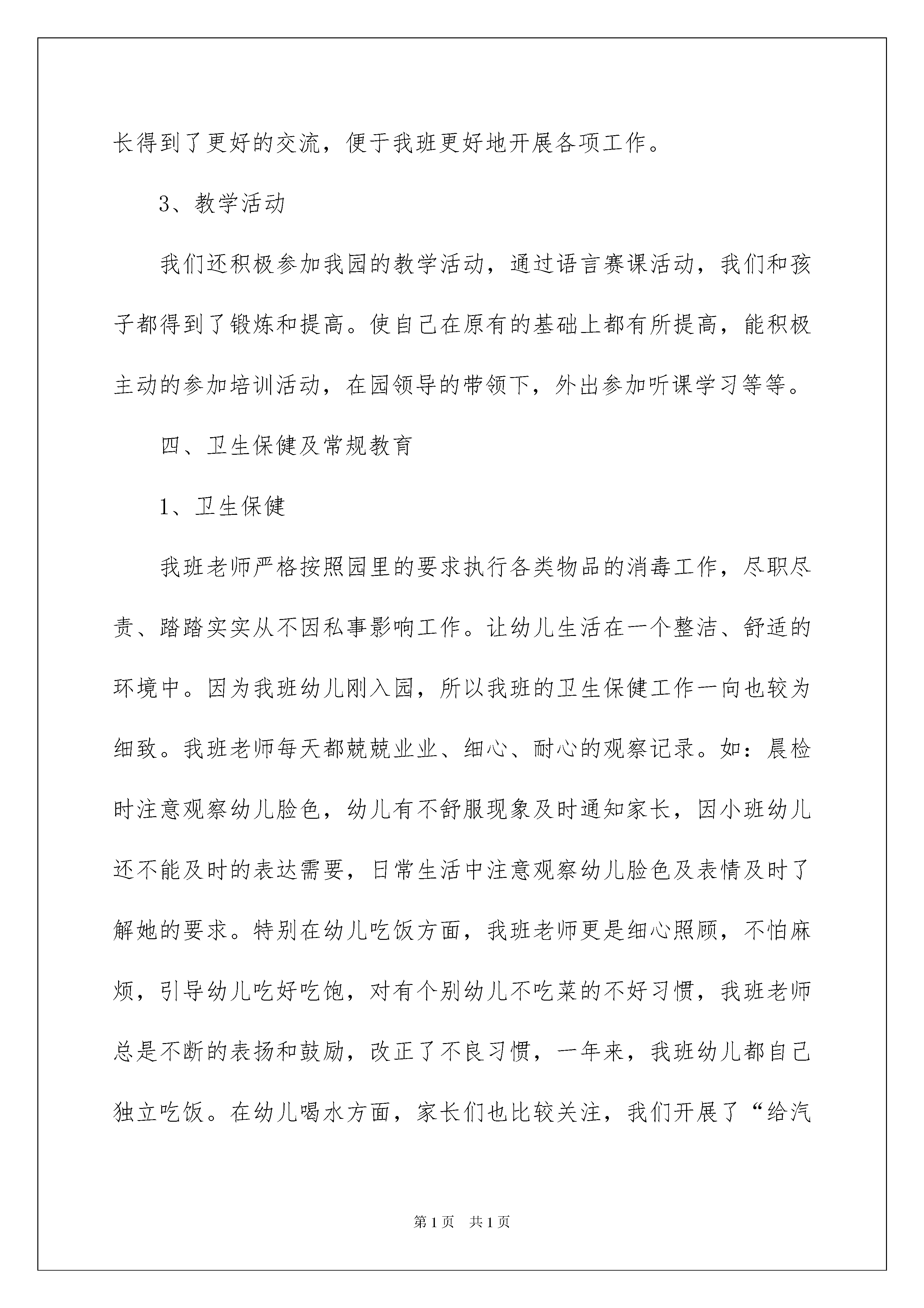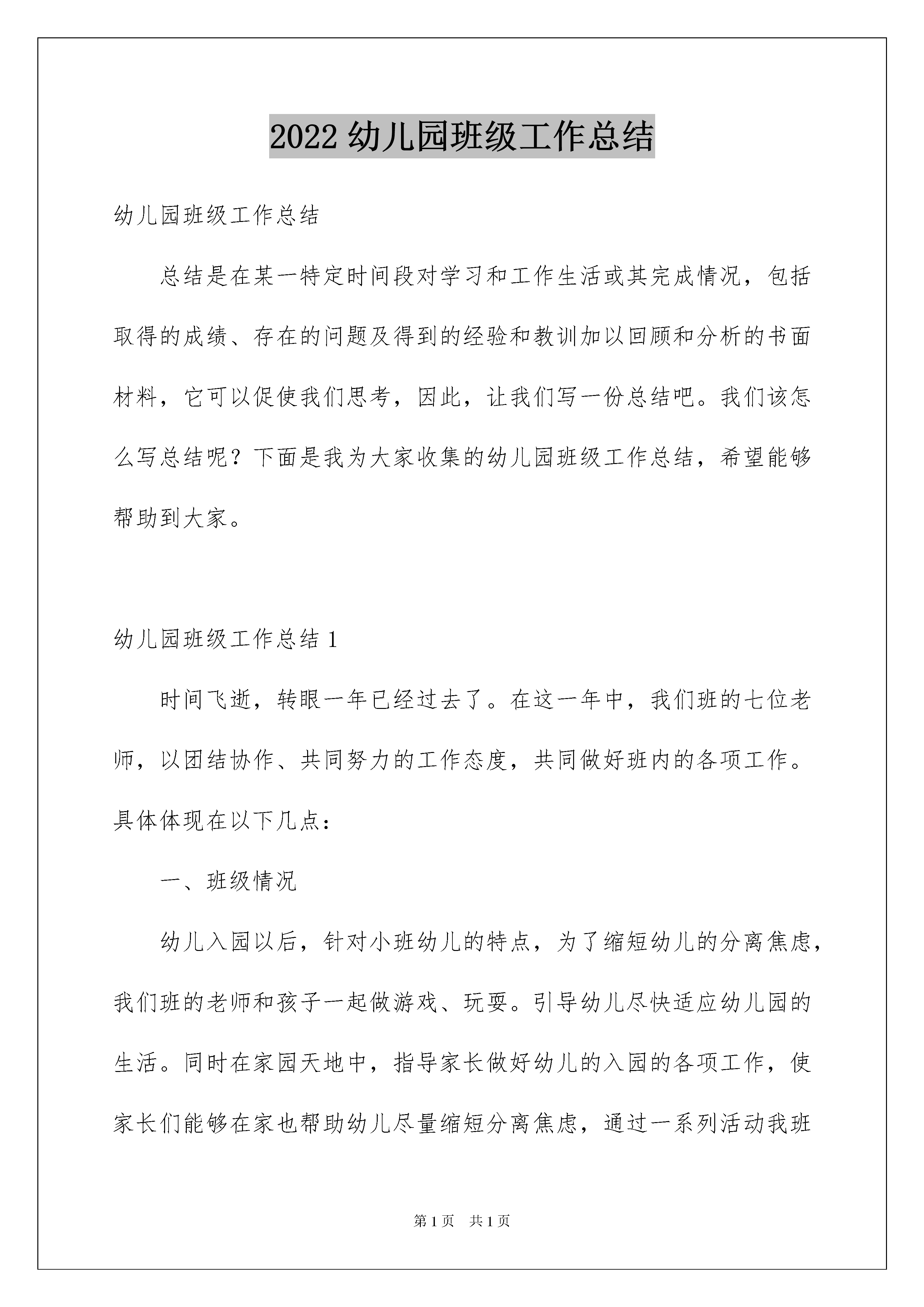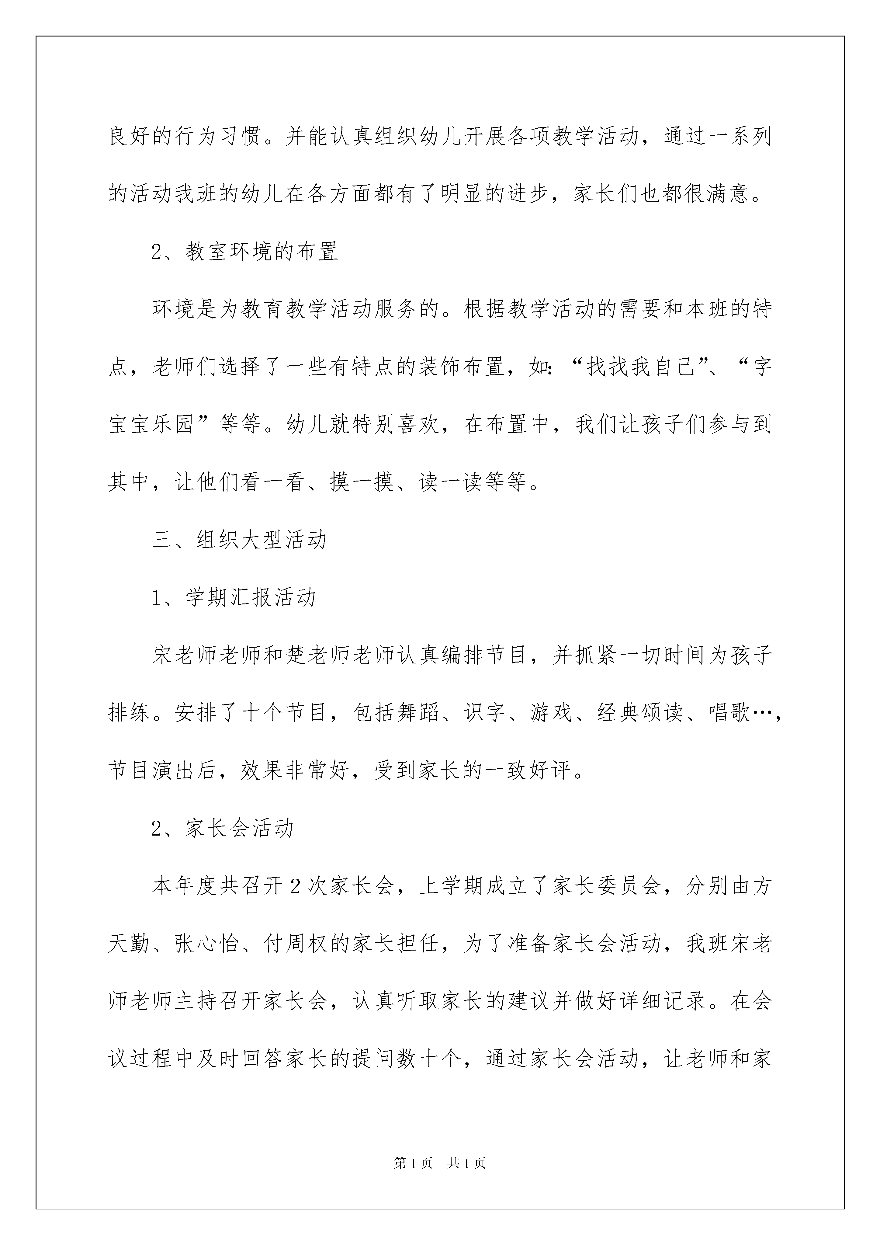 2022幼儿园班级工作总结幼儿园班级工作总结总结是在某一特定时间段对学习和工作生活或其完成情况,包括取得的成绩、存在的问题及得到的经验和教训加以回顾和分析的书面材料,它可以促使我们思考,因此,让我们写一份总结吧。我们该怎么写总结呢?下面是我为大家收集的幼儿园班级工作总结,希望能够帮助到大家。幼儿园班级工作总结1时间飞逝,转眼一年已经过去了。在这一年中,我们班的七位老师,以团结协作、共同努力的工作态度,共同做好班内的各项工作。具体体现在以下几点:一、班级情况幼儿入园以后,针对小班幼儿的特点,为了缩短幼儿的分离焦虑,我们班的老师和孩子一起做游戏、玩耍。引导幼儿尽快适应幼儿园的生活。同时在家园天地中,指导家长做好幼儿的入园的各项工作,使家长们能够在家也帮助幼儿尽量缩短分离焦虑,通过一系列活动我班幼儿很快适应了幼儿园的生活。家长们也都放心的把幼儿放在这里。在班级工作中,我班老师以大局为重、积极工作、不分彼此,处处以幼儿园的工作为重,从不计较个人的得失。下半年王老师老师担任班长工作,在我们班虽然年龄最大,但她总是兢兢业业、工作抢着干、从不叫苦叫累。每天早早到班上把教室内外打扫的干干净净,尽职尽则的把工作做好。正是我班老师这种高责任心及奉献精神,一年来,我班无任何责任事故发生。二、教育教学工作1、本学年中,我班教养员根据大纲的要求和小班幼儿的年龄特点,制定了一系列切实可行的教育教学计划。幼儿园是幼儿生长学习的场所,幼儿园应为幼儿提供健康、丰富的生活和活动环境,满足他们多方面的需要,使他们在快乐的童年生活中获得有易于身心发展的知识。围绕这一纲要精神,我们开展了一系列活动,上学期针对幼儿自我服务意识不强的特点,开展了“自己的事情自己做”,大大提高了幼儿的自理能力。在教育教学活动中,教养员紧密结合、互相沟通,针对我班幼儿的情况,在教学活动和日常生活中进行安全教育、文明礼貌教育、团结友爱教育、使幼儿形成了良好的行为习惯。并能认真组织幼儿开展各项教学活动,通过一系列的活动我班的幼儿在各方面都有了明显的进步,家长们也都很满意。2、教室环境的布置环境是为教育教学活动服务的。根据教学活动的需要和本班的特点,老师们选择了一些有特点的装饰布置,如:“找找我自己”、“字宝宝乐园”等等。幼儿就特别喜欢,在布置中,我们让孩子们参与到其中,让他们看一看、摸一摸、读一读等等。三、组织大型活动1、学期汇报活动宋老师老师和楚老师老师认真编排节目,并抓紧一切时间为孩子排练。安排了十个节目,包括舞蹈、识字、游戏、经典颂读、唱歌…,节目演出后,效果非常好,受到家长的一致好评。2、家长会活动本年度共召开2次家长会,上学期成立了家长委员会,分别由方天勤、张心怡、付周权的家长担任,为了准备家长会活动,我班宋老师老师主持召开家长会,认真听取家长的建议并做好详细记录。在会议过程中及时回答家长的提问数十个,通过家长会活动,让老师和家长得到了更好的交流,便于我班更好地开展各项工作。3、教学活动我们还积极参加我园的教学活动,通过语言赛课活动,我们和孩子都得到了锻炼和提高。使自己在原有的基础上都有所提高,能积极主动的参加培训活动,在园领导的带领下,外出参加听课学习等等。四、卫生保健及常规教育1、卫生保健我班老师严格按照园里的要求执行各类物品的消毒工作,尽职尽责、踏踏实实从不因私事影响工作。让幼儿生活在一个整洁、舒适的环境中。因为我班幼儿刚入园,所以我班的卫生保健工作一向也较为细致。我班老师每天都兢兢业业、细心、耐心的观察记录。如:晨检时注意观察幼儿脸色,幼儿有不舒服现象及时通知家长,因小班幼儿还不能及时的表达需要,日常生活中注意观察幼儿脸色及表情及时了解她的要求。特别在幼儿吃饭方面,我班老师更是细心照顾,不怕麻烦,引导幼儿吃好吃饱,对有个别幼儿不吃菜的不好习惯,我班老师总是不断的表扬和鼓励,改正了不良习惯,一年来,我班幼儿都自己独立吃饭。在幼儿喝水方面,家长们也比较关注,我们开展了“给汽车加油”的活动,每天保证幼儿喝够五杯水。因此,我班幼儿很少生病,出勤率很高。2、常规教育我们十分重视孩子常规的培养。在幼儿入园后不久我们进行了一日常规教育,培养了幼儿良好的生活和卫生习惯。如:入厕、洗手、喝水、吃饭、午睡等都有秩序的进行。此外,我们还教幼儿学会做一些力所能及的事,自己的事情自己做,由于我班老师统一要求、统一管理,我班的幼儿养成良好的行为习惯。五、家长工作在幼儿教育中,家庭教育占有非常重要的地位。一个好的班级离不开老师们的密切配合,更离不开家长们的大力支持。为此,我班把家园配合工作作为重点来抓。为了让家长们了解幼儿在园的情况。在早晚接待中,及时