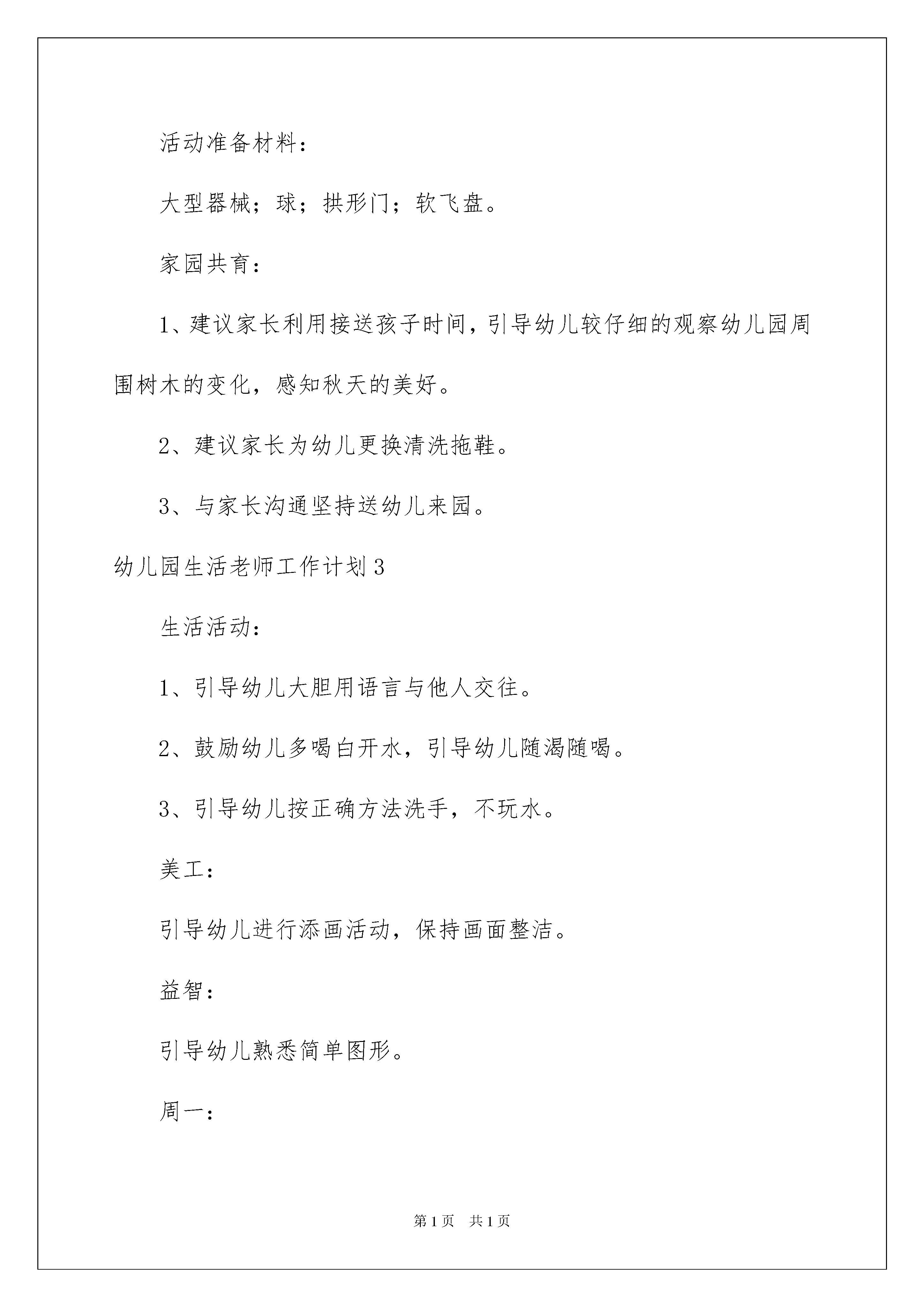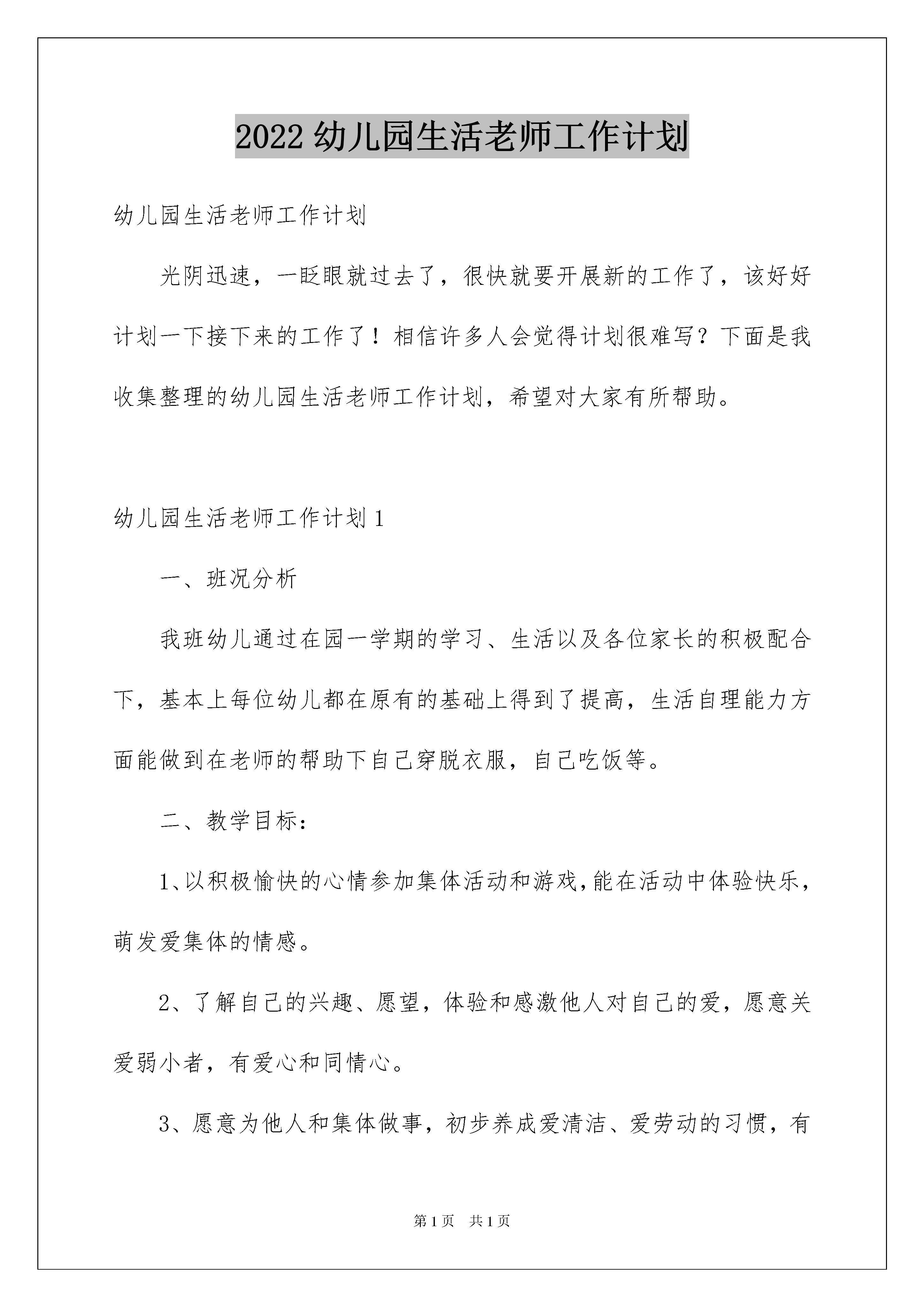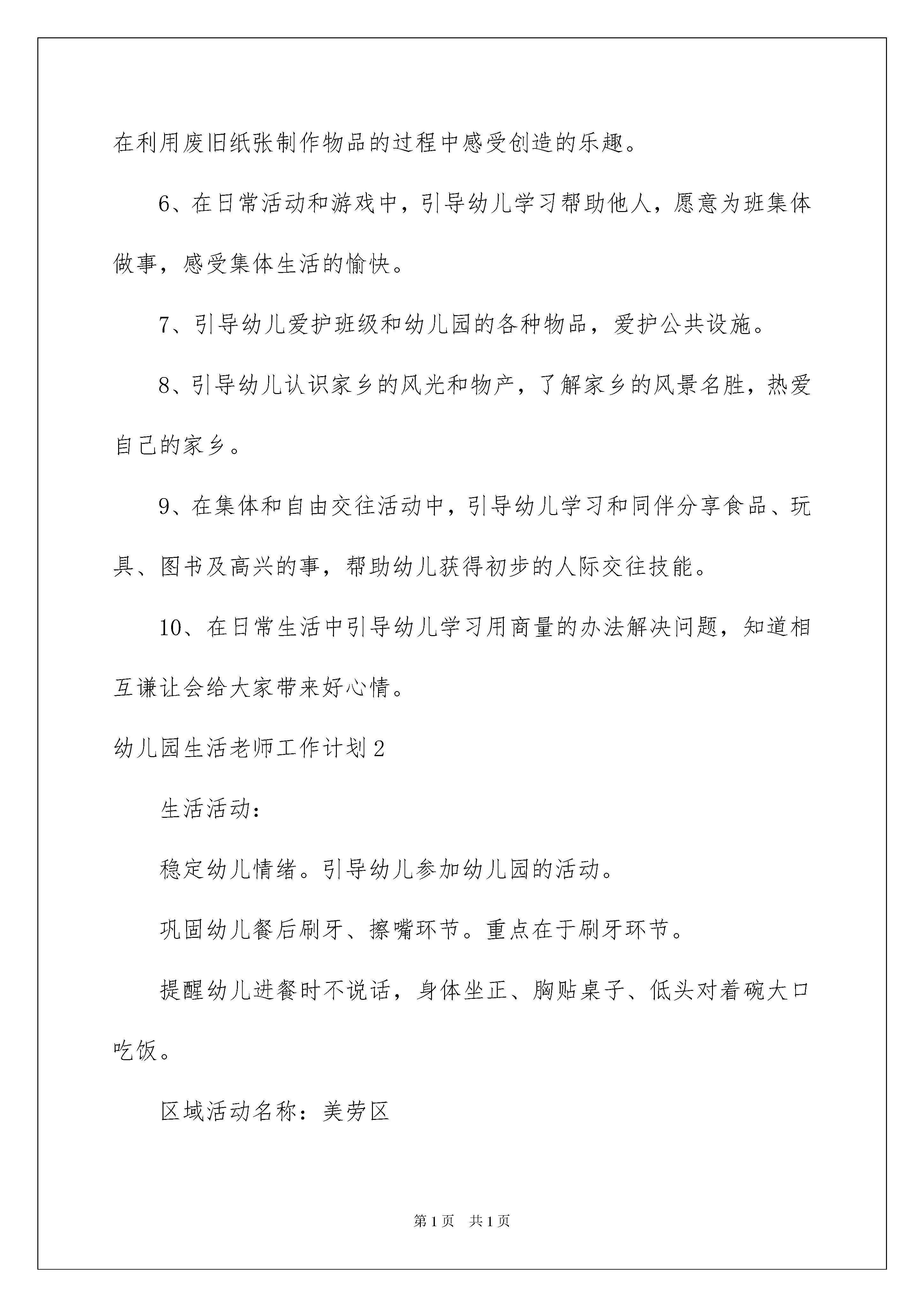 2022幼儿园生活老师工作计划幼儿园生活老师工作计划光阴迅速,一眨眼就过去了,很快就要开展新的工作了,该好好计划一下接下来的工作了!相信许多人会觉得计划很难写?下面是我收集整理的幼儿园生活老师工作计划,希望对大家有所帮助。幼儿园生活老师工作计划1一、班况分析我班幼儿通过在园一学期的学习、生活以及各位家长的积极配合下,基本上每位幼儿都在原有的基础上得到了提高,生活自理能力方面能做到在老师的帮助下自己穿脱衣服,自己吃饭等。二、教学目标:1、以积极愉快的心情参加集体活动和游戏,能在活动中体验快乐,萌发爱集体的情感。2、了解自己的兴趣、愿望,体验和感激他人对自己的爱,愿意关爱弱小者,有爱心和同情心。3、愿意为他人和集体做事,初步养成爱清洁、爱劳动的习惯,有初步的自我服务能力。能遵守一日生活中的基本规则,能简单评价自己和同伴的行为,学习同伴的优点。4、了解家乡的物产和名胜古迹,热爱自己的家乡。保护家乡的优美环境,乐意与人交往,学习谦让和分享,具有初步的社会公德意识。5、了解与自己生活关系密切的周围成人的劳动,尊重劳动者,懂得爱惜劳动成果。6、遇到困难、挫折,尝试自己解决,初步养成勇敢、自信、合作等良好品质。三、具体措施:1、引导幼儿了解中国传统节日文化,感受节日活动的乐趣。2、在日常活动中,引导幼儿体验感受他人的爱,初步尝试用自己的方式回报亲人和他人给予的关爱。3、积极鼓励幼儿以愉快的心情参加各种活动,引导幼儿学会关心理解同伴的心情,并愿意给予帮助。4、引导幼儿在日常活动中养成耐心听取别人意见的习惯,学习与同伴相互协商交流,积累有计划、有条理做事的经验。5、引导幼儿了解纸与人类的密切关系,知道节约用纸的'意义,在利用废旧纸张制作物品的过程中感受创造的乐趣。6、在日常活动和游戏中,引导幼儿学习帮助他人,愿意为班集体做事,感受集体生活的愉快。7、引导幼儿爱护班级和幼儿园的各种物品,爱护公共设施。8、引导幼儿认识家乡的风光和物产,了解家乡的风景名胜,热爱自己的家乡。9、在集体和自由交往活动中,引导幼儿学习和同伴分享食品、玩具、图书及高兴的事,帮助幼儿获得初步的人际交往技能。10、在日常生活中引导幼儿学习用商量的办法解决问题,知道相互谦让会给大家带来好心情。幼儿园生活老师工作计划2生活活动:稳定幼儿情绪。引导幼儿参加幼儿园的活动。巩固幼儿餐后刷牙、擦嘴环节。重点在于刷牙环节。提醒幼儿进餐时不说话,身体坐正、胸贴桌子、低头对着碗大口吃饭。区域活动名称:美劳区区域活动目标:学习正确的涂色方法,鼓励幼儿想象自己的树叶颜色。培养幼儿知道卫生安全,不将蜡笔放入嘴里或涂画在手上或脸上。活动准备材料:蜡笔;树叶图画纸。活动指导方式:引导幼儿回忆外出时看到的树叶颜色。并观察采回来的树叶。自己取画纸,并根据自己需要选择蜡笔进行涂色。重点指导幼儿一手扶纸一手涂色。不用力过大,来回进行涂色。鼓励幼儿大胆下笔。户外活动:1、集体游戏名称:吃毛桃集体游戏目标:1、初步掌握游戏规则和玩法。2、能和同伴愉快的进行游戏。分散活动目标:1、稳定幼儿情绪,引导幼儿能加入到活动中。2、练习拍球。活动准备材料:大型器械;球;拱形门;软飞盘。家园共育:1、建议家长利用接送孩子时间,引导幼儿较仔细的观察幼儿园周围树木的变化,感知秋天的美好。2、建议家长为幼儿更换清洗拖鞋。3、与家长沟通坚持送幼儿来园。幼儿园生活老师工作计划3生活活动:1、引导幼儿大胆用语言与他人交往。2、鼓励幼儿多喝白开水,引导幼儿随渴随喝。3、引导幼儿按正确方法洗手,不玩水。美工:引导幼儿进行添画活动,保持画面整洁。益智:引导幼儿熟悉简单图形。周一:1、引导幼儿正确发出兔、裤字音。2、引导幼儿用自然的声音演唱,不喊唱。周二:1、感知冬季最明显特点,知道天冷多穿衣。2、引导幼儿应用线条来表现雨点和水花。周三:1、鼓励幼儿大胆用圆形进行添画。2、练习原地纵跳触物,增强腿部气力,发展弹跳能力及调和能力。周四:1、引导幼儿不和陌生人说话。2、引导幼儿通过操纵来感知、熟悉正方形。1、社会《小兔乖乖》2、数学《给正方形涂色》周五:尝试用点、线、圆组合图形,有控制地将一个点与另外一个点连接起来。童心画语《打电话》户外活动目标1、会玩球、小车等多种中小型运动器材。2、引导幼儿按规则进行游戏,感受游戏带来的快乐。预备安全的活动场地;小推车、沙包、大车轮、羊角球。集体游戏游戏名称游戏玩法敲小锣教师发出口令,两名幼儿跑向小锣并敲击,然后返回,先导者为胜。扔沙包幼儿听口令,进行肩上投掷。分散活动小推车、大车轮、羊角球、沙包。家园共育1、家长引导幼儿在家多喝白开水,并到户外锻炼身体进步抵抗
