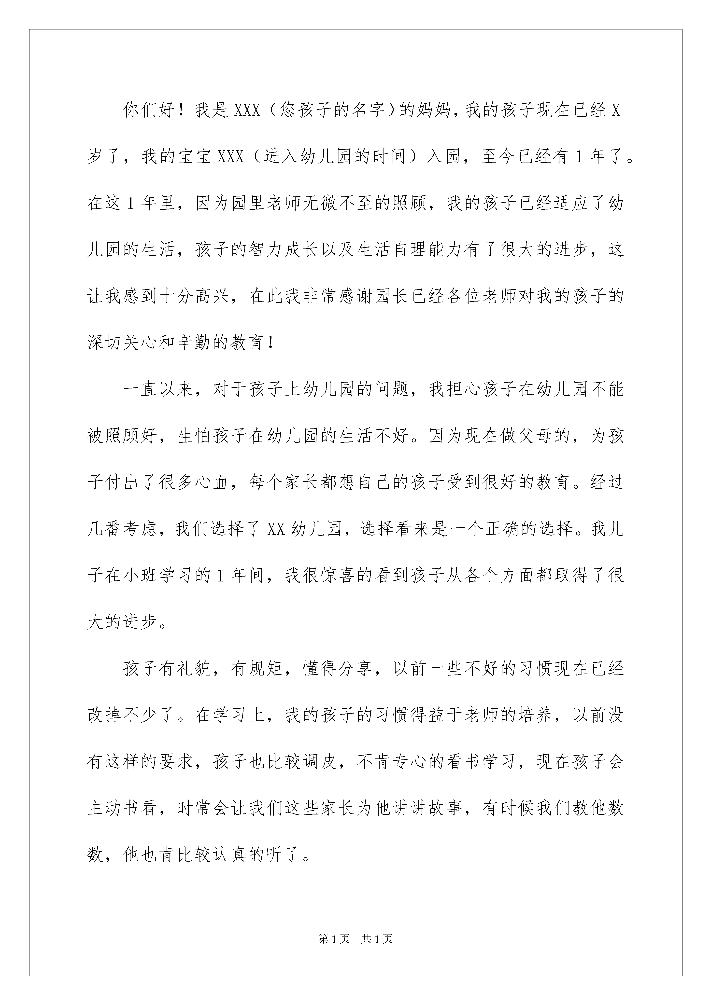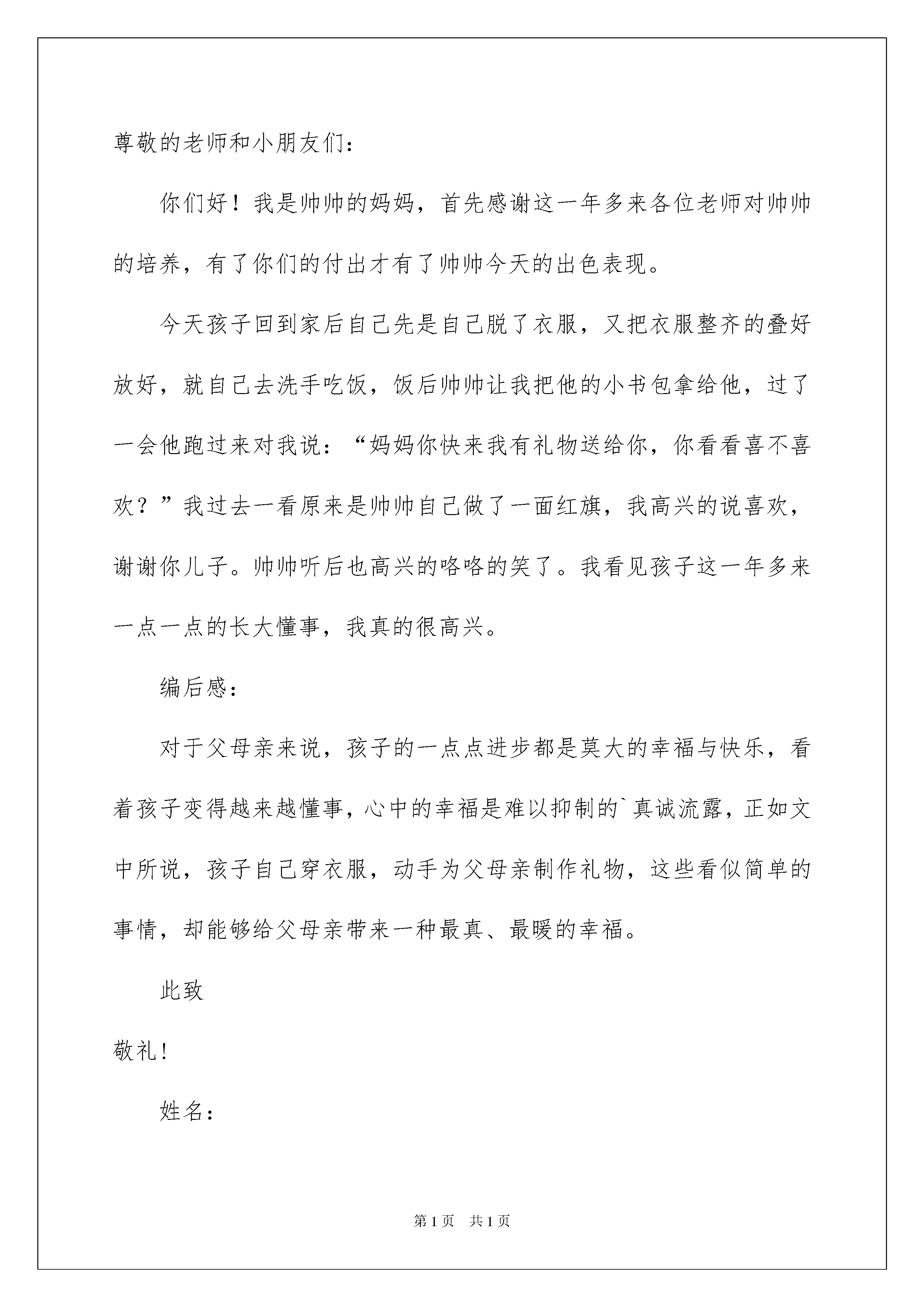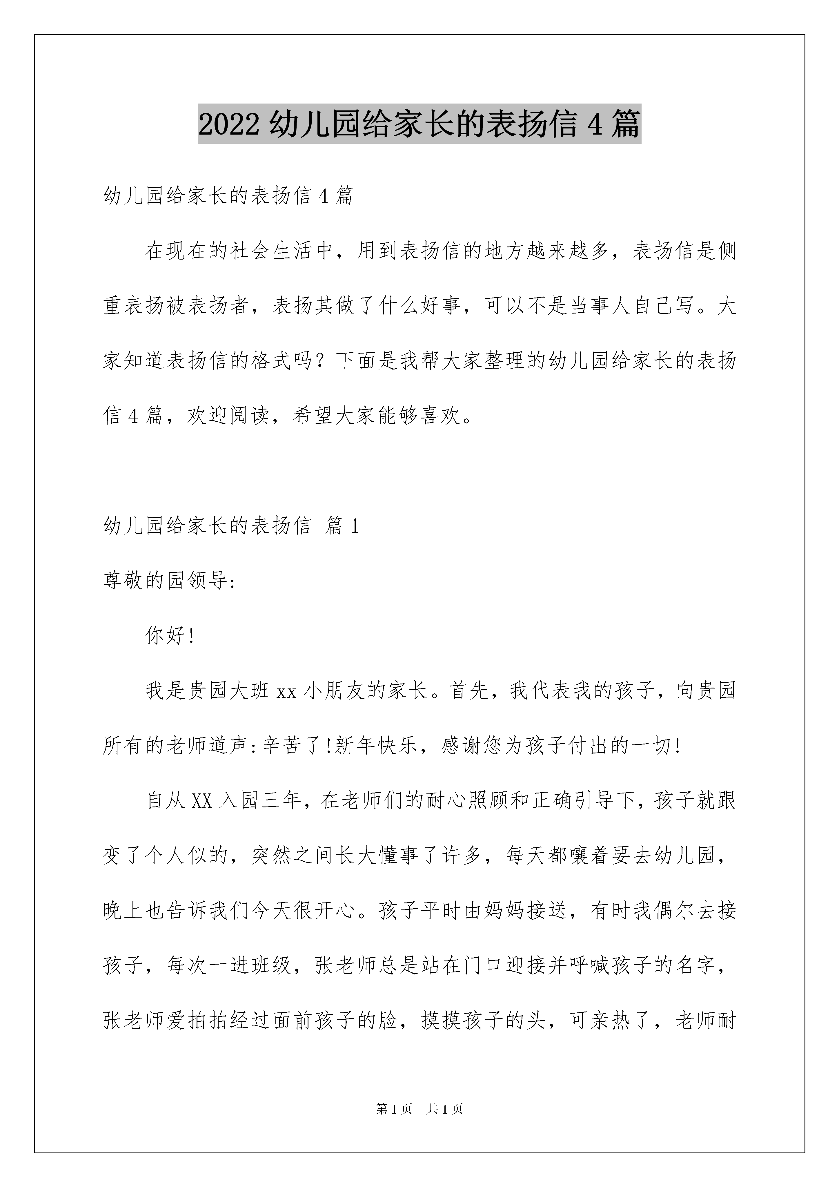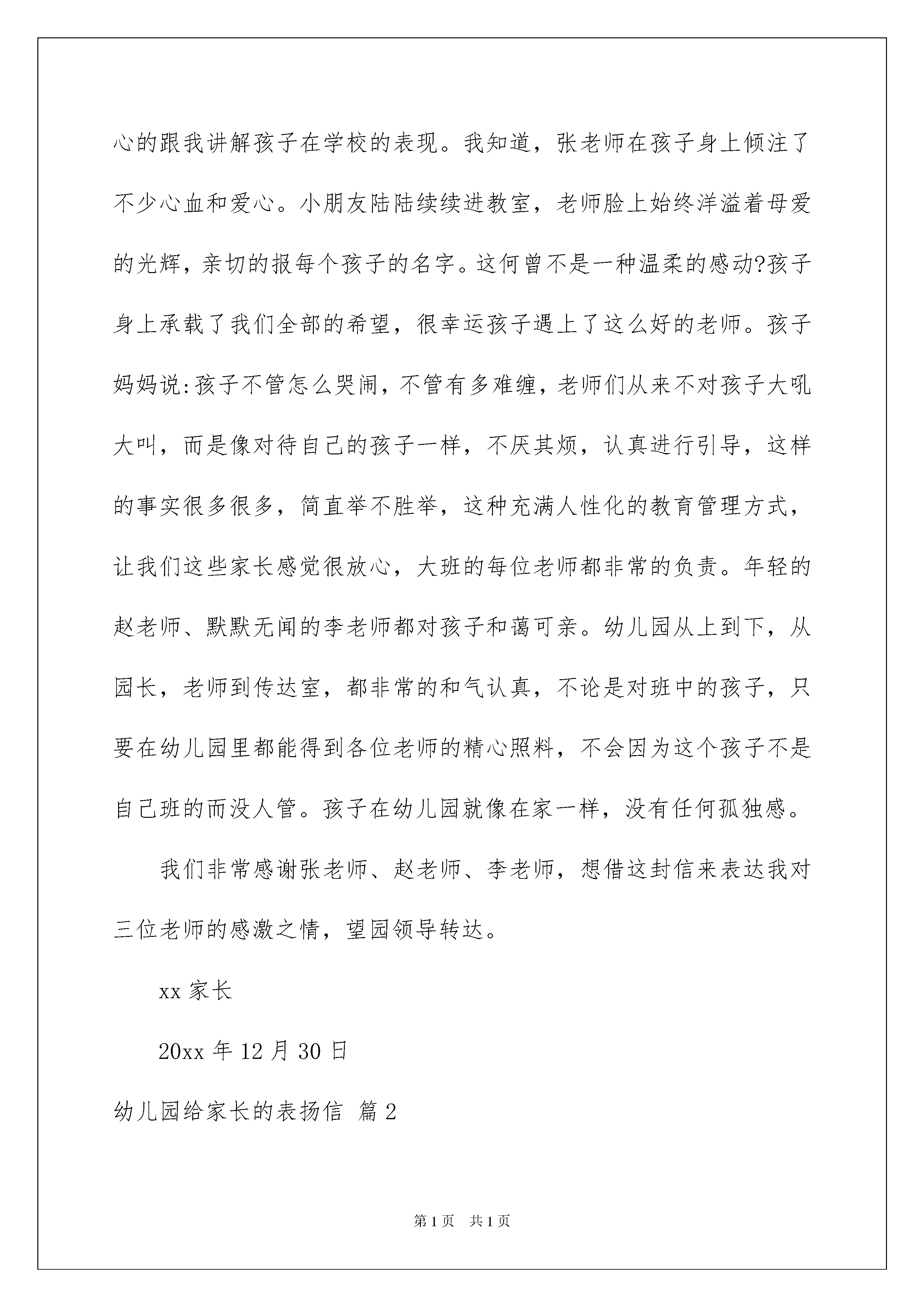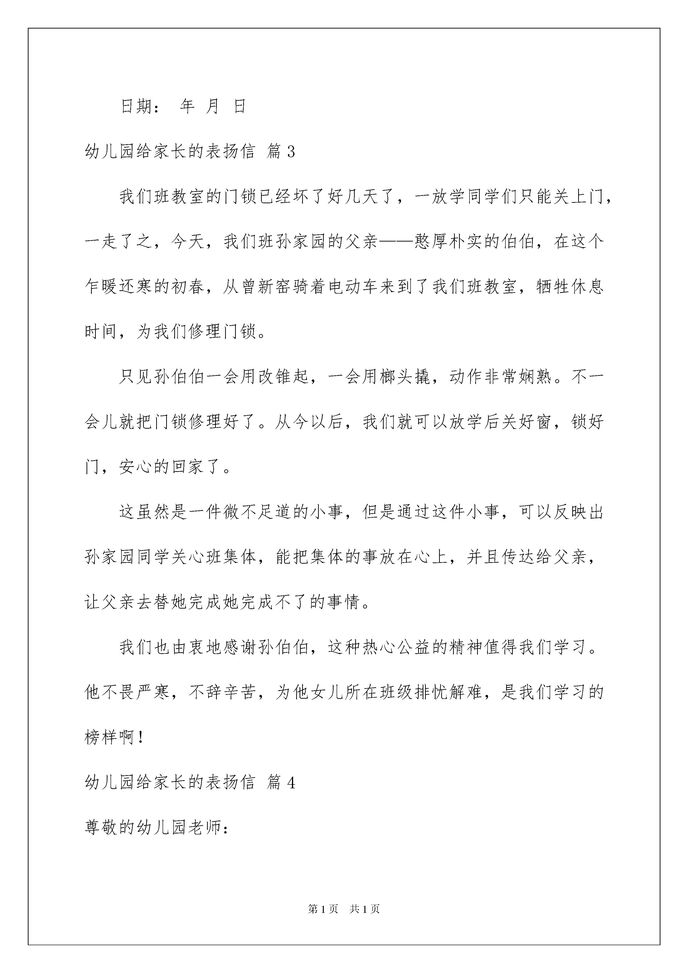 2022幼儿园给家长的表扬信4篇幼儿园给家长的表扬信4篇在现在的社会生活中,用到表扬信的地方越来越多,表扬信是侧重表扬被表扬者,表扬其做了什么好事,可以不是当事人自己写。大家知道表扬信的格式吗?下面是我帮大家整理的幼儿园给家长的表扬信4篇,欢迎阅读,希望大家能够喜欢。幼儿园给家长的表扬信篇1尊敬的园领导:你好!我是贵园大班xx小朋友的家长。首先,我代表我的孩子,向贵园所有的老师道声:辛苦了!新年快乐,感谢您为孩子付出的一切!自从XX入园三年,在老师们的耐心照顾和正确引导下,孩子就跟变了个人似的,突然之间长大懂事了许多,每天都嚷着要去幼儿园,晚上也告诉我们今天很开心。孩子平时由妈妈接送,有时我偶尔去接孩子,每次一进班级,张老师总是站在门口迎接并呼喊孩子的名字,张老师爱拍拍经过面前孩子的脸,摸摸孩子的头,可亲热了,老师耐心的跟我讲解孩子在学校的表现。我知道,张老师在孩子身上倾注了不少心血和爱心。小朋友陆陆续续进教室,老师脸上始终洋溢着母爱的光辉,亲切的报每个孩子的名字。这何曾不是一种温柔的感动?孩子身上承载了我们全部的希望,很幸运孩子遇上了这么好的老师。孩子妈妈说:孩子不管怎么哭闹,不管有多难缠,老师们从来不对孩子大吼大叫,而是像对待自己的孩子一样,不厌其烦,认真进行引导,这样的事实很多很多,简直举不胜举,这种充满人性化的教育管理方式,让我们这些家长感觉很放心,大班的每位老师都非常的负责。年轻的赵老师、默默无闻的李老师都对孩子和蔼可亲。幼儿园从上到下,从园长,老师到传达室,都非常的和气认真,不论是对班中的孩子,只要在幼儿园里都能得到各位老师的精心照料,不会因为这个孩子不是自己班的而没人管。孩子在幼儿园就像在家一样,没有任何孤独感。我们非常感谢张老师、赵老师、李老师,想借这封信来表达我对三位老师的感激之情,望园领导转达。xx家长20xx年12月30日幼儿园给家长的表扬信篇2尊敬的老师和小朋友们:你们好!我是帅帅的妈妈,首先感谢这一年多来各位老师对帅帅的培养,有了你们的付出才有了帅帅今天的出色表现。今天孩子回到家后自己先是自己脱了衣服,又把衣服整齐的叠好放好,就自己去洗手吃饭,饭后帅帅让我把他的小书包拿给他,过了一会他跑过来对我说:“妈妈你快来我有礼物送给你,你看看喜不喜欢?”我过去一看原来是帅帅自己做了一面红旗,我高兴的说喜欢,谢谢你儿子。帅帅听后也高兴的咯咯的笑了。我看见孩子这一年多来一点一点的长大懂事,我真的很高兴。编后感:对于父母亲来说,孩子的一点点进步都是莫大的幸福与快乐,看着孩子变得越来越懂事,心中的幸福是难以抑制的`真诚流露,正如文中所说,孩子自己穿衣服,动手为父母亲制作礼物,这些看似简单的事情,却能够给父母亲带来一种最真、最暖的幸福。此致敬礼!姓名:日期:年月日幼儿园给家长的表扬信篇3我们班教室的门锁已经坏了好几天了,一放学同学们只能关上门,一走了之,今天,我们班孙家园的父亲——憨厚朴实的伯伯,在这个乍暖还寒的初春,从曾新窑骑着电动车来到了我们班教室,牺牲休息时间,为我们修理门锁。只见孙伯伯一会用改锥起,一会用榔头撬,动作非常娴熟。不一会儿就把门锁修理好了。从今以后,我们就可以放学后关好窗,锁好门,安心的回家了。这虽然是一件微不足道的小事,但是通过这件小事,可以反映出孙家园同学关心班集体,能把集体的事放在心上,并且传达给父亲,让父亲去替她完成她完成不了的事情。我们也由衷地感谢孙伯伯,这种热心公益的精神值得我们学习。他不畏严寒,不辞辛苦,为他女儿所在班级排忧解难,是我们学习的榜样啊!幼儿园给家长的表扬信篇4尊敬的幼儿园老师:你们好!我是XXX(您孩子的名字)的妈妈,我的孩子现在已经X岁了,我的宝宝XXX(进入幼儿园的时间)入园,至今已经有1年了。在这1年里,因为园里老师无微不至的照顾,我的孩子已经适应了幼儿园的生活,孩子的智力成长以及生活自理能力有了很大的进步,这让我感到十分高兴,在此我非常感谢园长已经各位老师对我的孩子的深切关心和辛勤的教育!一直以来,对于孩子上幼儿园的问题,我担心孩子在幼儿园不能被照顾好,生怕孩子在幼儿园的生活不好。因为现在做父母的,为孩子付出了很多心血,每个家长都想自己的孩子受到很好的教育。经过几番考虑,我们选择了XX幼儿园,选择看来是一个正确的选择。我儿子在小班学习的1年间,我很惊喜的看到孩子从各个方面都取得了很大的进步。孩子有礼貌,有规矩,懂得分享,以前一些不好的习惯现在已经改掉不少了。在学习上,我的孩子的习惯得益于老师的培养,以前没有这样的要求,孩子也比较调皮,不肯专心的看书学习,现在孩子会主动书看,时常会让我们这些家长为他讲讲故事,有时