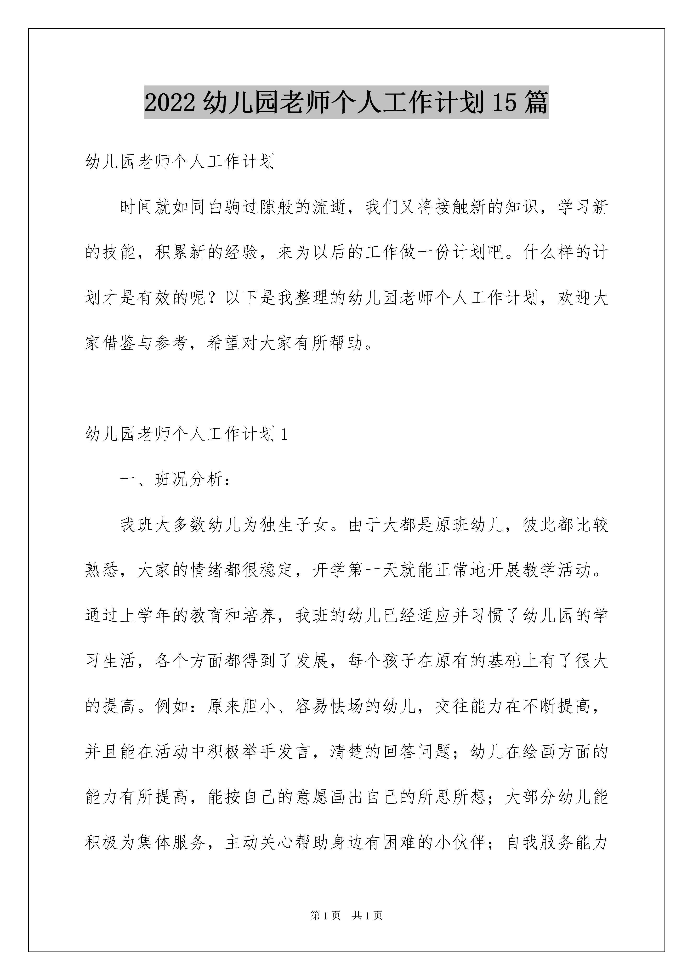 2022幼儿园老师个人工作计划15篇幼儿园老师个人工作计划时间就如同白驹过隙般的流逝,我们又将接触新的知识,学习新的技能,积累新的经验,来为以后的工作做一份计划吧。什么样的计划才是有效的呢?以下是我整理的幼儿园老师个人工作计划,欢迎大家借鉴与参考,希望对大家有所帮助。幼儿园老师个人工作计划1一、班况分析:我班大多数幼儿为独生子女。由于大都是原班幼儿,彼此都比较熟悉,大家的情绪都很稳定,开学第一天就能正常地开展教学活动。通过上学年的教育和培养,我班的幼儿已经适应并习惯了幼儿园的学习生活,各个方面都得到了发展,每个孩子在原有的基础上有了很大的提高。例如:原来胆小、容易怯场的幼儿,交往能力在不断提高,并且能在活动中积极举手发言,清楚的回答问题;幼儿在绘画方面的能力有所提高,能按自己的意愿画出自己的所思所想;大部分幼儿能积极为集体服务,主动关心帮助身边有困难的小伙伴;自我服务能力也有了很大的提高,学会了自己穿脱衣裤。但在学习兴趣、音乐表现力等方面有所欠缺,个别幼儿有不良行为习惯,如:跷椅子、不能谦让,遇事爱争执等。在新学年,我们将在《园工作计划》的指导下,结合本班幼儿的实际情况,家园合作,开展班级各项工作,促进幼儿富有个性的发展。二、班级目标:1、养成孩子间相互学习的好习惯,培养幼儿自主和决策的能力,建立一个共同探讨的团体。2、营造一个充满爱的班级氛围,让幼儿有安全感,培养幼儿的责任感。3、继续认真学习新《纲要》,树立正确的教育观,统一教育思想,并转化为教育行为。4、帮助家长树立正确的儿童观、教育观、知识观,明确幼儿期教育重心是个性能力的培养,使家长认同熟悉我们的教育宗旨、目标和课程形式,并支持参与幼儿园的教育活动,形成良好的"家园对话互动网"。三、本学期工作重点:1、教育教学方面:(1)、继续以主题活动的形式开展教育教学活动。在活动中,注重观察孩子的情况,以便生成新的活动,更有利于孩子的发展;(2)、根据本班幼儿学习与发展的具体情况,针对性地设计和组织一些游戏,帮助幼儿在游戏中获得或扩展相关经验。如,将教学内容延伸至区域活动中,保证使每个幼儿都有充分操作的机会;将智力游戏、音乐游戏及娱乐游戏等科学、合理地渗透到幼儿的一日活动中去,让幼儿在游戏活动过程中主动地建构多方面的认知能力。(3)、为了让幼儿在活动区中真正"活"起来,让幼儿在做做玩玩中开发智力,提高能力,本学期重点引导幼儿参与活动区的创设,满足同一年龄阶段不同幼儿的需要,根据教育目标、主题的转变,定期进行材料的更换投放,并在实践中进行总结研究。(4)、加强艺术表现能力的培养。通过丰富多彩的活动,让幼儿喜欢听音乐,唱歌,绘画,感受音乐及艺术作品的美;学习对音乐对物体进行想象,能用动作,表情或语言表达,或描绘;喜欢表演,积极大胆地参与表演活动;懂得保持画面清洁,绘图的色彩丰富,鲜艳;能欣赏别人及自己的作品,尝试进行一定的评价。2、班级建设方面:尊重幼儿的年龄特点,在各领域中开展丰富多彩的教育活动,将阅读渗入其中。如在各教育活动中渗透与幼儿年龄相适应的教育目标及教育内容,通过谈话、儿歌、故事、游戏、观察等手段,通过集体阅读、图文并读、拓展想象等多种途径开展各种活动,让幼儿在各个领域的融合中养成良好的阅读习惯,引导幼儿体会分享阅读的乐趣。3、德育建设方面:(1)、有计划地开展环境教育主题活动。根据幼儿年龄特点和实际情况,充分挖掘生活中环境教育内容,并融入到各大领域之中,让幼儿在参与的过程中,树立环保意识,丰富环保知识。(2)、把环境教育渗透于幼儿一日活动中,从小事做起,点点滴滴培养幼儿良好的环保行为。(3)、注重幼儿环保实践。创造机会,引导幼儿参与环保的宣传与实践活动,初步养成幼儿良好环保行为习惯。(4)、教师、幼儿、家长自觉遵守日常行为规范,保持幼儿园及周围环境的整齐、清洁、优美,营造良好的环境。4、安全、保健方面:(1)、创设安全舒适的幼儿活动环境。随时随地检查教室内外的活动场地的安全状况,发现问题,妥善处理,将不安全因素降低到最低限度。(2)、最大限度地保证幼儿在户外活动中的安全,及时排除不安全因素。同时注重孩子的安全教育,让孩子们在进行身体锻炼的时候知道该怎样避免让自己受伤。(3)、培养幼儿的自我保护意识。比如:知道自己父母的姓名、电话;知道自己的家庭住址;知道遇到危险时会大声呼救等。(4)、每天做好晨检工作,检查幼儿的精神面貌、身体状况、以及是否携带危险物品;增加午睡安全检查工作、检查孩子是否携带危险物品上床、检查幼儿有无将异物放进嘴里等。(5)、认真做好卫生消毒工作,严格执行各种物品洗刷消毒制度。做好疾病预防工作,做到