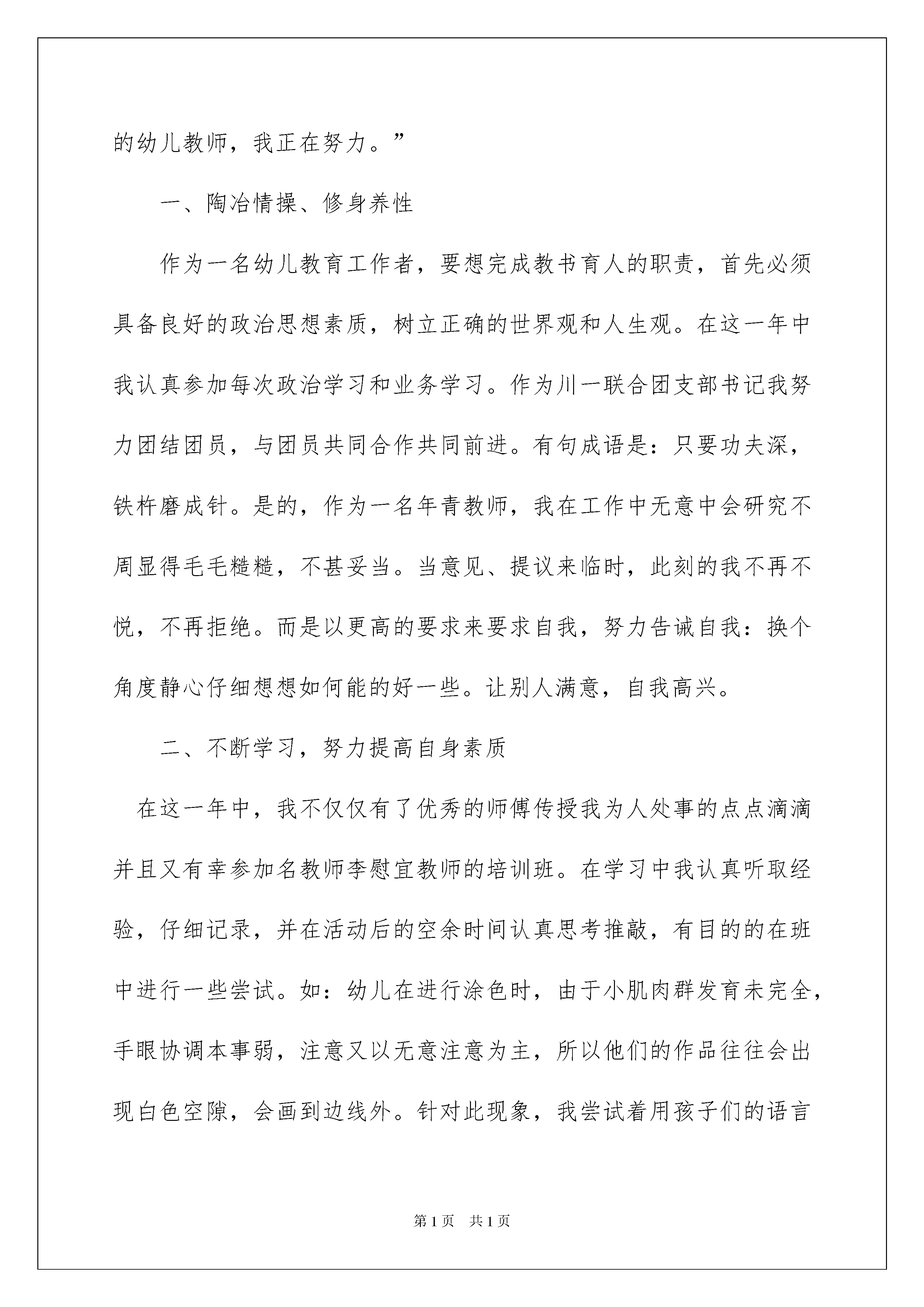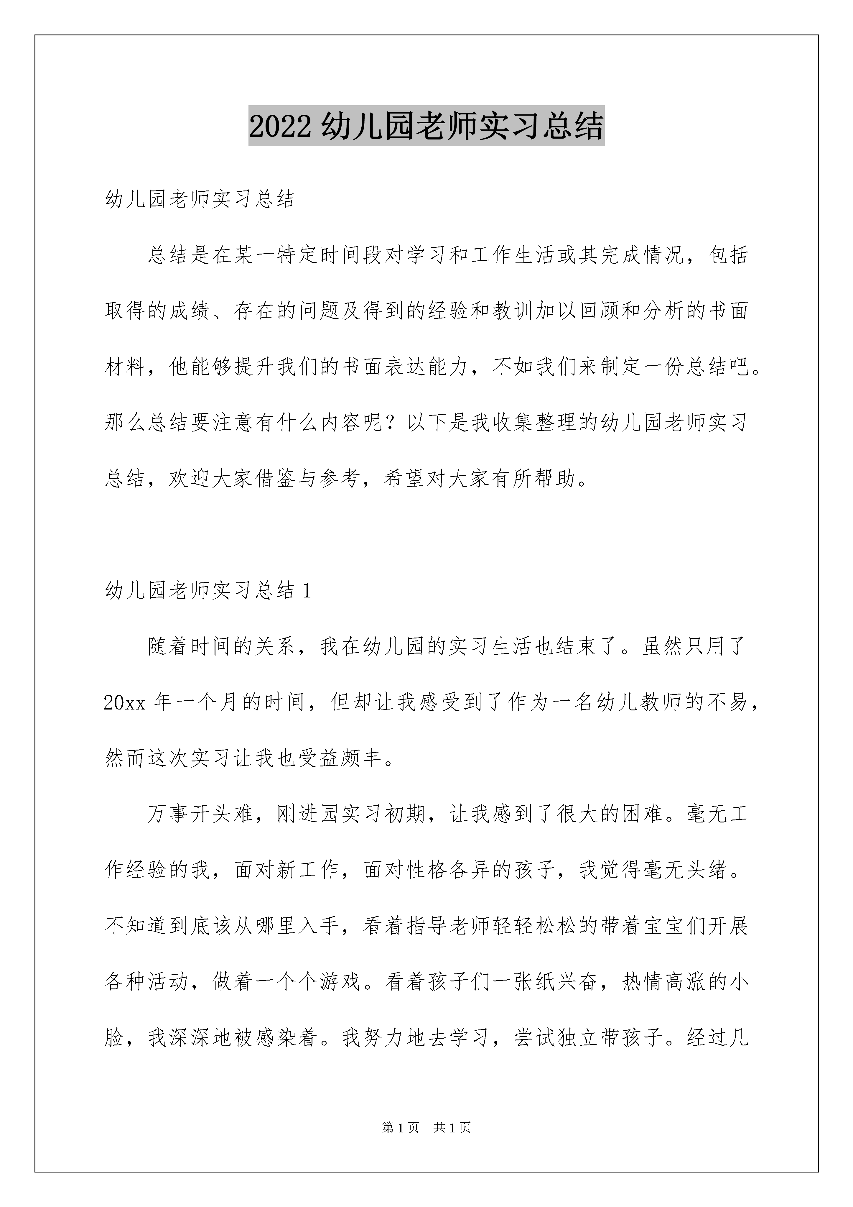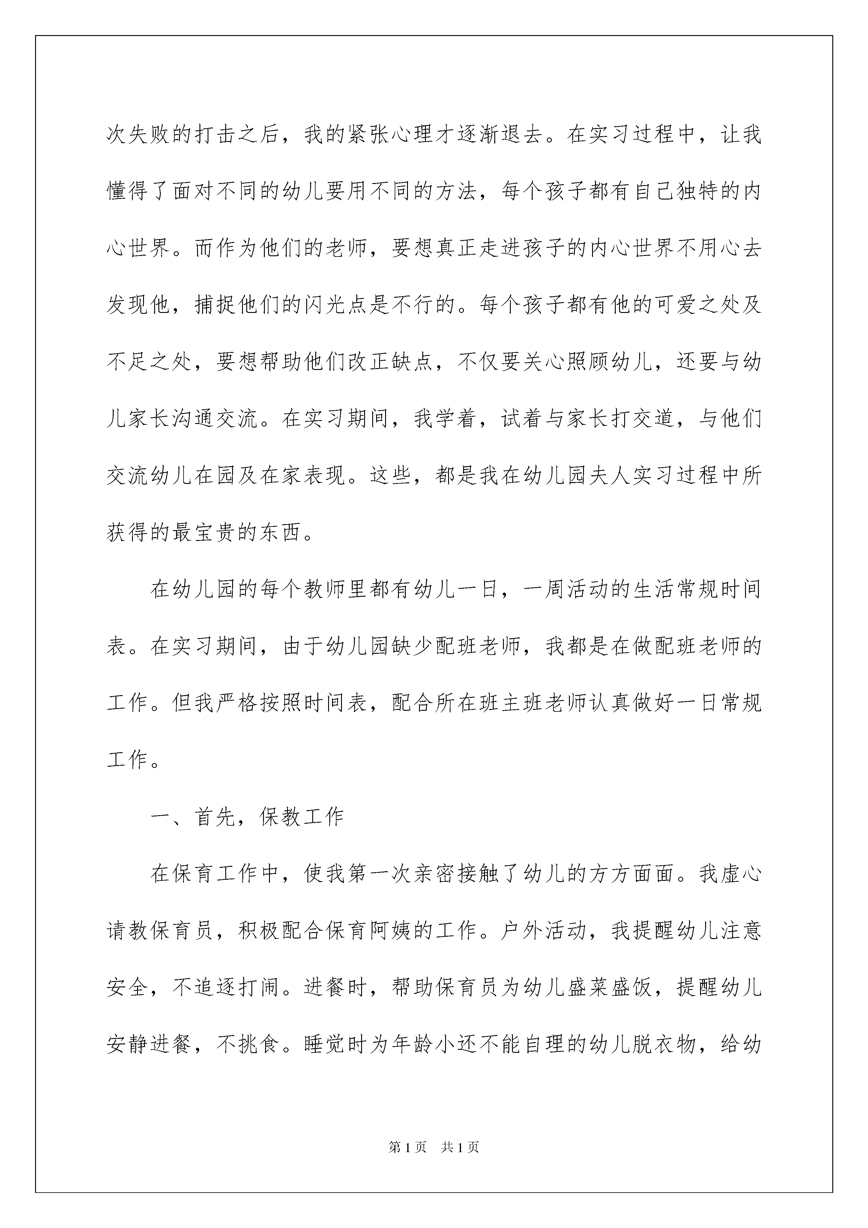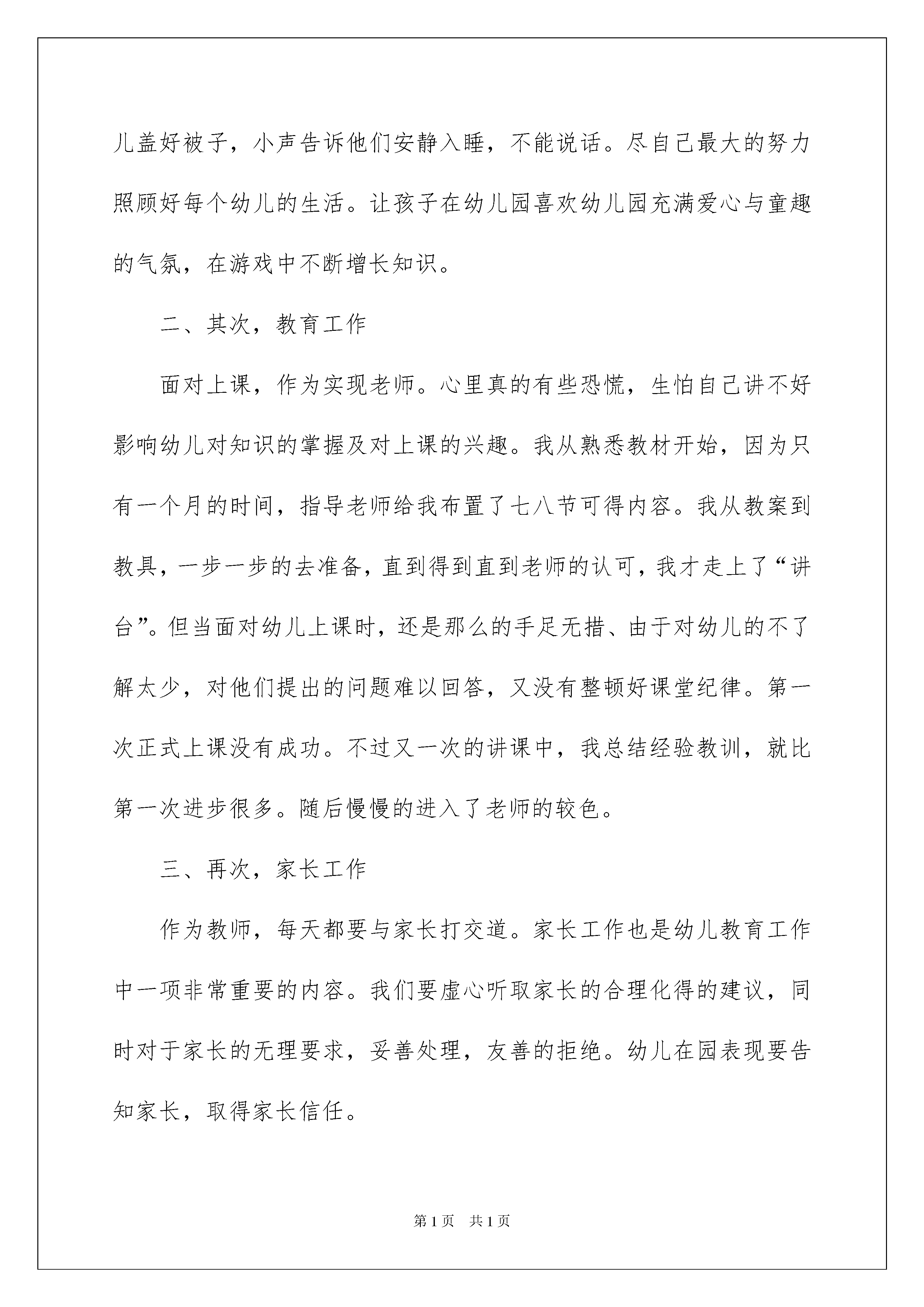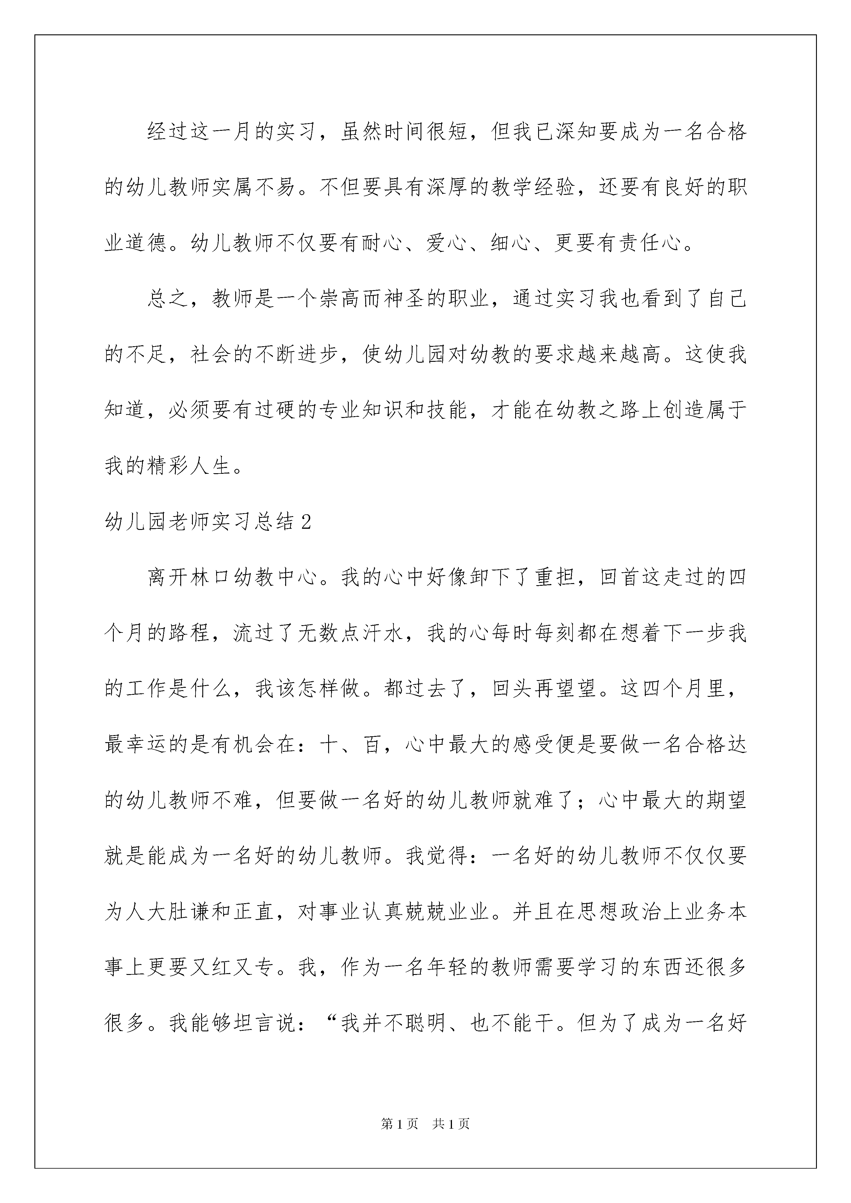2022幼儿园老师实习总结幼儿园老师实习总结总结是在某一特定时间段对学习和工作生活或其完成情况,包括取得的成绩、存在的问题及得到的经验和教训加以回顾和分析的书面材料,他能够提升我们的书面表达能力,不如我们来制定一份总结吧。那么总结要注意有什么内容呢?以下是我收集整理的幼儿园老师实习总结,欢迎大家借鉴与参考,希望对大家有所帮助。幼儿园老师实习总结1随着时间的关系,我在幼儿园的实习生活也结束了。虽然只用了20xx年一个月的时间,但却让我感受到了作为一名幼儿教师的不易,然而这次实习让我也受益颇丰。万事开头难,刚进园实习初期,让我感到了很大的困难。毫无工作经验的我,面对新工作,面对性格各异的孩子,我觉得毫无头绪。不知道到底该从哪里入手,看着指导老师轻轻松松的带着宝宝们开展各种活动,做着一个个游戏。看着孩子们一张纸兴奋,热情高涨的小脸,我深深地被感染着。我努力地去学习,尝试独立带孩子。经过几次失败的打击之后,我的紧张心理才逐渐退去。在实习过程中,让我懂得了面对不同的幼儿要用不同的方法,每个孩子都有自己独特的内心世界。而作为他们的老师,要想真正走进孩子的内心世界不用心去发现他,捕捉他们的闪光点是不行的。每个孩子都有他的可爱之处及不足之处,要想帮助他们改正缺点,不仅要关心照顾幼儿,还要与幼儿家长沟通交流。在实习期间,我学着,试着与家长打交道,与他们交流幼儿在园及在家表现。这些,都是我在幼儿园夫人实习过程中所获得的最宝贵的东西。在幼儿园的每个教师里都有幼儿一日,一周活动的生活常规时间表。在实习期间,由于幼儿园缺少配班老师,我都是在做配班老师的工作。但我严格按照时间表,配合所在班主班老师认真做好一日常规工作。一、首先,保教工作在保育工作中,使我第一次亲密接触了幼儿的方方面面。我虚心请教保育员,积极配合保育阿姨的工作。户外活动,我提醒幼儿注意安全,不追逐打闹。进餐时,帮助保育员为幼儿盛菜盛饭,提醒幼儿安静进餐,不挑食。睡觉时为年龄小还不能自理的幼儿脱衣物,给幼儿盖好被子,小声告诉他们安静入睡,不能说话。尽自己最大的努力照顾好每个幼儿的生活。让孩子在幼儿园喜欢幼儿园充满爱心与童趣的气氛,在游戏中不断增长知识。二、其次,教育工作面对上课,作为实现老师。心里真的有些恐慌,生怕自己讲不好影响幼儿对知识的掌握及对上课的兴趣。我从熟悉教材开始,因为只有一个月的时间,指导老师给我布置了七八节可得内容。我从教案到教具,一步一步的去准备,直到得到直到老师的认可,我才走上了“讲台”。但当面对幼儿上课时,还是那么的手足无措、由于对幼儿的不了解太少,对他们提出的问题难以回答,又没有整顿好课堂纪律。第一次正式上课没有成功。不过又一次的讲课中,我总结经验教训,就比第一次进步很多。随后慢慢的进入了老师的较色。三、再次,家长工作作为教师,每天都要与家长打交道。家长工作也是幼儿教育工作中一项非常重要的内容。我们要虚心听取家长的合理化得的建议,同时对于家长的无理要求,妥善处理,友善的拒绝。幼儿在园表现要告知家长,取得家长信任。经过这一月的实习,虽然时间很短,但我已深知要成为一名合格的幼儿教师实属不易。不但要具有深厚的教学经验,还要有良好的职业道德。幼儿教师不仅要有耐心、爱心、细心、更要有责任心。总之,教师是一个崇高而神圣的职业,通过实习我也看到了自己的不足,社会的不断进步,使幼儿园对幼教的要求越来越高。这使我知道,必须要有过硬的专业知识和技能,才能在幼教之路上创造属于我的精彩人生。幼儿园老师实习总结2离开林口幼教中心。我的心中好像卸下了重担,回首这走过的四个月的路程,流过了无数点汗水,我的心每时每刻都在想着下一步我的工作是什么,我该怎样做。都过去了,回头再望望。这四个月里,最幸运的是有机会在:十、百,心中最大的感受便是要做一名合格达的幼儿教师不难,但要做一名好的幼儿教师就难了;心中最大的期望就是能成为一名好的幼儿教师。我觉得:一名好的幼儿教师不仅仅要为人大肚谦和正直,对事业认真兢兢业业。并且在思想政治上业务本事上更要又红又专。我,作为一名年轻的教师需要学习的东西还很多很多。我能够坦言说:“我并不聪明、也不能干。但为了成为一名好的幼儿教师,我正在努力。”一、陶冶情操、修身养性作为一名幼儿教育工作者,要想完成教书育人的职责,首先必须具备良好的政治思想素质,树立正确的世界观和人生观。在这一年中我认真参加每次政治学习和业务学习。作为川一联合团支部书记我努力团结团员,与团员共同合作共同前进。有句成语是:只要功夫深,铁杵磨成针。是的,作为一名年青教师,我在工作中无意中会研究不周显得毛毛糙糙,不甚妥当。当意见、提议来临时,此刻的我不再不悦,