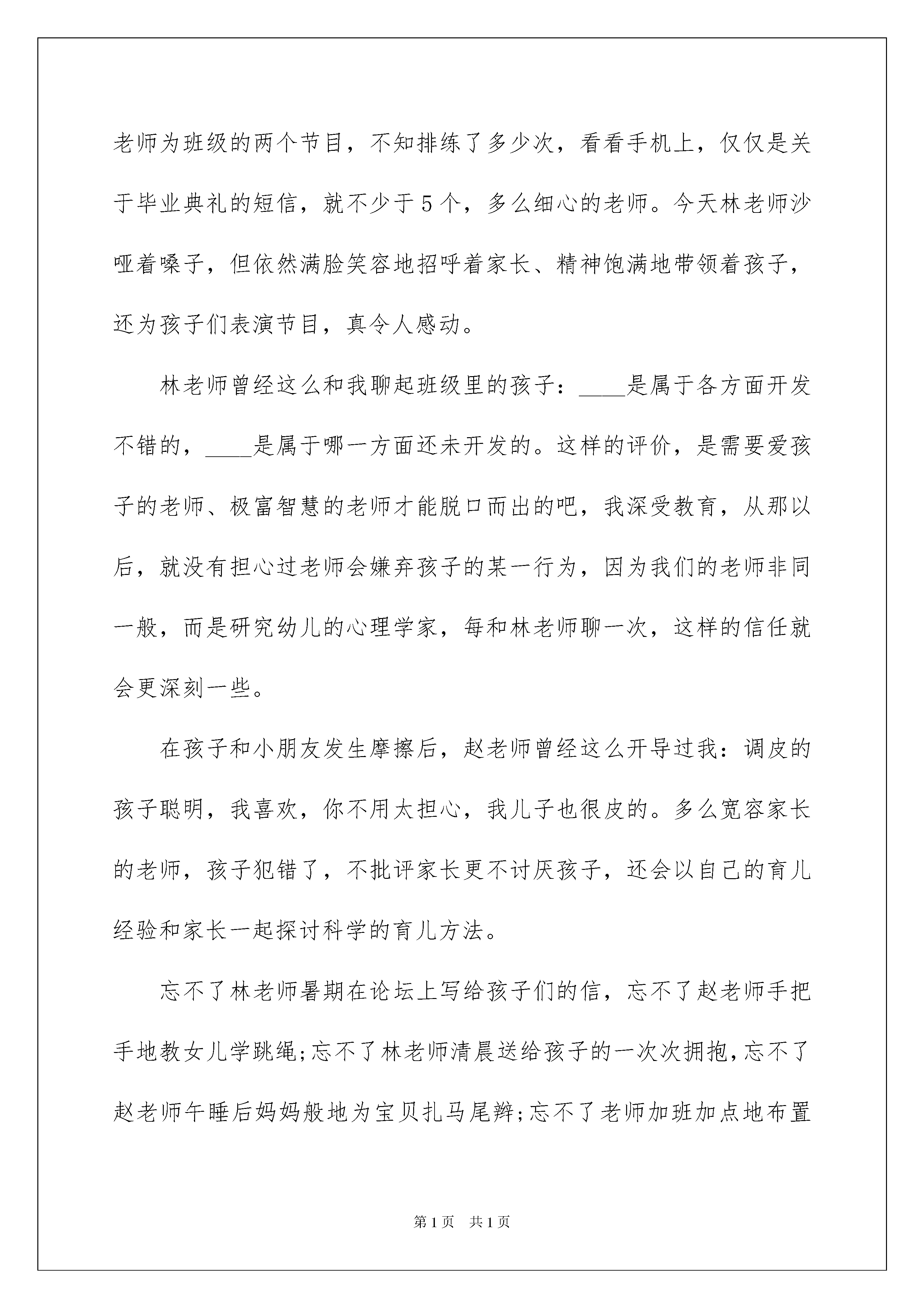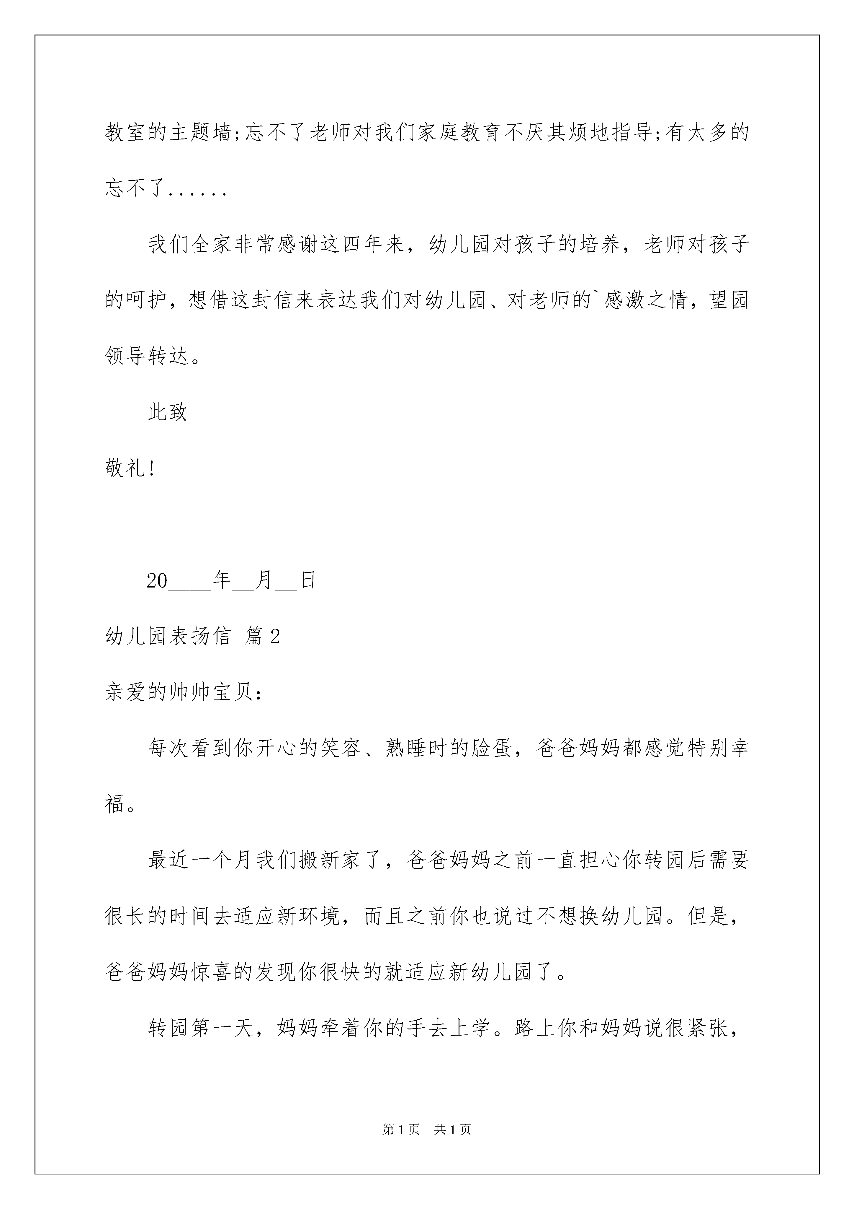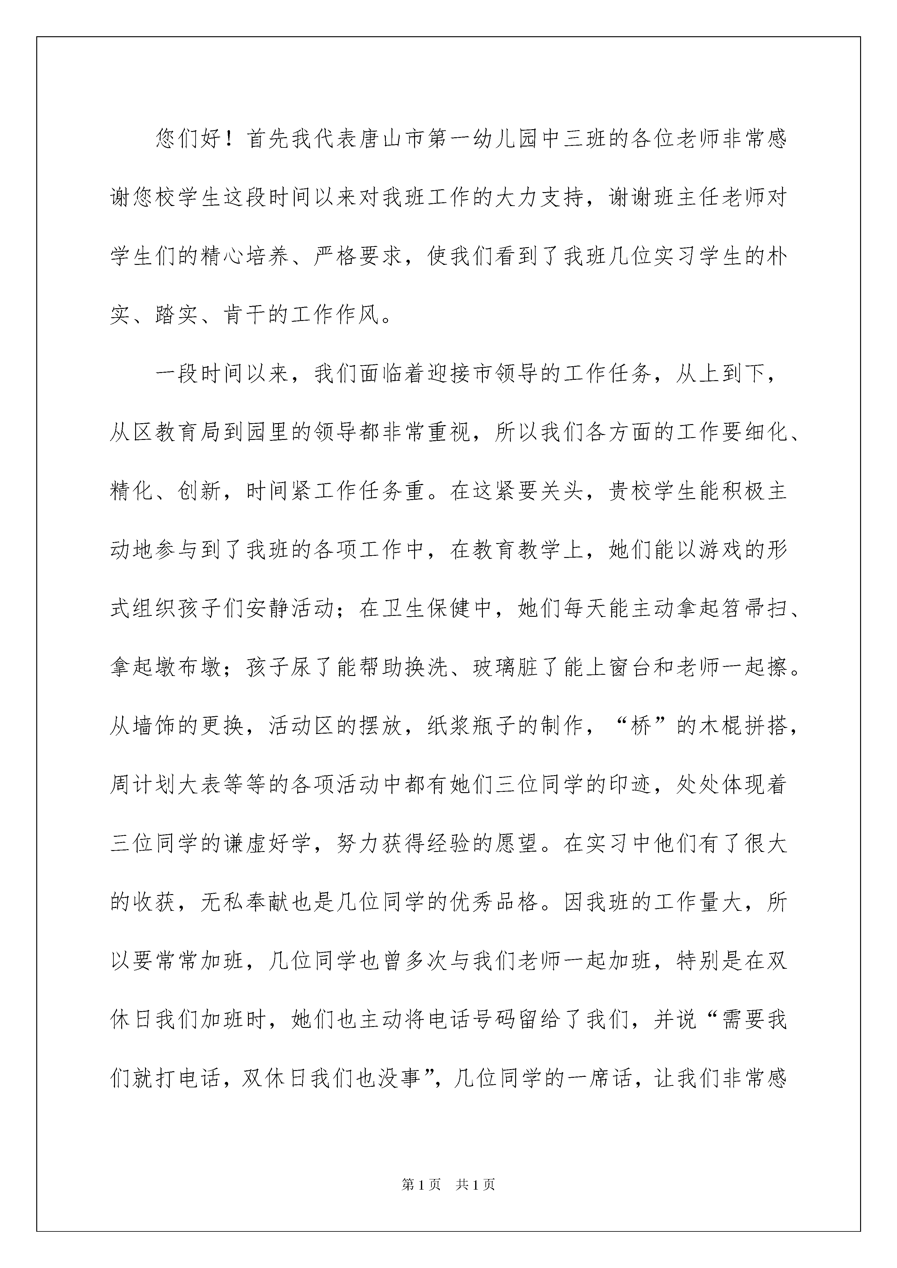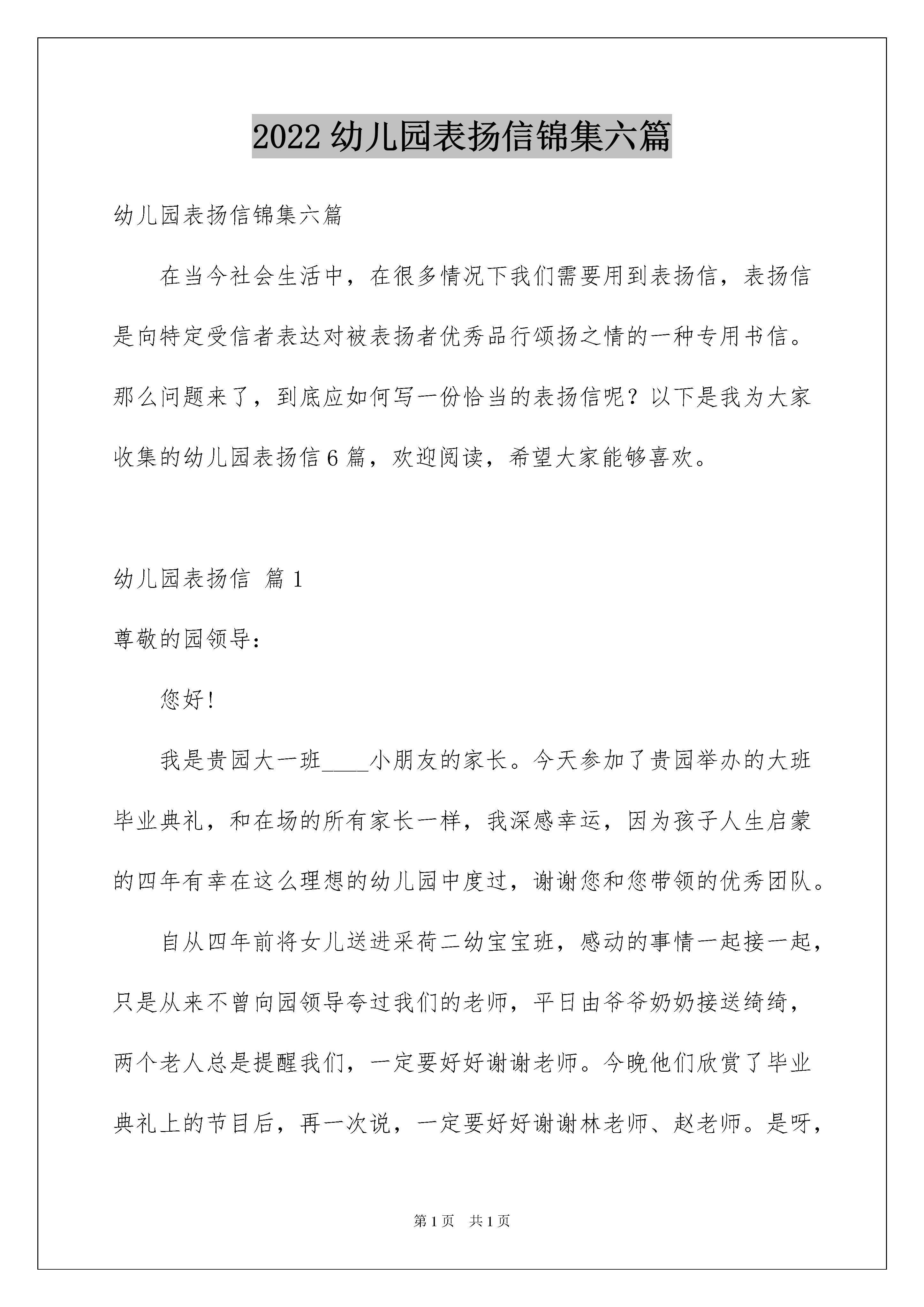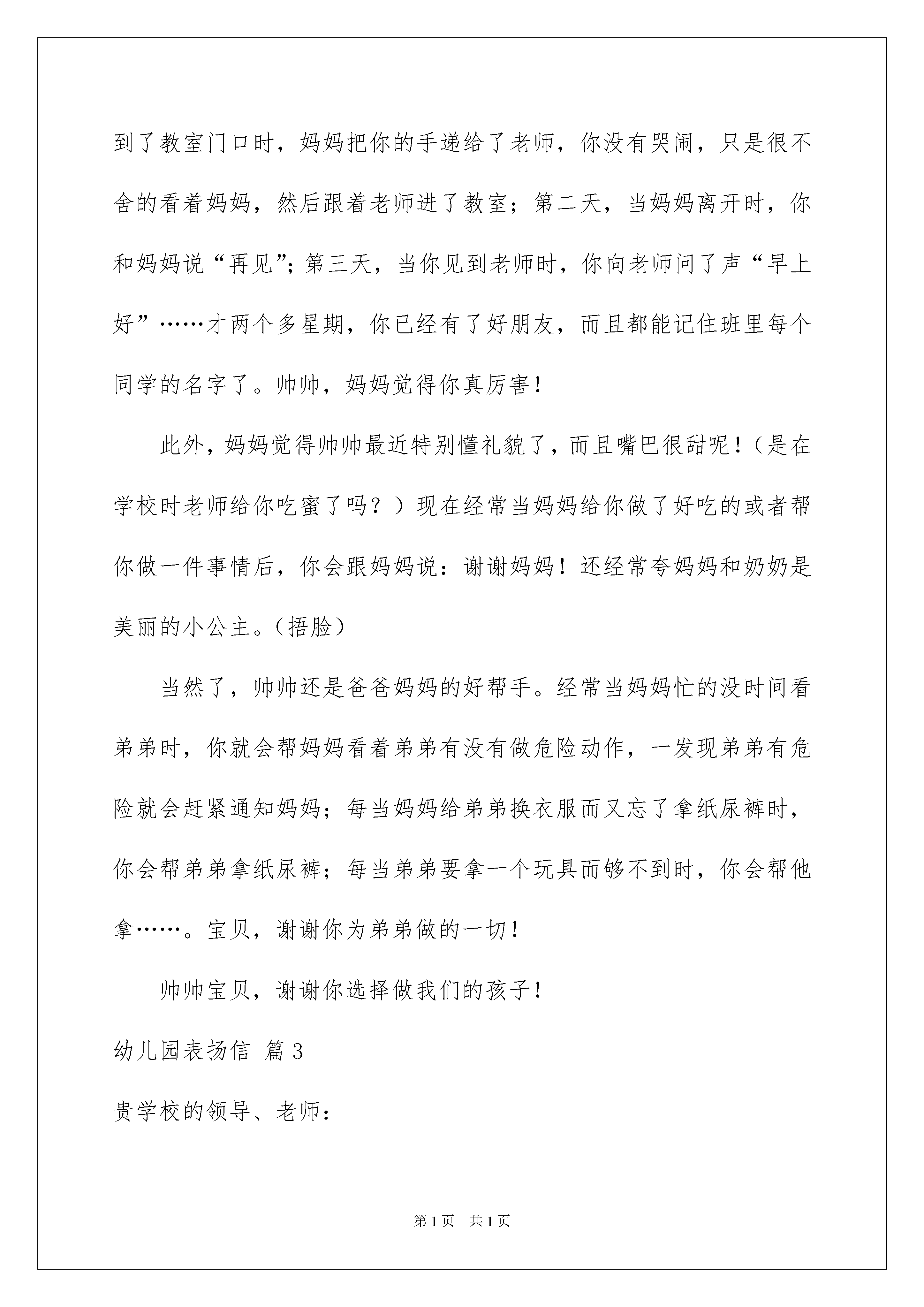 2022幼儿园表扬信锦集六篇幼儿园表扬信锦集六篇在当今社会生活中,在很多情况下我们需要用到表扬信,表扬信是向特定受信者表达对被表扬者优秀品行颂扬之情的一种专用书信。那么问题来了,到底应如何写一份恰当的表扬信呢?以下是我为大家收集的幼儿园表扬信6篇,欢迎阅读,希望大家能够喜欢。幼儿园表扬信篇1尊敬的园领导:您好!我是贵园大一班____小朋友的家长。今天参加了贵园举办的大班毕业典礼,和在场的所有家长一样,我深感幸运,因为孩子人生启蒙的四年有幸在这么理想的幼儿园中度过,谢谢您和您带领的优秀团队。自从四年前将女儿送进采荷二幼宝宝班,感动的事情一起接一起,只是从来不曾向园领导夸过我们的老师,平日由爷爷奶奶接送绮绮,两个老人总是提醒我们,一定要好好谢谢老师。今晚他们欣赏了毕业典礼上的节目后,再一次说,一定要好好谢谢林老师、赵老师。是呀,老师为班级的两个节目,不知排练了多少次,看看手机上,仅仅是关于毕业典礼的短信,就不少于5个,多么细心的老师。今天林老师沙哑着嗓子,但依然满脸笑容地招呼着家长、精神饱满地带领着孩子,还为孩子们表演节目,真令人感动。林老师曾经这么和我聊起班级里的孩子:____是属于各方面开发不错的,____是属于哪一方面还未开发的。这样的评价,是需要爱孩子的老师、极富智慧的老师才能脱口而出的吧,我深受教育,从那以后,就没有担心过老师会嫌弃孩子的某一行为,因为我们的老师非同一般,而是研究幼儿的心理学家,每和林老师聊一次,这样的信任就会更深刻一些。在孩子和小朋友发生摩擦后,赵老师曾经这么开导过我:调皮的孩子聪明,我喜欢,你不用太担心,我儿子也很皮的。多么宽容家长的老师,孩子犯错了,不批评家长更不讨厌孩子,还会以自己的育儿经验和家长一起探讨科学的育儿方法。忘不了林老师暑期在论坛上写给孩子们的信,忘不了赵老师手把手地教女儿学跳绳;忘不了林老师清晨送给孩子的一次次拥抱,忘不了赵老师午睡后妈妈般地为宝贝扎马尾辫;忘不了老师加班加点地布置教室的主题墙;忘不了老师对我们家庭教育不厌其烦地指导;有太多的忘不了......我们全家非常感谢这四年来,幼儿园对孩子的培养,老师对孩子的呵护,想借这封信来表达我们对幼儿园、对老师的`感激之情,望园领导转达。此致敬礼!_______20____年__月__日幼儿园表扬信篇2亲爱的帅帅宝贝:每次看到你开心的笑容、熟睡时的脸蛋,爸爸妈妈都感觉特别幸福。最近一个月我们搬新家了,爸爸妈妈之前一直担心你转园后需要很长的时间去适应新环境,而且之前你也说过不想换幼儿园。但是,爸爸妈妈惊喜的发现你很快的就适应新幼儿园了。转园第一天,妈妈牵着你的手去上学。路上你和妈妈说很紧张,到了教室门口时,妈妈把你的手递给了老师,你没有哭闹,只是很不舍的看着妈妈,然后跟着老师进了教室;第二天,当妈妈离开时,你和妈妈说“再见”;第三天,当你见到老师时,你向老师问了声“早上好”……才两个多星期,你已经有了好朋友,而且都能记住班里每个同学的名字了。帅帅,妈妈觉得你真厉害!此外,妈妈觉得帅帅最近特别懂礼貌了,而且嘴巴很甜呢!(是在学校时老师给你吃蜜了吗?)现在经常当妈妈给你做了好吃的或者帮你做一件事情后,你会跟妈妈说:谢谢妈妈!还经常夸妈妈和奶奶是美丽的小公主。(捂脸)当然了,帅帅还是爸爸妈妈的好帮手。经常当妈妈忙的没时间看弟弟时,你就会帮妈妈看着弟弟有没有做危险动作,一发现弟弟有危险就会赶紧通知妈妈;每当妈妈给弟弟换衣服而又忘了拿纸尿裤时,你会帮弟弟拿纸尿裤;每当弟弟要拿一个玩具而够不到时,你会帮他拿……。宝贝,谢谢你为弟弟做的一切!帅帅宝贝,谢谢你选择做我们的孩子!幼儿园表扬信篇3贵学校的领导、老师:您们好!首先我代表唐山市第一幼儿园中三班的各位老师非常感谢您校学生这段时间以来对我班工作的大力支持,谢谢班主任老师对学生们的精心培养、严格要求,使我们看到了我班几位实习学生的朴实、踏实、肯干的工作作风。一段时间以来,我们面临着迎接市领导的工作任务,从上到下,从区教育局到园里的领导都非常重视,所以我们各方面的工作要细化、精化、创新,时间紧工作任务重。在这紧要关头,贵校学生能积极主动地参与到了我班的各项工作中,在教育教学上,她们能以游戏的形式组织孩子们安静活动;在卫生保健中,她们每天能主动拿起笤帚扫、拿起墩布墩;孩子尿了能帮助换洗、玻璃脏了能上窗台和老师一起擦。从墙饰的更换,活动区的摆放,纸浆瓶子的制作,“桥”的木棍拼搭,周计划大表等等的各项活动中都有她们三位同学的印迹,处处体现着三位同学的谦虚好学,努力获得经验的愿望。在实习中他们有了很大的收获,无私奉献也是几位同学的优秀品格。因我班的工作量大