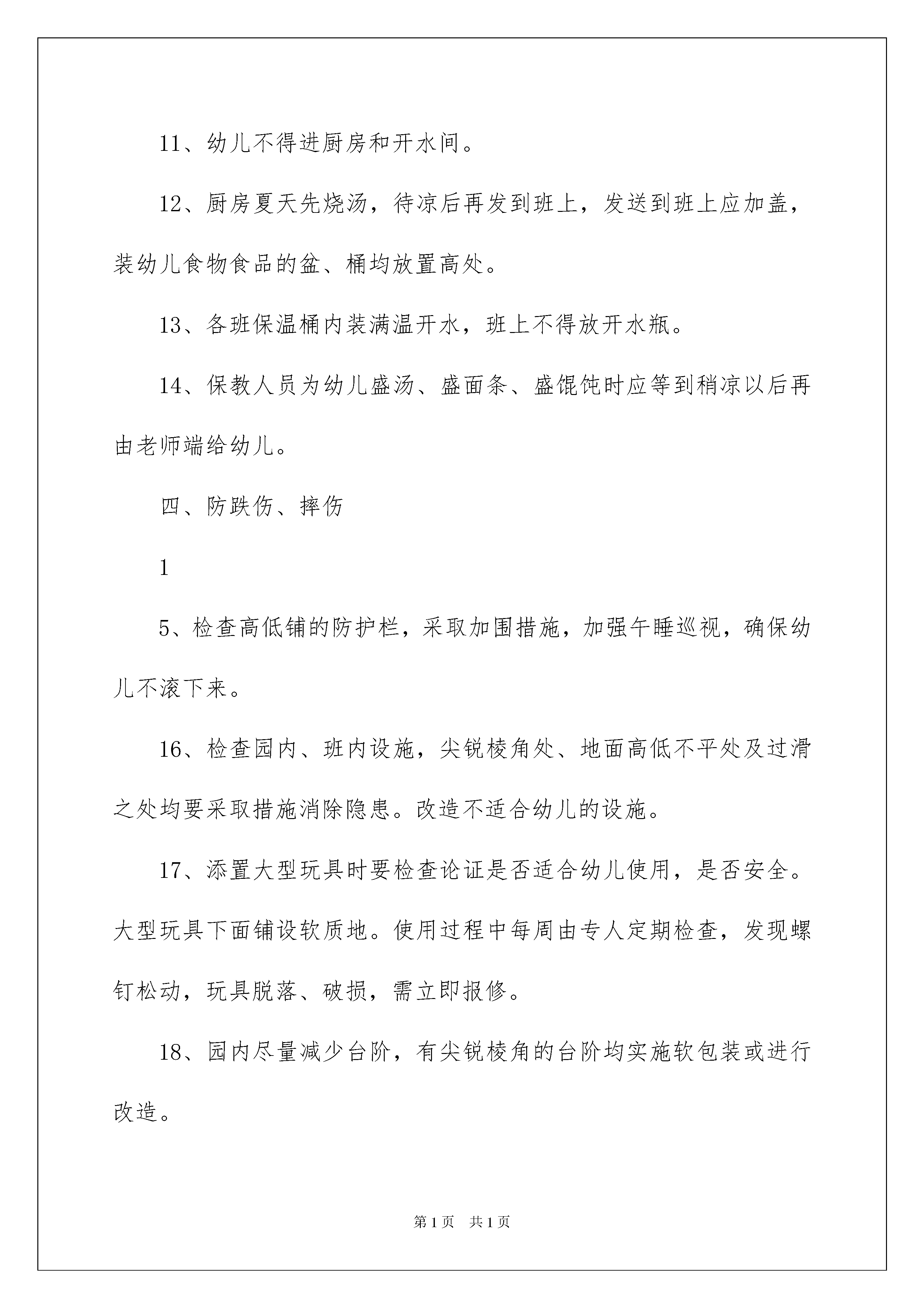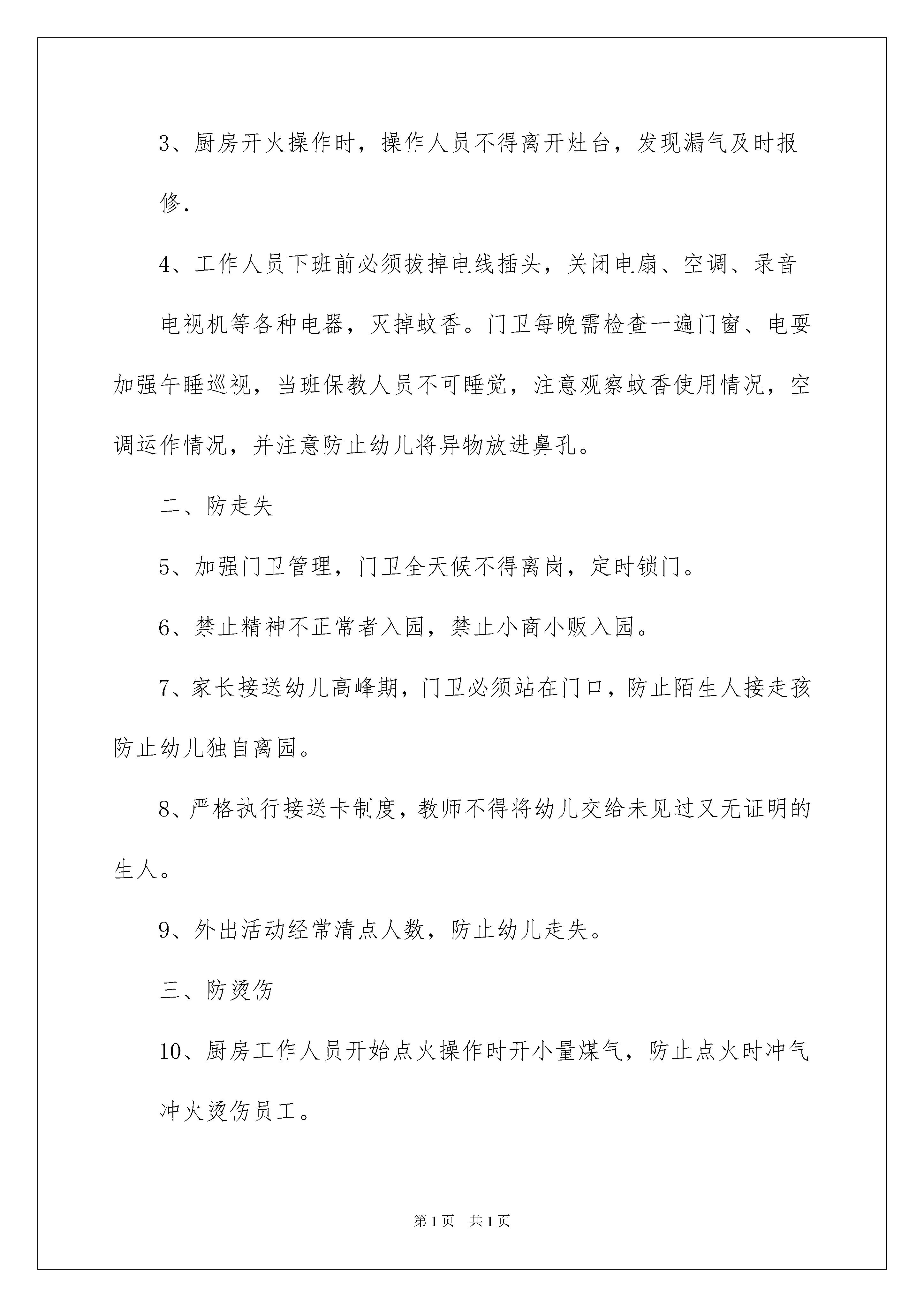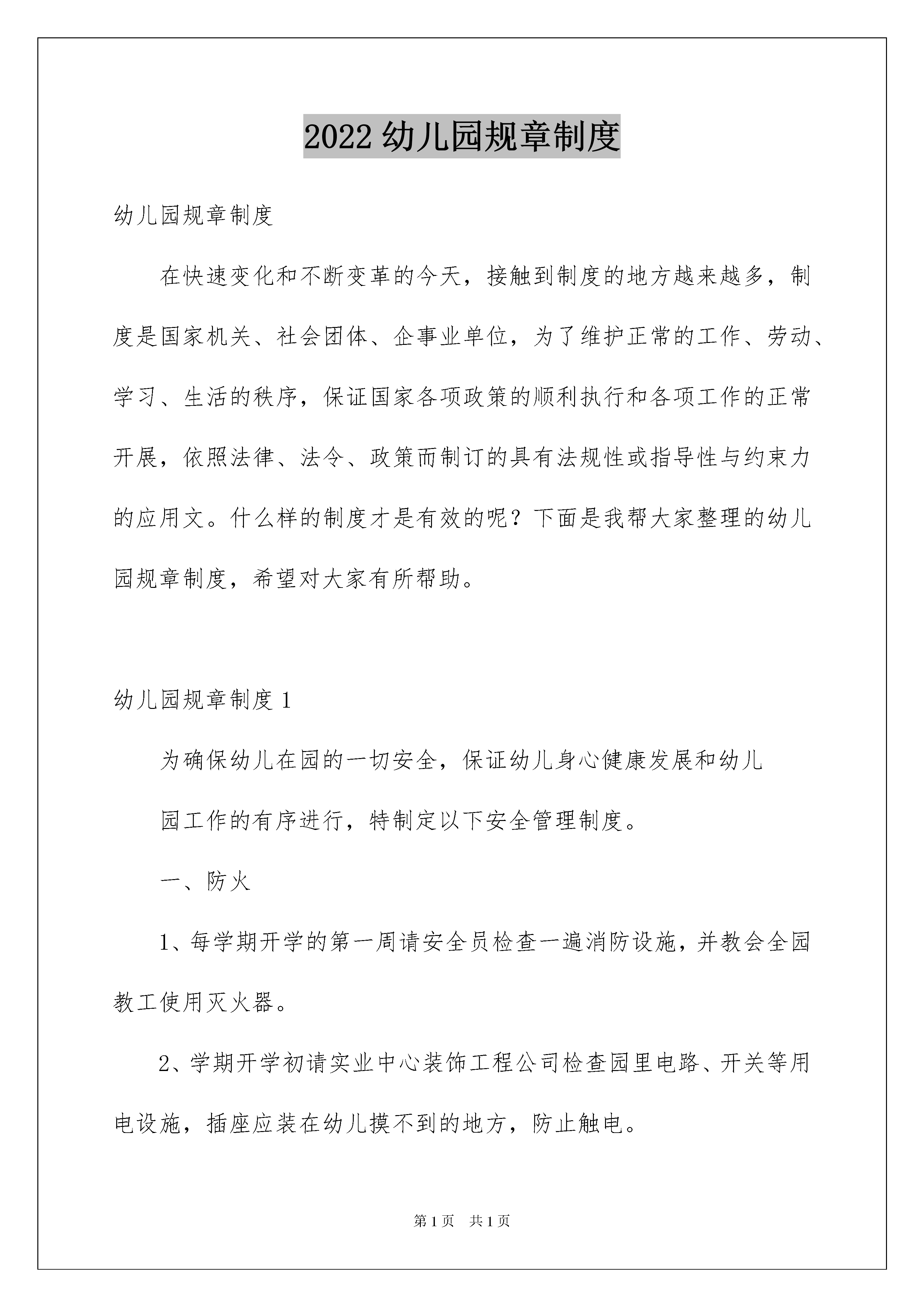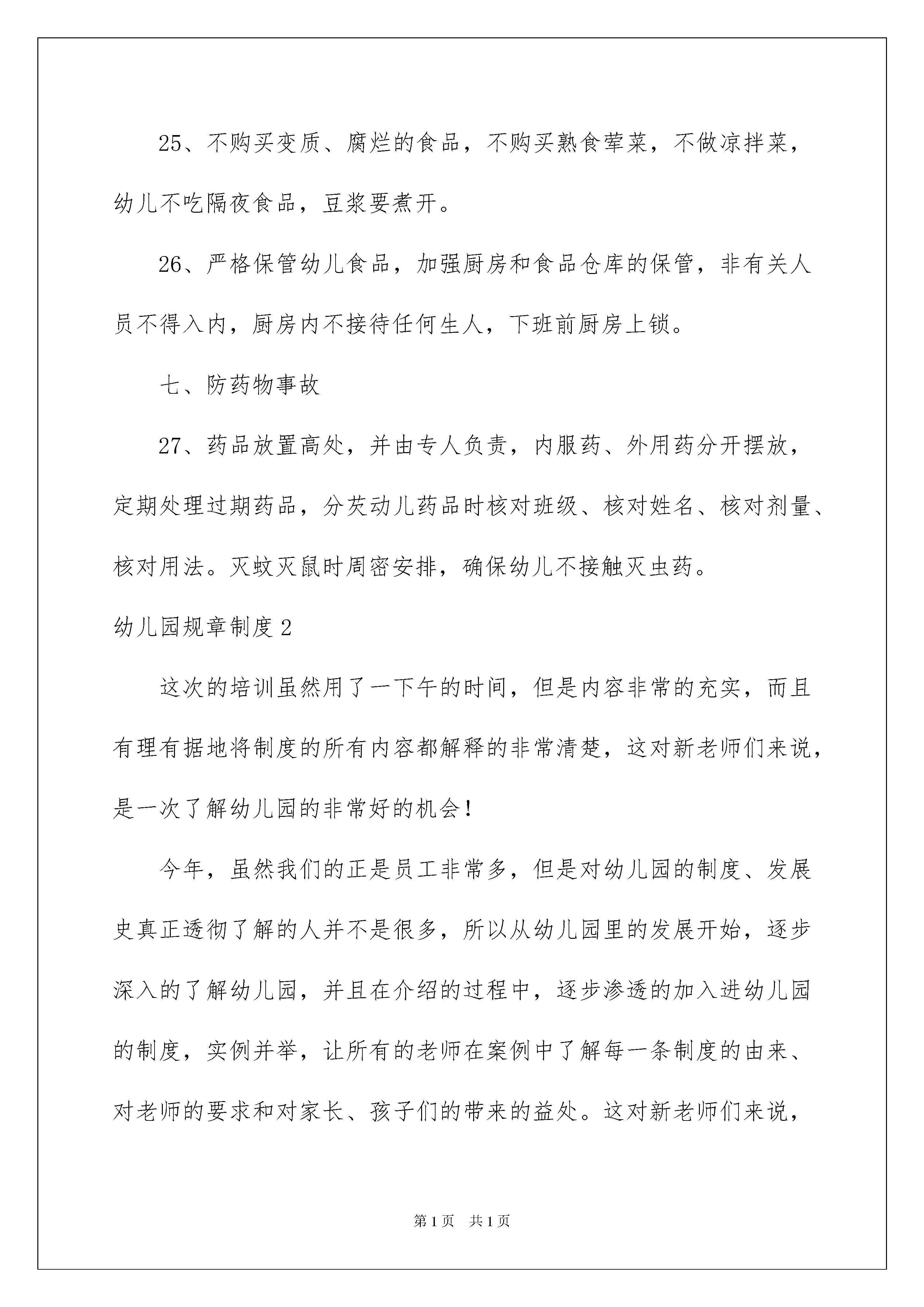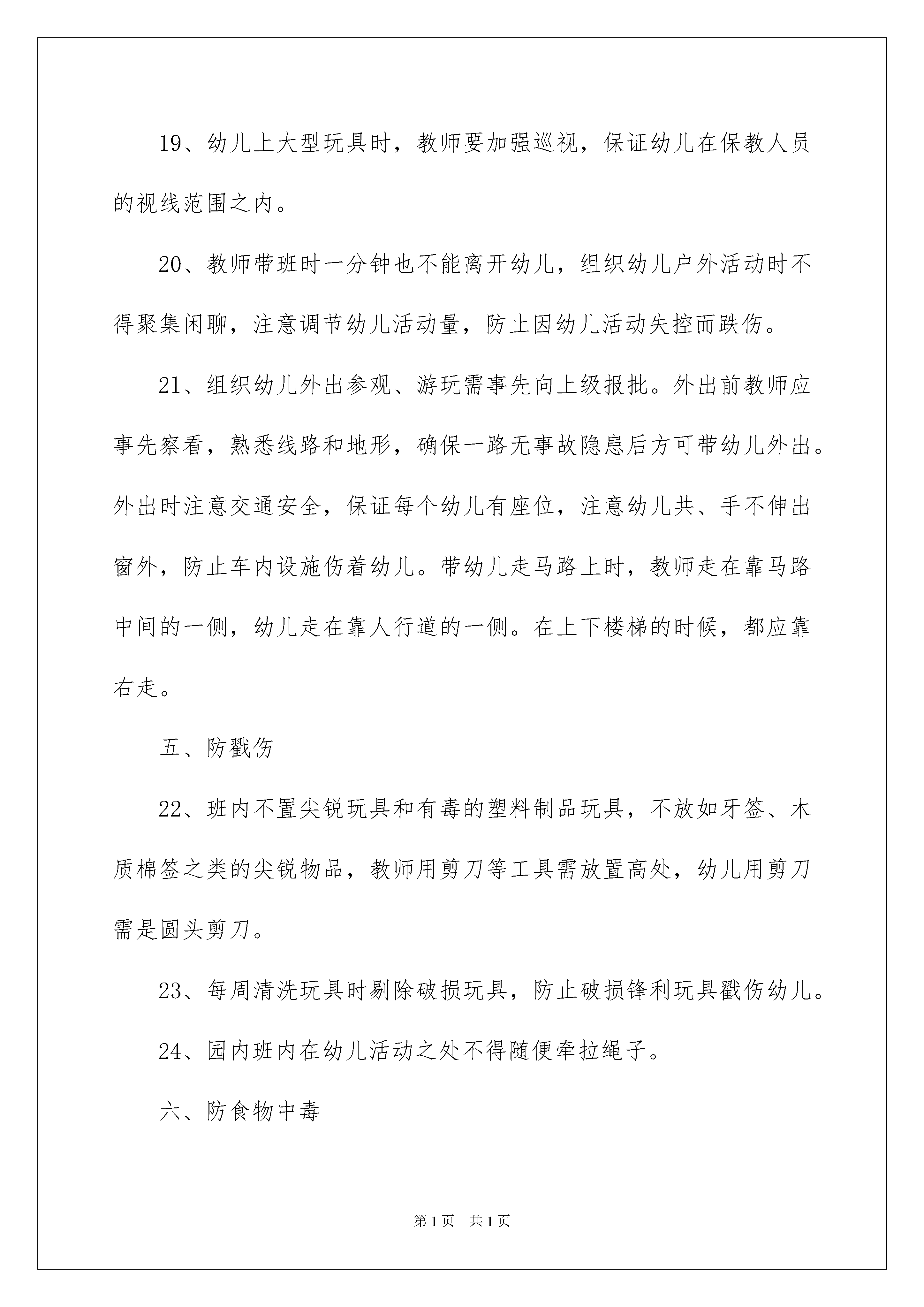 2022幼儿园规章制度幼儿园规章制度在快速变化和不断变革的今天,接触到制度的地方越来越多,制度是国家机关、社会团体、企事业单位,为了维护正常的工作、劳动、学习、生活的秩序,保证国家各项政策的顺利执行和各项工作的正常开展,依照法律、法令、政策而制订的具有法规性或指导性与约束力的应用文。什么样的制度才是有效的呢?下面是我帮大家整理的幼儿园规章制度,希望对大家有所帮助。幼儿园规章制度1为确保幼儿在园的一切安全,保证幼儿身心健康发展和幼儿园工作的有序进行,特制定以下安全管理制度。一、防火1、每学期开学的第一周请安全员检查一遍消防设施,并教会全园教工使用灭火器。2、学期开学初请实业中心装饰工程公司检查园里电路、开关等用电设施,插座应装在幼儿摸不到的地方,防止触电。3、厨房开火操作时,操作人员不得离开灶台,发现漏气及时报修.4、工作人员下班前必须拔掉电线插头,关闭电扇、空调、录音电视机等各种电器,灭掉蚊香。门卫每晚需检查一遍门窗、电耍加强午睡巡视,当班保教人员不可睡觉,注意观察蚊香使用情况,空调运作情况,并注意防止幼儿将异物放进鼻孔。二、防走失5、加强门卫管理,门卫全天候不得离岗,定时锁门。6、禁止精神不正常者入园,禁止小商小贩入园。7、家长接送幼儿高峰期,门卫必须站在门口,防止陌生人接走孩防止幼儿独自离园。8、严格执行接送卡制度,教师不得将幼儿交给未见过又无证明的生人。9、外出活动经常清点人数,防止幼儿走失。三、防烫伤10、厨房工作人员开始点火操作时开小量煤气,防止点火时冲气冲火烫伤员工。11、幼儿不得进厨房和开水间。12、厨房夏天先烧汤,待凉后再发到班上,发送到班上应加盖,装幼儿食物食品的盆、桶均放置高处。13、各班保温桶内装满温开水,班上不得放开水瓶。14、保教人员为幼儿盛汤、盛面条、盛馄饨时应等到稍凉以后再由老师端给幼儿。四、防跌伤、摔伤15、检查高低铺的防护栏,采取加围措施,加强午睡巡视,确保幼儿不滚下来。16、检查园内、班内设施,尖锐棱角处、地面高低不平处及过滑之处均要采取措施消除隐患。改造不适合幼儿的设施。17、添置大型玩具时要检查论证是否适合幼儿使用,是否安全。大型玩具下面铺设软质地。使用过程中每周由专人定期检查,发现螺钉松动,玩具脱落、破损,需立即报修。18、园内尽量减少台阶,有尖锐棱角的台阶均实施软包装或进行改造。19、幼儿上大型玩具时,教师要加强巡视,保证幼儿在保教人员的视线范围之内。20、教师带班时一分钟也不能离开幼儿,组织幼儿户外活动时不得聚集闲聊,注意调节幼儿活动量,防止因幼儿活动失控而跌伤。2l、组织幼儿外出参观、游玩需事先向上级报批。外出前教师应事先察看,熟悉线路和地形,确保一路无事故隐患后方可带幼儿外出。外出时注意交通安全,保证每个幼儿有座位,注意幼儿共、手不伸出窗外,防止车内设施伤着幼儿。带幼儿走马路上时,教师走在靠马路中间的一侧,幼儿走在靠人行道的一侧。在上下楼梯的时候,都应靠右走。五、防戳伤22、班内不置尖锐玩具和有毒的塑料制品玩具,不放如牙签、木质棉签之类的尖锐物品,教师用剪刀等工具需放置高处,幼儿用剪刀需是圆头剪刀。23、每周清洗玩具时剔除破损玩具,防止破损锋利玩具戳伤幼儿。24、园内班内在幼儿活动之处不得随便牵拉绳子。六、防食物中毒25、不购买变质、腐烂的食品,不购买熟食荤菜,不做凉拌菜,幼儿不吃隔夜食品,豆浆要煮开。26、严格保管幼儿食品,加强厨房和食品仓库的保管,非有关人员不得入内,厨房内不接待任何生人,下班前厨房上锁。七、防药物事故27、药品放置高处,并由专人负责,内服药、外用药分开摆放,定期处理过期药品,分芡动儿药品时核对班级、核对姓名、核对剂量、核对用法。灭蚊灭鼠时周密安排,确保幼儿不接触灭虫药。幼儿园规章制度2这次的培训虽然用了一下午的时间,但是内容非常的充实,而且有理有据地将制度的所有内容都解释的非常清楚,这对新老师们来说,是一次了解幼儿园的非常好的机会!今年,虽然我们的正是员工非常多,但是对幼儿园的制度、发展史真正透彻了解的人并不是很多,所以从幼儿园里的发展开始,逐步深入的了解幼儿园,并且在介绍的过程中,逐步渗透的加入进幼儿园的制度,实例并举,让所有的老师在案例中了解每一条制度的由来、对老师的要求和对家长、孩子们的带来的益处。这对新老师们来说,是一次非常好的了解幼儿园的机会,让老师们知道我们是实实在在做教育,设身处地为孩子们,贴心为家长的,让新老师们知道我们每一条制度、每一项规定都是由实践中来的。关于“泰迪”的故事,我们不是第一次了解,但是却实实在在印在了自己的脑海里,每一次阅读都会给我们带来不同的收获。我们不得不说那位老