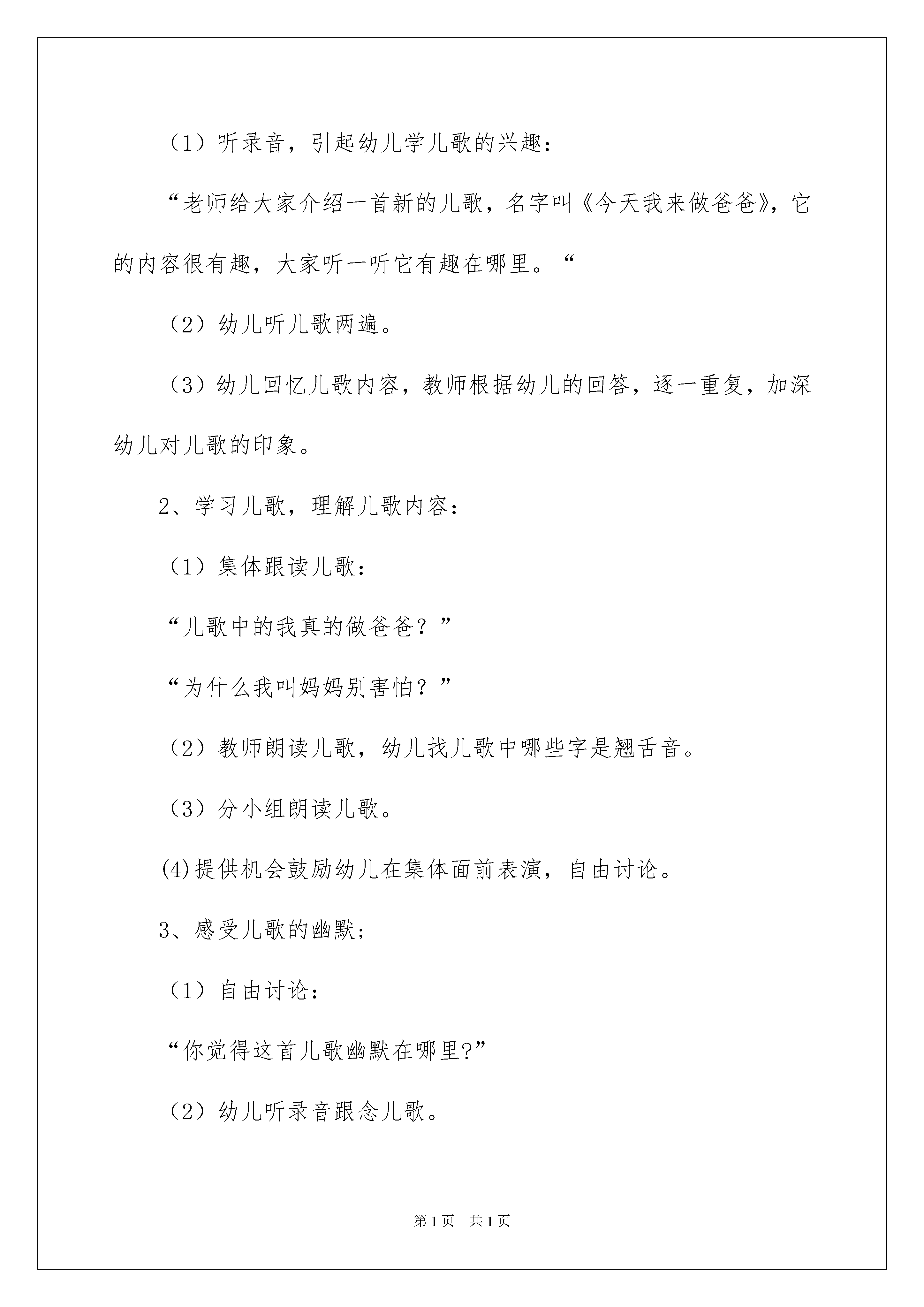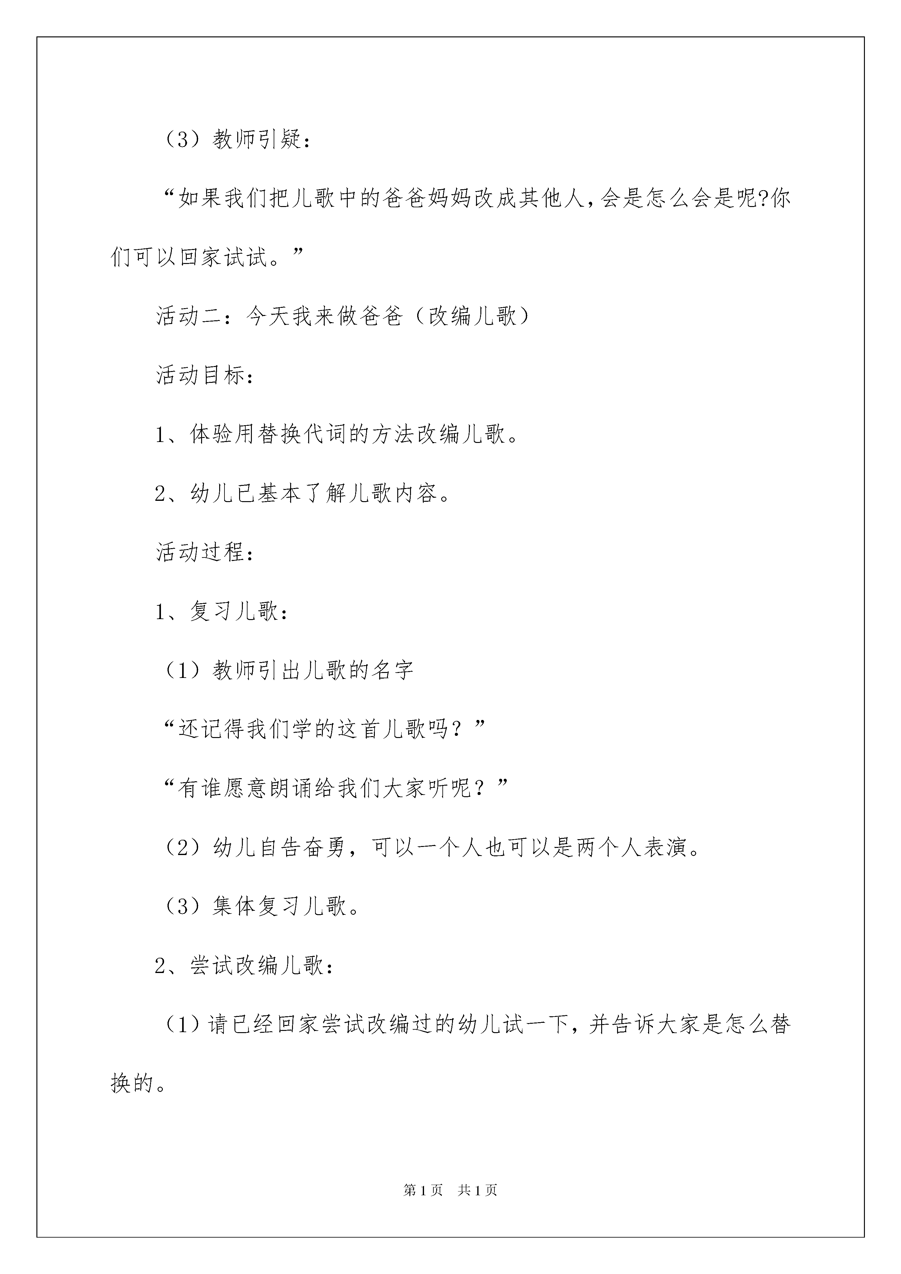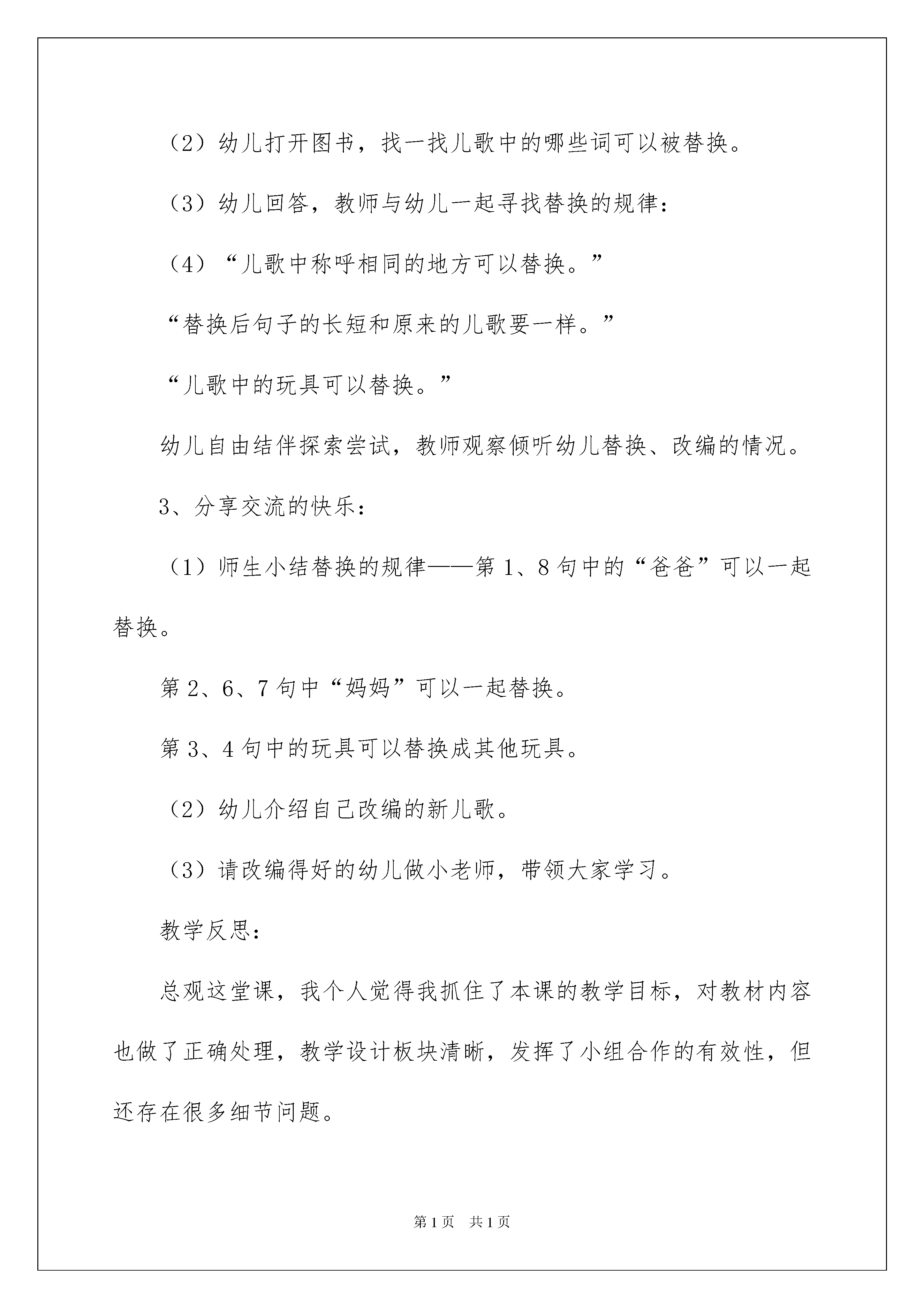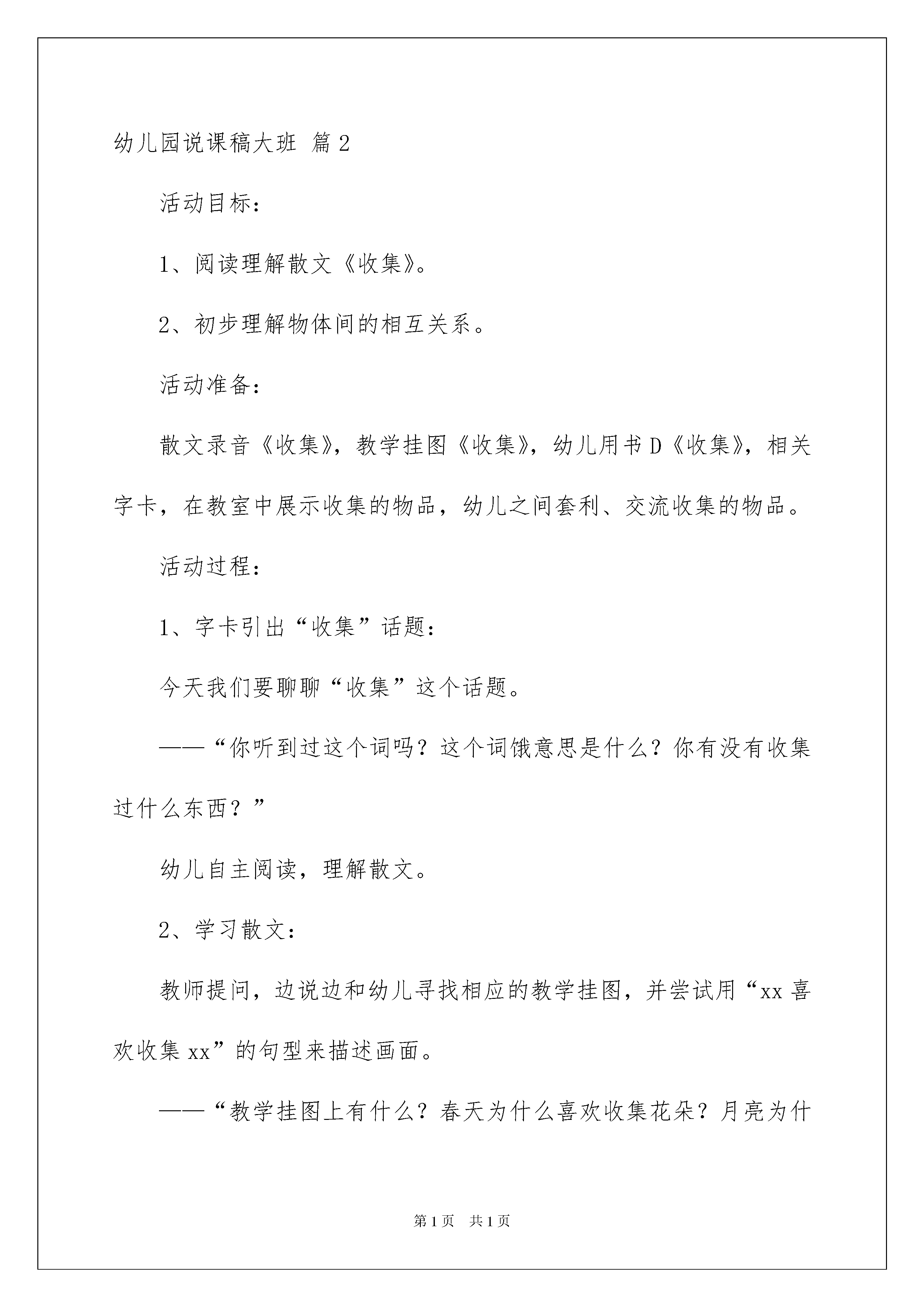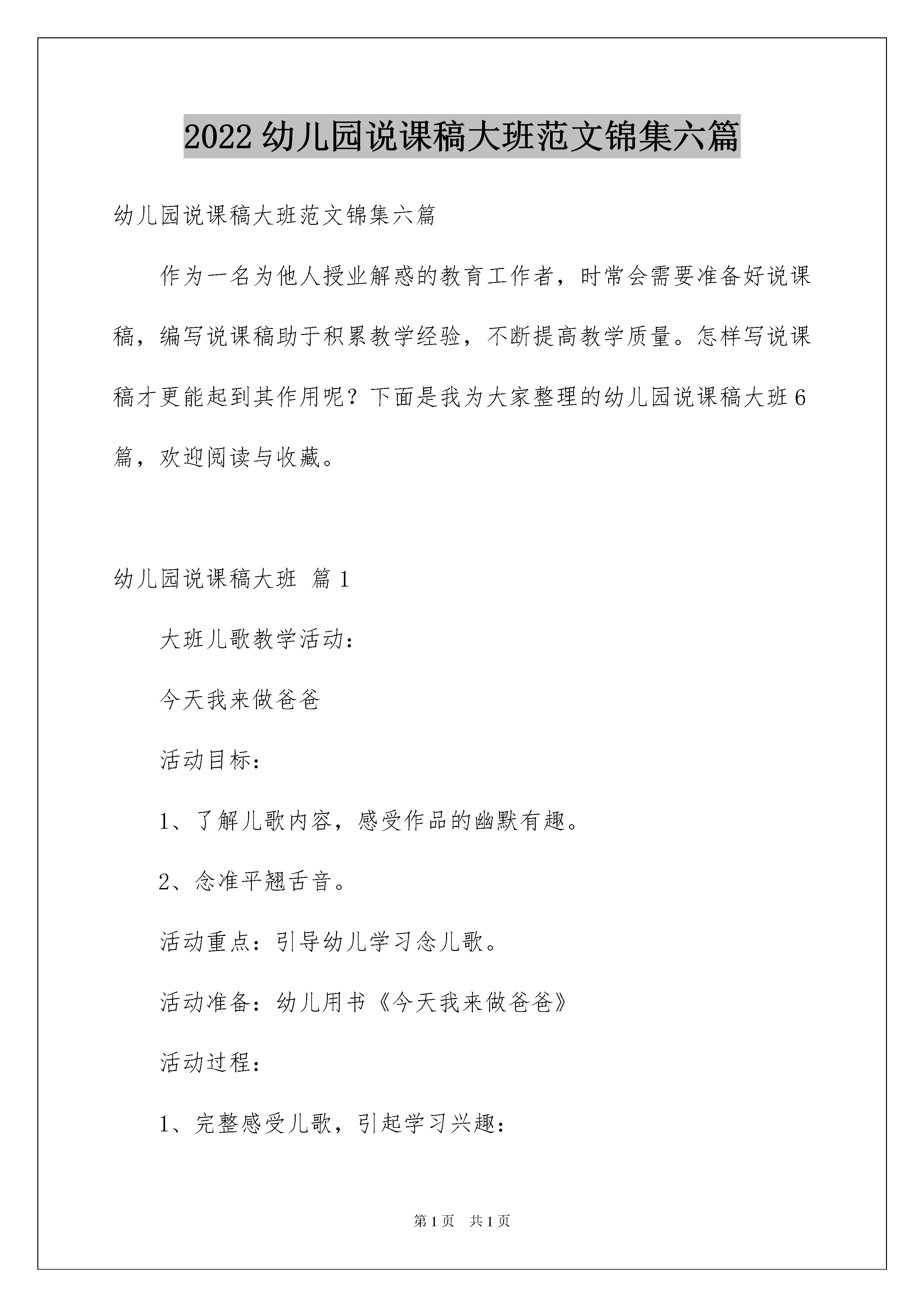 2022幼儿园说课稿大班范文锦集六篇幼儿园说课稿大班范文锦集六篇作为一名为他人授业解惑的教育工作者,时常会需要准备好说课稿,编写说课稿助于积累教学经验,不断提高教学质量。怎样写说课稿才更能起到其作用呢?下面是我为大家整理的幼儿园说课稿大班6篇,欢迎阅读与收藏。幼儿园说课稿大班篇1大班儿歌教学活动:今天我来做爸爸活动目标:1、了解儿歌内容,感受作品的幽默有趣。2、念准平翘舌音。活动重点:引导幼儿学习念儿歌。活动准备:幼儿用书《今天我来做爸爸》活动过程:1、完整感受儿歌,引起学习兴趣:(1)听录音,引起幼儿学儿歌的兴趣:“老师给大家介绍一首新的儿歌,名字叫《今天我来做爸爸》,它的内容很有趣,大家听一听它有趣在哪里。“(2)幼儿听儿歌两遍。(3)幼儿回忆儿歌内容,教师根据幼儿的回答,逐一重复,加深幼儿对儿歌的印象。2、学习儿歌,理解儿歌内容:(1)集体跟读儿歌:“儿歌中的我真的做爸爸?”“为什么我叫妈妈别害怕?”(2)教师朗读儿歌,幼儿找儿歌中哪些字是翘舌音。(3)分小组朗读儿歌。(4)提供机会鼓励幼儿在集体面前表演,自由讨论。3、感受儿歌的幽默;(1)自由讨论:“你觉得这首儿歌幽默在哪里?”(2)幼儿听录音跟念儿歌。(3)教师引疑:“如果我们把儿歌中的爸爸妈妈改成其他人,会是怎么会是呢?你们可以回家试试。”活动二:今天我来做爸爸(改编儿歌)活动目标:1、体验用替换代词的方法改编儿歌。2、幼儿已基本了解儿歌内容。活动过程:1、复习儿歌:(1)教师引出儿歌的名字“还记得我们学的这首儿歌吗?”“有谁愿意朗诵给我们大家听呢?”(2)幼儿自告奋勇,可以一个人也可以是两个人表演。(3)集体复习儿歌。2、尝试改编儿歌:(1)请已经回家尝试改编过的幼儿试一下,并告诉大家是怎么替换的。(2)幼儿打开图书,找一找儿歌中的哪些词可以被替换。(3)幼儿回答,教师与幼儿一起寻找替换的规律:(4)“儿歌中称呼相同的地方可以替换。”“替换后句子的长短和原来的儿歌要一样。”“儿歌中的玩具可以替换。”幼儿自由结伴探索尝试,教师观察倾听幼儿替换、改编的情况。3、分享交流的快乐:(1)师生小结替换的规律——第1、8句中的“爸爸”可以一起替换。第2、6、7句中“妈妈”可以一起替换。第3、4句中的玩具可以替换成其他玩具。(2)幼儿介绍自己改编的新儿歌。(3)请改编得好的幼儿做小老师,带领大家学习。教学反思:总观这堂课,我个人觉得我抓住了本课的教学目标,对教材内容也做了正确处理,教学设计板块清晰,发挥了小组合作的有效性,但还存在很多细节问题。幼儿园说课稿大班篇2活动目标:1、阅读理解散文《收集》。2、初步理解物体间的相互关系。活动准备:散文录音《收集》,教学挂图《收集》,幼儿用书D《收集》,相关字卡,在教室中展示收集的物品,幼儿之间套利、交流收集的物品。活动过程:1、字卡引出“收集”话题:今天我们要聊聊“收集”这个话题。——“你听到过这个词吗?这个词饿意思是什么?你有没有收集过什么东西?”幼儿自主阅读,理解散文。2、学习散文:教师提问,边说边和幼儿寻找相应的教学挂图,并尝试用“xx喜欢收集xx”的句型来描述画面。——“教学挂图上有什么?春天为什么喜欢收集花朵?月亮为什么喜欢收集星星?”——“海滩为什么喜欢收集贝壳?天空为什么喜欢收集白云?”——“小溪为什么喜欢收集倒影?太阳为什么喜欢收集水蒸气?”教师朗读散文(或播放散文录音),幼儿学习散文。采用不同的方法学习:教师领读、幼儿跟读,摘句读,分小组读等。3、拓展学习:教师设问。——“下朋友,你们又爱收集什么呢?”幼儿之间相互交流。幼儿园说课稿大班篇3一、说活动大家好,我上的这次活动是大班音乐活动《狐狸和小鸟》,其实它也可以说是一次音乐欣赏活动,因为整个活动过程都是引导幼儿在倾听的基础上进行游戏。那我为什么要选择这个题材呢?主要是考虑到本班幼儿音乐学习的水平。首先这首乐曲《狐狸和小鸟》运用了4中乐器(鼓、笛子、口哨、钢琴)老演奏,这样可以加强幼儿对乐器音色的认识和辨别;其次,考虑到我班幼儿欣赏的能力较差,而这首曲子轻松活泼,节奏鲜明,每个乐句特点突出,句与句之间变化丰富,能够更吸引幼儿,便于幼儿理解音乐内容。因此本活动理念是运用形象生动的音乐图谱,通过师幼互动,贯穿游戏情境,以鼓励、赏识的方法来调动幼儿积极性、主动性和创造性,使幼儿愉快地投入道整个活动中。二、说目标幼儿学习音乐的目的使培养他们的审美感受,体验音乐带来的快乐。正如《纲要》所说,应支持幼儿富有个性和创造性的表达。因此我定目标为:1、通过倾听,引导幼儿感受乐曲活泼欢快的情绪和乐曲的情节变化。2、大胆表现和创编乐曲