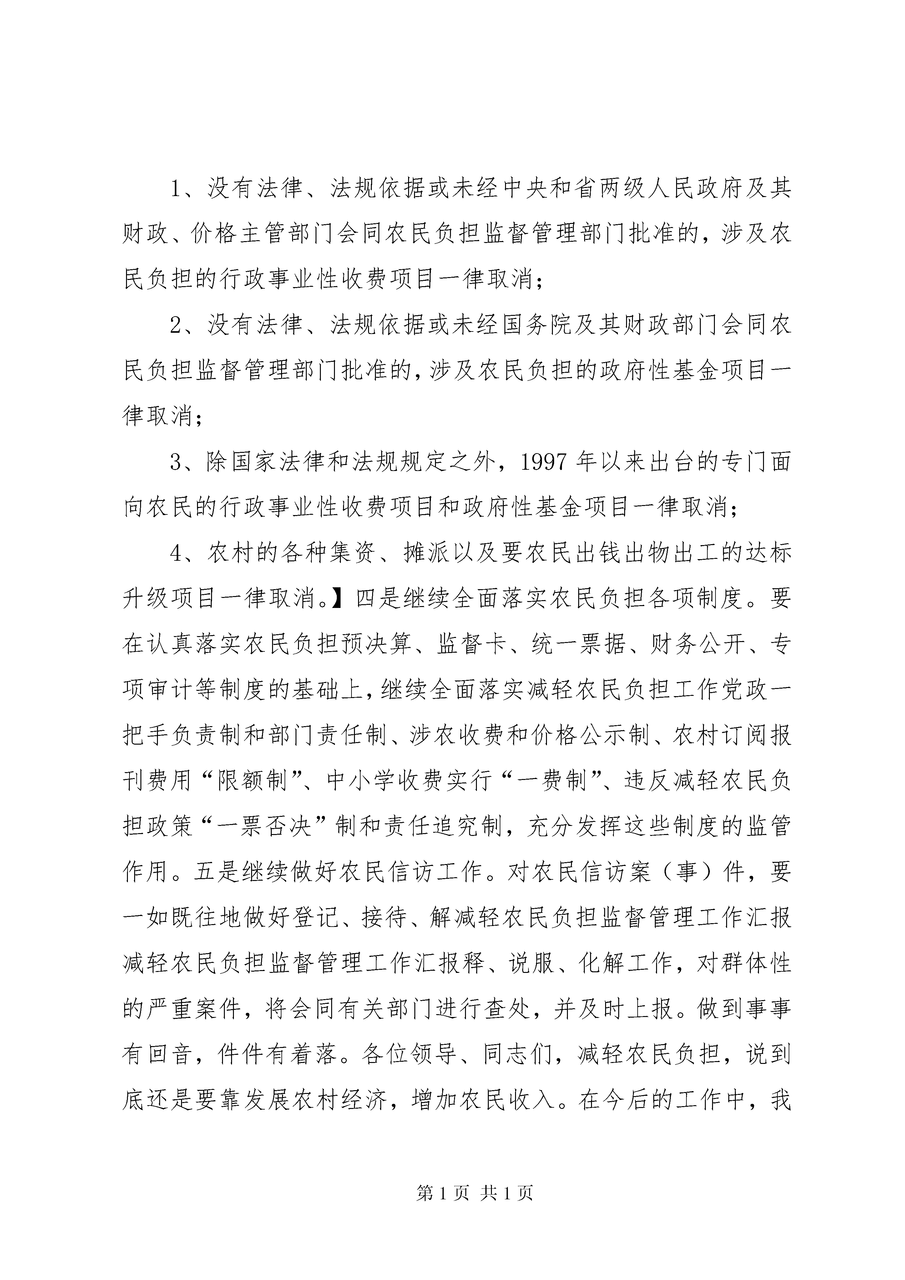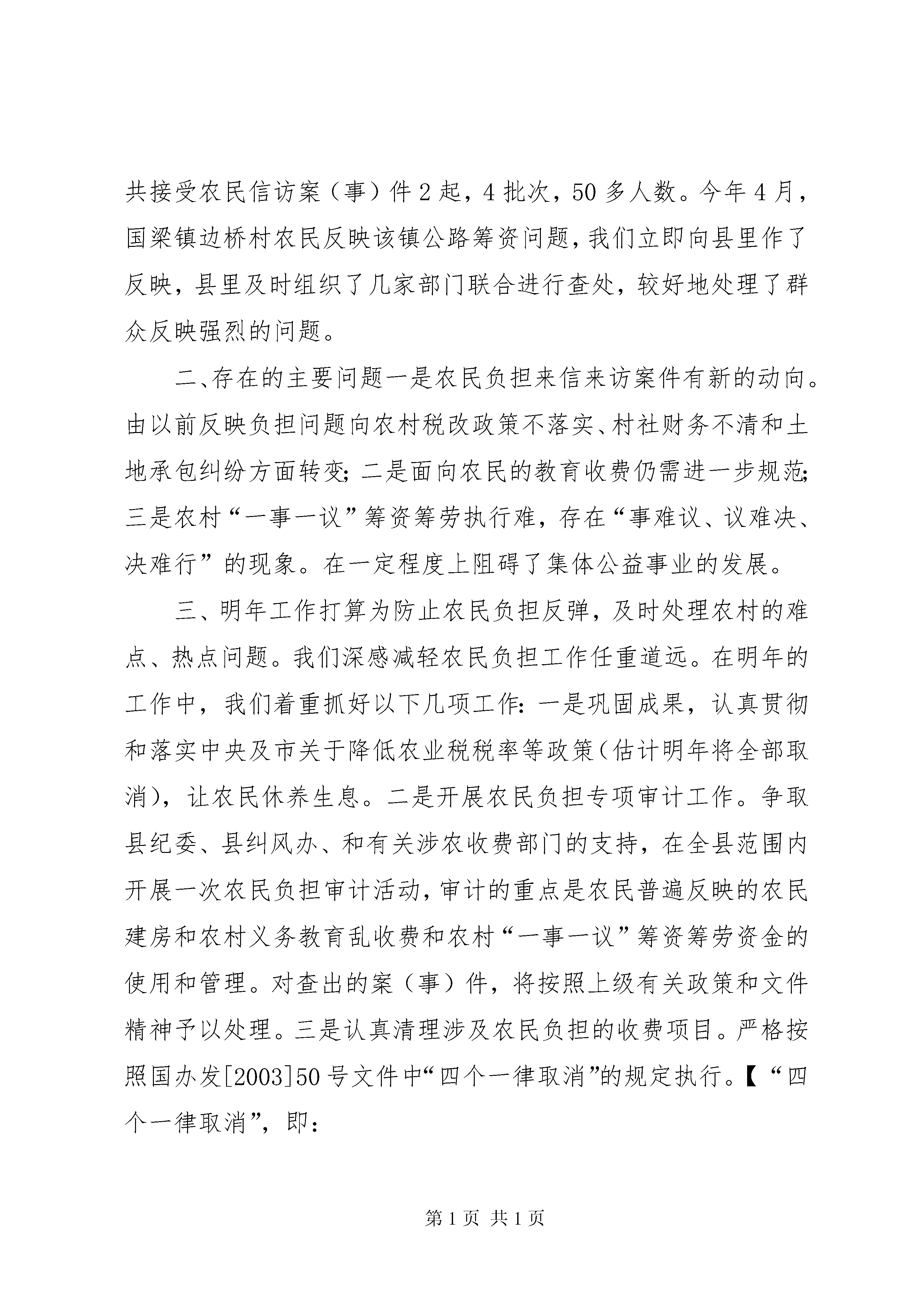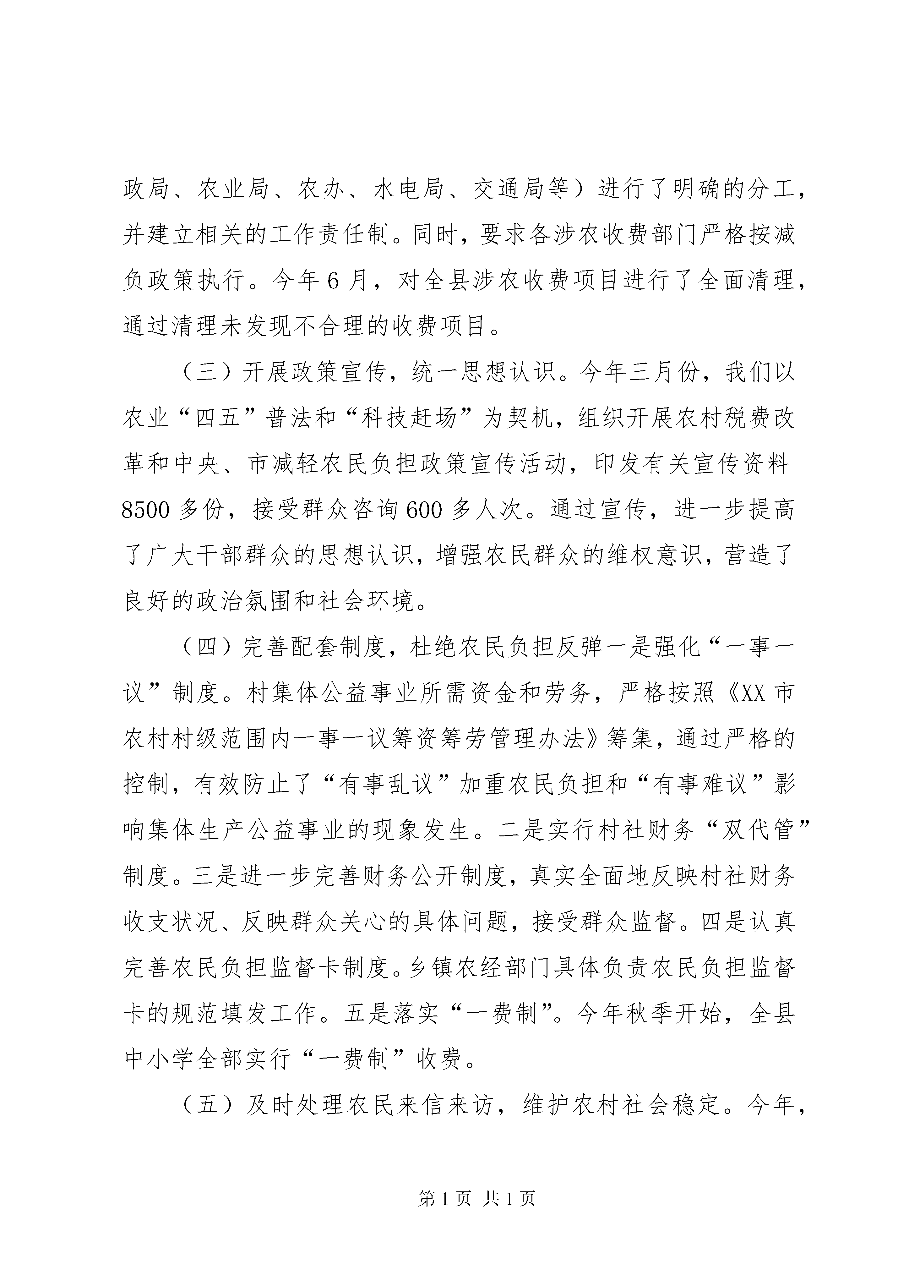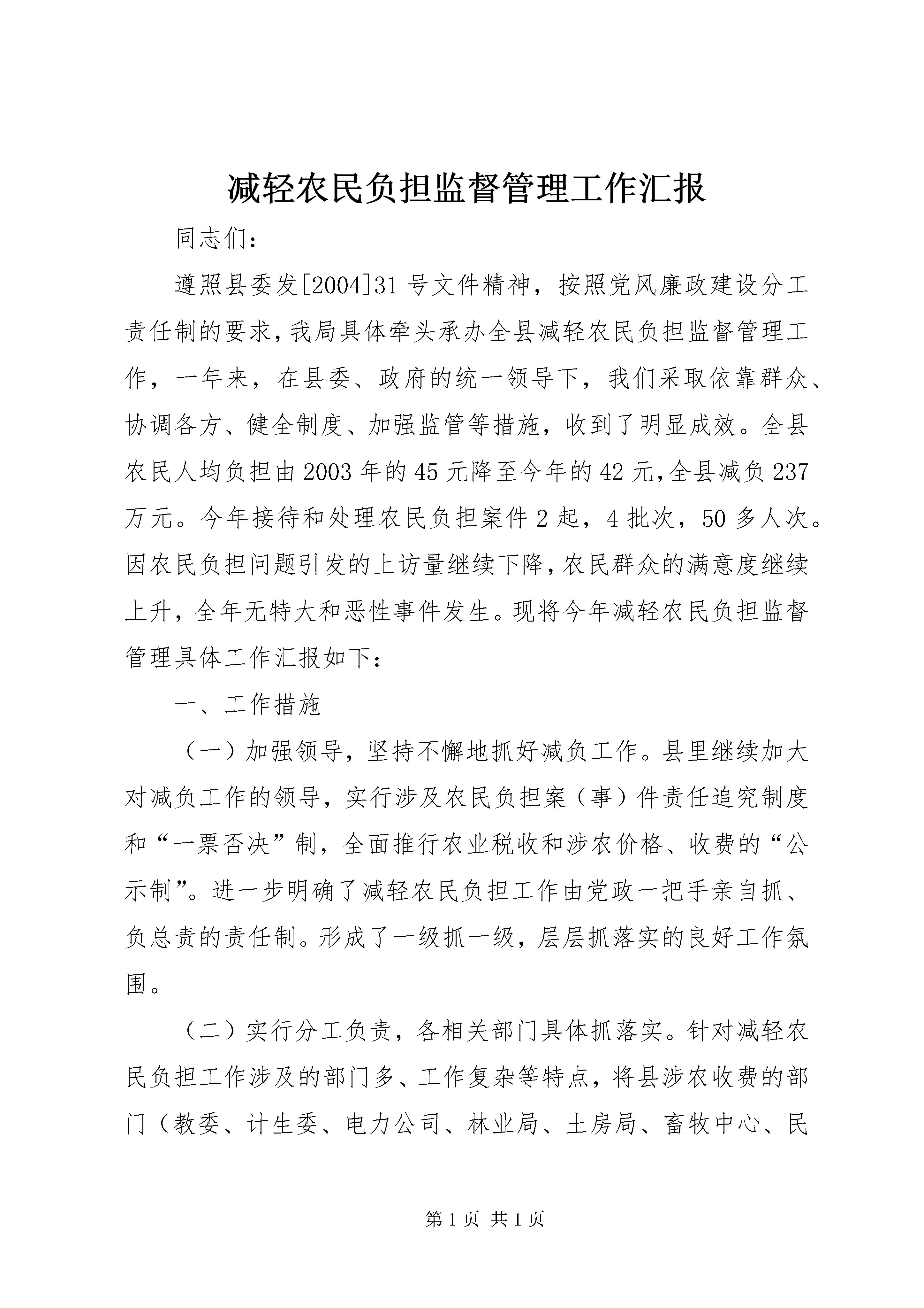 减轻农民负担监督管理工作汇报同志们:遵照县委发[2004]31号文件精神,按照党风廉政建设分工责任制的要求,我局具体牵头承办全县减轻农民负担监督管理工作,一年来,在县委、政府的统一领导下,我们采取依靠群众、协调各方、健全制度、加强监管等措施,收到了明显成效。全县农民人均负担由2003年的45元降至今年的42元,全县减负237万元。今年接待和处理农民负担案件2起,4批次,50多人次。因农民负担问题引发的上访量继续下降,农民群众的满意度继续上升,全年无特大和恶性事件发生。现将今年减轻农民负担监督管理具体工作汇报如下:一、工作措施(一)加强领导,坚持不懈地抓好减负工作。县里继续加大对减负工作的领导,实行涉及农民负担案(事)件责任追究制度和“一票否决”制,全面推行农业税收和涉农价格、收费的“公示制”。进一步明确了减轻农民负担工作由党政一把手亲自抓、负总责的责任制。形成了一级抓一级,层层抓落实的良好工作氛围。(二)实行分工负责,各相关部门具体抓落实。针对减轻农民负担工作涉及的部门多、工作复杂等特点,将县涉农收费的部门(教委、计生委、电力公司、林业局、土房局、畜牧中心、民政局、农业局、农办、水电局、交通局等)进行了明确的分工,并建立相关的工作责任制。同时,要求各涉农收费部门严格按减负政策执行。今年6月,对全县涉农收费项目进行了全面清理,通过清理未发现不合理的收费项目。(三)开展政策宣传,统一思想认识。今年三月份,我们以农业“四五”普法和“科技赶场”为契机,组织开展农村税费改革和中央、市减轻农民负担政策宣传活动,印发有关宣传资料8500多份,接受群众咨询600多人次。通过宣传,进一步提高了广大干部群众的思想认识,增强农民群众的维权意识,营造了良好的政治氛围和社会环境。(四)完善配套制度,杜绝农民负担反弹一是强化“一事一议”制度。村集体公益事业所需资金和劳务,严格按照《XX市农村村级范围内一事一议筹资筹劳管理办法》筹集,通过严格的控制,有效防止了“有事乱议”加重农民负担和“有事难议”影响集体生产公益事业的现象发生。二是实行村社财务“双代管”制度。三是进一步完善财务公开制度,真实全面地反映村社财务收支状况、反映群众关心的具体问题,接受群众监督。四是认真完善农民负担监督卡制度。乡镇农经部门具体负责农民负担监督卡的规范填发工作。五是落实“一费制”。今年秋季开始,全县中小学全部实行“一费制”收费。(五)及时处理农民来信来访,维护农村社会稳定。今年,共接受农民信访案(事)件2起,4批次,50多人数。今年4月,国梁镇边桥村农民反映该镇公路筹资问题,我们立即向县里作了反映,县里及时组织了几家部门联合进行查处,较好地处理了群众反映强烈的问题。二、存在的主要问题一是农民负担来信来访案件有新的动向。由以前反映负担问题向农村税改政策不落实、村社财务不清和土地承包纠纷方面转变;二是面向农民的教育收费仍需进一步规范;三是农村“一事一议”筹资筹劳执行难,存在“事难议、议难决、决难行”的现象。在一定程度上阻碍了集体公益事业的发展。三、明年工作打算为防止农民负担反弹,及时处理农村的难点、热点问题。我们深感减轻农民负担工作任重道远。在明年的工作中,我们着重抓好以下几项工作:一是巩固成果,认真贯彻和落实中央及市关于降低农业税税率等政策(估计明年将全部取消),让农民休养生息。二是开展农民负担专项审计工作。争取县纪委、县纠风办、和有关涉农收费部门的支持,在全县范围内开展一次农民负担审计活动,审计的重点是农民普遍反映的农民建房和农村义务教育乱收费和农村“一事一议”筹资筹劳资金的使用和管理。对查出的案(事)件,将按照上级有关政策和文件精神予以处理。三是认真清理涉及农民负担的收费项目。严格按照国办发[2003]50号文件中“四个一律取消”的规定执行。【“四个一律取消”,即:1、没有法律、法规依据或未经中央和省两级人民政府及其财政、价格主管部门会同农民负担监督管理部门批准的,涉及农民负担的行政事业性收费项目一律取消;2、没有法律、法规依据或未经国务院及其财政部门会同农民负担监督管理部门批准的,涉及农民负担的政府性基金项目一律取消;3、除国家法律和法规规定之外,1997年以来出台的专门面向农民的行政事业性收费项目和政府性基金项目一律取消;4、农村的各种集资、摊派以及要农民出钱出物出工的达标升级项目一律取消。】四是继续全面落实农民负担各项制度。要在认真落实农民负担预决算、监督卡、统一票据、财务公开、专项审计等制度的基础上,继续全面落实减轻农民负担工作党政一把手负责制和部门责任制、涉农收费和价格公示制、农村订阅报刊费用“限额制”、中小学收费实行“一费制”、违反减轻农民负担政策“一票否决”制和责任追究制,充分发挥这些制度的监管作用。五是继续做好农民信访工作。对农民信访案(