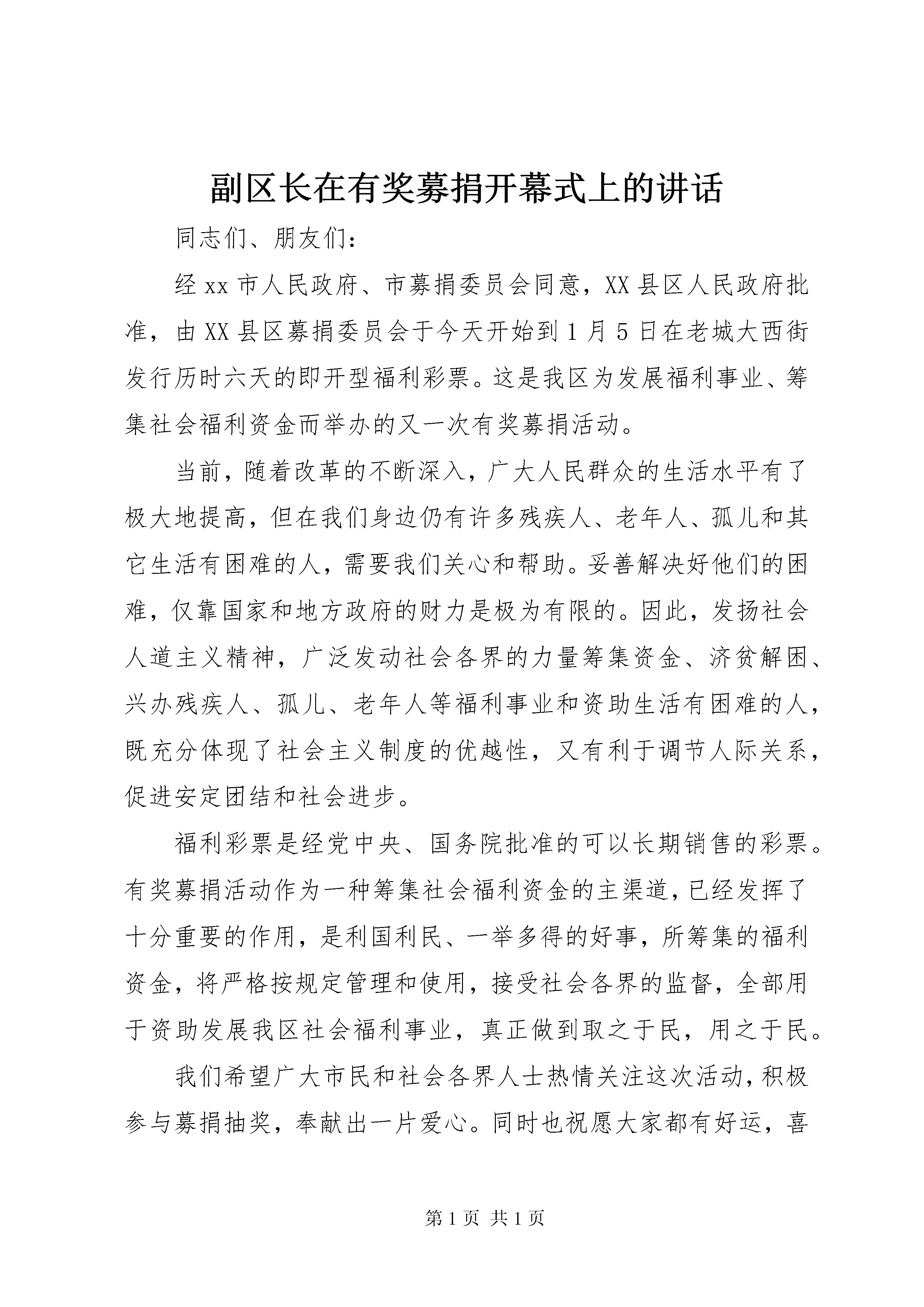 副区长在有奖募捐开幕式上的讲话同志们、朋友们:经xx市人民政府、市募捐委员会同意,XX县区人民政府批准,由XX县区募捐委员会于今天开始到1月5日在老城大西街发行历时六天的即开型福利彩票。这是我区为发展福利事业、筹集社会福利资金而举办的又一次有奖募捐活动。当前,随着改革的不断深入,广大人民群众的生活水平有了极大地提高,但在我们身边仍有许多残疾人、老年人、孤儿和其它生活有困难的人,需要我们关心和帮助。妥善解决好他们的困难,仅靠国家和地方政府的财力是极为有限的。因此,发扬社会人道主义精神,广泛发动社会各界的力量筹集资金、济贫解困、兴办残疾人、孤儿、老年人等福利事业和资助生活有困难的人,既充分体现了社会主义制度的优越性,又有利于调节人际关系,促进安定团结和社会进步。福利彩票是经党中央、国务院批准的可以长期销售的彩票。有奖募捐活动作为一种筹集社会福利资金的主渠道,已经发挥了十分重要的作用,是利国利民、一举多得的好事,所筹集的福利资金,将严格按规定管理和使用,接受社会各界的监督,全部用于资助发展我区社会福利事业,真正做到取之于民,用之于民。我们希望广大市民和社会各界人士热情关注这次活动,积极参与募捐抽奖,奉献出一片爱心。同时也祝愿大家都有好运,喜获大奖。祝这次彩票销售取得圆满成功。