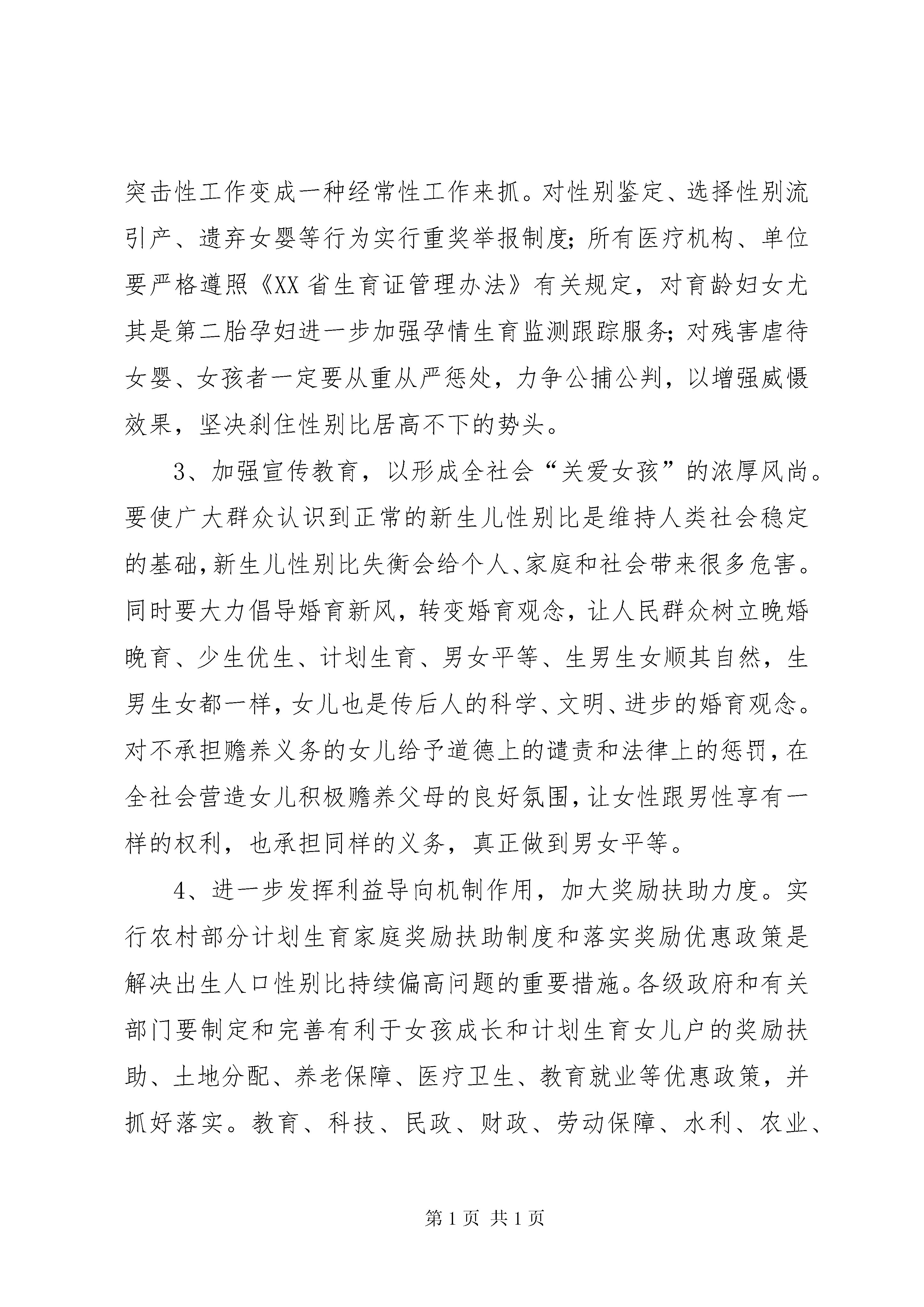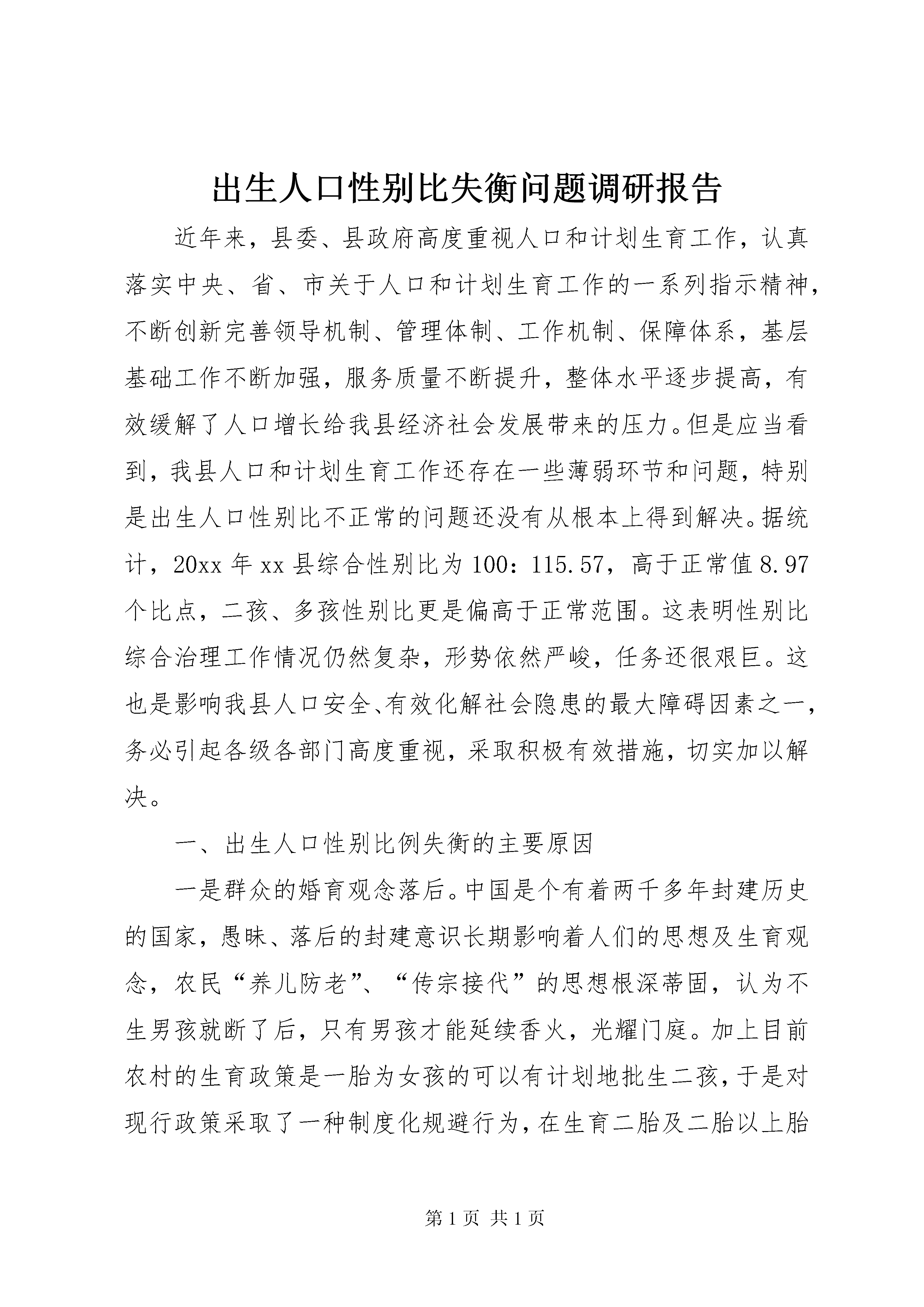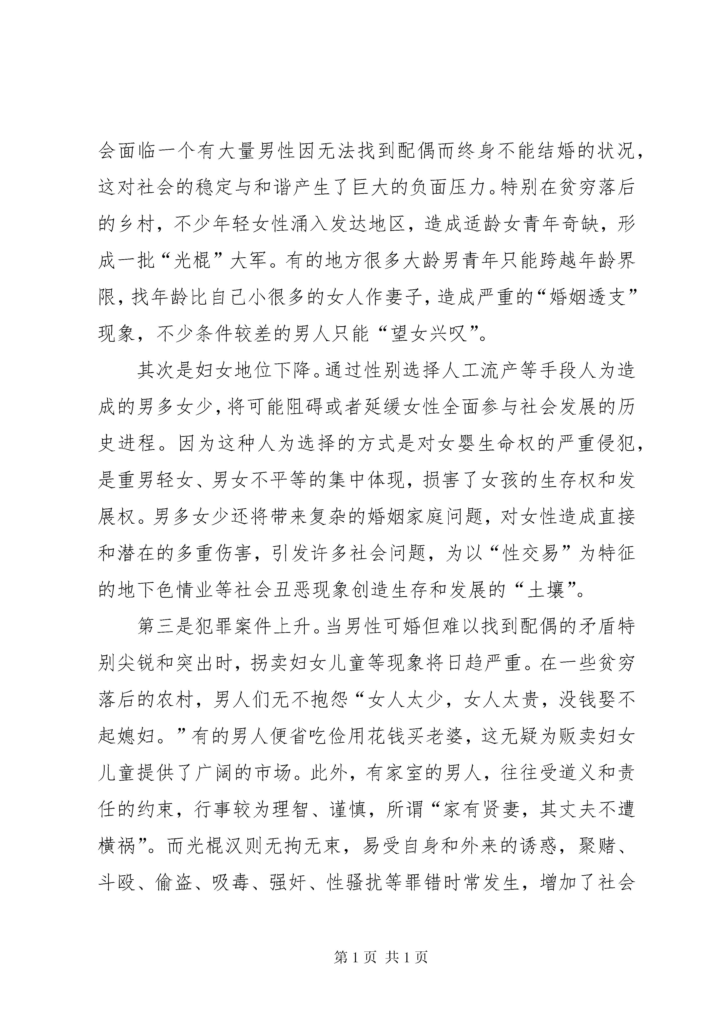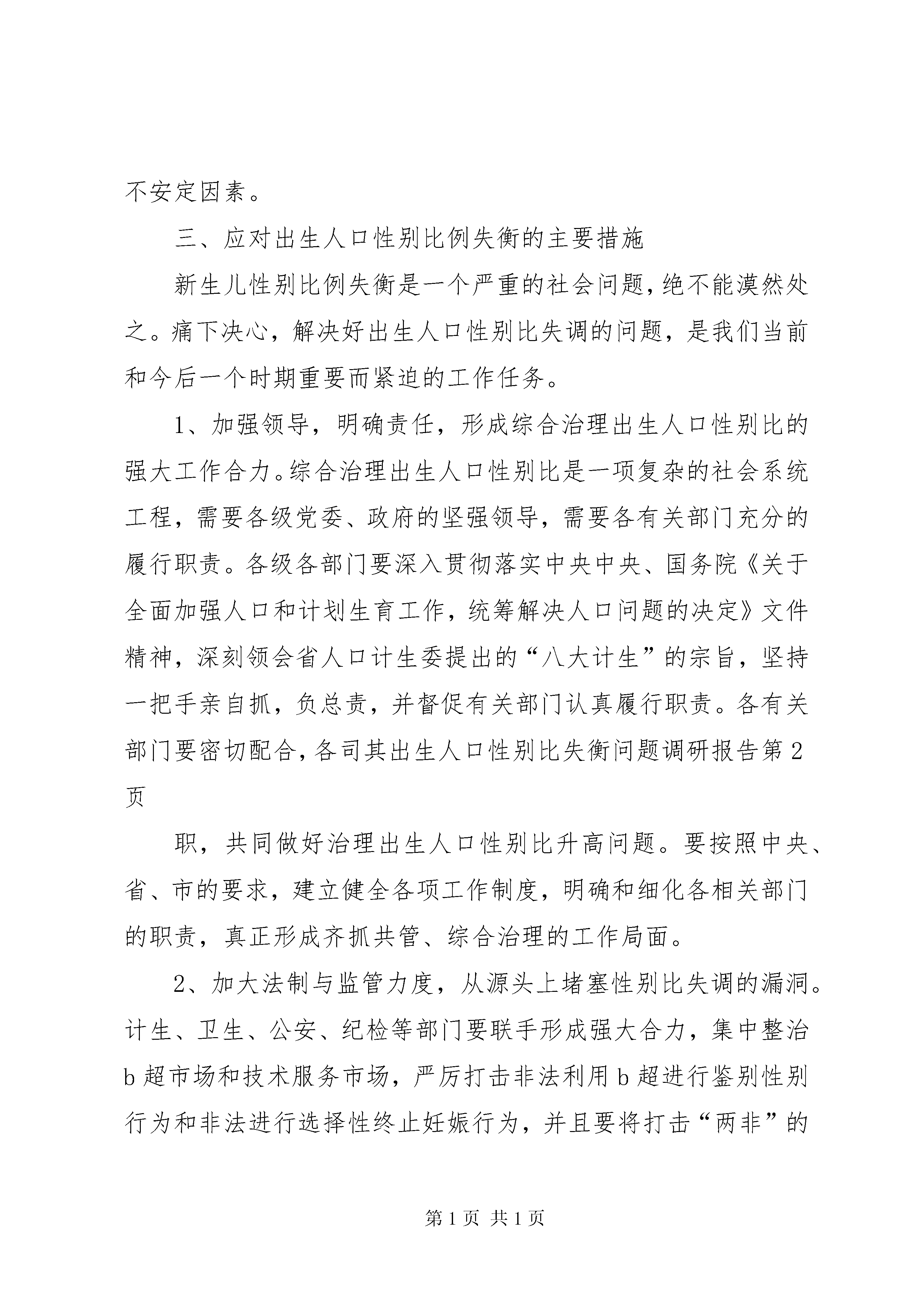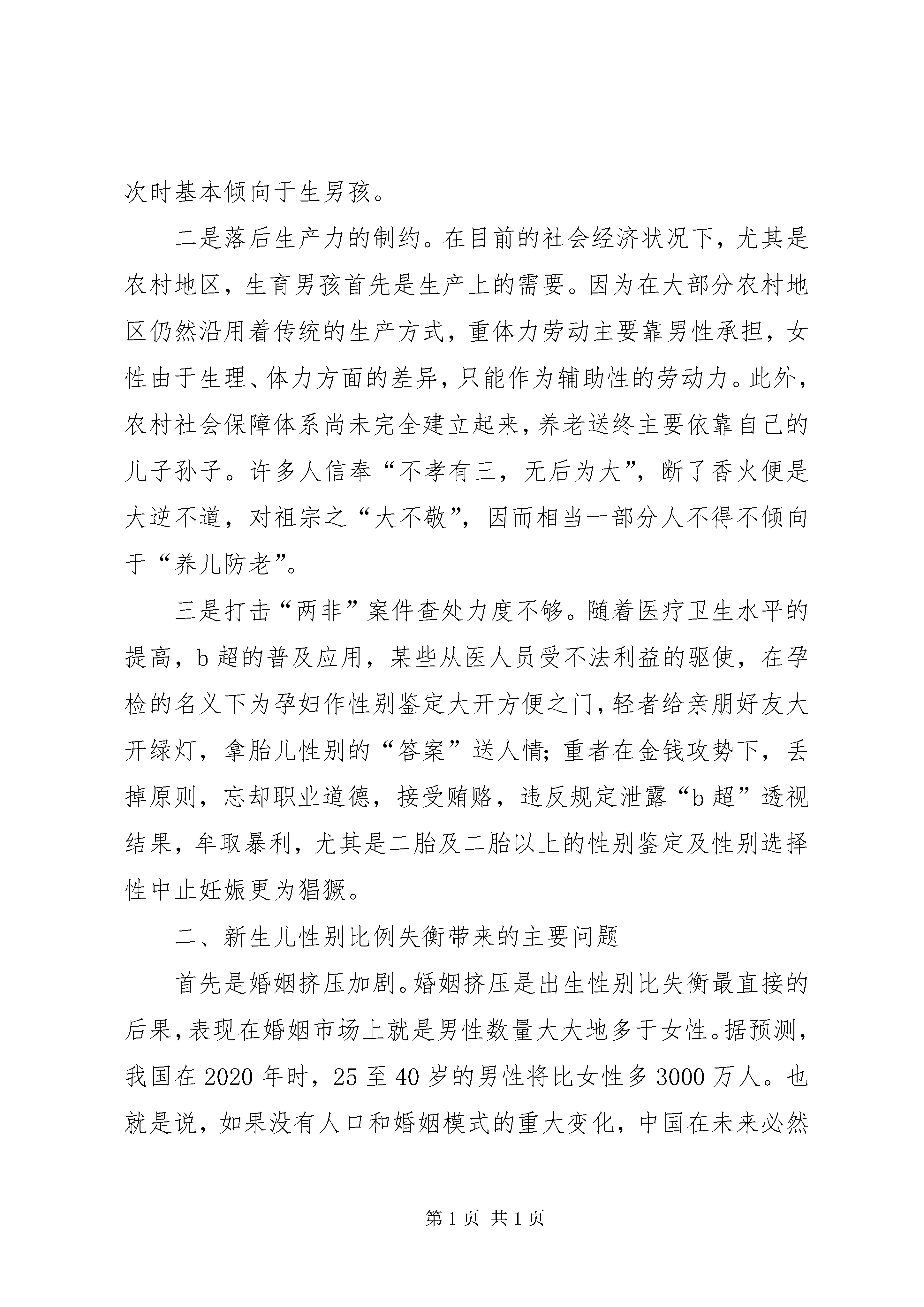 出生人口性别比失衡问题调研报告近年来,县委、县政府高度重视人口和计划生育工作,认真落实中央、省、市关于人口和计划生育工作的一系列指示精神,不断创新完善领导机制、管理体制、工作机制、保障体系,基层基础工作不断加强,服务质量不断提升,整体水平逐步提高,有效缓解了人口增长给我县经济社会发展带来的压力。但是应当看到,我县人口和计划生育工作还存在一些薄弱环节和问题,特别是出生人口性别比不正常的问题还没有从根本上得到解决。据统计,20xx年xx县综合性别比为100:115.57,高于正常值8.97个比点,二孩、多孩性别比更是偏高于正常范围。这表明性别比综合治理工作情况仍然复杂,形势依然严峻,任务还很艰巨。这也是影响我县人口安全、有效化解社会隐患的最大障碍因素之一,务必引起各级各部门高度重视,采取积极有效措施,切实加以解决。一、出生人口性别比例失衡的主要原因一是群众的婚育观念落后。中国是个有着两千多年封建历史的国家,愚昧、落后的封建意识长期影响着人们的思想及生育观念,农民“养儿防老”、“传宗接代”的思想根深蒂固,认为不生男孩就断了后,只有男孩才能延续香火,光耀门庭。加上目前农村的生育政策是一胎为女孩的可以有计划地批生二孩,于是对现行政策采取了一种制度化规避行为,在生育二胎及二胎以上胎次时基本倾向于生男孩。二是落后生产力的制约。在目前的社会经济状况下,尤其是农村地区,生育男孩首先是生产上的需要。因为在大部分农村地区仍然沿用着传统的生产方式,重体力劳动主要靠男性承担,女性由于生理、体力方面的差异,只能作为辅助性的劳动力。此外,农村社会保障体系尚未完全建立起来,养老送终主要依靠自己的儿子孙子。许多人信奉“不孝有三,无后为大”,断了香火便是大逆不道,对祖宗之“大不敬”,因而相当一部分人不得不倾向于“养儿防老”。三是打击“两非”案件查处力度不够。随着医疗卫生水平的提高,b超的普及应用,某些从医人员受不法利益的驱使,在孕检的名义下为孕妇作性别鉴定大开方便之门,轻者给亲朋好友大开绿灯,拿胎儿性别的“答案”送人情;重者在金钱攻势下,丢掉原则,忘却职业道德,接受贿赂,违反规定泄露“b超”透视结果,牟取暴利,尤其是二胎及二胎以上的性别鉴定及性别选择性中止妊娠更为猖獗。二、新生儿性别比例失衡带来的主要问题首先是婚姻挤压加剧。婚姻挤压是出生性别比失衡最直接的后果,表现在婚姻市场上就是男性数量大大地多于女性。据预测,我国在2020年时,25至40岁的男性将比女性多3000万人。也就是说,如果没有人口和婚姻模式的重大变化,中国在未来必然会面临一个有大量男性因无法找到配偶而终身不能结婚的状况,这对社会的稳定与和谐产生了巨大的负面压力。特别在贫穷落后的乡村,不少年轻女性涌入发达地区,造成适龄女青年奇缺,形成一批“光棍”大军。有的地方很多大龄男青年只能跨越年龄界限,找年龄比自己小很多的女人作妻子,造成严重的“婚姻透支”现象,不少条件较差的男人只能“望女兴叹”。其次是妇女地位下降。通过性别选择人工流产等手段人为造成的男多女少,将可能阻碍或者延缓女性全面参与社会发展的历史进程。因为这种人为选择的方式是对女婴生命权的严重侵犯,是重男轻女、男女不平等的集中体现,损害了女孩的生存权和发展权。男多女少还将带来复杂的婚姻家庭问题,对女性造成直接和潜在的多重伤害,引发许多社会问题,为以“性交易”为特征的地下色情业等社会丑恶现象创造生存和发展的“土壤”。第三是犯罪案件上升。当男性可婚但难以找到配偶的矛盾特别尖锐和突出时,拐卖妇女儿童等现象将日趋严重。在一些贫穷落后的农村,男人们无不抱怨“女人太少,女人太贵,没钱娶不起媳妇。”有的男人便省吃俭用花钱买老婆,这无疑为贩卖妇女儿童提供了广阔的市场。此外,有家室的男人,往往受道义和责任的约束,行事较为理智、谨慎,所谓“家有贤妻,其丈夫不遭横祸”。而光棍汉则无拘无束,易受自身和外来的诱惑,聚赌、斗殴、偷盗、吸毒、强奸、性骚扰等罪错时常发生,增加了社会不安定因素。三、应对出生人口性别比例失衡的主要措施新生儿性别比例失衡是一个严重的社会问题,绝不能漠然处之。痛下决心,解决好出生人口性别比失调的问题,是我们当前和今后一个时期重要而紧迫的工作任务。1、加强领导,明确责任,形成综合治理出生人口性别比的强大工作合力。综合治理出生人口性别比是一项复杂的社会系统工程,需要各级党委、政府的坚强领导,需要各有关部门充分的履行职责。各级各部门要深入贯彻落实中央中央、国务院《关于全面加强人口和计划生育工作,统筹解决人口问题的决定》文件精神,深刻领会省人口计生委提出的“八大计生”的宗旨,坚持一把手亲自抓,负总责,并督促有关部门认真履行职责。各有关部门要密切配合,各司其出生人口性别比失衡问题调研报告职,共同做好治理出生人口性别比升高问题。要按照中央