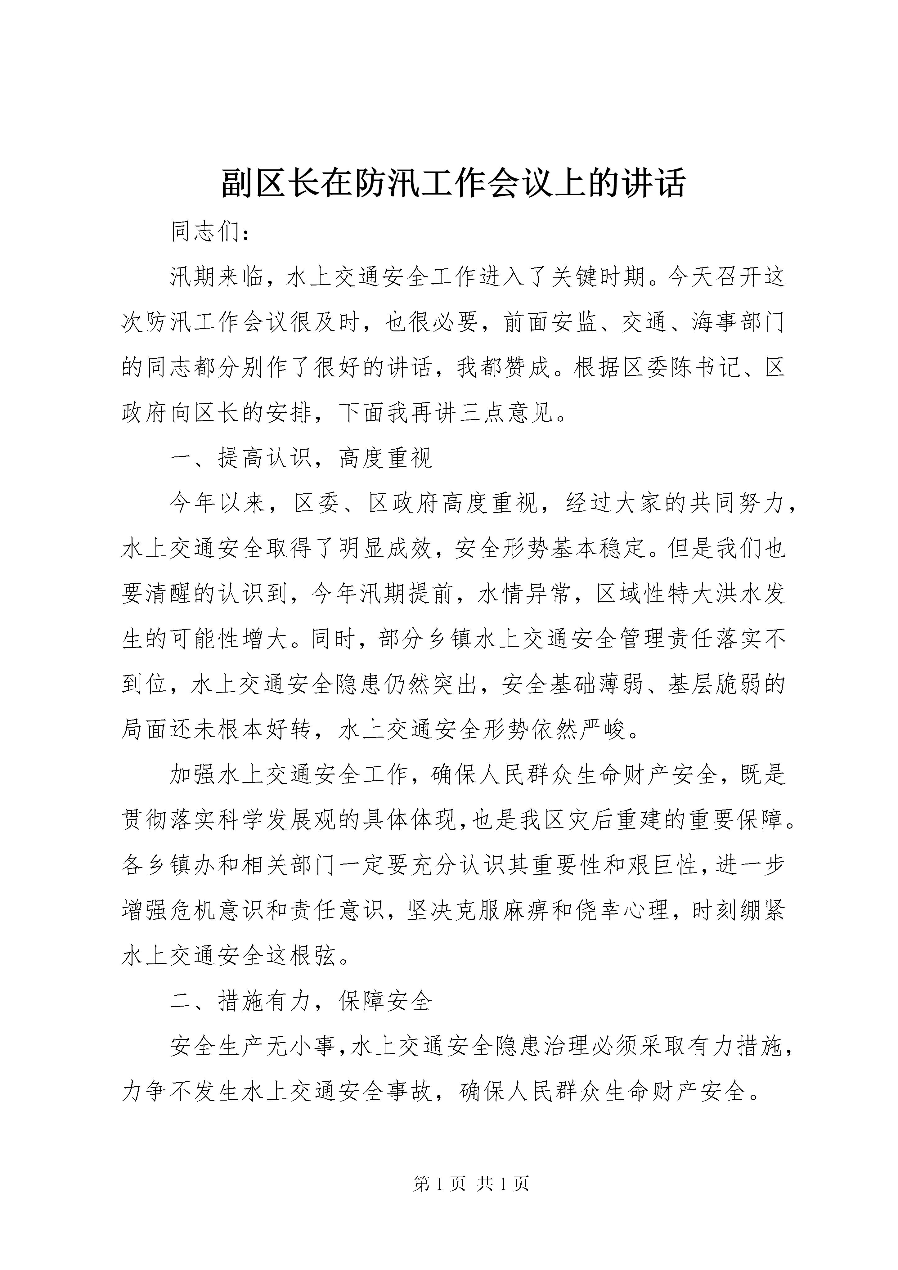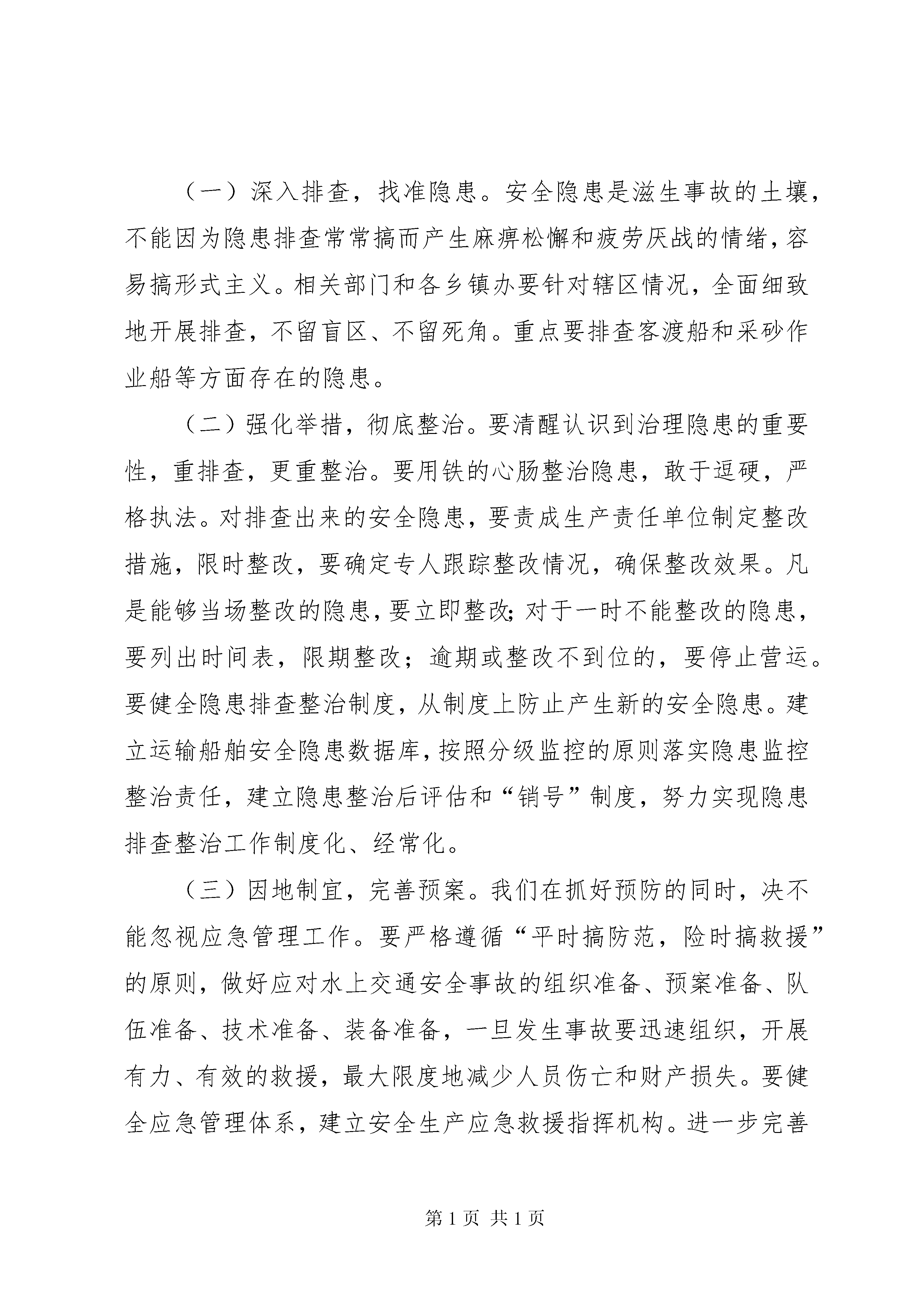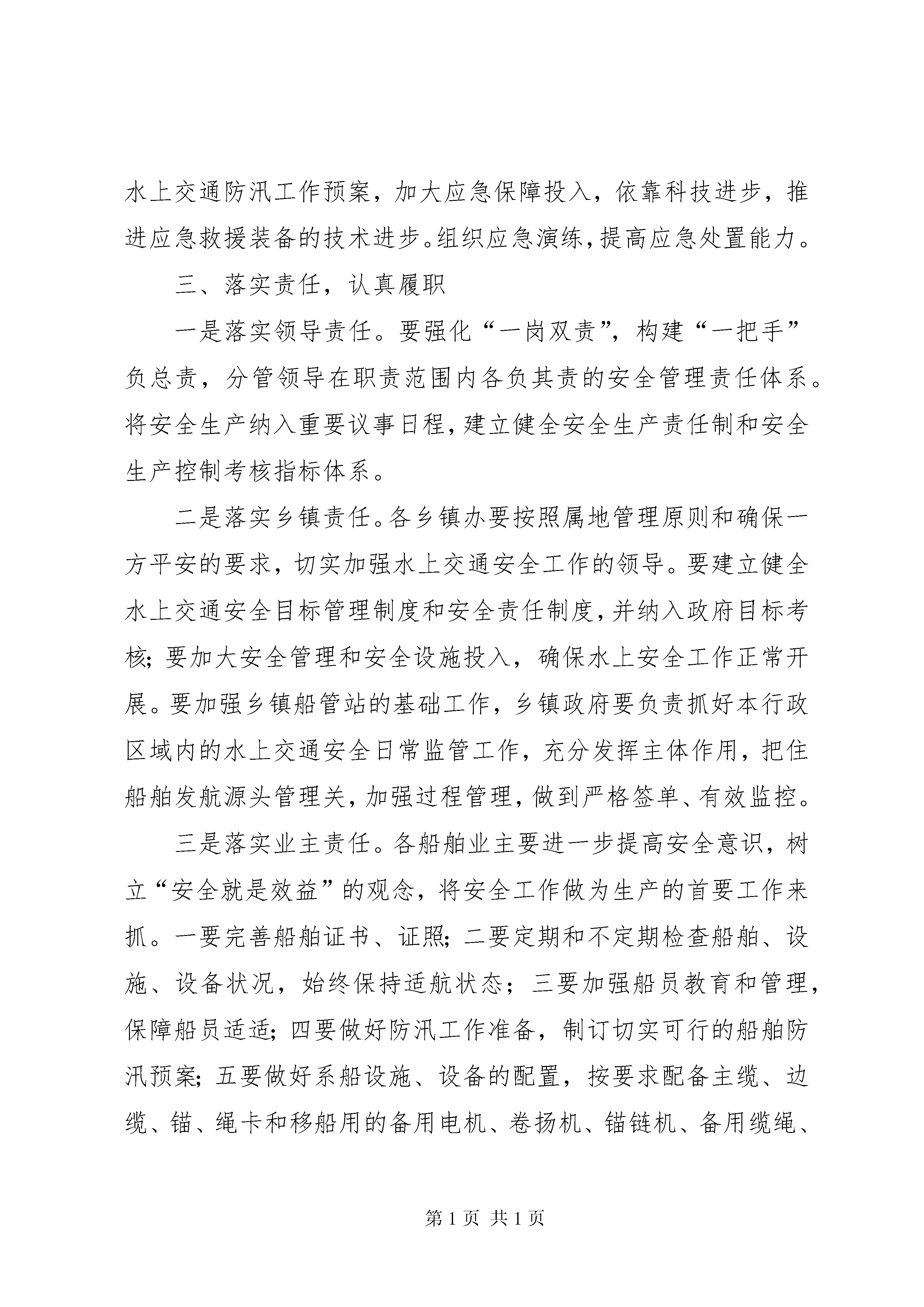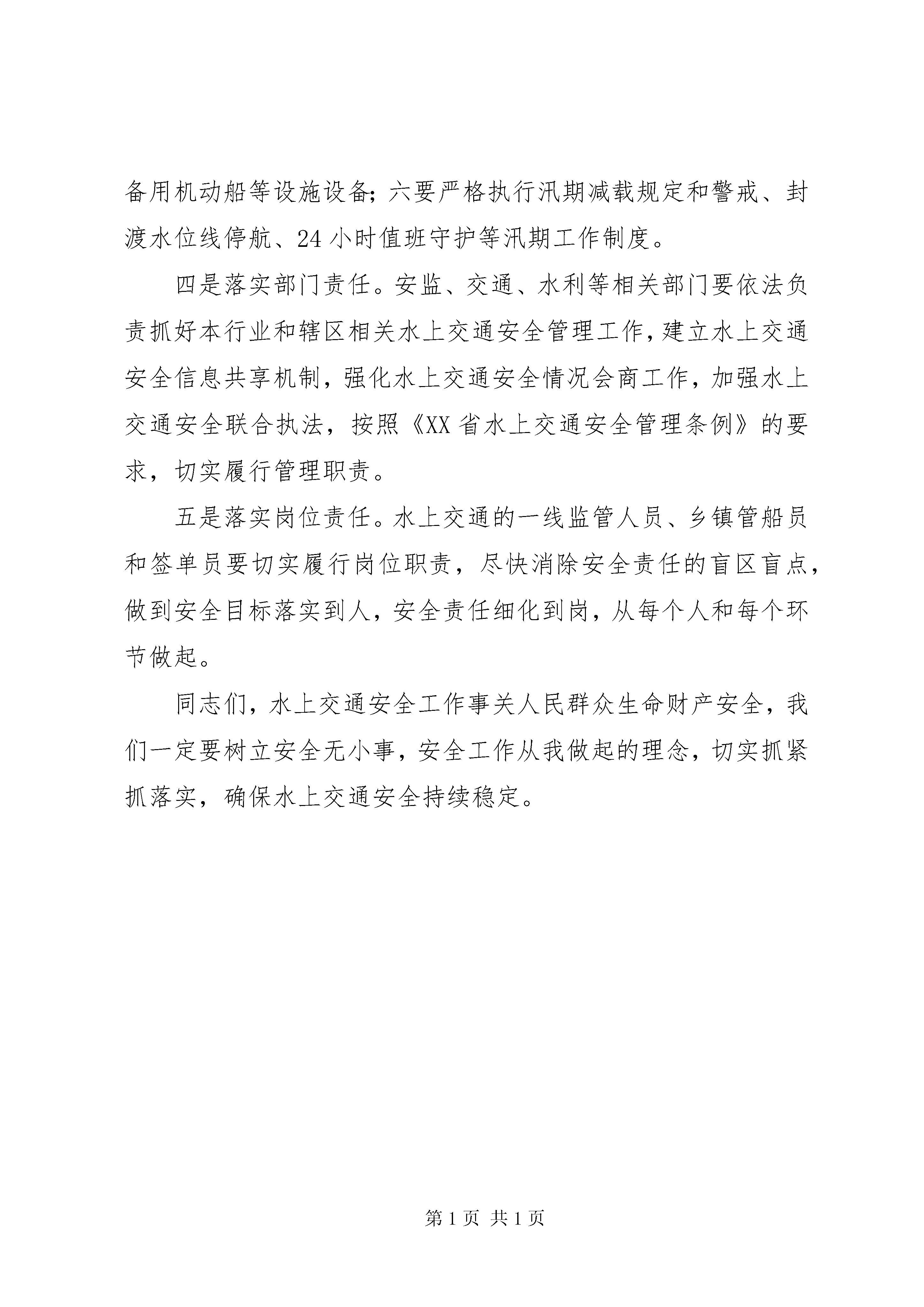 副区长在防汛工作会议上的讲话同志们:汛期来临,水上交通安全工作进入了关键时期。今天召开这次防汛工作会议很及时,也很必要,前面安监、交通、海事部门的同志都分别作了很好的讲话,我都赞成。根据区委陈书记、区政府向区长的安排,下面我再讲三点意见。一、提高认识,高度重视今年以来,区委、区政府高度重视,经过大家的共同努力,水上交通安全取得了明显成效,安全形势基本稳定。但是我们也要清醒的认识到,今年汛期提前,水情异常,区域性特大洪水发生的可能性增大。同时,部分乡镇水上交通安全管理责任落实不到位,水上交通安全隐患仍然突出,安全基础薄弱、基层脆弱的局面还未根本好转,水上交通安全形势依然严峻。加强水上交通安全工作,确保人民群众生命财产安全,既是贯彻落实科学发展观的具体体现,也是我区灾后重建的重要保障。各乡镇办和相关部门一定要充分认识其重要性和艰巨性,进一步增强危机意识和责任意识,坚决克服麻痹和侥幸心理,时刻绷紧水上交通安全这根弦。二、措施有力,保障安全安全生产无小事,水上交通安全隐患治理必须采取有力措施,力争不发生水上交通安全事故,确保人民群众生命财产安全。(一)深入排查,找准隐患。安全隐患是滋生事故的土壤,不能因为隐患排查常常搞而产生麻痹松懈和疲劳厌战的情绪,容易搞形式主义。相关部门和各乡镇办要针对辖区情况,全面细致地开展排查,不留盲区、不留死角。重点要排查客渡船和采砂作业船等方面存在的隐患。(二)强化举措,彻底整治。要清醒认识到治理隐患的重要性,重排查,更重整治。要用铁的心肠整治隐患,敢于逗硬,严格执法。对排查出来的安全隐患,要责成生产责任单位制定整改措施,限时整改,要确定专人跟踪整改情况,确保整改效果。凡是能够当场整改的隐患,要立即整改;对于一时不能整改的隐患,要列出时间表,限期整改;逾期或整改不到位的,要停止营运。要健全隐患排查整治制度,从制度上防止产生新的安全隐患。建立运输船舶安全隐患数据库,按照分级监控的原则落实隐患监控整治责任,建立隐患整治后评估和“销号”制度,努力实现隐患排查整治工作制度化、经常化。(三)因地制宜,完善预案。我们在抓好预防的同时,决不能忽视应急管理工作。要严格遵循“平时搞防范,险时搞救援”的原则,做好应对水上交通安全事故的组织准备、预案准备、队伍准备、技术准备、装备准备,一旦发生事故要迅速组织,开展有力、有效的救援,最大限度地减少人员伤亡和财产损失。要健全应急管理体系,建立安全生产应急救援指挥机构。进一步完善水上交通防汛工作预案,加大应急保障投入,依靠科技进步,推进应急救援装备的技术进步。组织应急演练,提高应急处置能力。三、落实责任,认真履职一是落实领导责任。要强化“一岗双责”,构建“一把手”负总责,分管领导在职责范围内各负其责的安全管理责任体系。将安全生产纳入重要议事日程,建立健全安全生产责任制和安全生产控制考核指标体系。二是落实乡镇责任。各乡镇办要按照属地管理原则和确保一方平安的要求,切实加强水上交通安全工作的领导。要建立健全水上交通安全目标管理制度和安全责任制度,并纳入政府目标考核;要加大安全管理和安全设施投入,确保水上安全工作正常开展。要加强乡镇船管站的基础工作,乡镇政府要负责抓好本行政区域内的水上交通安全日常监管工作,充分发挥主体作用,把住船舶发航源头管理关,加强过程管理,做到严格签单、有效监控。三是落实业主责任。各船舶业主要进一步提高安全意识,树立“安全就是效益”的观念,将安全工作做为生产的首要工作来抓。一要完善船舶证书、证照;二要定期和不定期检查船舶、设施、设备状况,始终保持适航状态;三要加强船员教育和管理,保障船员适适;四要做好防汛工作准备,制订切实可行的船舶防汛预案;五要做好系船设施、设备的配置,按要求配备主缆、边缆、锚、绳卡和移船用的备用电机、卷扬机、锚链机、备用缆绳、备用机动船等设施设备;六要严格执行汛期减载规定和警戒、封渡水位线停航、24小时值班守护等汛期工作制度。四是落实部门责任。安监、交通、水利等相关部门要依法负责抓好本行业和辖区相关水上交通安全管理工作,建立水上交通安全信息共享机制,强化水上交通安全情况会商工作,加强水上交通安全联合执法,按照《XX省水上交通安全管理条例》的要求,切实履行管理职责。五是落实岗位责任。水上交通的一线监管人员、乡镇管船员和签单员要切实履行岗位职责,尽快消除安全责任的盲区盲点,做到安全目标落实到人,安全责任细化到岗,从每个人和每个环节做起。同志们,水上交通安全工作事关人民群众生命财产安全,我们一定要树立安全无小事,安全工作从我做起的理念,切实抓紧抓落实,确保水上交通安全持续稳定。