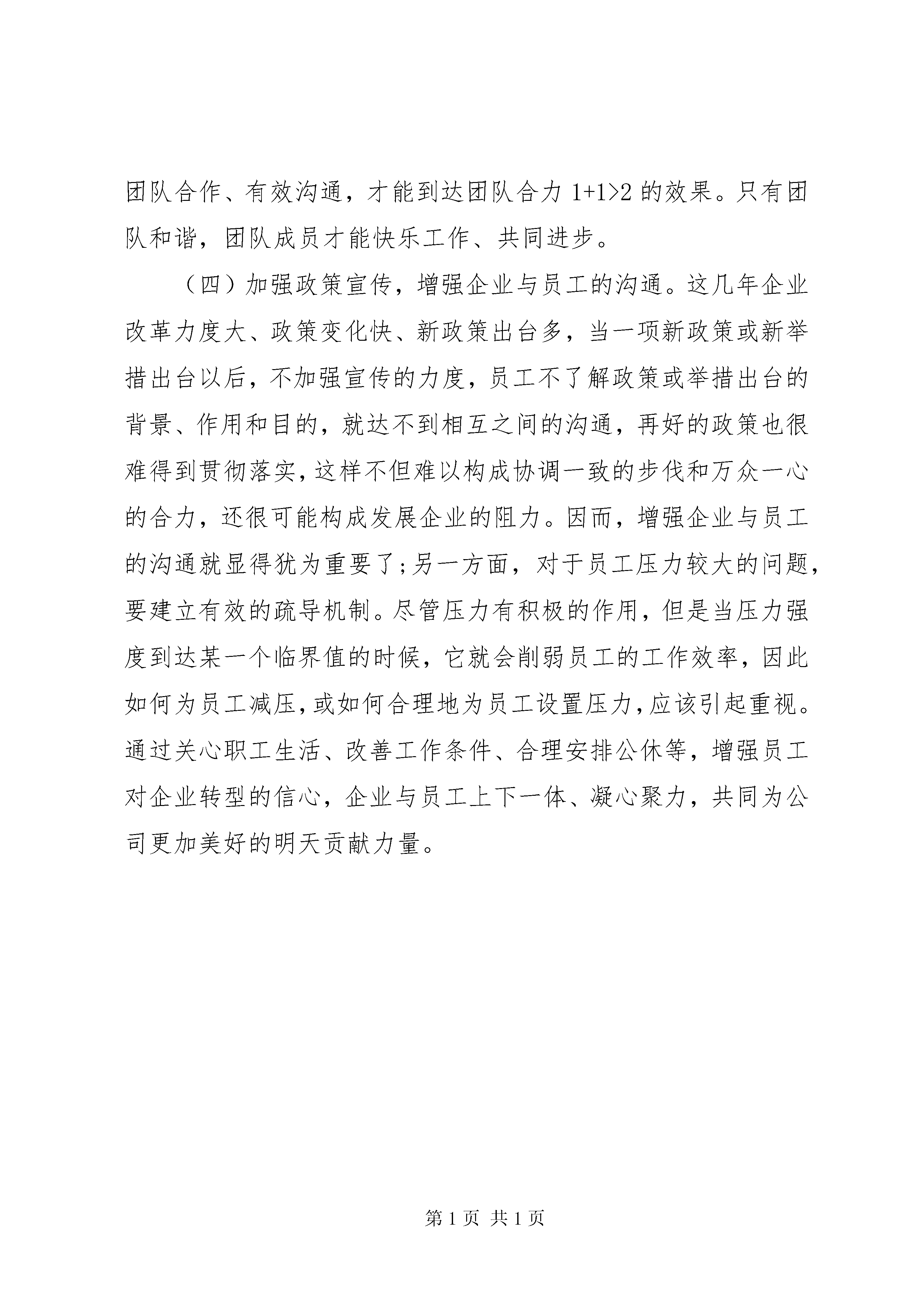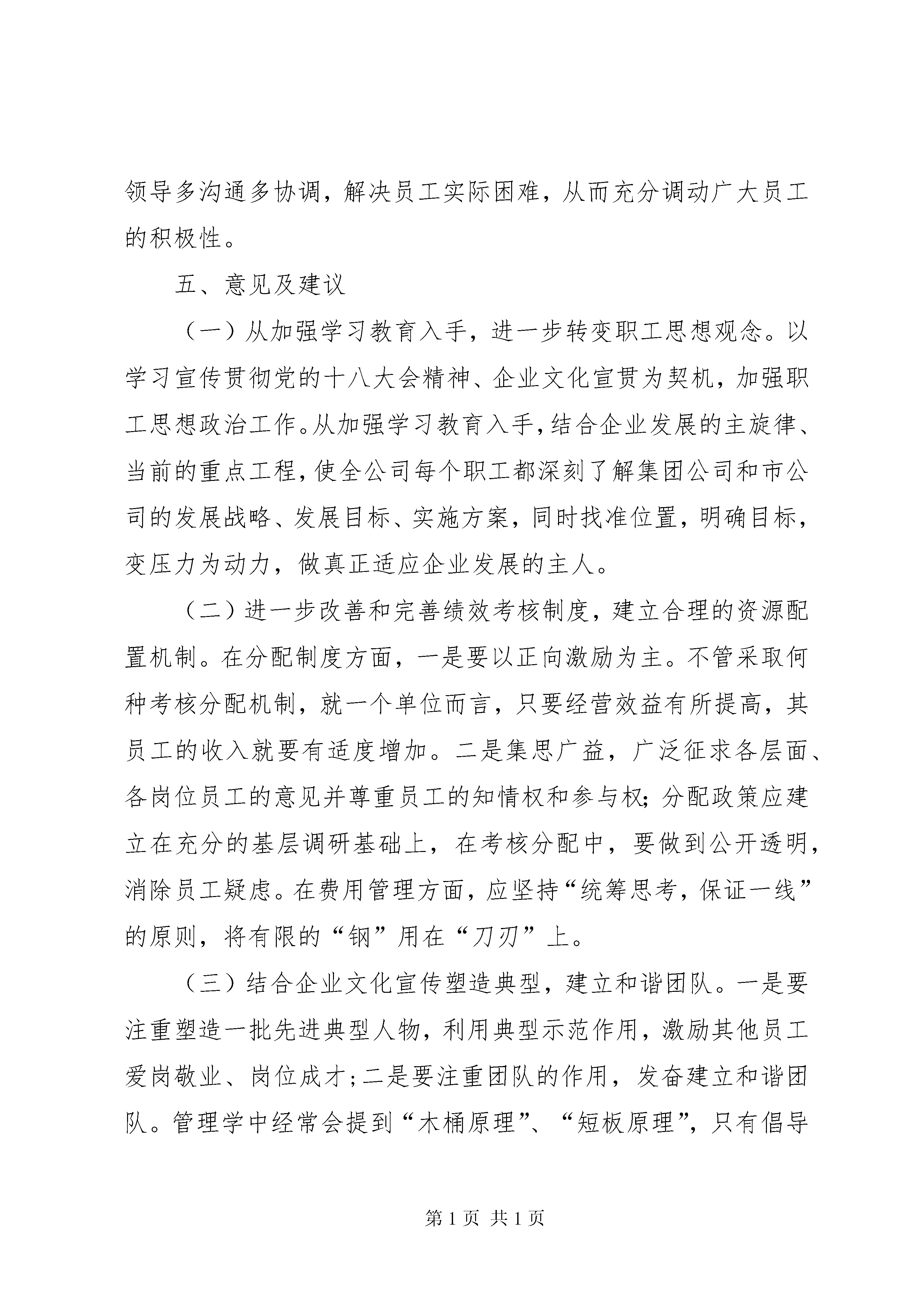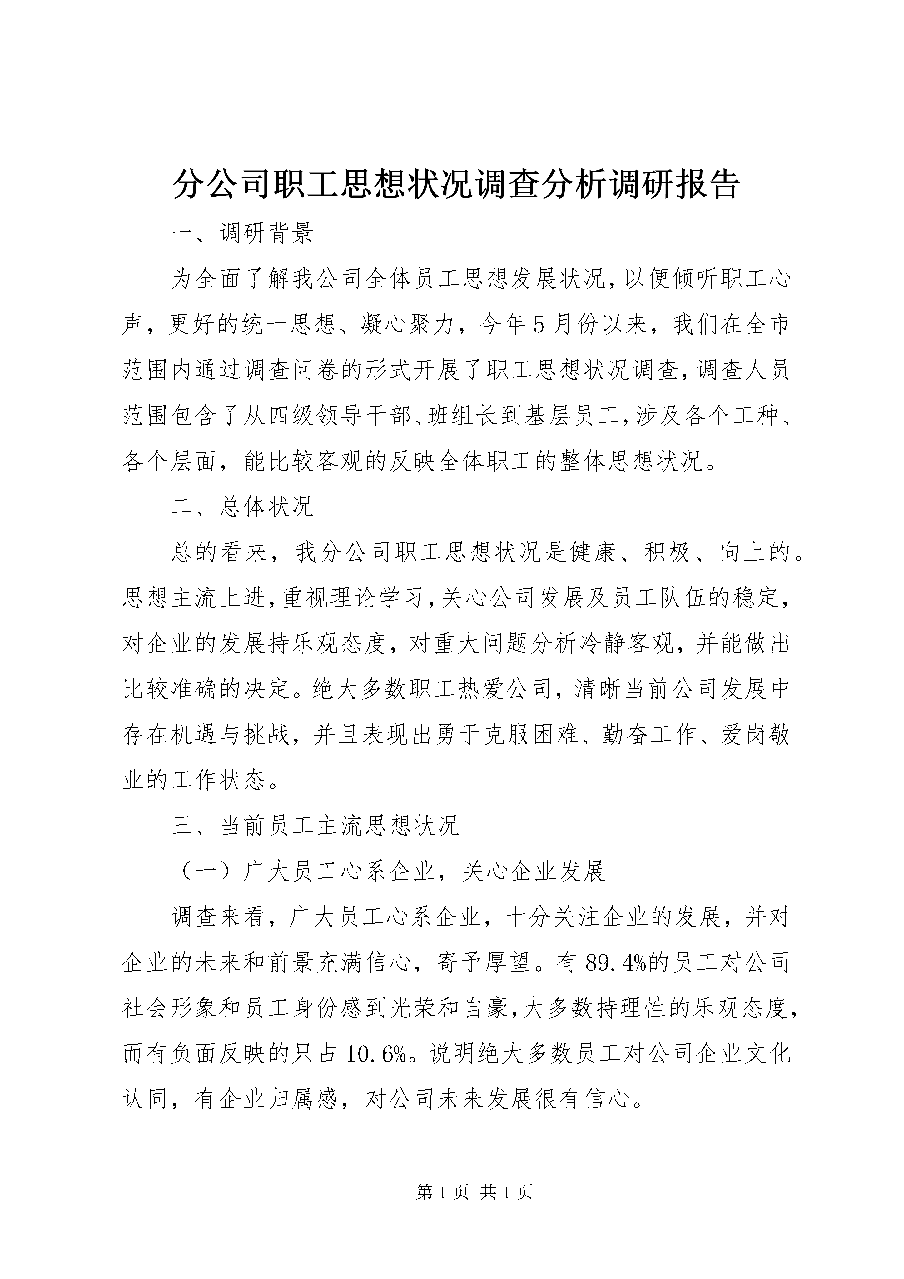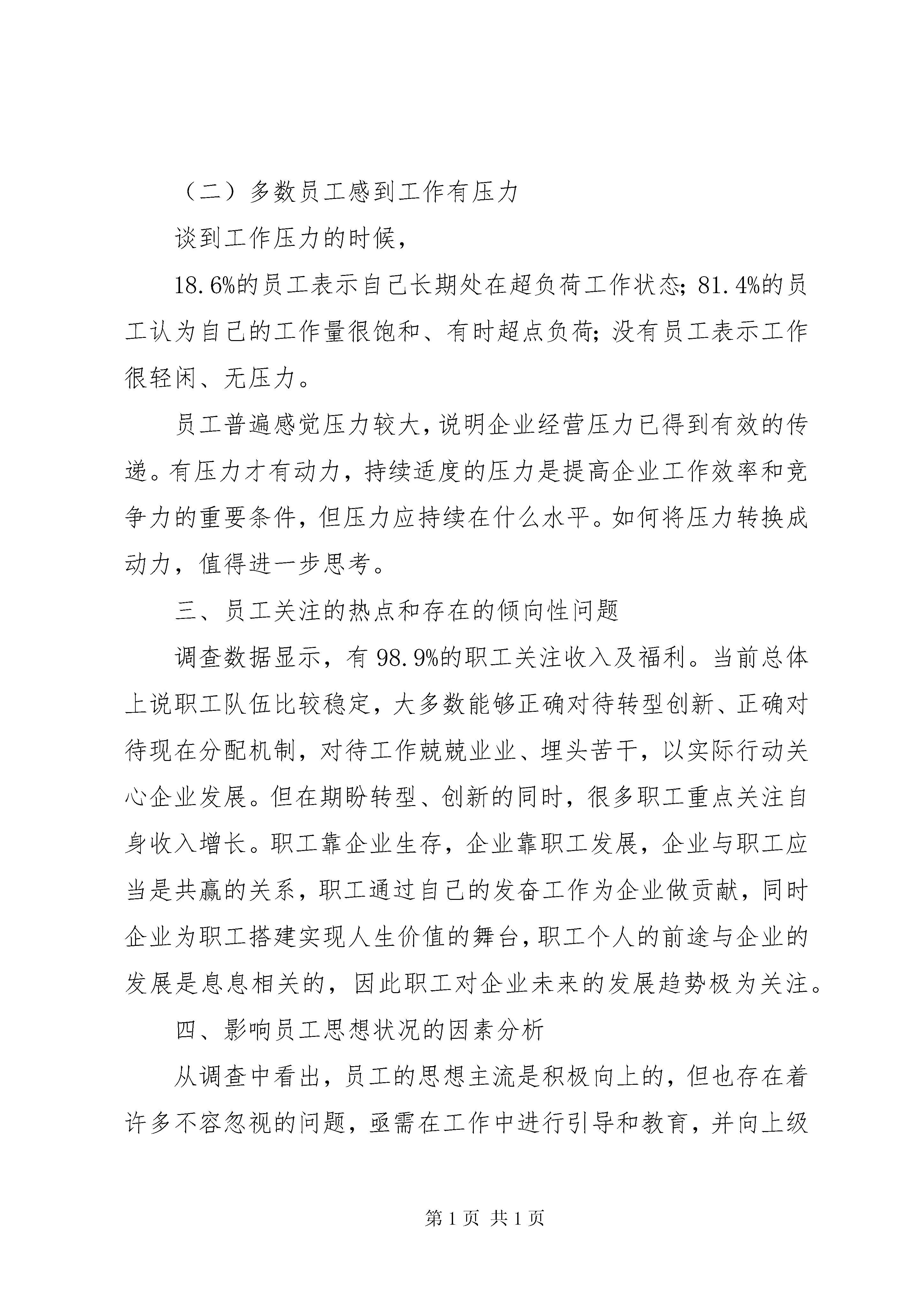 分公司职工思想状况调查分析调研报告一、调研背景为全面了解我公司全体员工思想发展状况,以便倾听职工心声,更好的统一思想、凝心聚力,今年5月份以来,我们在全市范围内通过调查问卷的形式开展了职工思想状况调查,调查人员范围包含了从四级领导干部、班组长到基层员工,涉及各个工种、各个层面,能比较客观的反映全体职工的整体思想状况。二、总体状况总的看来,我分公司职工思想状况是健康、积极、向上的。思想主流上进,重视理论学习,关心公司发展及员工队伍的稳定,对企业的发展持乐观态度,对重大问题分析冷静客观,并能做出比较准确的决定。绝大多数职工热爱公司,清晰当前公司发展中存在机遇与挑战,并且表现出勇于克服困难、勤奋工作、爱岗敬业的工作状态。三、当前员工主流思想状况(一)广大员工心系企业,关心企业发展调查来看,广大员工心系企业,十分关注企业的发展,并对企业的未来和前景充满信心,寄予厚望。有89.4%的员工对公司社会形象和员工身份感到光荣和自豪,大多数持理性的乐观态度,而有负面反映的只占10.6%。说明绝大多数员工对公司企业文化认同,有企业归属感,对公司未来发展很有信心。(二)多数员工感到工作有压力谈到工作压力的时候,18.6%的员工表示自己长期处在超负荷工作状态;81.4%的员工认为自己的工作量很饱和、有时超点负荷;没有员工表示工作很轻闲、无压力。员工普遍感觉压力较大,说明企业经营压力已得到有效的传递。有压力才有动力,持续适度的压力是提高企业工作效率和竞争力的重要条件,但压力应持续在什么水平。如何将压力转换成动力,值得进一步思考。三、员工关注的热点和存在的倾向性问题调查数据显示,有98.9%的职工关注收入及福利。当前总体上说职工队伍比较稳定,大多数能够正确对待转型创新、正确对待现在分配机制,对待工作兢兢业业、埋头苦干,以实际行动关心企业发展。但在期盼转型、创新的同时,很多职工重点关注自身收入增长。职工靠企业生存,企业靠职工发展,企业与职工应当是共赢的关系,职工通过自己的发奋工作为企业做贡献,同时企业为职工搭建实现人生价值的舞台,职工个人的前途与企业的发展是息息相关的,因此职工对企业未来的发展趋势极为关注。四、影响员工思想状况的因素分析从调查中看出,员工的思想主流是积极向上的,但也存在着许多不容忽视的问题,亟需在工作中进行引导和教育,并向上级领导多沟通多协调,解决员工实际困难,从而充分调动广大员工的积极性。五、意见及建议(一)从加强学习教育入手,进一步转变职工思想观念。以学习宣传贯彻党的十八大会精神、企业文化宣贯为契机,加强职工思想政治工作。从加强学习教育入手,结合企业发展的主旋律、当前的重点工程,使全公司每个职工都深刻了解集团公司和市公司的发展战略、发展目标、实施方案,同时找准位置,明确目标,变压力为动力,做真正适应企业发展的主人。(二)进一步改善和完善绩效考核制度,建立合理的资源配置机制。在分配制度方面,一是要以正向激励为主。不管采取何种考核分配机制,就一个单位而言,只要经营效益有所提高,其员工的收入就要有适度增加。二是集思广益,广泛征求各层面、各岗位员工的意见并尊重员工的知情权和参与权;分配政策应建立在充分的基层调研基础上,在考核分配中,要做到公开透明,消除员工疑虑。在费用管理方面,应坚持“统筹思考,保证一线”的原则,将有限的“钢”用在“刀刃”上。(三)结合企业文化宣传塑造典型,建立和谐团队。一是要注重塑造一批先进典型人物,利用典型示范作用,激励其他员工爱岗敬业、岗位成才;二是要注重团队的作用,发奋建立和谐团队。管理学中经常会提到“木桶原理”、“短板原理”,只有倡导团队合作、有效沟通,才能到达团队合力1+1>2的效果。只有团队和谐,团队成员才能快乐工作、共同进步。(四)加强政策宣传,增强企业与员工的沟通。这几年企业改革力度大、政策变化快、新政策出台多,当一项新政策或新举措出台以后,不加强宣传的力度,员工不了解政策或举措出台的背景、作用和目的,就达不到相互之间的沟通,再好的政策也很难得到贯彻落实,这样不但难以构成协调一致的步伐和万众一心的合力,还很可能构成发展企业的阻力。因而,增强企业与员工的沟通就显得犹为重要了;另一方面,对于员工压力较大的问题,要建立有效的疏导机制。尽管压力有积极的作用,但是当压力强度到达某一个临界值的时候,它就会削弱员工的工作效率,因此如何为员工减压,或如何合理地为员工设置压力,应该引起重视。通过关心职工生活、改善工作条件、合理安排公休等,增强员工对企业转型的信心,企业与员工上下一体、凝心聚力,共同为公司更加美好的明天贡献力量。