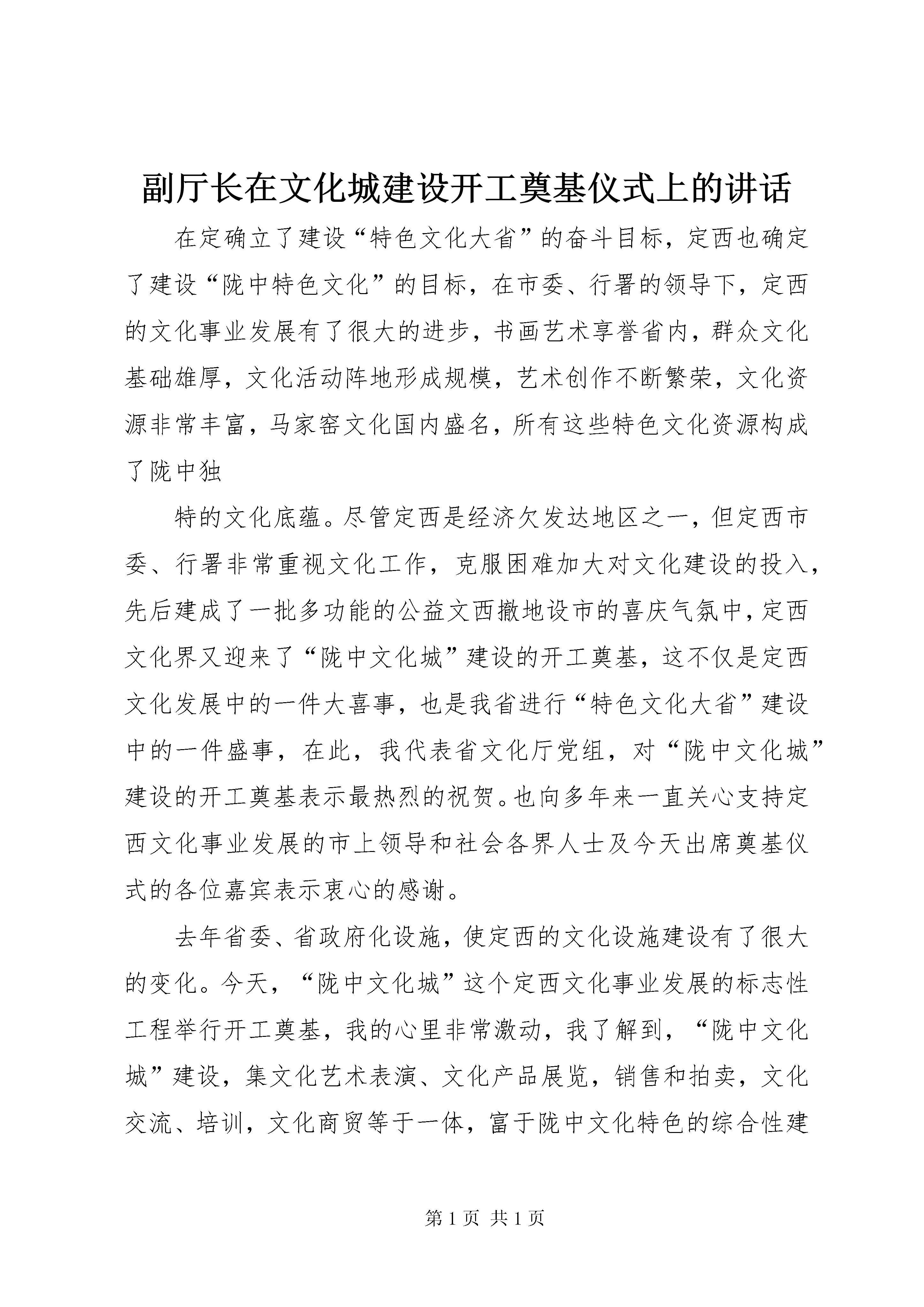 副厅长在文化城建设开工奠基仪式上的讲话在定确立了建设“特色文化大省”的奋斗目标,定西也确定了建设“陇中特色文化”的目标,在市委、行署的领导下,定西的文化事业发展有了很大的进步,书画艺术享誉省内,群众文化基础雄厚,文化活动阵地形成规模,艺术创作不断繁荣,文化资源非常丰富,马家窑文化国内盛名,所有这些特色文化资源构成了陇中独特的文化底蕴。尽管定西是经济欠发达地区之一,但定西市委、行署非常重视文化工作,克服困难加大对文化建设的投入,先后建成了一批多功能的公益文西撤地设市的喜庆气氛中,定西文化界又迎来了“陇中文化城”建设的开工奠基,这不仅是定西文化发展中的一件大喜事,也是我省进行“特色文化大省”建设中的一件盛事,在此,我代表省文化厅党组,对“陇中文化城”建设的开工奠基表示最热烈的祝贺。也向多年来一直关心支持定西文化事业发展的市上领导和社会各界人士及今天出席奠基仪式的各位嘉宾表示衷心的感谢。去年省委、省政府化设施,使定西的文化设施建设有了很大的变化。今天,“陇中文化城”这个定西文化事业发展的标志性工程举行开工奠基,我的心里非常激动,我了解到,“陇中文化城”建设,集文化艺术表演、文化产品展览,销售和拍卖,文化交流、培训,文化商贸等于一体,富于陇中文化特色的综合性建筑,建筑规模大,投资大,是今年定西市的重点建设项目之一。在经济较困难的定西能有这么大的举动,这是定西市委、行署用实际行动践行“三个代表”的具体体现,这表明定西市委、行署对文化工作是非常重视的,对文化建设的决心和信心也是非常大的。“陇中文化城”从它的设计、投资、到完善的功能等,都证明它是定XX县区的一个亮点工程,也是全区文化设施的大型工程,它必将是定西建设“陇中特色文化”的一个重要阵地和窗口,也将是我们甘肃建设“特色文化大省”的内容之一,这是我们省文化厅非常高兴的事。因此我表示,文化厅要尽可能的创造条件,给“陇中文化城”建设给予各方的支持和帮助。最后祝大家身体健康,万事如意。谢谢大家。