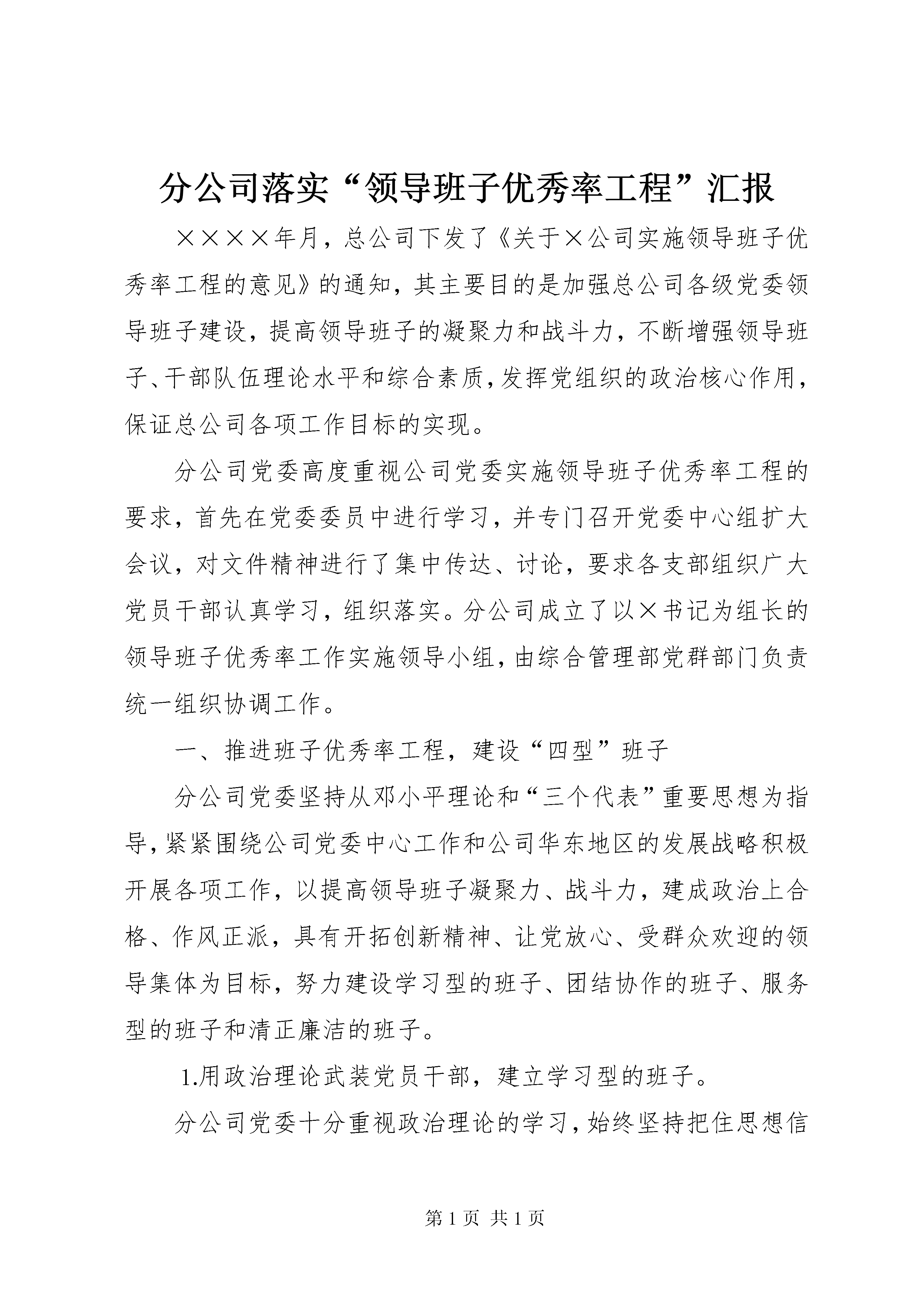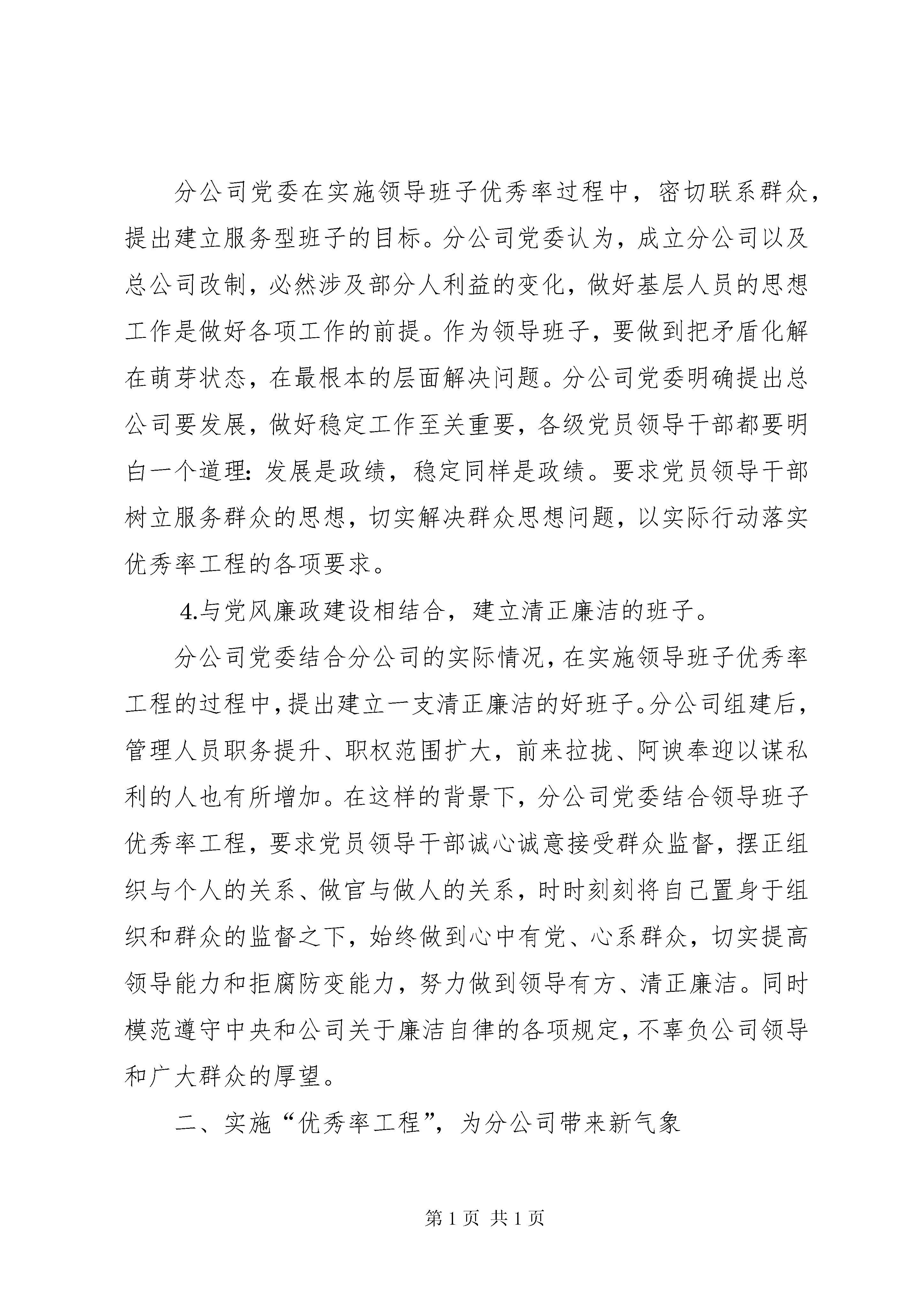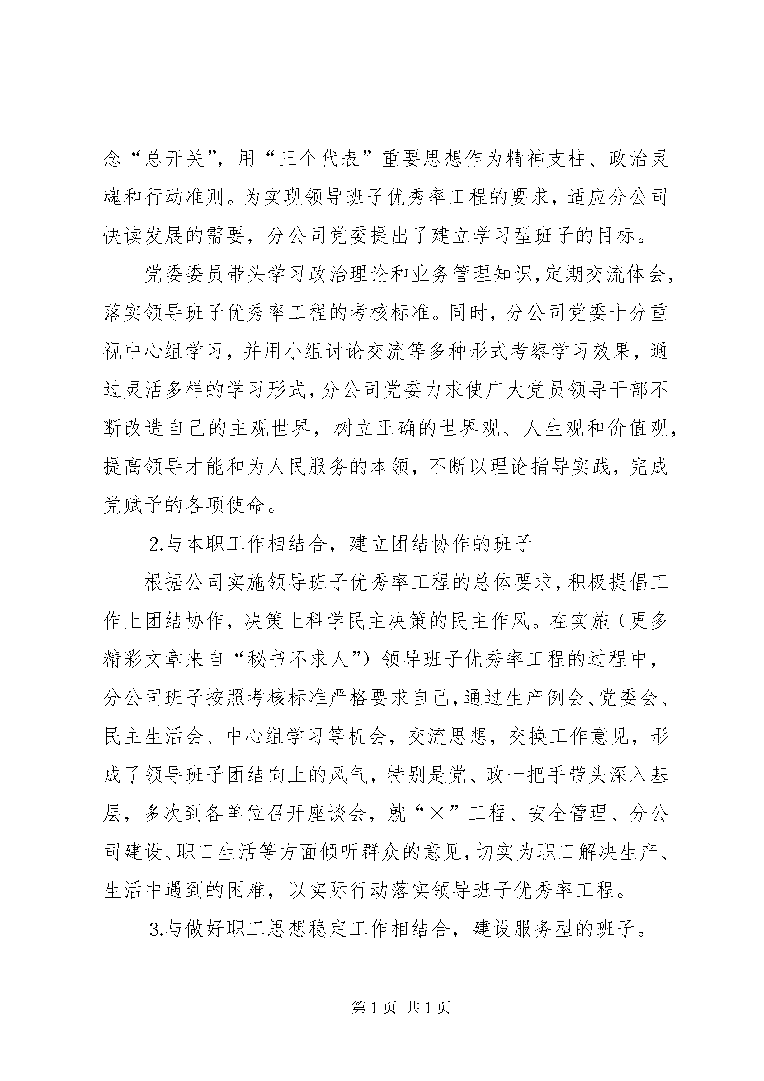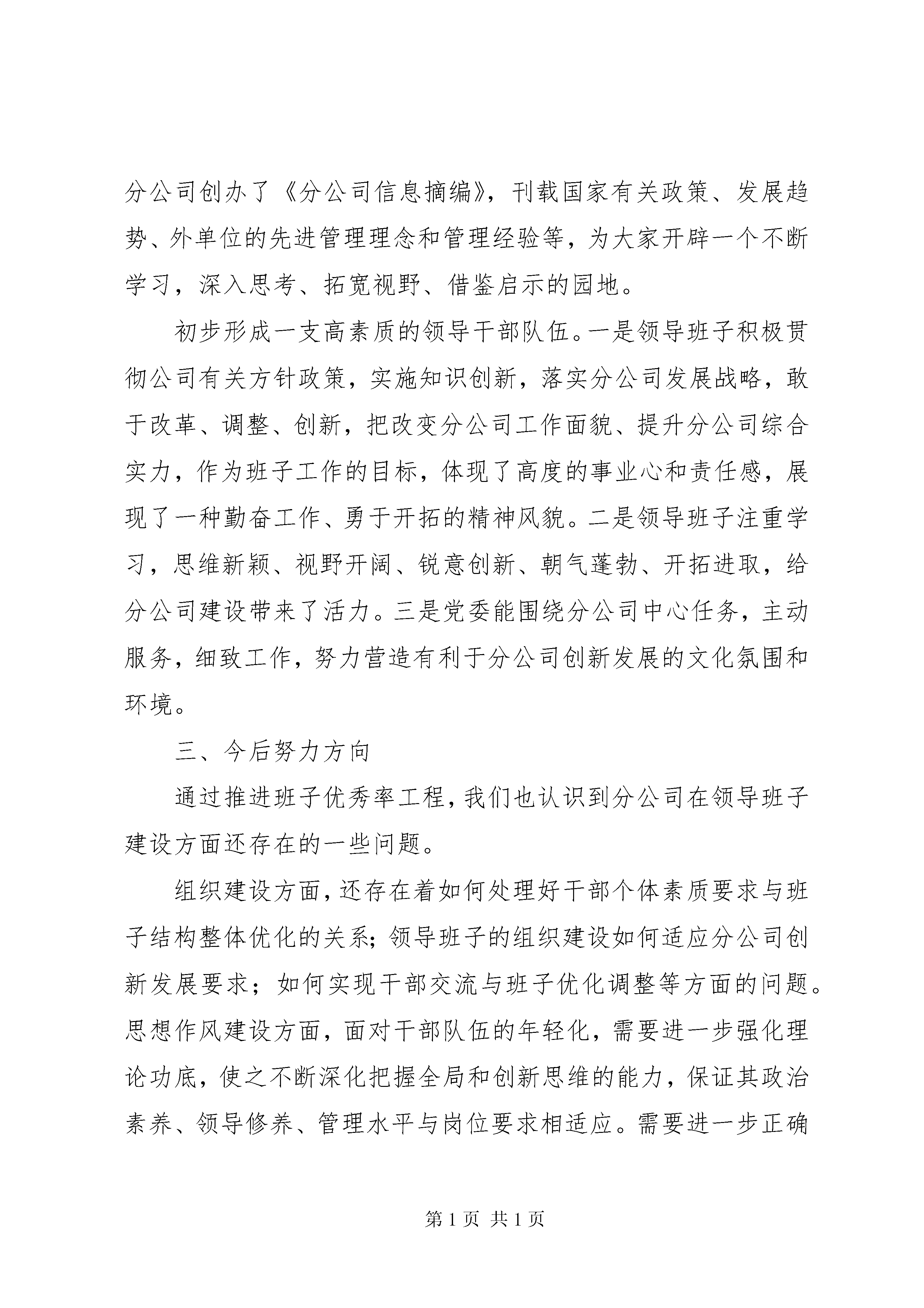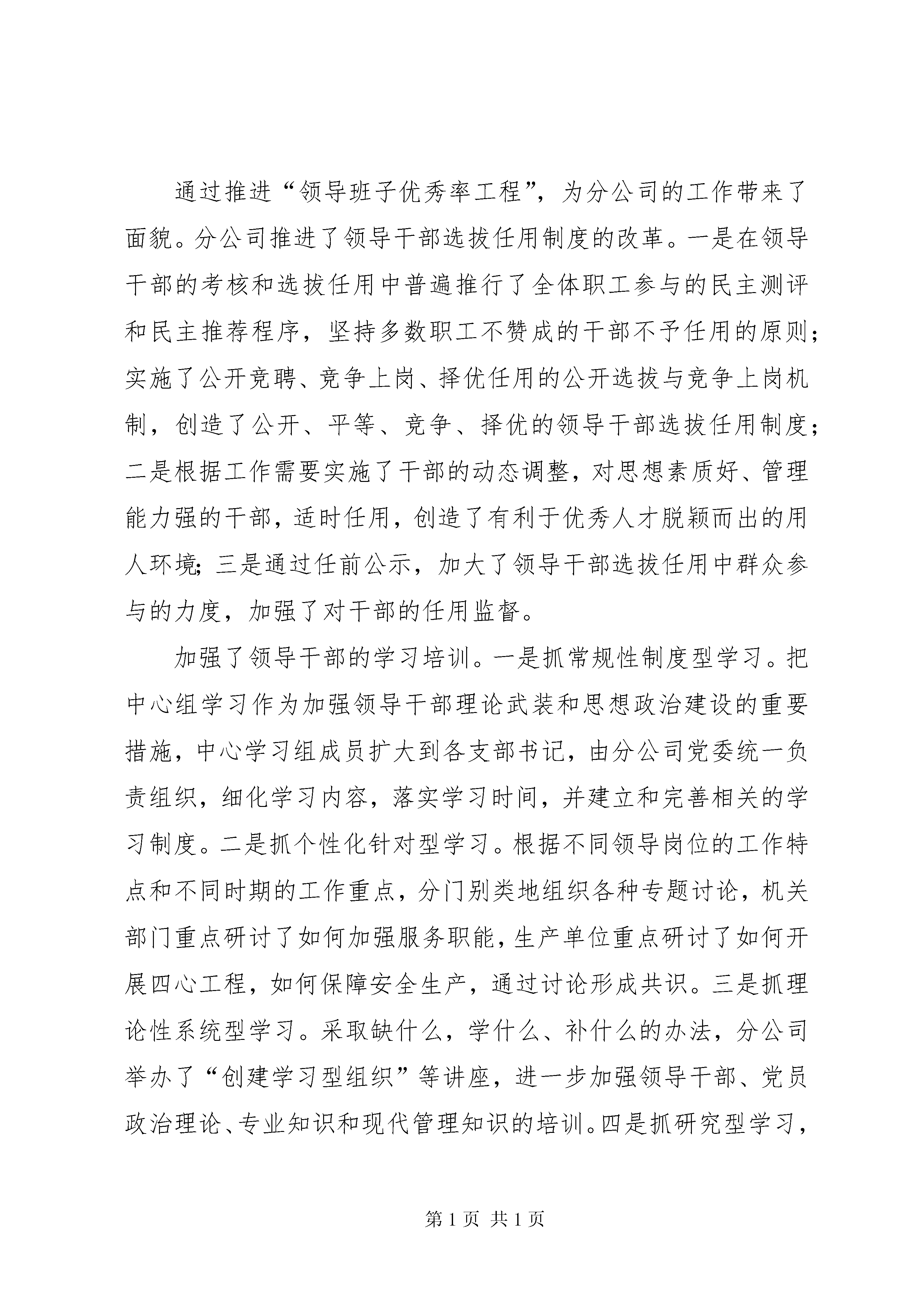 分公司落实“领导班子优秀率工程”汇报××××年月,总公司下发了《关于×公司实施领导班子优秀率工程的意见》的通知,其主要目的是加强总公司各级党委领导班子建设,提高领导班子的凝聚力和战斗力,不断增强领导班子、干部队伍理论水平和综合素质,发挥党组织的政治核心作用,保证总公司各项工作目标的实现。分公司党委高度重视公司党委实施领导班子优秀率工程的要求,首先在党委委员中进行学习,并专门召开党委中心组扩大会议,对文件精神进行了集中传达、讨论,要求各支部组织广大党员干部认真学习,组织落实。分公司成立了以×书记为组长的领导班子优秀率工作实施领导小组,由综合管理部党群部门负责统一组织协调工作。一、推进班子优秀率工程,建设“四型”班子分公司党委坚持从邓小平理论和“三个代表”重要思想为指导,紧紧围绕公司党委中心工作和公司华东地区的发展战略积极开展各项工作,以提高领导班子凝聚力、战斗力,建成政治上合格、作风正派,具有开拓创新精神、让党放心、受群众欢迎的领导集体为目标,努力建设学习型的班子、团结协作的班子、服务型的班子和清正廉洁的班子。⒈用政治理论武装党员干部,建立学习型的班子。分公司党委十分重视政治理论的学习,始终坚持把住思想信念“总开关”,用“三个代表”重要思想作为精神支柱、政治灵魂和行动准则。为实现领导班子优秀率工程的要求,适应分公司快读发展的需要,分公司党委提出了建立学习型班子的目标。党委委员带头学习政治理论和业务管理知识,定期交流体会,落实领导班子优秀率工程的考核标准。同时,分公司党委十分重视中心组学习,并用小组讨论交流等多种形式考察学习效果,通过灵活多样的学习形式,分公司党委力求使广大党员领导干部不断改造自己的主观世界,树立正确的世界观、人生观和价值观,提高领导才能和为人民服务的本领,不断以理论指导实践,完成党赋予的各项使命。⒉与本职工作相结合,建立团结协作的班子根据公司实施领导班子优秀率工程的总体要求,积极提倡工作上团结协作,决策上科学民主决策的民主作风。在实施(更多精彩文章来自“秘书不求人”)领导班子优秀率工程的过程中,分公司班子按照考核标准严格要求自己,通过生产例会、党委会、民主生活会、中心组学习等机会,交流思想,交换工作意见,形成了领导班子团结向上的风气,特别是党、政一把手带头深入基层,多次到各单位召开座谈会,就“×”工程、安全管理、分公司建设、职工生活等方面倾听群众的意见,切实为职工解决生产、生活中遇到的困难,以实际行动落实领导班子优秀率工程。⒊与做好职工思想稳定工作相结合,建设服务型的班子。分公司党委在实施领导班子优秀率过程中,密切联系群众,提出建立服务型班子的目标。分公司党委认为,成立分公司以及总公司改制,必然涉及部分人利益的变化,做好基层人员的思想工作是做好各项工作的前提。作为领导班子,要做到把矛盾化解在萌芽状态,在最根本的层面解决问题。分公司党委明确提出总公司要发展,做好稳定工作至关重要,各级党员领导干部都要明白一个道理:发展是政绩,稳定同样是政绩。要求党员领导干部树立服务群众的思想,切实解决群众思想问题,以实际行动落实优秀率工程的各项要求。⒋与党风廉政建设相结合,建立清正廉洁的班子。分公司党委结合分公司的实际情况,在实施领导班子优秀率工程的过程中,提出建立一支清正廉洁的好班子。分公司组建后,管理人员职务提升、职权范围扩大,前来拉拢、阿谀奉迎以谋私利的人也有所增加。在这样的背景下,分公司党委结合领导班子优秀率工程,要求党员领导干部诚心诚意接受群众监督,摆正组织与个人的关系、做官与做人的关系,时时刻刻将自己置身于组织和群众的监督之下,始终做到心中有党、心系群众,切实提高领导能力和拒腐防变能力,努力做到领导有方、清正廉洁。同时模范遵守中央和公司关于廉洁自律的各项规定,不辜负公司领导和广大群众的厚望。二、实施“优秀率工程”,为分公司带来新气象通过推进“领导班子优秀率工程”,为分公司的工作带来了面貌。分公司推进了领导干部选拔任用制度的改革。一是在领导干部的考核和选拔任用中普遍推行了全体职工参与的民主测评和民主推荐程序,坚持多数职工不赞成的干部不予任用的原则;实施了公开竞聘、竞争上岗、择优任用的公开选拔与竞争上岗机制,创造了公开、平等、竞争、择优的领导干部选拔任用制度;二是根据工作需要实施了干部的动态调整,对思想素质好、管理能力强的干部,适时任用,创造了有利于优秀人才脱颖而出的用人环境;三是通过任前公示,加大了领导干部选拔任用中群众参与的力度,加强了对干部的任用监督。加强了领导干部的学习培训。一是抓常规性制度型学习。把中心组学习作为加强领导干部理论武装和思想政治建设的重要措施,中心学习组成员扩大到各支部书记,由分公司党委统一负责组织,细化学习内容,落实学习时间,并建立和完善相关的学习制度。二是抓个性化针对型学
