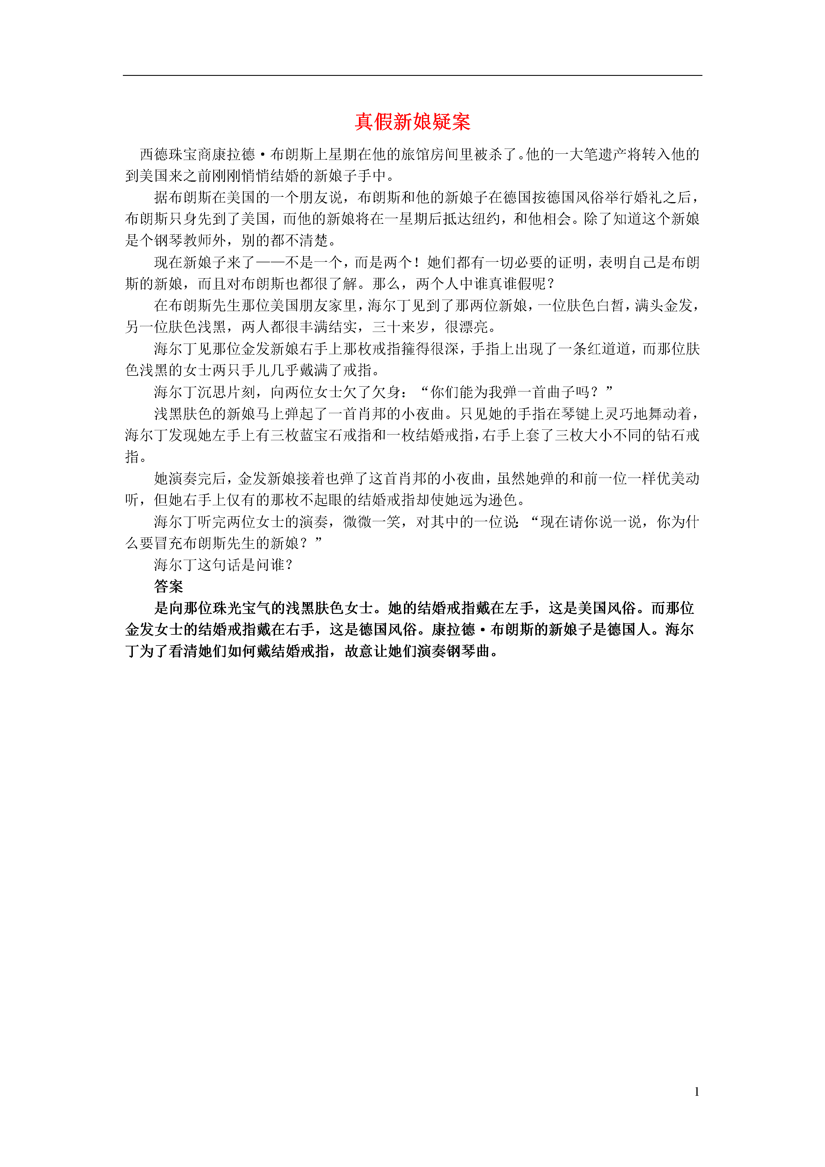 1真假新娘疑案西德珠宝商康拉德·布朗斯上星期在他的旅馆房间里被杀了。他的一大笔遗产将转入他的到美国来之前刚刚悄悄结婚的新娘子手中。据布朗斯在美国的一个朋友说,布朗斯和他的新娘子在德国按德国风俗举行婚礼之后,布朗斯只身先到了美国,而他的新娘将在一星期后抵达纽约,和他相会。除了知道这个新娘是个钢琴教师外,别的都不清楚。现在新娘子来了——不是一个,而是两个!她们都有一切必要的证明,表明自己是布朗斯的新娘,而且对布朗斯也都很了解。那么,两个人中谁真谁假呢?在布朗斯先生那位美国朋友家里,海尔丁见到了那两位新娘,一位肤色白皙,满头金发,另一位肤色浅黑,两人都很丰满结实,三十来岁,很漂亮。海尔丁见那位金发新娘右手上那枚戒指箍得很深,手指上出现了一条红道道,而那位肤色浅黑的女士两只手儿几乎戴满了戒指。海尔丁沉思片刻,向两位女士欠了欠身:“你们能为我弹一首曲子吗?”浅黑肤色的新娘马上弹起了一首肖邦的小夜曲。只见她的手指在琴键上灵巧地舞动着,海尔丁发现她左手上有三枚蓝宝石戒指和一枚结婚戒指,右手上套了三枚大小不同的钻石戒指。她演奏完后,金发新娘接着也弹了这首肖邦的小夜曲,虽然她弹的和前一位一样优美动听,但她右手上仅有的那枚不起眼的结婚戒指却使她远为逊色。海尔丁听完两位女士的演奏,微微一笑,对其中的一位说:“现在请你说一说,你为什么要冒充布朗斯先生的新娘?”海尔丁这句话是问谁?答案是向那位珠光宝气的浅黑肤色女士。她的结婚戒指戴在左手,这是美国风俗。而那位金发女士的结婚戒指戴在右手,这是德国风俗。康拉德·布朗斯的新娘子是德国人。海尔丁为了看清她们如何戴结婚戒指,故意让她们演奏钢琴曲。