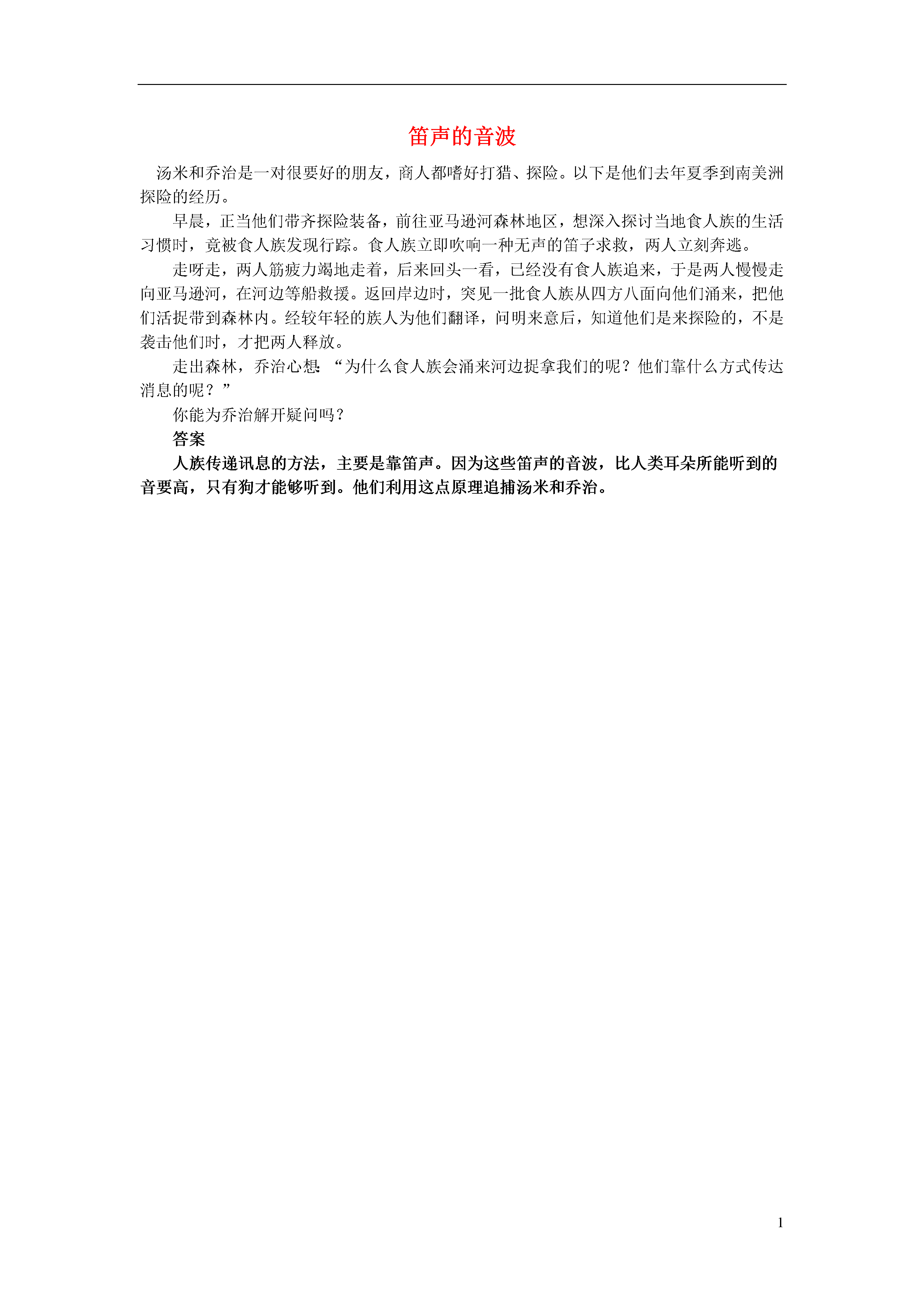 1笛声的音波汤米和乔治是一对很要好的朋友,商人都嗜好打猎、探险。以下是他们去年夏季到南美洲探险的经历。早晨,正当他们带齐探险装备,前往亚马逊河森林地区,想深入探讨当地食人族的生活习惯时,竟被食人族发现行踪。食人族立即吹响一种无声的笛子求救,两人立刻奔逃。走呀走,两人筋疲力竭地走着,后来回头一看,已经没有食人族追来,于是两人慢慢走向亚马逊河,在河边等船救援。返回岸边时,突见一批食人族从四方八面向他们涌来,把他们活捉带到森林内。经较年轻的族人为他们翻译,问明来意后,知道他们是来探险的,不是袭击他们时,才把两人释放。走出森林,乔治心想:“为什么食人族会涌来河边捉拿我们的呢?他们靠什么方式传达消息的呢?”你能为乔治解开疑问吗?答案人族传递讯息的方法,主要是靠笛声。因为这些笛声的音波,比人类耳朵所能听到的音要高,只有狗才能够听到。他们利用这点原理追捕汤米和乔治。