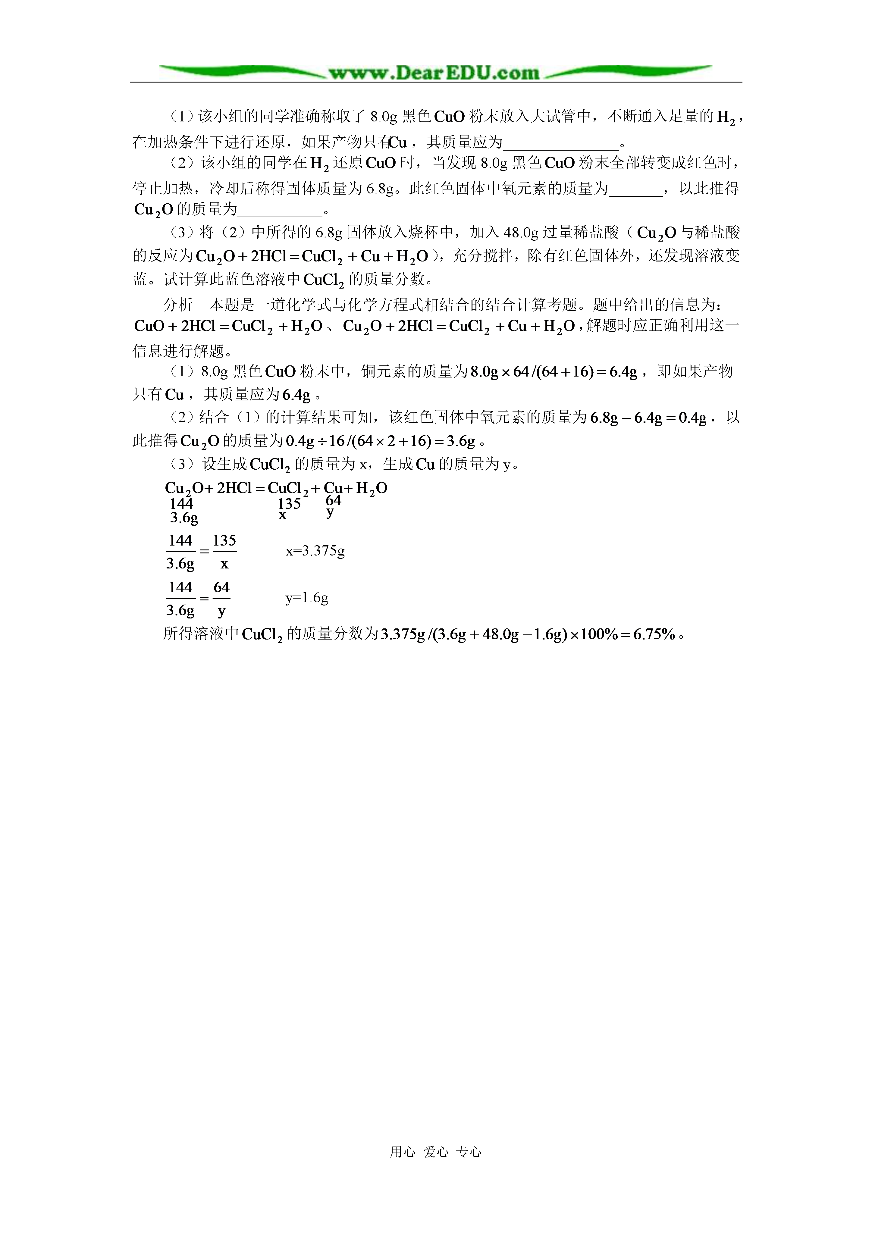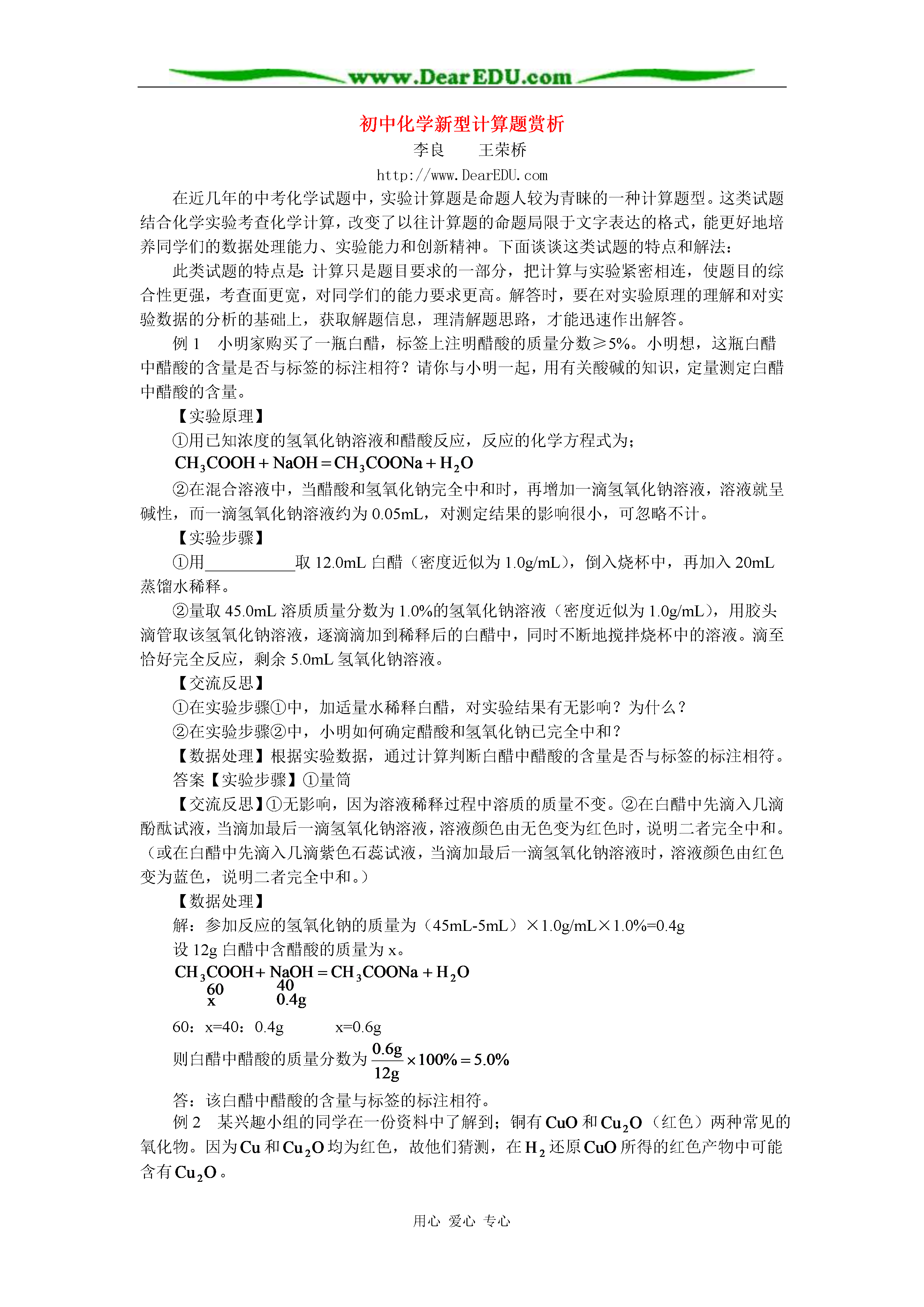 用心爱心专心初中化学新型计算题赏析李良王荣桥http://www.DearEDU.com在近几年的中考化学试题中,实验计算题是命题人较为青睐的一种计算题型。这类试题结合化学实验考查化学计算,改变了以往计算题的命题局限于文字表达的格式,能更好地培养同学们的数据处理能力、实验能力和创新精神。下面谈谈这类试题的特点和解法:此类试题的特点是:计算只是题目要求的一部分,把计算与实验紧密相连,使题目的综合性更强,考查面更宽,对同学们的能力要求更高。解答时,要在对实验原理的理解和对实验数据的分析的基础上,获取解题信息,理清解题思路,才能迅速作出解答。例1小明家购买了一瓶白醋,标签上注明醋酸的质量分数≥5%。小明想,这瓶白醋中醋酸的含量是否与标签的标注相符?请你与小明一起,用有关酸碱的知识,定量测定白醋中醋酸的含量。【实验原理】①用已知浓度的氢氧化钠溶液和醋酸反应,反应的化学方程式为;②在混合溶液中,当醋酸和氢氧化钠完全中和时,再增加一滴氢氧化钠溶液,溶液就呈碱性,而一滴氢氧化钠溶液约为0.05mL,对测定结果的影响很小,可忽略不计。【实验步骤】①用___________取12.0mL白醋(密度近似为1.0g/mL),倒入烧杯中,再加入20mL蒸馏水稀释。②量取45.0mL溶质质量分数为1.0%的氢氧化钠溶液(密度近似为1.0g/mL),用胶头滴管取该氢氧化钠溶液,逐滴滴加到稀释后的白醋中,同时不断地搅拌烧杯中的溶液。滴至恰好完全反应,剩余5.0mL氢氧化钠溶液。【交流反思】①在实验步骤①中,加适量水稀释白醋,对实验结果有无影响?为什么?②在实验步骤②中,小明如何确定醋酸和氢氧化钠已完全中和?【数据处理】根据实验数据,通过计算判断白醋中醋酸的含量是否与标签的标注相符。答案【实验步骤】①量筒【交流反思】①无影响,因为溶液稀释过程中溶质的质量不变。②在白醋中先滴入几滴酚酞试液,当滴加最后一滴氢氧化钠溶液,溶液颜色由无色变为红色时,说明二者完全中和。(或在白醋中先滴入几滴紫色石蕊试液,当滴加最后一滴氢氧化钠溶液时,溶液颜色由红色变为蓝色,说明二者完全中和。)【数据处理】解:参加反应的氢氧化钠的质量为(45mL-5mL)×1.0g/mL×1.0%=0.4g设12g白醋中含醋酸的质量为x。60:x=40:0.4gx=0.6g则白醋中醋酸的质量分数为答:该白醋中醋酸的含量与标签的标注相符。例2某兴趣小组的同学在一份资料中了解到;铜有和(红色)两种常见的氧化物。因为和均为红色,故他们猜测,在还原所得的红色产物中可能含有。(1)该小组的同学准确称取了8.0g黑色粉末放入大试管中,不断通入足量的,在加热条件下进行还原,如果产物只有,其质量应为_______________。(2)该小组的同学在还原时,当发现8.0g黑色粉末全部转变成红色时,停止加热,冷却后称得固体质量为6.8g。此红色固体中氧元素的质量为_______,以此推得的质量为___________。(3)将(2)中所得的6.8g固体放入烧杯中,加入48.0g过量稀盐酸(与稀盐酸的反应为),充分搅拌,除有红色固体外,还发现溶液变蓝。试计算此蓝色溶液中的质量分数。分析本题是一道化学式与化学方程式相结合的结合计算考题。题中给出的信息为:、,解题时应正确利用这一信息进行解题。(1)8.0g黑色粉末中,铜元素的质量为,即如果产物只有,其质量应为。(2)结合(1)的计算结果可知,该红色固体中氧元素的质量为,以此推得的质量为。(3)设生成的质量为x,生成的质量为y。x=3.375gy=1.6g所得溶液中的质量分数为。