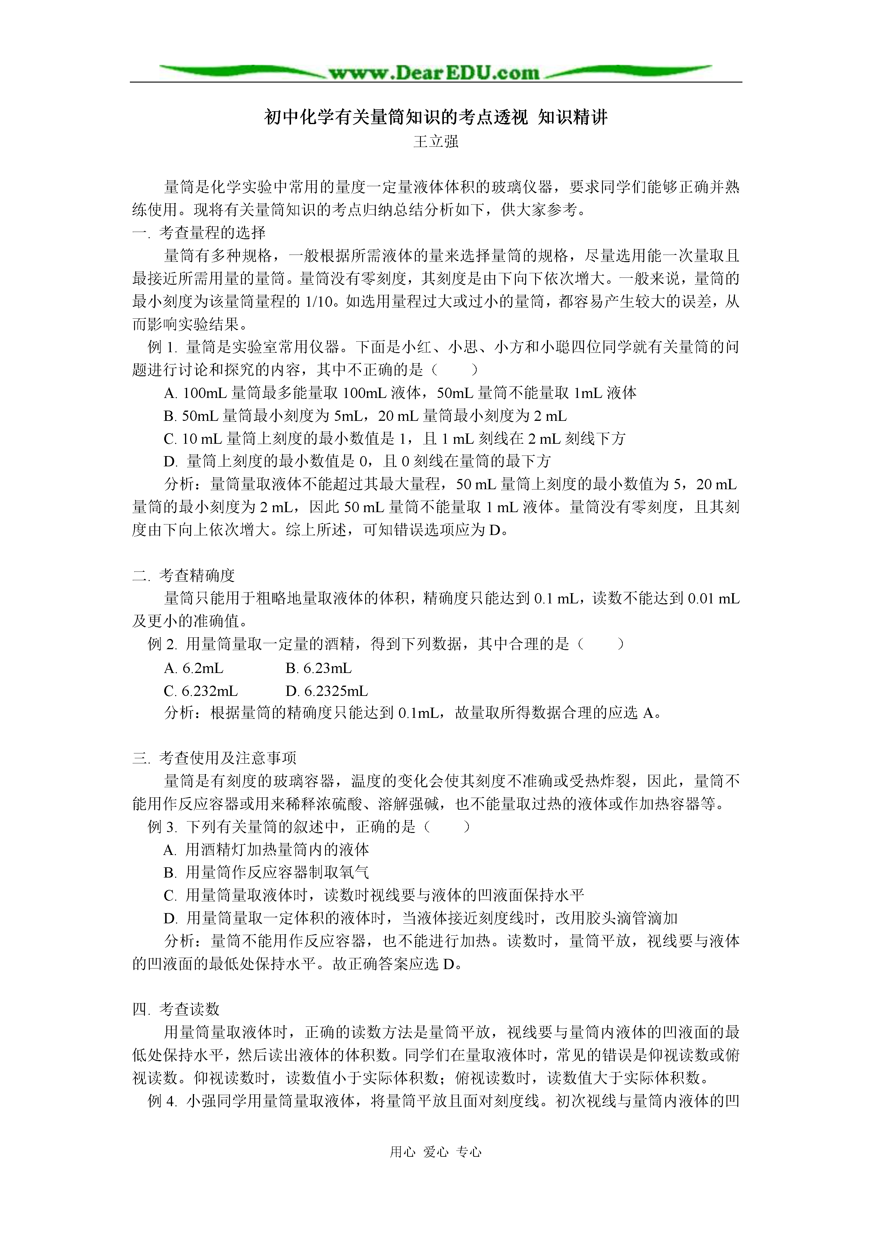 用心爱心专心初中化学有关量筒知识的考点透视知识精讲王立强量筒是化学实验中常用的量度一定量液体体积的玻璃仪器,要求同学们能够正确并熟练使用。现将有关量筒知识的考点归纳总结分析如下,供大家参考。一.考查量程的选择量筒有多种规格,一般根据所需液体的量来选择量筒的规格,尽量选用能一次量取且最接近所需用量的量筒。量筒没有零刻度,其刻度是由下向下依次增大。一般来说,量筒的最小刻度为该量筒量程的1/10。如选用量程过大或过小的量筒,都容易产生较大的误差,从而影响实验结果。例1.量筒是实验室常用仪器。下面是小红、小思、小方和小聪四位同学就有关量筒的问题进行讨论和探究的内容,其中不正确的是()A.100mL量筒最多能量取100mL液体,50mL量筒不能量取1mL液体B.50mL量筒最小刻度为5mL,20mL量筒最小刻度为2mLC.10mL量筒上刻度的最小数值是1,且1mL刻线在2mL刻线下方D.量筒上刻度的最小数值是0,且0刻线在量筒的最下方分析:量筒量取液体不能超过其最大量程,50mL量筒上刻度的最小数值为5,20mL量筒的最小刻度为2mL,因此50mL量筒不能量取1mL液体。量筒没有零刻度,且其刻度由下向上依次增大。综上所述,可知错误选项应为D。二.考查精确度量筒只能用于粗略地量取液体的体积,精确度只能达到0.1mL,读数不能达到0.01mL及更小的准确值。例2.用量筒量取一定量的酒精,得到下列数据,其中合理的是()A.6.2mLB.6.23mLC.6.232mLD.6.2325mL分析:根据量筒的精确度只能达到0.1mL,故量取所得数据合理的应选A。三.考查使用及注意事项量筒是有刻度的玻璃容器,温度的变化会使其刻度不准确或受热炸裂,因此,量筒不能用作反应容器或用来稀释浓硫酸、溶解强碱,也不能量取过热的液体或作加热容器等。例3.下列有关量筒的叙述中,正确的是()A.用酒精灯加热量筒内的液体B.用量筒作反应容器制取氧气C.用量筒量取液体时,读数时视线要与液体的凹液面保持水平D.用量筒量取一定体积的液体时,当液体接近刻度线时,改用胶头滴管滴加分析:量筒不能用作反应容器,也不能进行加热。读数时,量筒平放,视线要与液体的凹液面的最低处保持水平。故正确答案应选D。四.考查读数用量筒量取液体时,正确的读数方法是量筒平放,视线要与量筒内液体的凹液面的最低处保持水平,然后读出液体的体积数。同学们在量取液体时,常见的错误是仰视读数或俯视读数。仰视读数时,读数值小于实际体积数;俯视读数时,读数值大于实际体积数。例4.小强同学用量筒量取液体,将量筒平放且面对刻度线。初次视线与量筒内液体的凹液面的最低处保持水平,读数为20mL,倒出部分液体后,俯视凹液面的最低处,读数为5mL,则小强实际倒出液体的体积是()A.肯定等于15mLB.肯定大于15mLC.肯定小于15mLD.可能大于也可能小于15mL分析:用量筒量取液体读数时,若仰视读数,读数值小于实际体积数,若俯视读数,读数值大于实际体积数。因此实际倒出液体的体积大于。故正确答案应选B。