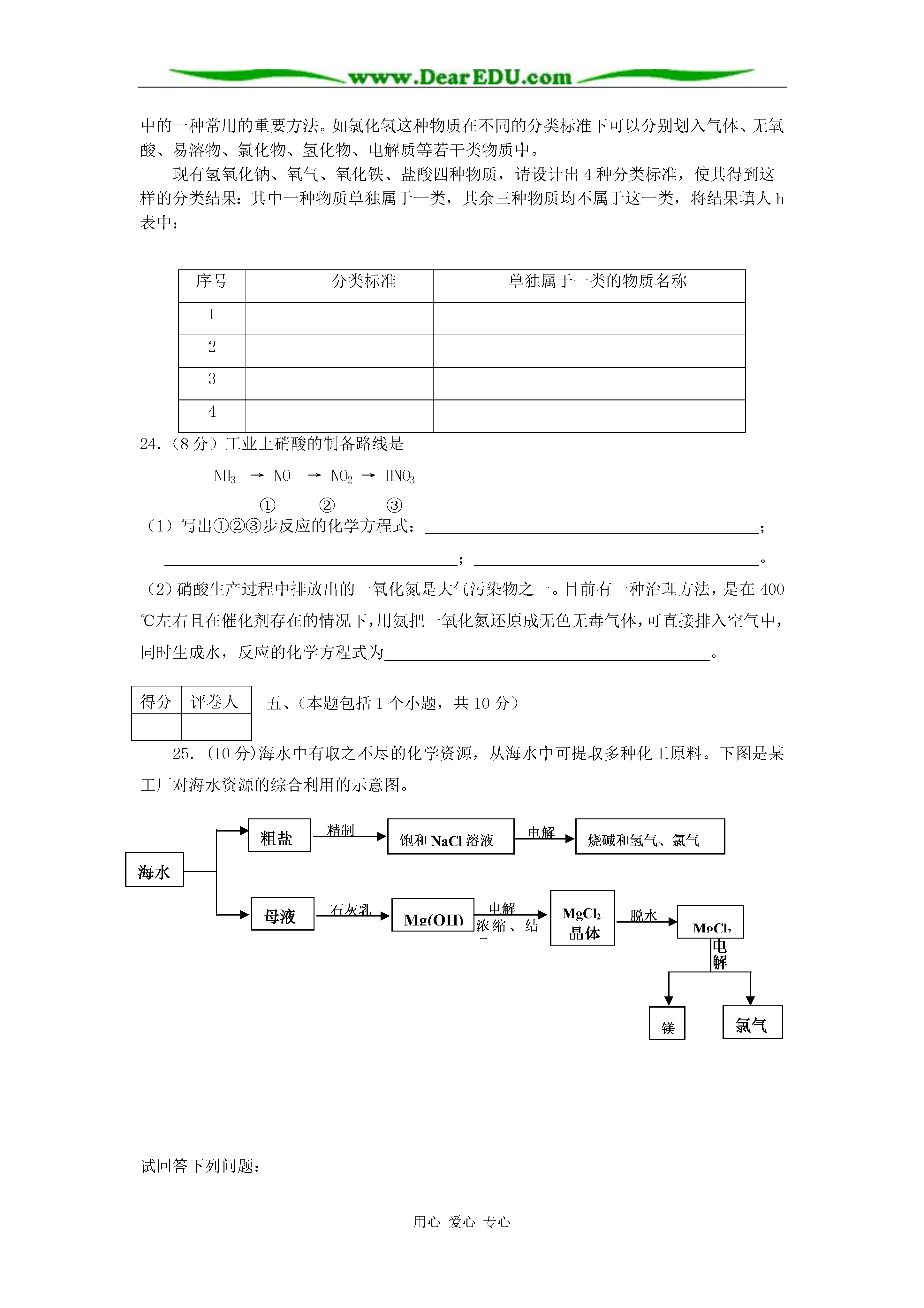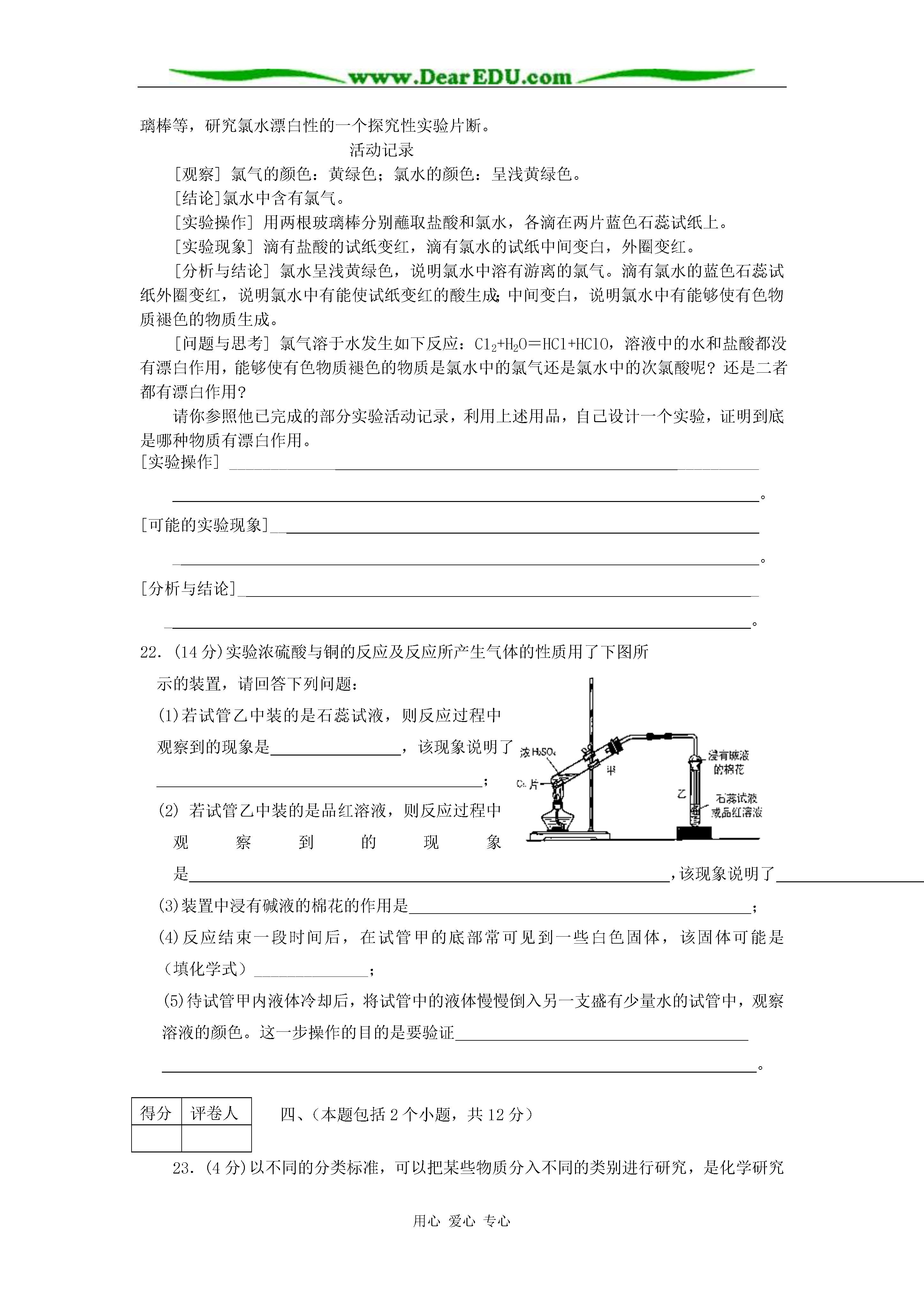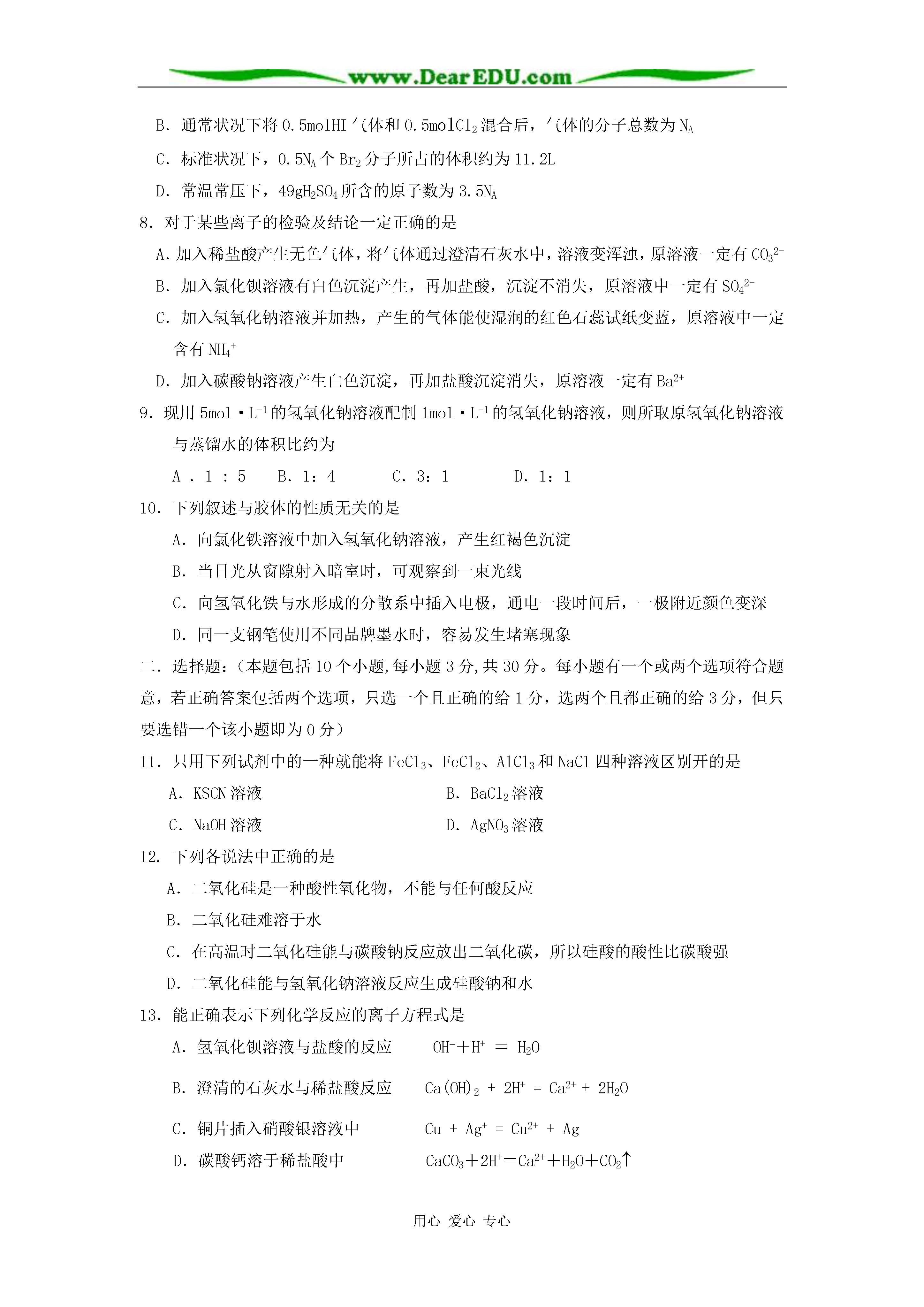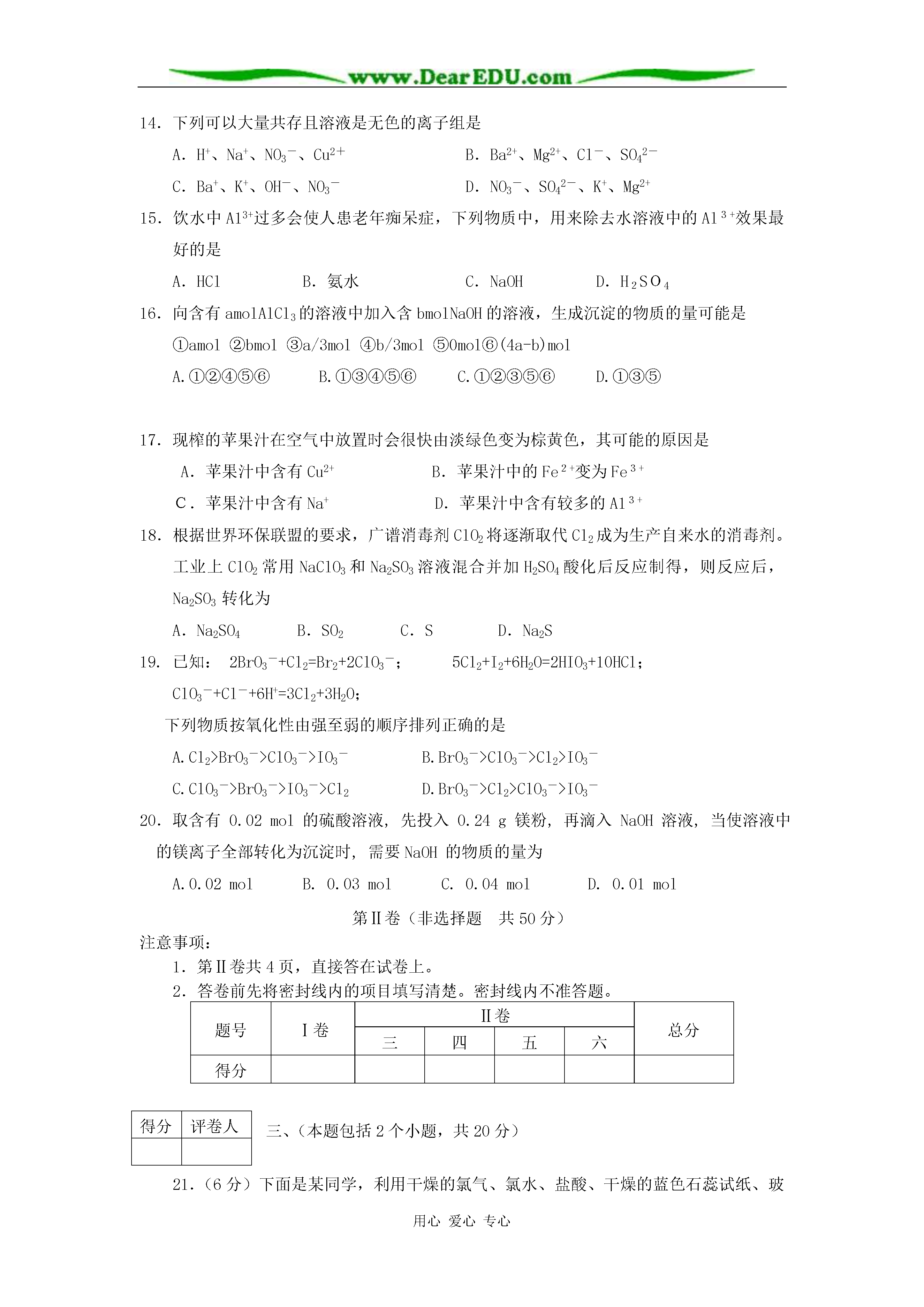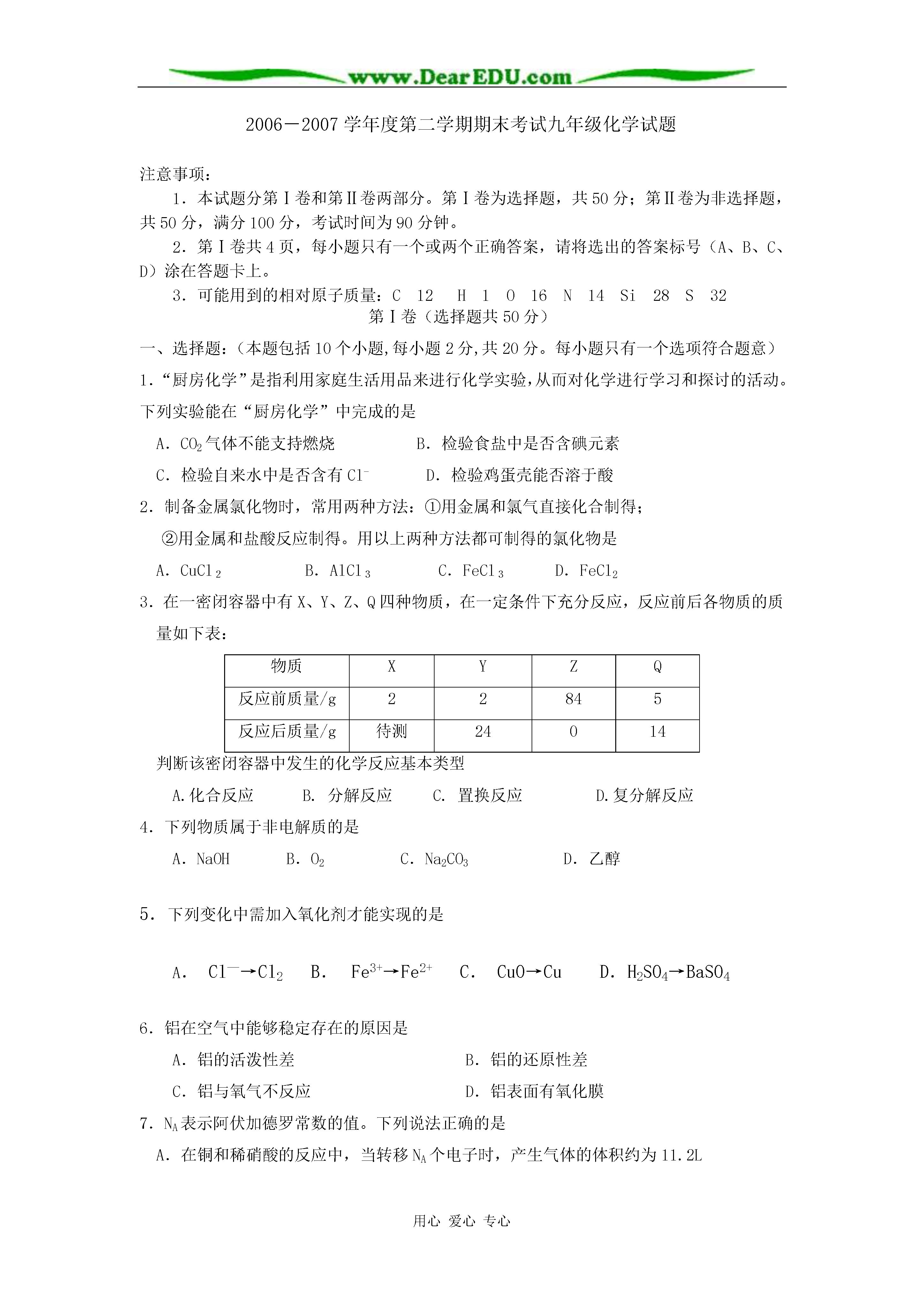 用心爱心专心2006-2007学年度第二学期期末考试九年级化学试题注意事项:1.本试题分第Ⅰ卷和第Ⅱ卷两部分。第Ⅰ卷为选择题,共50分;第Ⅱ卷为非选择题,共50分,满分100分,考试时间为90分钟。2.第Ⅰ卷,每小题只有一个或两个正确答案,请将选出的答案标号(A、B、C、D)涂在答题卡上。3.可能用到的相对原子质量:C12H1O16N14Si28S32第Ⅰ卷(选择题共50分)一、选择题:(本题包括10个小题,每小题2分,共20分。每小题只有一个选项符合题意)1.“厨房化学”是指利用家庭生活用品来进行化学实验,从而对化学进行学习和探讨的活动。下列实验能在“厨房化学”中完成的是A.CO2气体不能支持燃烧B.检验食盐中是否含碘元素C.检验自来水中是否含有Cl-D.检验鸡蛋壳能否溶于酸2.制备金属氯化物时,常用两种方法:①用金属和氯气直接化合制得;②用金属和盐酸反应制得。用以上两种方法都可制得的氯化物是A.CuCl2B.AlCl3C.FeCl3D.FeCl23.在一密闭容器中有X、Y、Z、Q四种物质,在一定条件下充分反应,反应前后各物质的质量如下表:物质XYZQ反应前质量/g22845反应后质量/g待测24014判断该密闭容器中发生的化学反应基本类型A.化合反应B.分解反应C.置换反应D.复分解反应4.下列物质属于非电解质的是A.NaOHB.O2C.Na2CO3D.乙醇5.下列变化中需加入氧化剂才能实现的是A.Cl—→Cl2B.Fe3+→Fe2+C.CuO→CuD.H2SO4→BaSO46.铝在空气中能够稳定存在的原因是A.铝的活泼性差B.铝的还原性差C.铝与氧气不反应D.铝表面有氧化膜7.NA表示阿伏加德罗常数的值。下列说法正确的是A.在铜和稀硝酸的反应中,当转移NA个电子时,产生气体的体积约为11.2LB.通常状况下将0.5molHI气体和0.5molCl2混合后,气体的分子总数为NAC.标准状况下,0.5NA个Br2分子所占的体积约为11.2LD.常温常压下,49gH2SO4所含的原子数为3.5NA8.对于某些离子的检验及结论一定正确的是A.加入稀盐酸产生无色气体,将气体通过澄清石灰水中,溶液变浑浊,原溶液一定有CO32-B.加入氯化钡溶液有白色沉淀产生,再加盐酸,沉淀不消失,原溶液中一定有SO42-C.加入氢氧化钠溶液并加热,产生的气体能使湿润的红色石蕊试纸变蓝,原溶液中一定含有NH4+D.加入碳酸钠溶液产生白色沉淀,再加盐酸沉淀消失,原溶液一定有Ba2+9.现用5mol·L-1的氢氧化钠溶液配制1mol·L-1的氢氧化钠溶液,则所取原氢氧化钠溶液与蒸馏水的体积比约为A.1:5B.1:4C.3:1D.1:110.下列叙述与胶体的性质无关的是A.向氯化铁溶液中加入氢氧化钠溶液,产生红褐色沉淀B.当日光从窗隙射入暗室时,可观察到一束光线C.向氢氧化铁与水形成的分散系中插入电极,通电一段时间后,一极附近颜色变深D.同一支钢笔使用不同品牌墨水时,容易发生堵塞现象二.选择题:(本题包括10个小题,每小题3分,共30分。每小题有一个或两个选项符合题意,若正确答案包括两个选项,只选一个且正确的给1分,选两个且都正确的给3分,但只要选错一个该小题即为0分)11.只用下列试剂中的一种就能将FeCl3、FeCl2、AlCl3和NaCl四种溶液区别开的是A.KSCN溶液B.BaCl2溶液C.NaOH溶液D.AgNO3溶液12.下列各说法中正确的是A.二氧化硅是一种酸性氧化物,不能与任何酸反应B.二氧化硅难溶于水C.在高温时二氧化硅能与碳酸钠反应放出二氧化碳,所以硅酸的酸性比碳酸强D.二氧化硅能与氢氧化钠溶液反应生成硅酸钠和水13.能正确表示下列化学反应的离子方程式是A.氢氧化钡溶液与盐酸的反应OH+H+=H2OB.澄清的石灰水与稀盐酸反应Ca(OH)2+2H+=Ca2++2H2OC.铜片插入硝酸银溶液中Cu+Ag+=Cu2++AgD.碳酸钙溶于稀盐酸中CaCO3+2H+=Ca2++H2O+CO214.下列可以大量共存且溶液是无色的离子组是A.H+、Na+、NO3-、Cu2+B.Ba2+、Mg2+、Cl-、SO42-C.Ba+、K+、OH-、NO3-D.NO3-、SO42-、K+、Mg2+15.饮水中A13+过多会使人患老年痴呆症,下列物质中,用来除去水溶液中的Al3+效果最好的是A.HClB.氨水C.NaOHD.H2SO416.向含有amolAlCl3的溶液中加入含bmolNaOH的溶液,生成沉淀的物质的量可能是①amol②bmol③a/3mol④b/3mol⑤0mol⑥(4a-b)molA.①②④⑤⑥