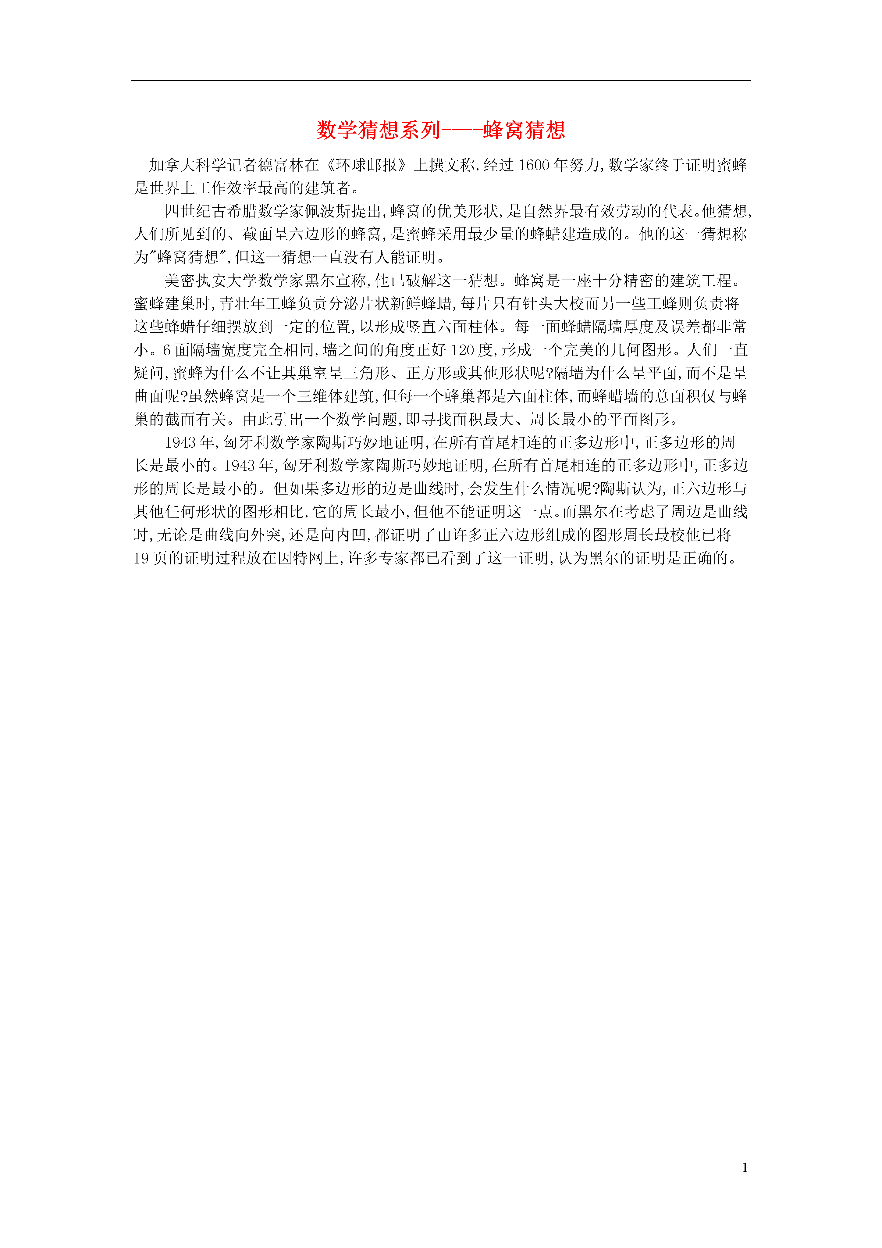 1数学猜想系列----蜂窝猜想加拿大科学记者德富林在《环球邮报》上撰文称,经过1600年努力,数学家终于证明蜜蜂是世界上工作效率最高的建筑者。四世纪古希腊数学家佩波斯提出,蜂窝的优美形状,是自然界最有效劳动的代表。他猜想,人们所见到的、截面呈六边形的蜂窝,是蜜蜂采用最少量的蜂蜡建造成的。他的这一猜想称为"蜂窝猜想",但这一猜想一直没有人能证明。美密执安大学数学家黑尔宣称,他已破解这一猜想。蜂窝是一座十分精密的建筑工程。蜜蜂建巢时,青壮年工蜂负责分泌片状新鲜蜂蜡,每片只有针头大校而另一些工蜂则负责将这些蜂蜡仔细摆放到一定的位置,以形成竖直六面柱体。每一面蜂蜡隔墙厚度及误差都非常小。6面隔墙宽度完全相同,墙之间的角度正好120度,形成一个完美的几何图形。人们一直疑问,蜜蜂为什么不让其巢室呈三角形、正方形或其他形状呢?隔墙为什么呈平面,而不是呈曲面呢?虽然蜂窝是一个三维体建筑,但每一个蜂巢都是六面柱体,而蜂蜡墙的总面积仅与蜂巢的截面有关。由此引出一个数学问题,即寻找面积最大、周长最小的平面图形。1943年,匈牙利数学家陶斯巧妙地证明,在所有首尾相连的正多边形中,正多边形的周长是最小的。1943年,匈牙利数学家陶斯巧妙地证明,在所有首尾相连的正多边形中,正多边形的周长是最小的。但如果多边形的边是曲线时,会发生什么情况呢?陶斯认为,正六边形与其他任何形状的图形相比,它的周长最小,但他不能证明这一点。而黑尔在考虑了周边是曲线时,无论是曲线向外突,还是向内凹,都证明了由许多正六边形组成的图形周长最校他已将19页的证明过程放在因特网上,许多专家都已看到了这一证明,认为黑尔的证明是正确的。