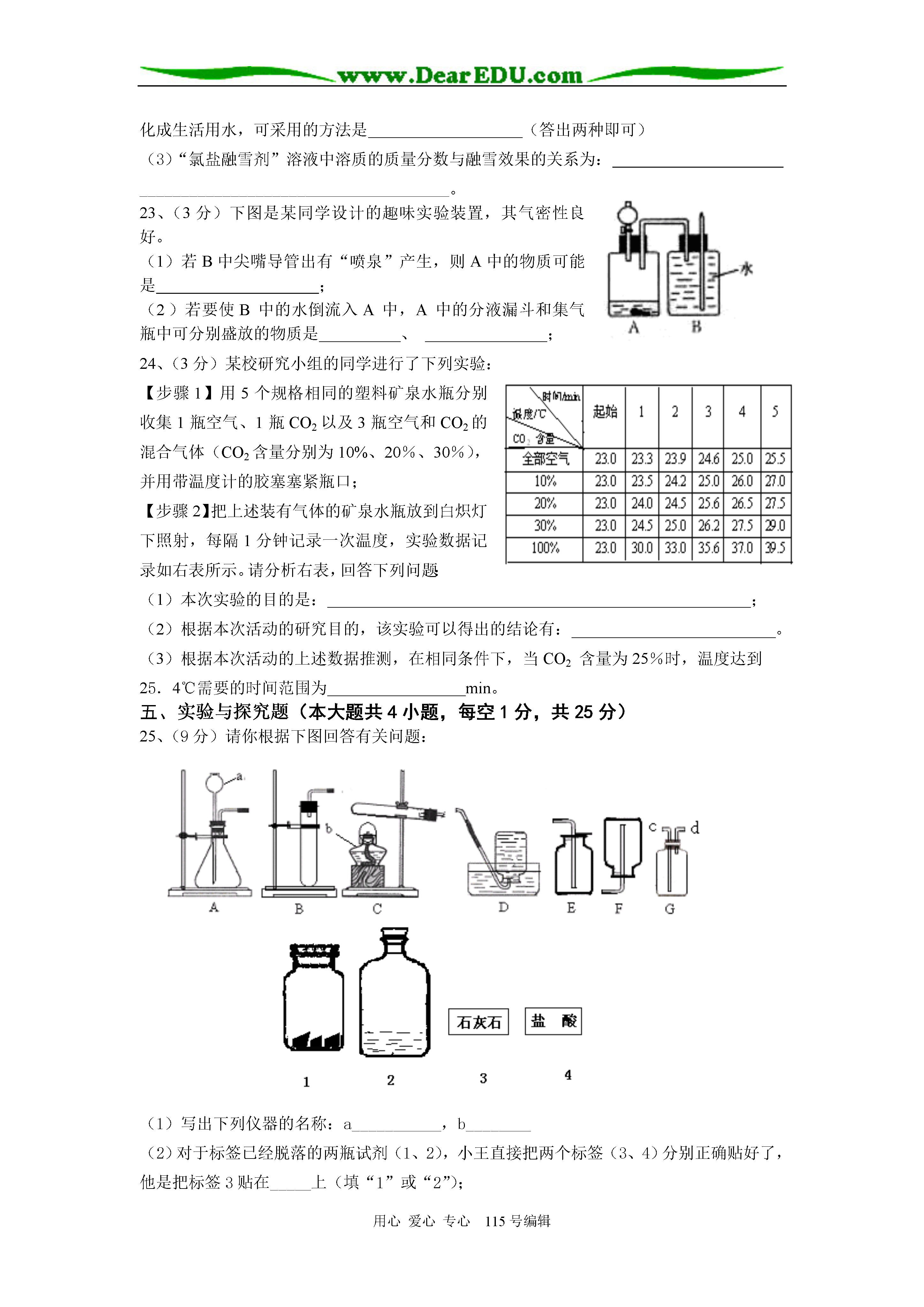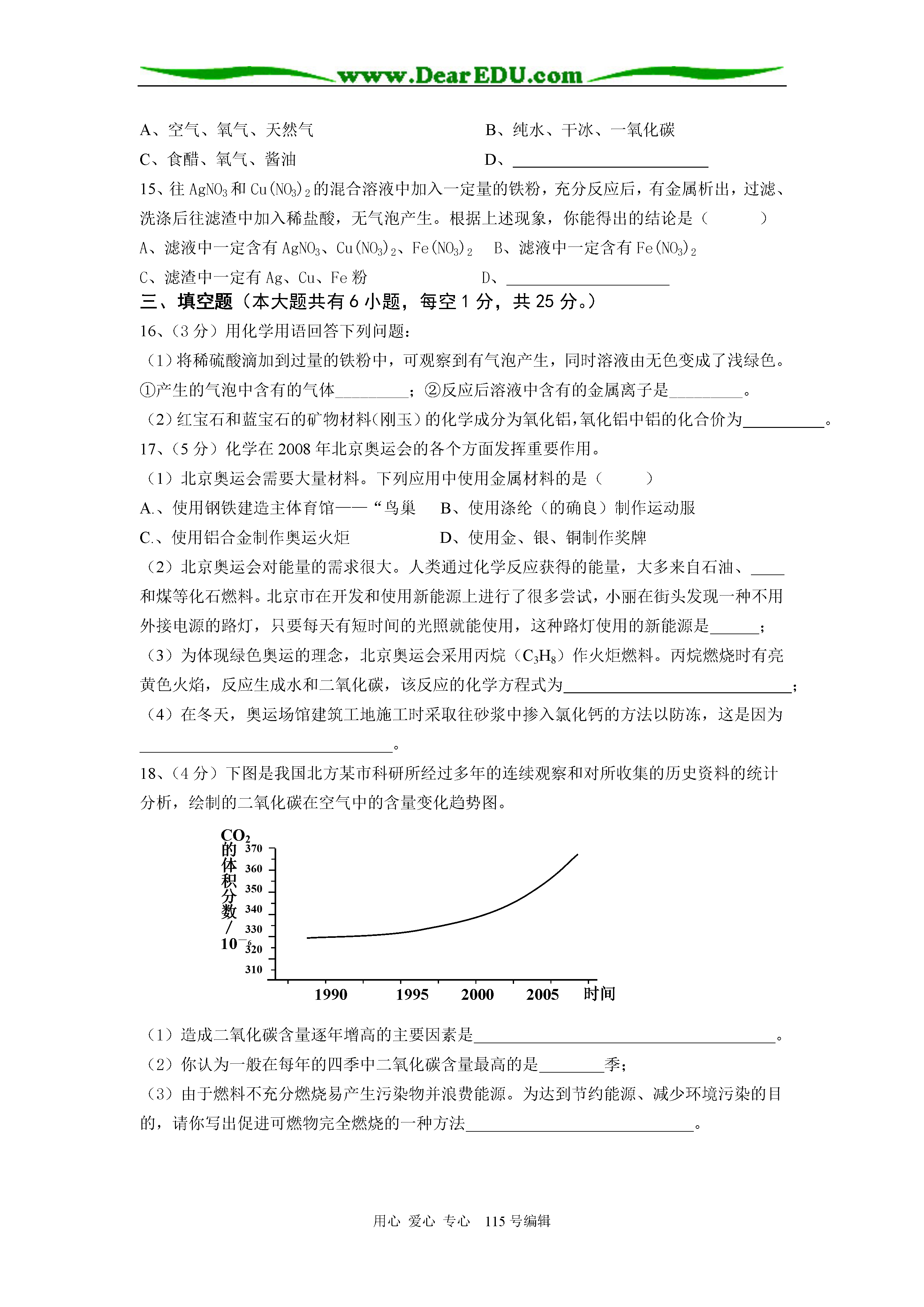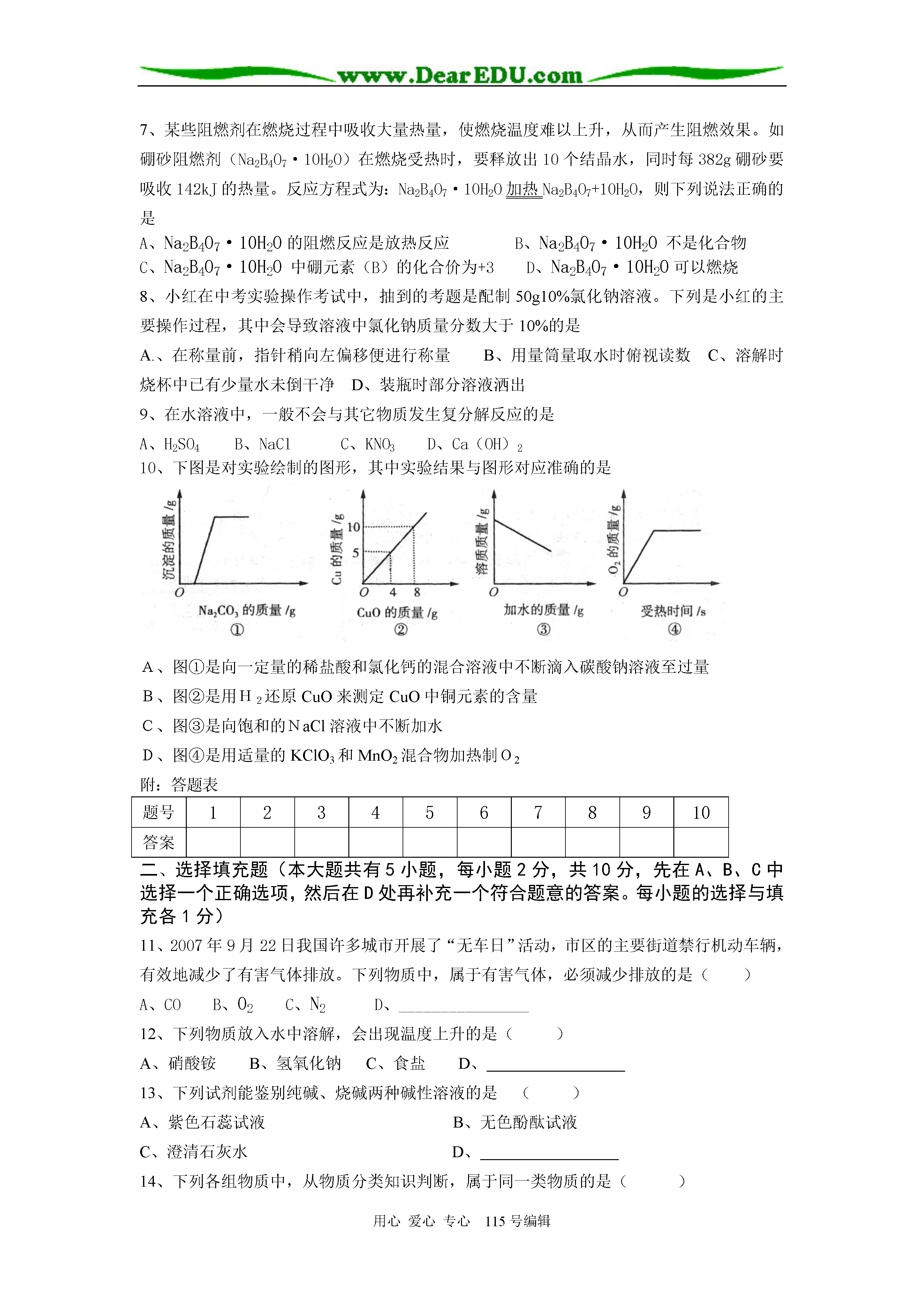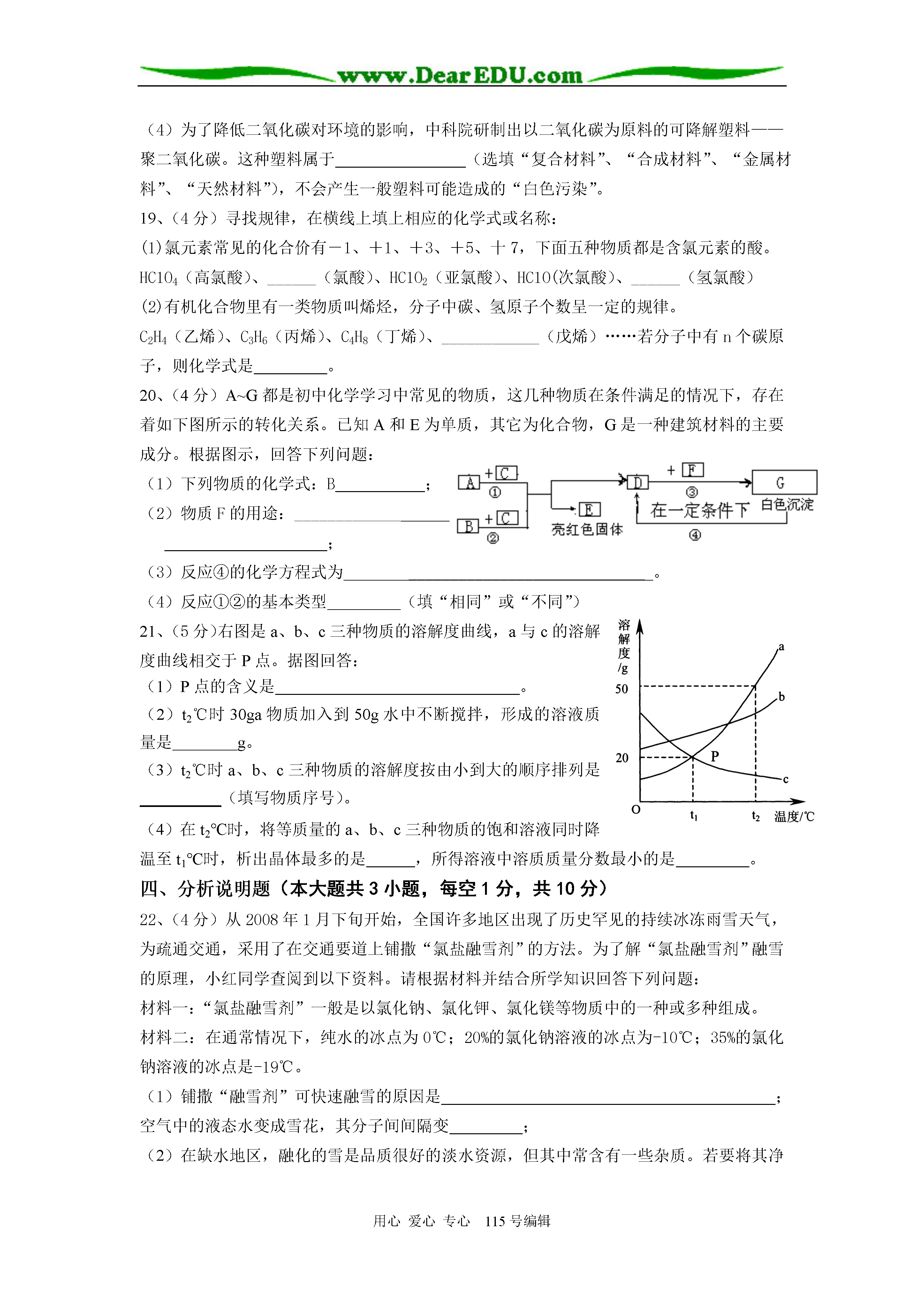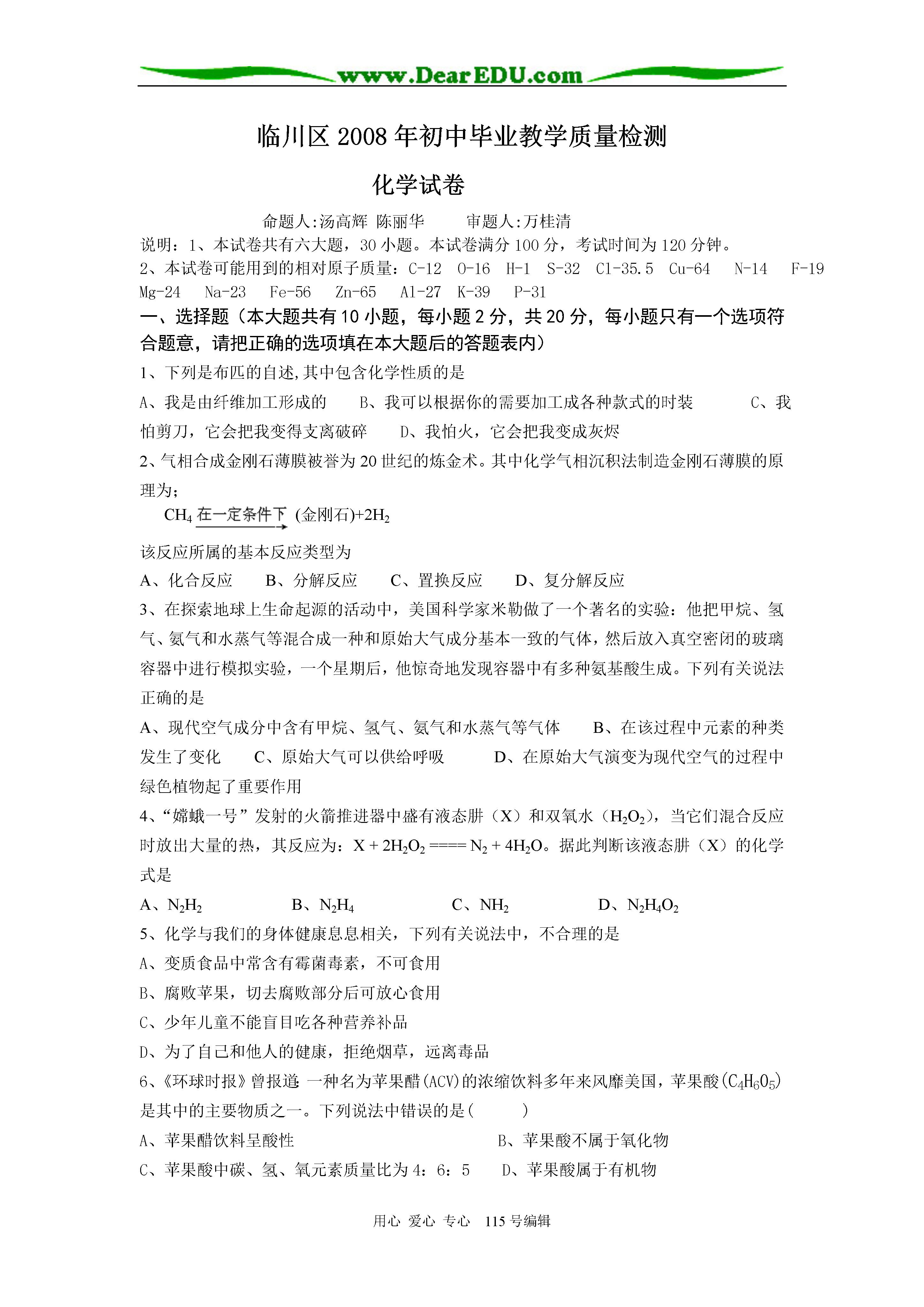 用心爱心专心115号编辑临川区2008年初中毕业教学质量检测化学试卷命题人:汤高辉陈丽华审题人:万桂清说明:1、本试卷共有六大题,30小题。本试卷满分100分,考试时间为120分钟。2、本试卷可能用到的相对原子质量:C-12O-16H-1S-32Cl-35.5Cu-64N-14F-19Mg-24Na-23Fe-56Zn-65Al-27K-39P-31一、选择题(本大题共有10小题,每小题2分,共20分,每小题只有一个选项符合题意,请把正确的选项填在本大题后的答题表内)1、下列是布匹的自述,其中包含化学性质的是A、我是由纤维加工形成的B、我可以根据你的需要加工成各种款式的时装C、我怕剪刀,它会把我变得支离破碎D、我怕火,它会把我变成灰烬2、气相合成金刚石薄膜被誉为20世纪的炼金术。其中化学气相沉积法制造金刚石薄膜的原理为;CH4(金刚石)+2H2该反应所属的基本反应类型为A、化合反应B、分解反应C、置换反应D、复分解反应3、在探索地球上生命起源的活动中,美国科学家米勒做了一个著名的实验:他把甲烷、氢气、氨气和水蒸气等混合成一种和原始大气成分基本一致的气体,然后放入真空密闭的玻璃容器中进行模拟实验,一个星期后,他惊奇地发现容器中有多种氨基酸生成。下列有关说法正确的是A、现代空气成分中含有甲烷、氢气、氨气和水蒸气等气体B、在该过程中元素的种类发生了变化C、原始大气可以供给呼吸D、在原始大气演变为现代空气的过程中绿色植物起了重要作用4、“嫦蛾一号”发射的火箭推进器中盛有液态肼(X)和双氧水(H2O2),当它们混合反应时放出大量的热,其反应为:X+2H2O2====N2+4H2O。据此判断该液态肼(X)的化学式是A、N2H2B、N2H4C、NH2D、N2H4O25、化学与我们的身体健康息息相关,下列有关说法中,不合理的是A、变质食品中常含有霉菌毒素,不可食用B、腐败苹果,切去腐败部分后可放心食用C、少年儿童不能盲目吃各种营养补品D、为了自己和他人的健康,拒绝烟草,远离毒品6、《环球时报》曾报道:一种名为苹果醋(ACV)的浓缩饮料多年来风靡美国,苹果酸(C4H605)是其中的主要物质之一。下列说法中错误的是()A、苹果醋饮料呈酸性B、苹果酸不属于氧化物C、苹果酸中碳、氢、氧元素质量比为4:6:5D、苹果酸属于有机物7、某些阻燃剂在燃烧过程中吸收大量热量,使燃烧温度难以上升,从而产生阻燃效果。如硼砂阻燃剂(Na2B4O7·10H2O)在燃烧受热时,要释放出10个结晶水,同时每382g硼砂要吸收142kJ的热量。反应方程式为:Na2B4O7·10H2O加热Na2B4O7+10H2O,则下列说法正确的是A、Na2B4O7·10H2O的阻燃反应是放热反应B、Na2B4O7·10H2O不是化合物C、Na2B4O7·10H2O中硼元素(B)的化合价为+3D、Na2B4O7·10H2O可以燃烧8、小红在中考实验操作考试中,抽到的考题是配制50g10%氯化钠溶液。下列是小红的主要操作过程,其中会导致溶液中氯化钠质量分数大于10%的是A.、在称量前,指针稍向左偏移便进行称量B、用量筒量取水时俯视读数C、溶解时烧杯中已有少量水未倒干净D、装瓶时部分溶液洒出9、在水溶液中,一般不会与其它物质发生复分解反应的是A、H2SO4B、NaClC、KNO3D、Ca(OH)210、下图是对实验绘制的图形,其中实验结果与图形对应准确的是A、图①是向一定量的稀盐酸和氯化钙的混合溶液中不断滴入碳酸钠溶液至过量B、图②是用H2还原CuO来测定CuO中铜元素的含量C、图③是向饱和的NaCl溶液中不断加水D、图④是用适量的KClO3和MnO2混合物加热制O2附:答题表题号12345678910答案二、选择填充题(本大题共有5小题,每小题2分,共10分,先在A、B、C中选择一个正确选项,然后在D处再补充一个符合题意的答案。每小题的选择与填充各1分)11、2007年9月22日我国许多城市开展了“无车日”活动,市区的主要街道禁行机动车辆,有效地减少了有害气体排放。下列物质中,属于有害气体,必须减少排放的是()A、COB、O2C、N2D、________________12、下列物质放入水中溶解,会出现温度上升的是()A、硝酸铵B、氢氧化钠C、食盐D、13、下列试剂能鉴别纯碱、烧碱两种碱性溶液的是()A、紫色石蕊试液B、无色酚酞试液C、澄清石灰水D、14、下列各组物质中,从物质分类知识判断,属于同一类物质的是()A、空气、氧气、天然气B、纯水、干冰、一氧化碳C、食醋、氧气、酱油D、15、往AgNO3和Cu(NO3)2的混合溶液中加入一定量的铁粉,充分反应后,有金属析出,过