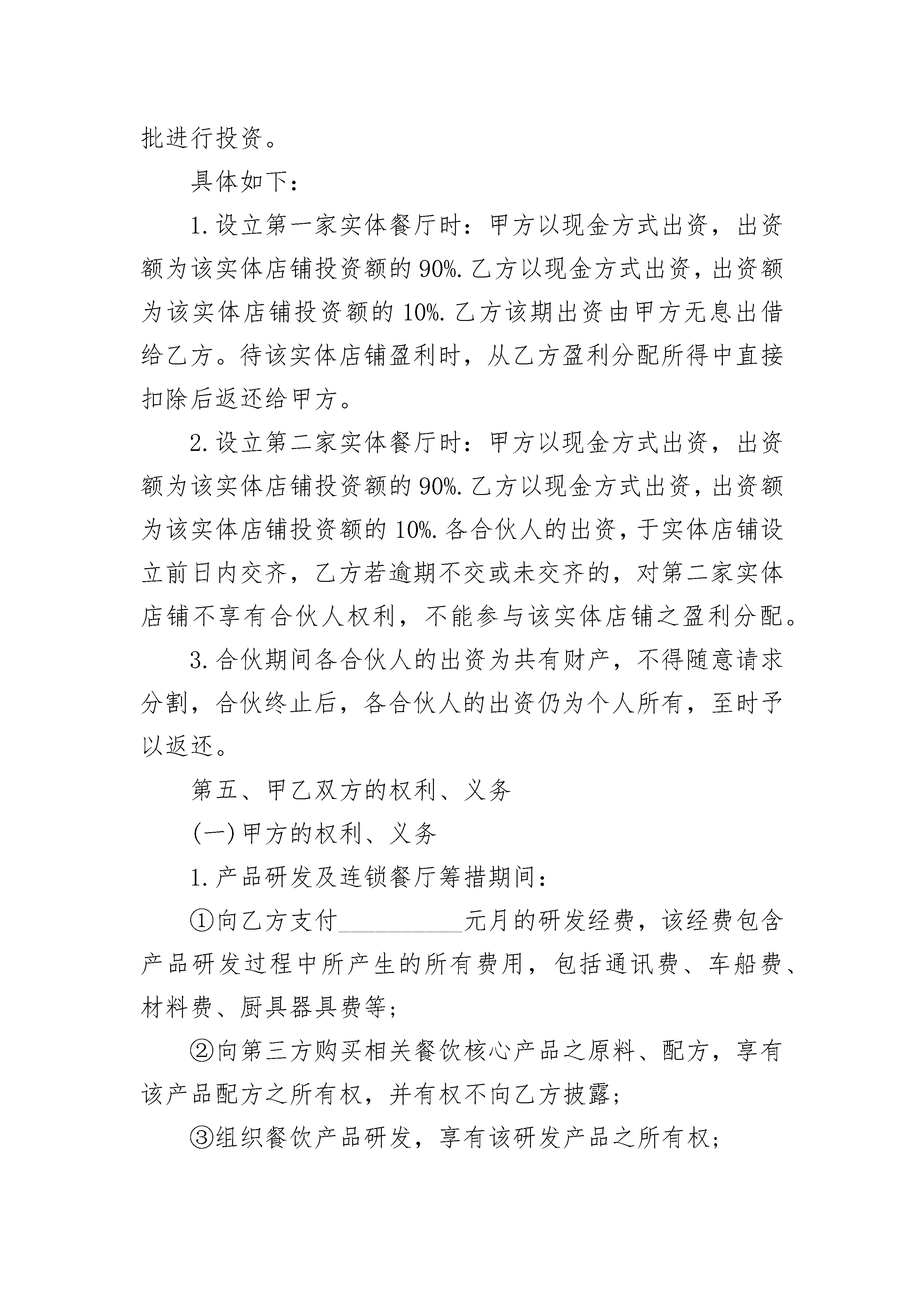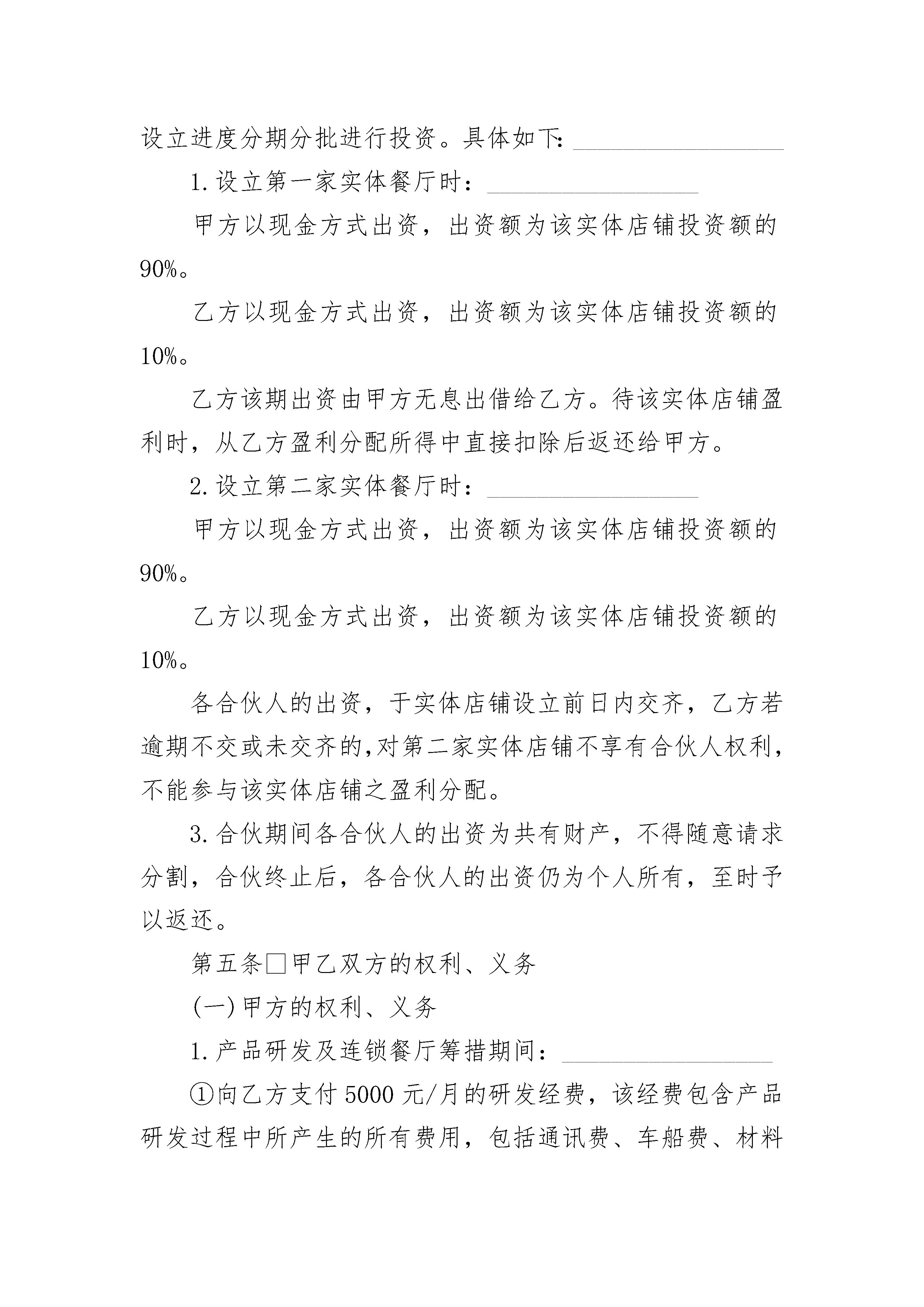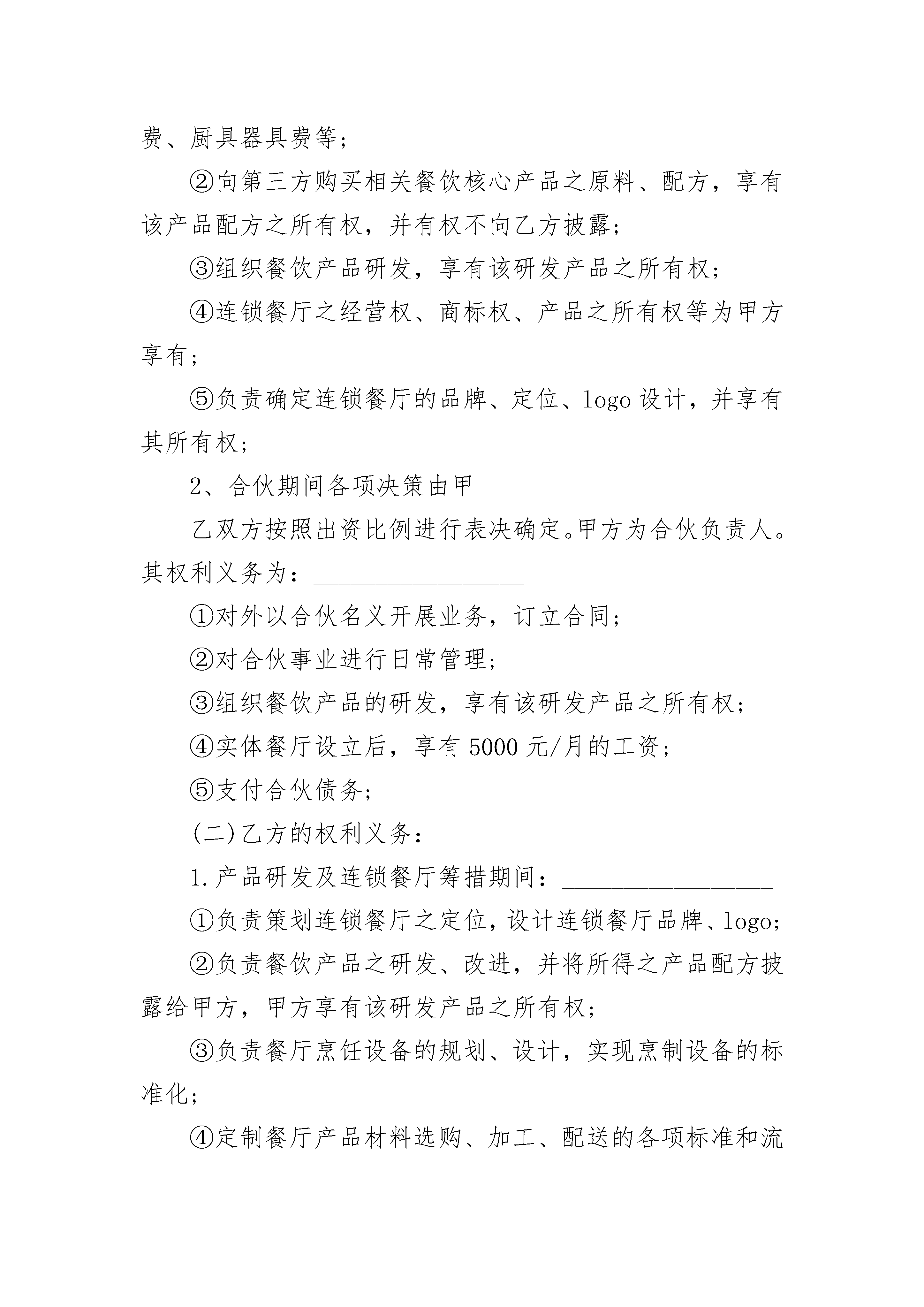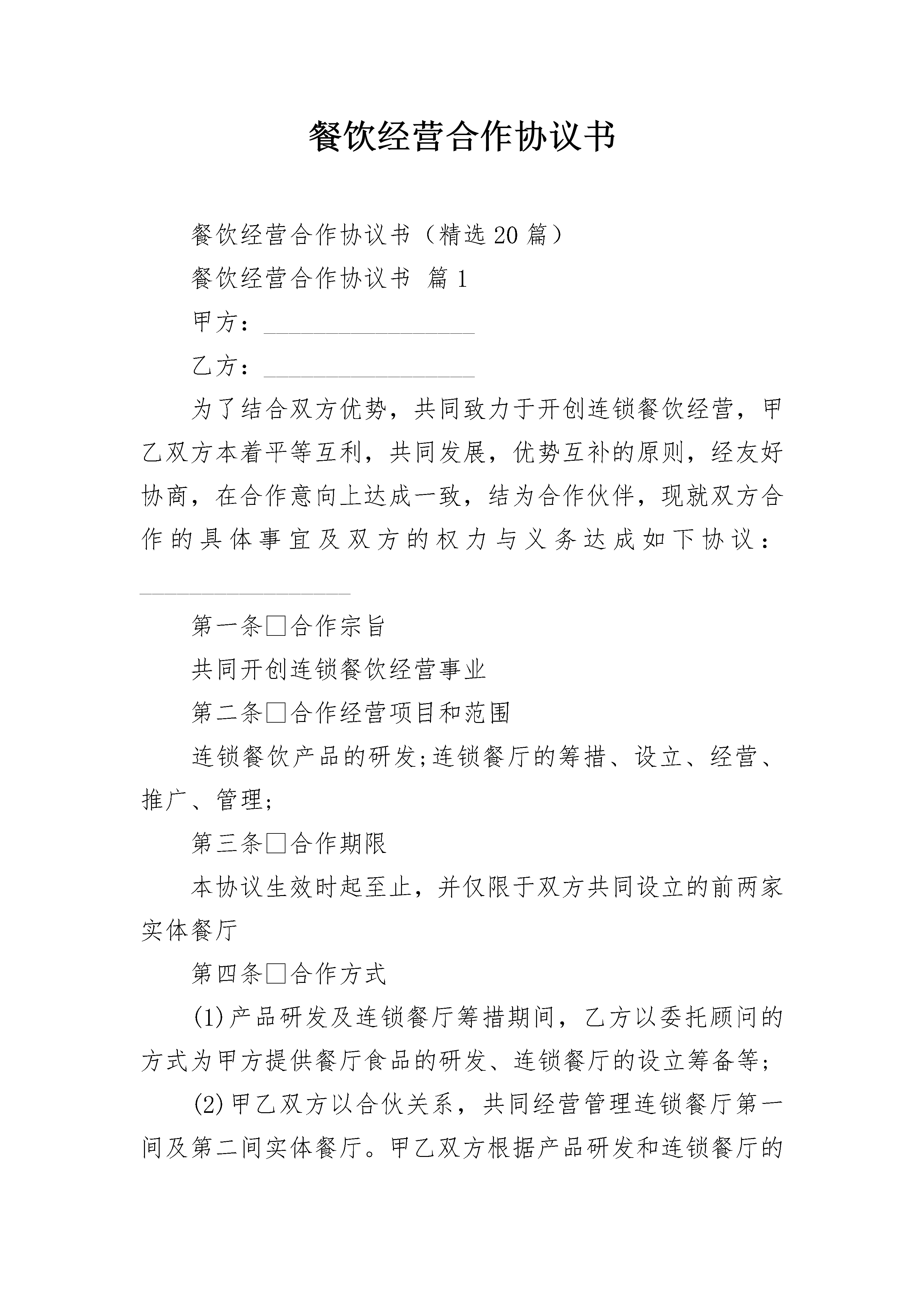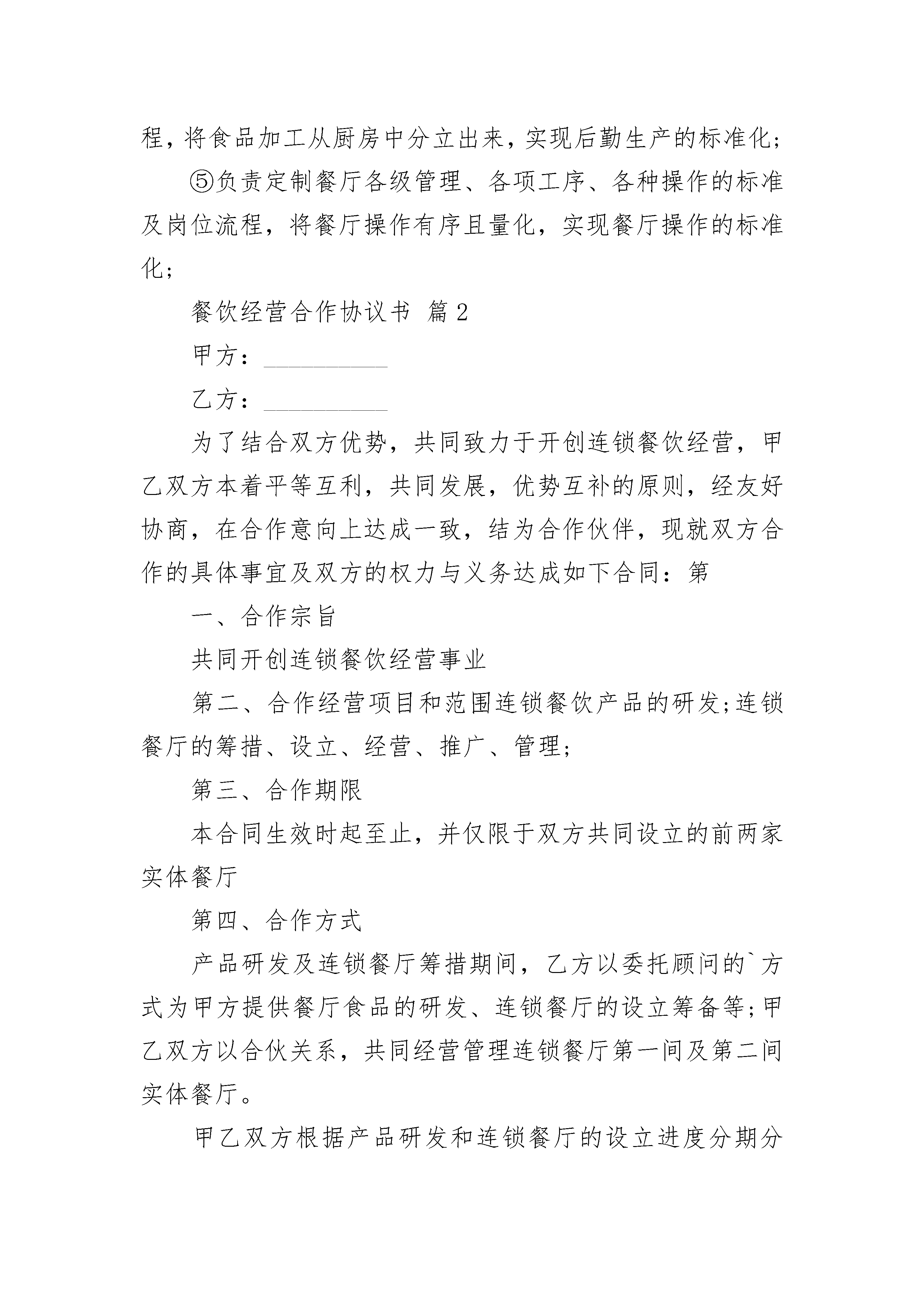 餐饮经营合作协议书餐饮经营合作协议书(精选20篇)餐饮经营合作协议书篇1甲方:_________________乙方:_________________为了结合双方优势,共同致力于开创连锁餐饮经营,甲乙双方本着平等互利,共同发展,优势互补的原则,经友好协商,在合作意向上达成一致,结为合作伙伴,现就双方合作的具体事宜及双方的权力与义务达成如下协议:_________________第一条合作宗旨共同开创连锁餐饮经营事业第二条合作经营项目和范围连锁餐饮产品的研发;连锁餐厅的筹措、设立、经营、推广、管理;第三条合作期限本协议生效时起至止,并仅限于双方共同设立的前两家实体餐厅第四条合作方式(1)产品研发及连锁餐厅筹措期间,乙方以委托顾问的方式为甲方提供餐厅食品的研发、连锁餐厅的设立筹备等;(2)甲乙双方以合伙关系,共同经营管理连锁餐厅第一间及第二间实体餐厅。甲乙双方根据产品研发和连锁餐厅的设立进度分期分批进行投资。具体如下:_________________1.设立第一家实体餐厅时:_________________甲方以现金方式出资,出资额为该实体店铺投资额的90%。乙方以现金方式出资,出资额为该实体店铺投资额的10%。乙方该期出资由甲方无息出借给乙方。待该实体店铺盈利时,从乙方盈利分配所得中直接扣除后返还给甲方。2.设立第二家实体餐厅时:_________________甲方以现金方式出资,出资额为该实体店铺投资额的90%。乙方以现金方式出资,出资额为该实体店铺投资额的10%。各合伙人的出资,于实体店铺设立前日内交齐,乙方若逾期不交或未交齐的,对第二家实体店铺不享有合伙人权利,不能参与该实体店铺之盈利分配。3.合伙期间各合伙人的出资为共有财产,不得随意请求分割,合伙终止后,各合伙人的出资仍为个人所有,至时予以返还。第五条甲乙双方的权利、义务(一)甲方的权利、义务1.产品研发及连锁餐厅筹措期间:_________________①向乙方支付5000元/月的研发经费,该经费包含产品研发过程中所产生的所有费用,包括通讯费、车船费、材料费、厨具器具费等;②向第三方购买相关餐饮核心产品之原料、配方,享有该产品配方之所有权,并有权不向乙方披露;③组织餐饮产品研发,享有该研发产品之所有权;④连锁餐厅之经营权、商标权、产品之所有权等为甲方享有;⑤负责确定连锁餐厅的品牌、定位、logo设计,并享有其所有权;2、合伙期间各项决策由甲乙双方按照出资比例进行表决确定。甲方为合伙负责人。其权利义务为:_________________①对外以合伙名义开展业务,订立合同;②对合伙事业进行日常管理;③组织餐饮产品的研发,享有该研发产品之所有权;④实体餐厅设立后,享有5000元/月的工资;⑤支付合伙债务;(二)乙方的权利义务:_________________1.产品研发及连锁餐厅筹措期间:_________________①负责策划连锁餐厅之定位,设计连锁餐厅品牌、logo;②负责餐饮产品之研发、改进,并将所得之产品配方披露给甲方,甲方享有该研发产品之所有权;③负责餐厅烹饪设备的规划、设计,实现烹制设备的标准化;④定制餐厅产品材料选购、加工、配送的各项标准和流程,将食品加工从厨房中分立出来,实现后勤生产的标准化;⑤负责定制餐厅各级管理、各项工序、各种操作的标准及岗位流程,将餐厅操作有序且量化,实现餐厅操作的标准化;餐饮经营合作协议书篇2甲方:__________乙方:__________为了结合双方优势,共同致力于开创连锁餐饮经营,甲乙双方本着平等互利,共同发展,优势互补的原则,经友好协商,在合作意向上达成一致,结为合作伙伴,现就双方合作的具体事宜及双方的权力与义务达成如下合同:第一、合作宗旨共同开创连锁餐饮经营事业第二、合作经营项目和范围连锁餐饮产品的研发;连锁餐厅的筹措、设立、经营、推广、管理;第三、合作期限本合同生效时起至止,并仅限于双方共同设立的前两家实体餐厅第四、合作方式产品研发及连锁餐厅筹措期间,乙方以委托顾问的`方式为甲方提供餐厅食品的研发、连锁餐厅的设立筹备等;甲乙双方以合伙关系,共同经营管理连锁餐厅第一间及第二间实体餐厅。甲乙双方根据产品研发和连锁餐厅的设立进度分期分批进行投资。具体如下:1.设立第一家实体餐厅时:甲方以现金方式出资,出资额为该实体店铺投资额的90%.乙方以现金方式出资,出资额为该实体店铺投资额的10%.乙方该期出资由甲方无息出借给乙方。待该实体店铺盈利时,从乙方盈利分配所得中直接扣除后返还给甲方。2.设立第二家实体餐厅时:甲方以现金方式出资,出资额为该实体店铺投资额的90%.乙方以现金方式出资,出资额为该实体店铺投资额的10%.各合伙人的出资,于实体店铺设立前日内交齐,乙方若逾期不交或未交齐的,对第二家实体店铺