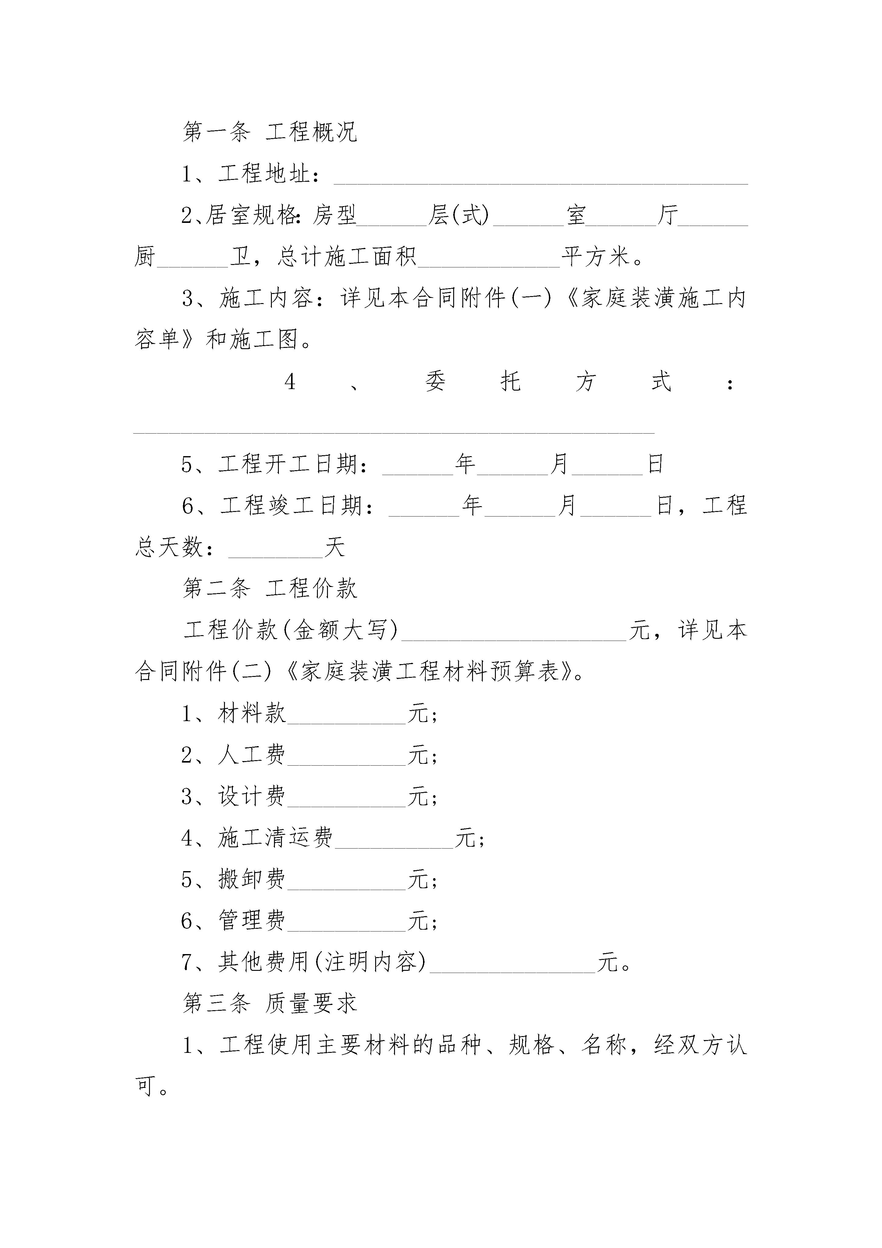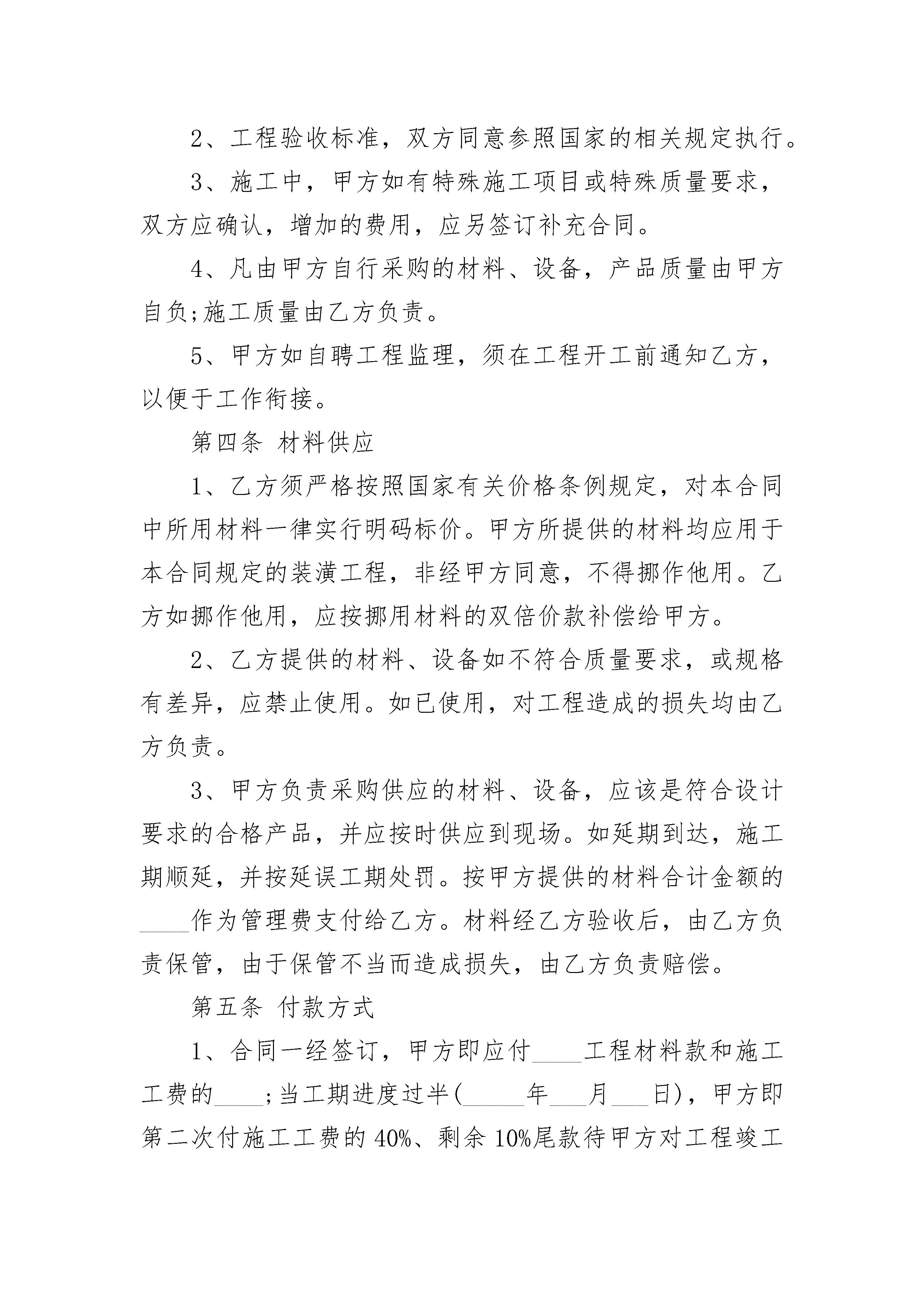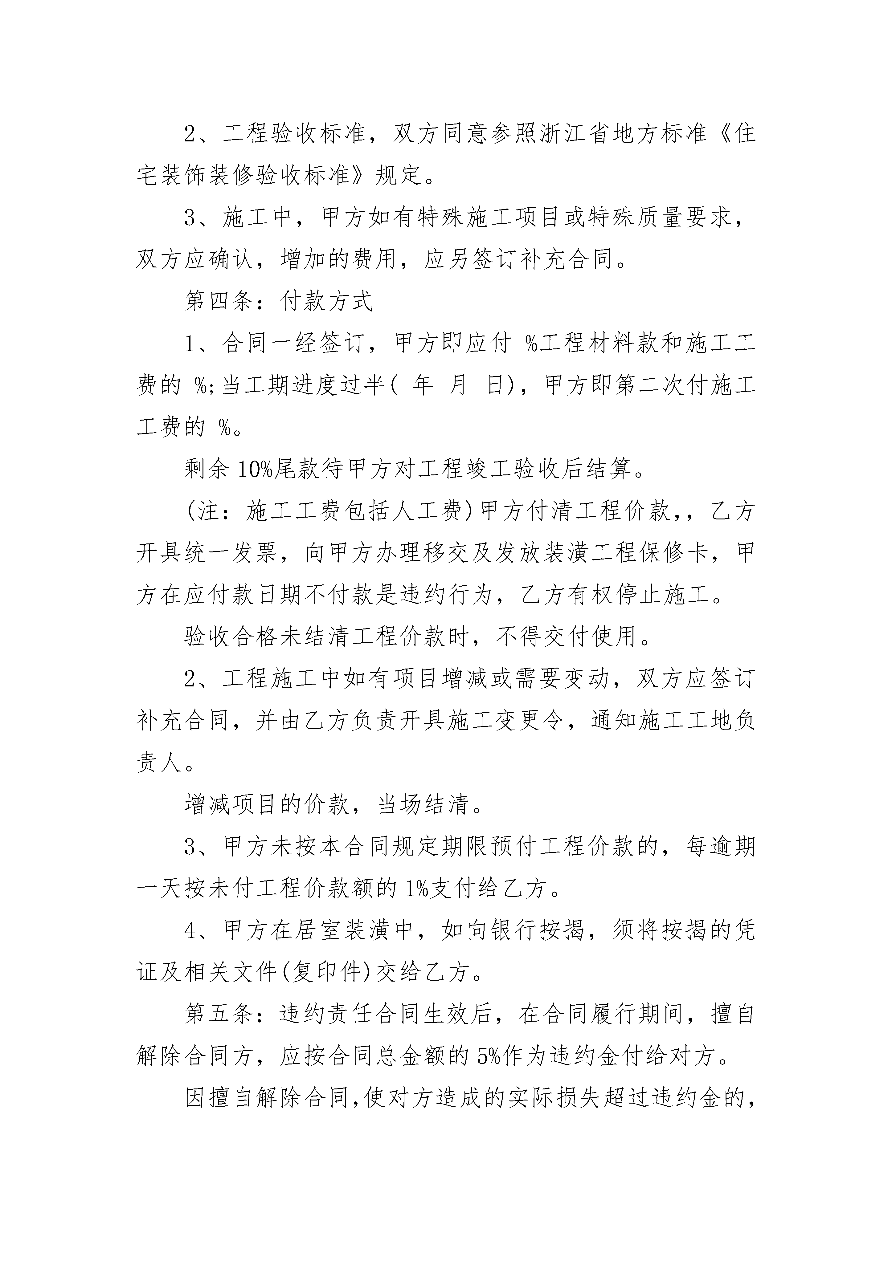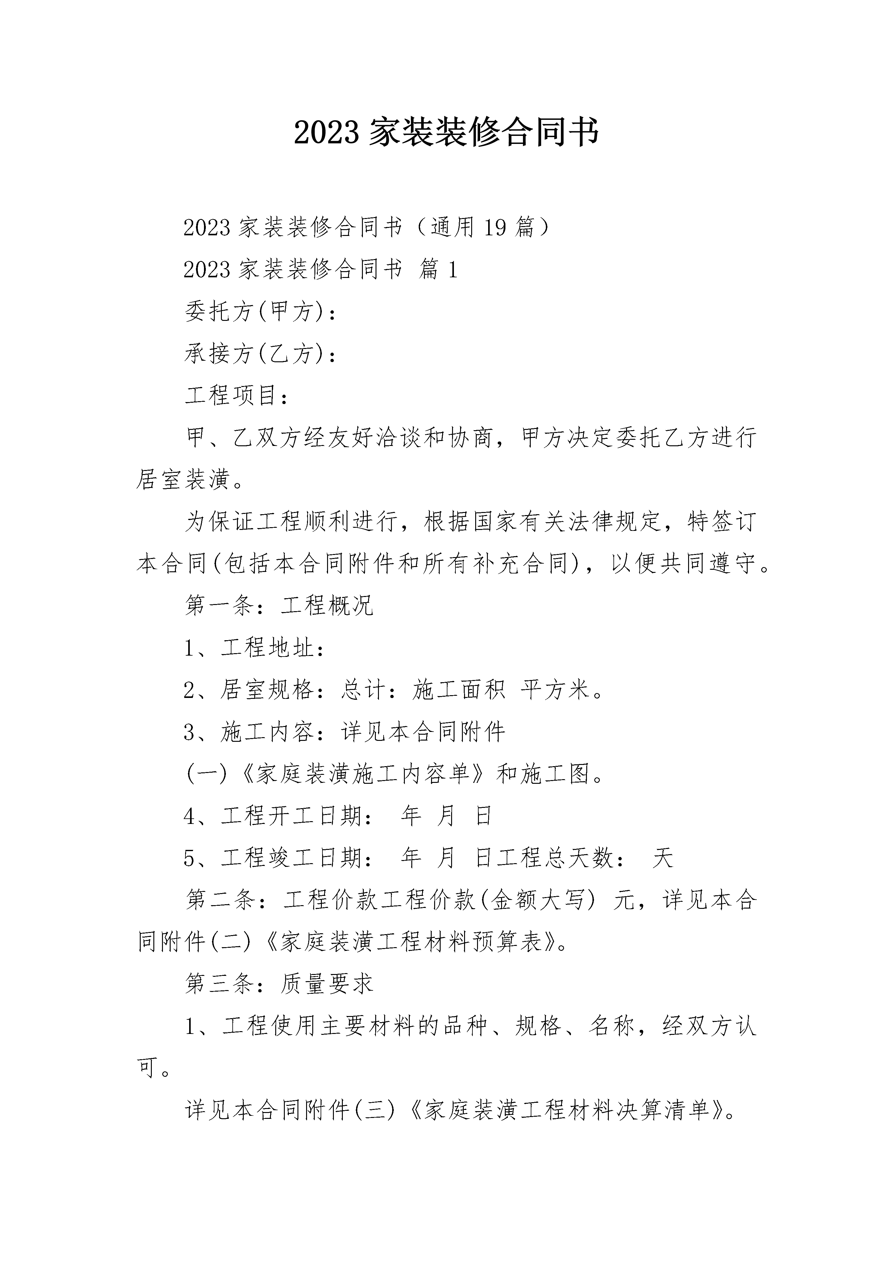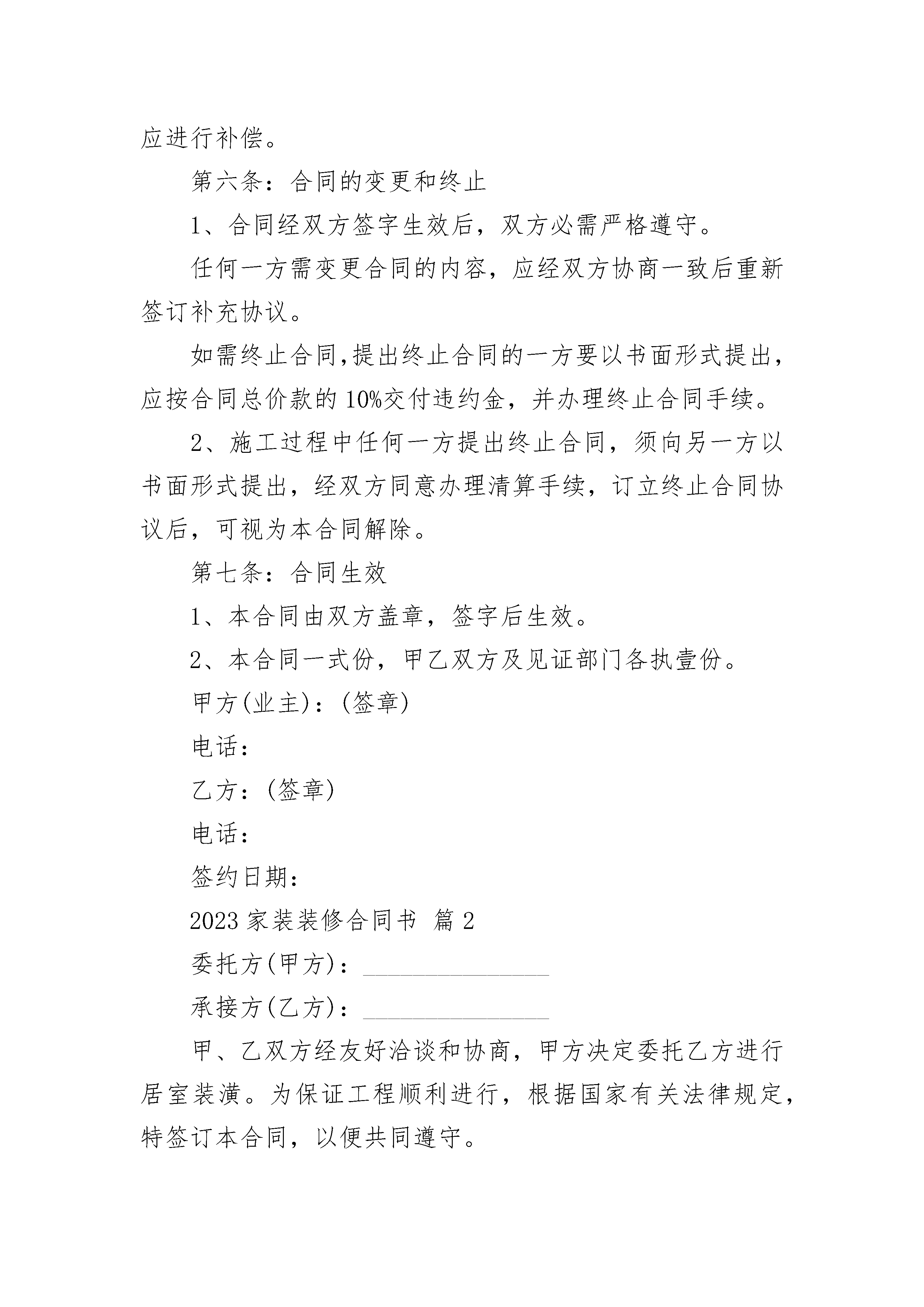 2023家装装修合同书2023家装装修合同书(通用19篇)2023家装装修合同书篇1委托方(甲方):承接方(乙方):工程项目:甲、乙双方经友好洽谈和协商,甲方决定委托乙方进行居室装潢。为保证工程顺利进行,根据国家有关法律规定,特签订本合同(包括本合同附件和所有补充合同),以便共同遵守。第一条:工程概况1、工程地址:2、居室规格:总计:施工面积平方米。3、施工内容:详见本合同附件(一)《家庭装潢施工内容单》和施工图。4、工程开工日期:年月日5、工程竣工日期:年月日工程总天数:天第二条:工程价款工程价款(金额大写)元,详见本合同附件(二)《家庭装潢工程材料预算表》。第三条:质量要求1、工程使用主要材料的品种、规格、名称,经双方认可。详见本合同附件(三)《家庭装潢工程材料决算清单》。2、工程验收标准,双方同意参照浙江省地方标准《住宅装饰装修验收标准》规定。3、施工中,甲方如有特殊施工项目或特殊质量要求,双方应确认,增加的费用,应另签订补充合同。第四条:付款方式1、合同一经签订,甲方即应付%工程材料款和施工工费的%;当工期进度过半(年月日),甲方即第二次付施工工费的%。剩余10%尾款待甲方对工程竣工验收后结算。(注:施工工费包括人工费)甲方付清工程价款,,乙方开具统一发票,向甲方办理移交及发放装潢工程保修卡,甲方在应付款日期不付款是违约行为,乙方有权停止施工。验收合格未结清工程价款时,不得交付使用。2、工程施工中如有项目增减或需要变动,双方应签订补充合同,并由乙方负责开具施工变更令,通知施工工地负责人。增减项目的价款,当场结清。3、甲方未按本合同规定期限预付工程价款的,每逾期一天按未付工程价款额的1%支付给乙方。4、甲方在居室装潢中,如向银行按揭,须将按揭的凭证及相关文件(复印件)交给乙方。第五条:违约责任合同生效后,在合同履行期间,擅自解除合同方,应按合同总金额的5%作为违约金付给对方。因擅自解除合同,使对方造成的实际损失超过违约金的,应进行补偿。第六条:合同的变更和终止1、合同经双方签字生效后,双方必需严格遵守。任何一方需变更合同的内容,应经双方协商一致后重新签订补充协议。如需终止合同,提出终止合同的一方要以书面形式提出,应按合同总价款的10%交付违约金,并办理终止合同手续。2、施工过程中任何一方提出终止合同,须向另一方以书面形式提出,经双方同意办理清算手续,订立终止合同协议后,可视为本合同解除。第七条:合同生效1、本合同由双方盖章,签字后生效。2、本合同一式份,甲乙双方及见证部门各执壹份。甲方(业主):(签章)电话:乙方:(签章)电话:签约日期:2023家装装修合同书篇2委托方(甲方):_______________承接方(乙方):_______________甲、乙双方经友好洽谈和协商,甲方决定委托乙方进行居室装潢。为保证工程顺利进行,根据国家有关法律规定,特签订本合同,以便共同遵守。第一条工程概况1、工程地址:___________________________________2、居室规格:房型______层(式)______室______厅______厨______卫,总计施工面积____________平方米。3、施工内容:详见本合同附件(一)《家庭装潢施工内容单》和施工图。4、委托方式:____________________________________________5、工程开工日期:______年______月______日6、工程竣工日期:______年______月______日,工程总天数:________天第二条工程价款工程价款(金额大写)___________________元,详见本合同附件(二)《家庭装潢工程材料预算表》。1、材料款__________元;2、人工费__________元;3、设计费__________元;4、施工清运费__________元;5、搬卸费__________元;6、管理费__________元;7、其他费用(注明内容)______________元。第三条质量要求1、工程使用主要材料的品种、规格、名称,经双方认可。2、工程验收标准,双方同意参照国家的相关规定执行。3、施工中,甲方如有特殊施工项目或特殊质量要求,双方应确认,增加的费用,应另签订补充合同。4、凡由甲方自行采购的材料、设备,产品质量由甲方自负;施工质量由乙方负责。5、甲方如自聘工程监理,须在工程开工前通知乙方,以便于工作衔接。第四条材料供应1、乙方须严格按照国家有关价格条例规定,对本合同中所用材料一律实行明码标价。甲方所提供的材料均应用于本合同规定的装潢工程,非经甲方同意,不得挪作他用。乙方如挪作他用,应按挪用材料的双倍价款补偿给甲方。2、乙方提供的材料、设备如不符合质量要求,或规格有差异,应禁止