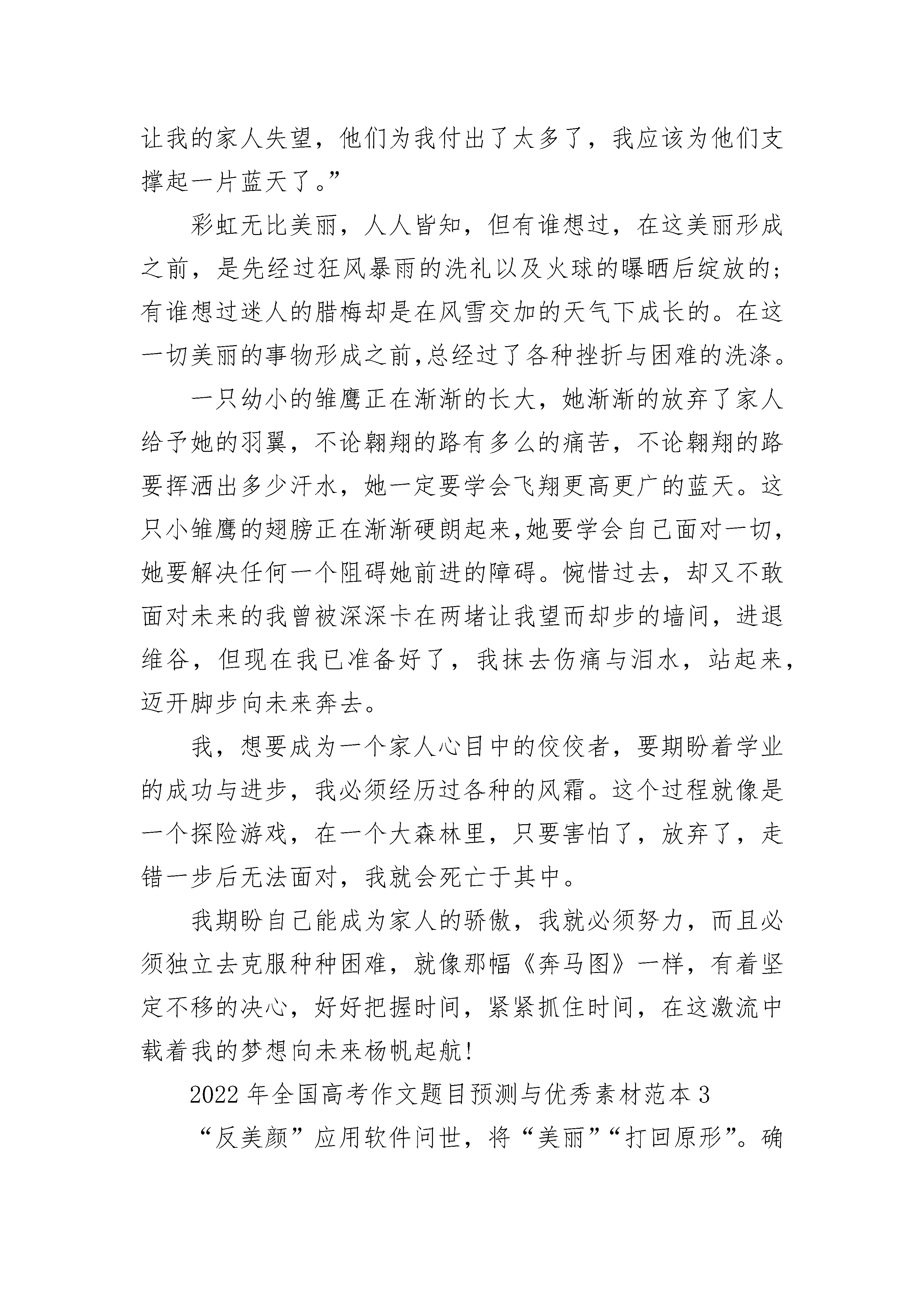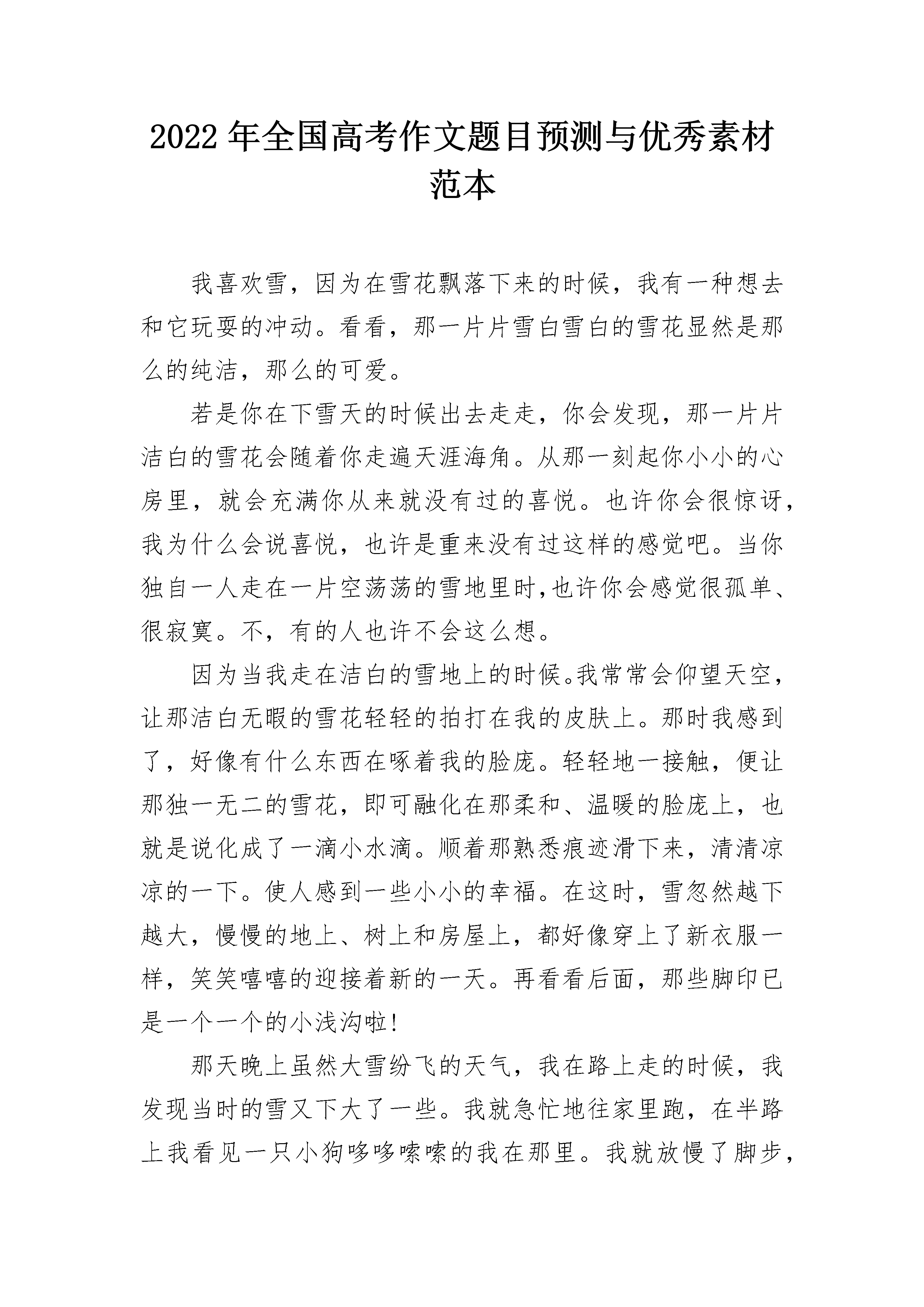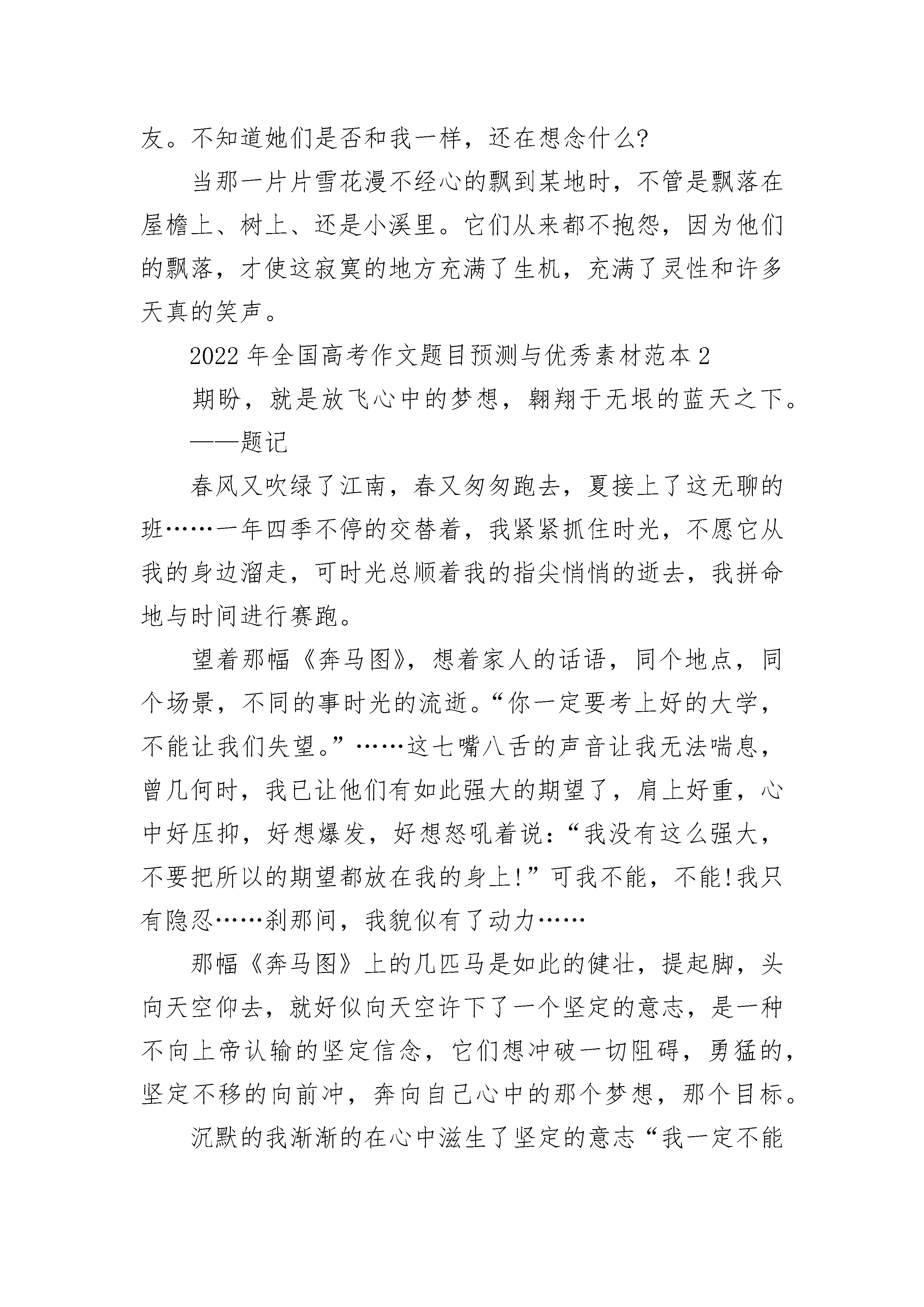2022年全国高考作文题目预测与优秀素材范本我喜欢雪,因为在雪花飘落下来的时候,我有一种想去和它玩耍的冲动。看看,那一片片雪白雪白的雪花显然是那么的纯洁,那么的可爱。若是你在下雪天的时候出去走走,你会发现,那一片片洁白的雪花会随着你走遍天涯海角。从那一刻起你小小的心房里,就会充满你从来就没有过的喜悦。也许你会很惊讶,我为什么会说喜悦,也许是重来没有过这样的感觉吧。当你独自一人走在一片空荡荡的雪地里时,也许你会感觉很孤单、很寂寞。不,有的人也许不会这么想。因为当我走在洁白的雪地上的时候。我常常会仰望天空,让那洁白无暇的雪花轻轻的拍打在我的皮肤上。那时我感到了,好像有什么东西在啄着我的脸庞。轻轻地一接触,便让那独一无二的雪花,即可融化在那柔和、温暖的脸庞上,也就是说化成了一滴小水滴。顺着那熟悉痕迹滑下来,清清凉凉的一下。使人感到一些小小的幸福。在这时,雪忽然越下越大,慢慢的地上、树上和房屋上,都好像穿上了新衣服一样,笑笑嘻嘻的迎接着新的一天。再看看后面,那些脚印已是一个一个的小浅沟啦!那天晚上虽然大雪纷飞的天气,我在路上走的时候,我发现当时的雪又下大了一些。我就急忙地往家里跑,在半路上我看见一只小狗哆哆嗦嗦的我在那里。我就放慢了脚步,慢慢的,知道我停下了脚步。当我的手正要伸向前,去抱住它的时候,它突然站起来,咧着嘴装作很凶的样子。当时我还被它吓了一跳了呢?我有丢下一句:“狗咬吕洞宾,不识好人心。”我看了一眼天空望望前面的路灯,额!夜已经是很深了,我独自一人走在无人的路上很害怕。再看一眼灯下的那个小动物,我的眼睛有些湿润,不只是为什么。也许是可怜这只小狗吧,就没在想什么。可是,当我走了两步的时候,忽然想起刚才的那一只小狗。我猛然间回头,却隐隐约约的看见身后有一个很小的身影,还在倔强的追赶着。我想,在这大雪纷飞的夜晚里。让人都觉的冷的可怕,更何况是一只小狗呢?它满身是雪,而且还打着哆嗦,在灯光下显得很可爱。让人忍得住给它一些温暖。当我在走会原地时,那只小狗在那里又蹦又跳,还摇着尾巴欢快的汪汪叫着。好像在说:“谢谢你,从今以后你就是我的主人啦!”当我伸手把它抱在怀里的时候,认真地看了看它的样子。原来是一只黑白相间的小狗啊?我抱着它走在无人的大街上,和雪花的陪伴下,我终于回到了家。看着院子里、屋檐上都是一片雪白、雪白的,看起来可爱极啦。我走到屋里,把事情的来龙去脉告诉了妈妈。请求妈妈能让我收养这只小狗,在我的坚持下,妈妈终于让我的小小狗留下啦!我不仅在雪天里有了一只可爱的小狗,还收获了一个奇迹。看着漫天飞舞的雪花,让我想起了还在远方的家人和朋友。不知道她们是否和我一样,还在想念什么?当那一片片雪花漫不经心的飘到某地时,不管是飘落在屋檐上、树上、还是小溪里。它们从来都不抱怨,因为他们的飘落,才使这寂寞的地方充满了生机,充满了灵性和许多天真的笑声。2022年全国高考作文题目预测与优秀素材范本2期盼,就是放飞心中的梦想,翱翔于无垠的蓝天之下。——题记春风又吹绿了江南,春又匆匆跑去,夏接上了这无聊的班……一年四季不停的交替着,我紧紧抓住时光,不愿它从我的身边溜走,可时光总顺着我的指尖悄悄的逝去,我拼命地与时间进行赛跑。望着那幅《奔马图》,想着家人的话语,同个地点,同个场景,不同的事时光的流逝。“你一定要考上好的大学,不能让我们失望。”……这七嘴八舌的声音让我无法喘息,曾几何时,我已让他们有如此强大的期望了,肩上好重,心中好压抑,好想爆发,好想怒吼着说:“我没有这么强大,不要把所以的期望都放在我的身上!”可我不能,不能!我只有隐忍……刹那间,我貌似有了动力……那幅《奔马图》上的几匹马是如此的健壮,提起脚,头向天空仰去,就好似向天空许下了一个坚定的意志,是一种不向上帝认输的坚定信念,它们想冲破一切阻碍,勇猛的,坚定不移的向前冲,奔向自己心中的那个梦想,那个目标。沉默的我渐渐的在心中滋生了坚定的意志“我一定不能让我的家人失望,他们为我付出了太多了,我应该为他们支撑起一片蓝天了。”彩虹无比美丽,人人皆知,但有谁想过,在这美丽形成之前,是先经过狂风暴雨的洗礼以及火球的曝晒后绽放的;有谁想过迷人的腊梅却是在风雪交加的天气下成长的。在这一切美丽的事物形成之前,总经过了各种挫折与困难的洗涤。一只幼小的雏鹰正在渐渐的长大,她渐渐的放弃了家人给予她的羽翼,不论翱翔的路有多么的痛苦,不论翱翔的路要挥洒出多少汗水,她一定要学会飞翔更高更广的蓝天。这只小雏鹰的翅膀正在渐渐硬朗起来,她要学会自己面对一切,她要解决任何一个阻碍她前进的障碍。惋惜过去,却又不敢面对未来的我曾被深深卡在两堵让我望而却步的墙间,进退维谷,但现在我已准备好了,我抹去伤痛与泪水,站起来,迈开脚步向未来奔去。我,想要成为一个家人心目中的佼佼者,要期盼着学业的成功与进步,我必须经历过各种的风霜。这个过程