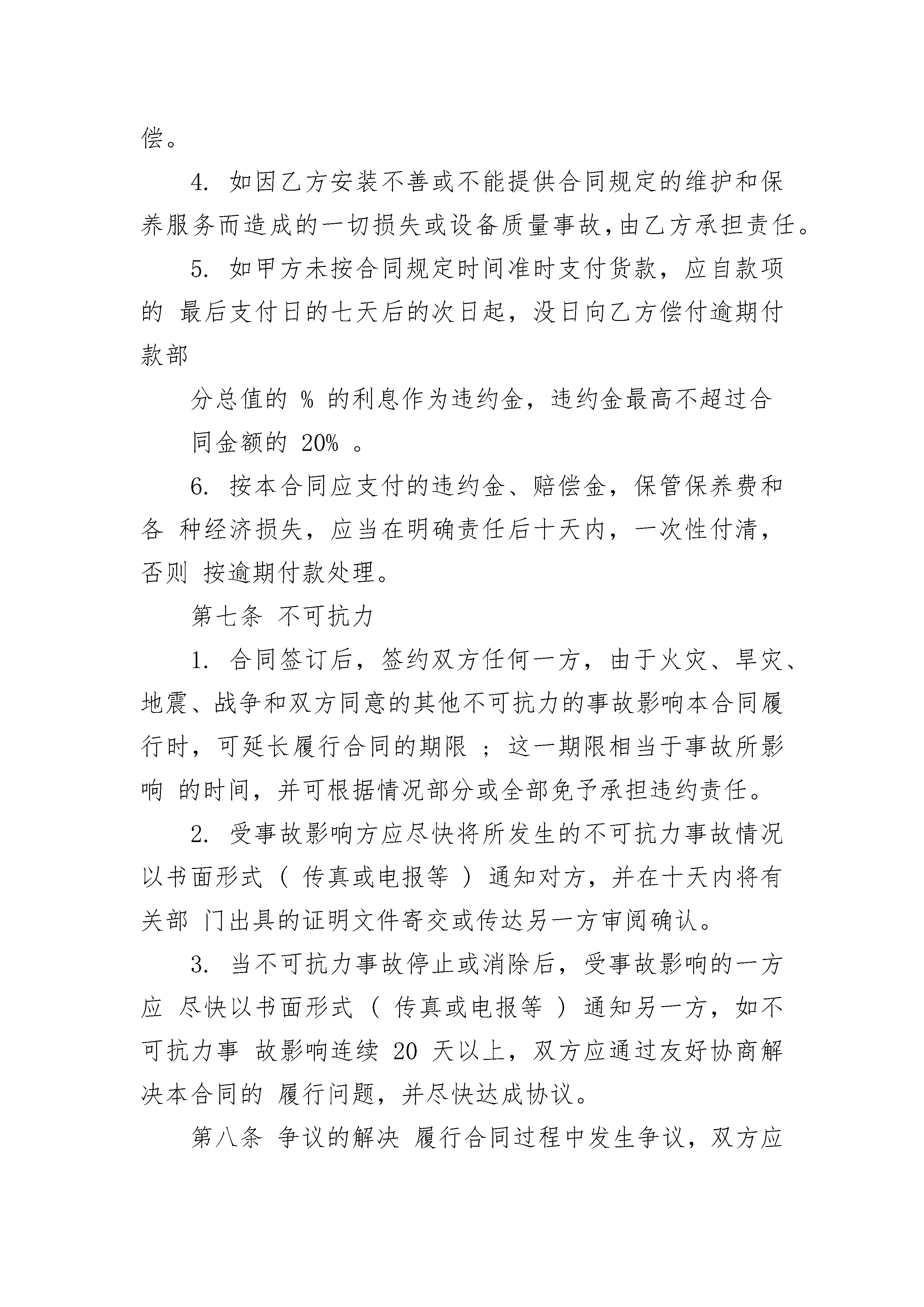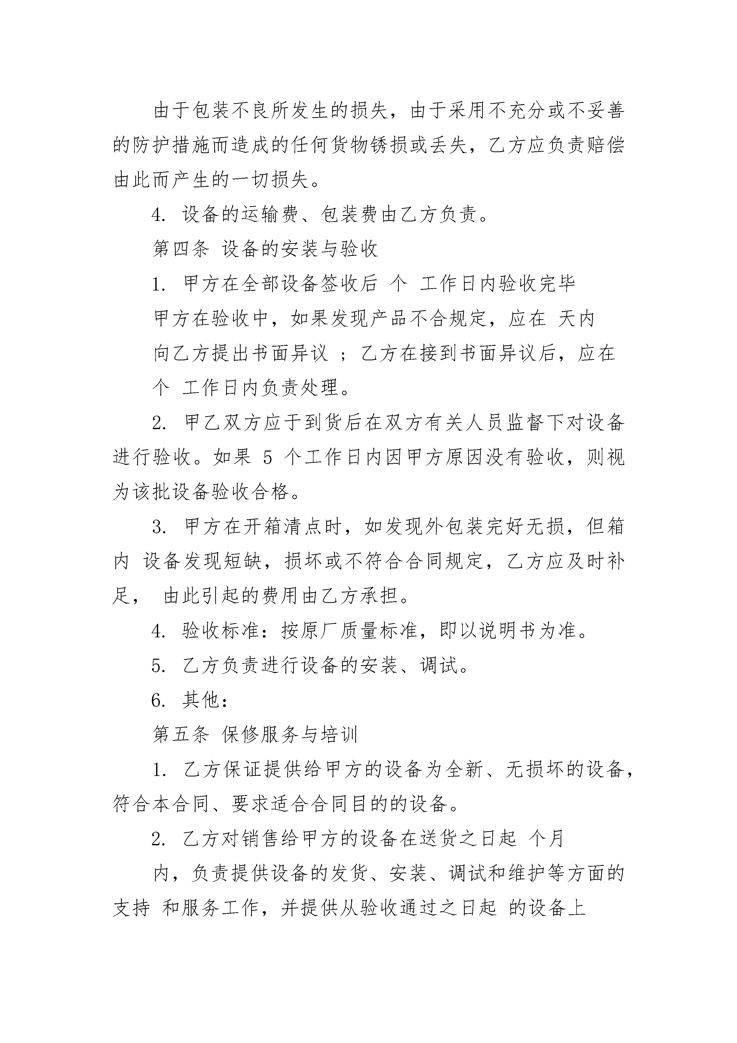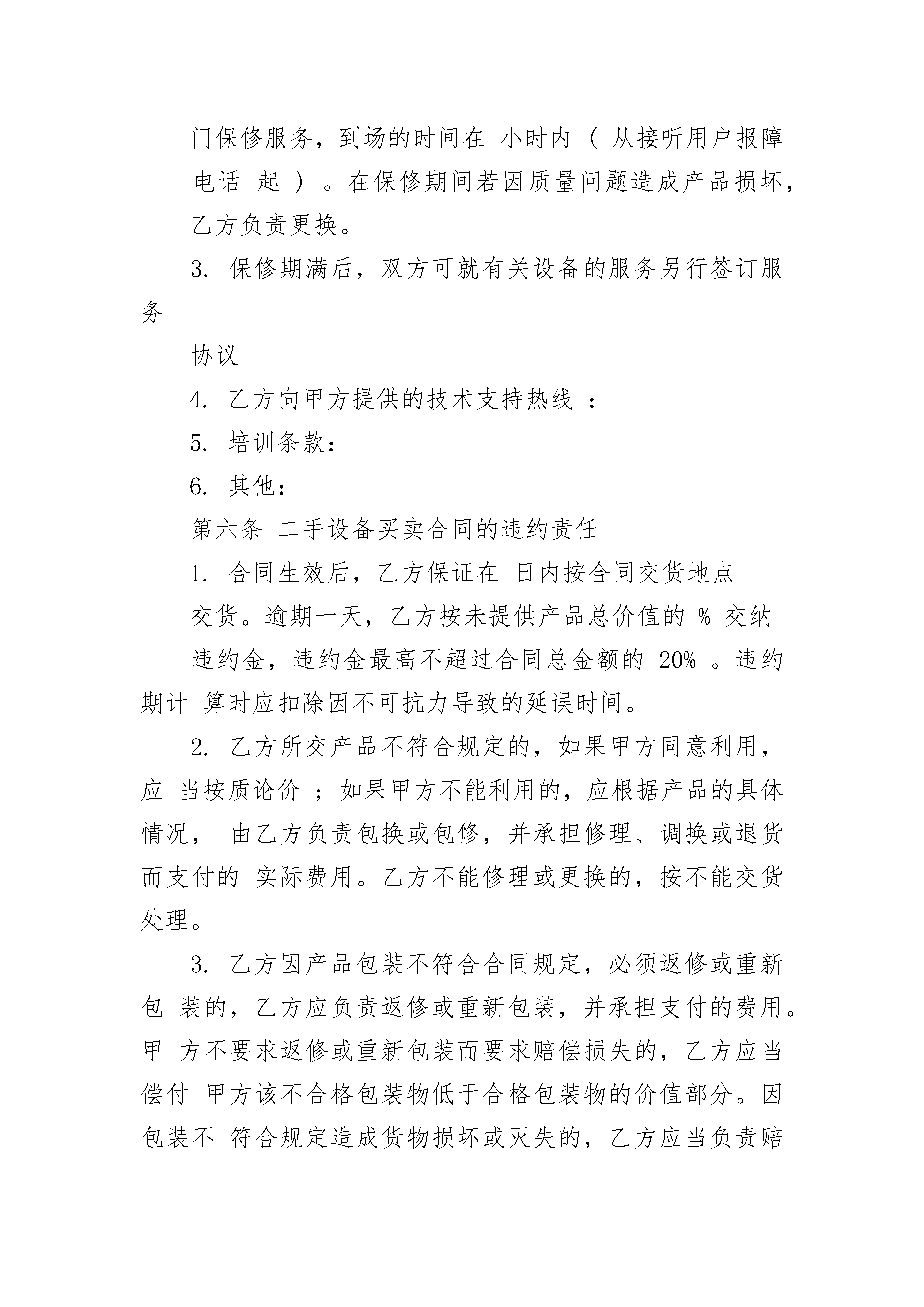 LED灯杯买卖合同LED灯杯买卖合同(精选3篇)LED灯杯买卖合同篇1甲方(买方):______________乙方(卖方):______________根据《中华人民共和国民法典》及相关法律的规定,甲乙双方协商签订如下二手设备买卖合同:第一条合同标的要求1.甲方同意从乙方购买,乙方同意出售附件所列系统设2.产地:详见附件。3.质量标准:(1)按原厂质量标准,即以说明书为准。(2)其他:______________4.技术标准:乙方提供的设备为原厂行货,符合原厂行货的技术标准。5.其他要求:______________第二条合同价款及支付方式1.本合同所列各项目的总价款为人民币:______________2.支付方式:______________(1)双方约定按以下第种方式支付:①甲方在货到并安装验收合格后______个工作日内一次性支付所有款项。②第一期付款:______________合同签订后______个工作日内支付合同总价款的______%。第二期付款:货到验收合格后个工作日内支付合同总价款的______%。第三期付款:______________③其他:______________(2)付款信息乙方单位名称:______________开户银行:______________帐号:______________乙方负责开具相关发票。第三条交货时间、地点和包装1.交货时间:按以下第______种方式确定交货时间(1)自合同签订之日起______日内。(2)于______年______月______日内。(3)其他方式:以甲方指定人员签收确认日期为准2.交货地点:乙方负责将货物运至甲方指定的地点并卸甲方指定地点:______________接货人:______________3.乙方负责包装货物,包装标准:______________原厂包装标准并适于运输需要;其他:由于包装不良所发生的损失,由于采用不充分或不妥善的防护措施而造成的任何货物锈损或丢失,乙方应负责赔偿由此而产生的一切损失。4.设备的运输费、包装费由乙方负责。第四条设备的安装与验收1.甲方在全部设备签收后个工作日内验收完毕甲方在验收中,如果发现产品不合规定,应在天内向乙方提出书面异议;乙方在接到书面异议后,应在个工作日内负责处理。2.甲乙双方应于到货后在双方有关人员监督下对设备进行验收。如果5个工作日内因甲方原因没有验收,则视为该批设备验收合格。3.甲方在开箱清点时,如发现外包装完好无损,但箱内设备发现短缺,损坏或不符合合同规定,乙方应及时补足,由此引起的费用由乙方承担。4.验收标准:按原厂质量标准,即以说明书为准。5.乙方负责进行设备的安装、调试。6.其他:第五条保修服务与培训1.乙方保证提供给甲方的设备为全新、无损坏的设备,符合本合同、要求适合合同目的的设备。2.乙方对销售给甲方的设备在送货之日起个月内,负责提供设备的发货、安装、调试和维护等方面的支持和服务工作,并提供从验收通过之日起的设备上门保修服务,到场的时间在小时内(从接听用户报障电话起)。在保修期间若因质量问题造成产品损坏,乙方负责更换。3.保修期满后,双方可就有关设备的服务另行签订服务协议4.乙方向甲方提供的技术支持热线:5.培训条款:6.其他:第六条二手设备买卖合同的违约责任1.合同生效后,乙方保证在日内按合同交货地点交货。逾期一天,乙方按未提供产品总价值的%交纳违约金,违约金最高不超过合同总金额的20%。违约期计算时应扣除因不可抗力导致的延误时间。2.乙方所交产品不符合规定的,如果甲方同意利用,应当按质论价;如果甲方不能利用的,应根据产品的具体情况,由乙方负责包换或包修,并承担修理、调换或退货而支付的实际费用。乙方不能修理或更换的,按不能交货处理。3.乙方因产品包装不符合合同规定,必须返修或重新包装的,乙方应负责返修或重新包装,并承担支付的费用。甲方不要求返修或重新包装而要求赔偿损失的,乙方应当偿付甲方该不合格包装物低于合格包装物的价值部分。因包装不符合规定造成货物损坏或灭失的,乙方应当负责赔偿。4.如因乙方安装不善或不能提供合同规定的维护和保养服务而造成的一切损失或设备质量事故,由乙方承担责任。5.如甲方未按合同规定时间准时支付货款,应自款项的最后支付日的七天后的次日起,没日向乙方偿付逾期付款部分总值的%的利息作为违约金,违约金最高不超过合同金额的20%。6.按本合同应支付的违约金、赔偿金,保管保养费和各种经济损失,应当在明确责任后十天内,一次性付清,否则按逾期付款处理。第七条不可抗力1.合同签订后,签约双方任何一方,由于火灾、旱灾、地震、战争和双方同意的其他不可抗力的事故影响本合同履行时,可延长履行合同的期限;这一期限相当于事故所影响的时间,并可根据情况部分或全部免予承担违约责任。