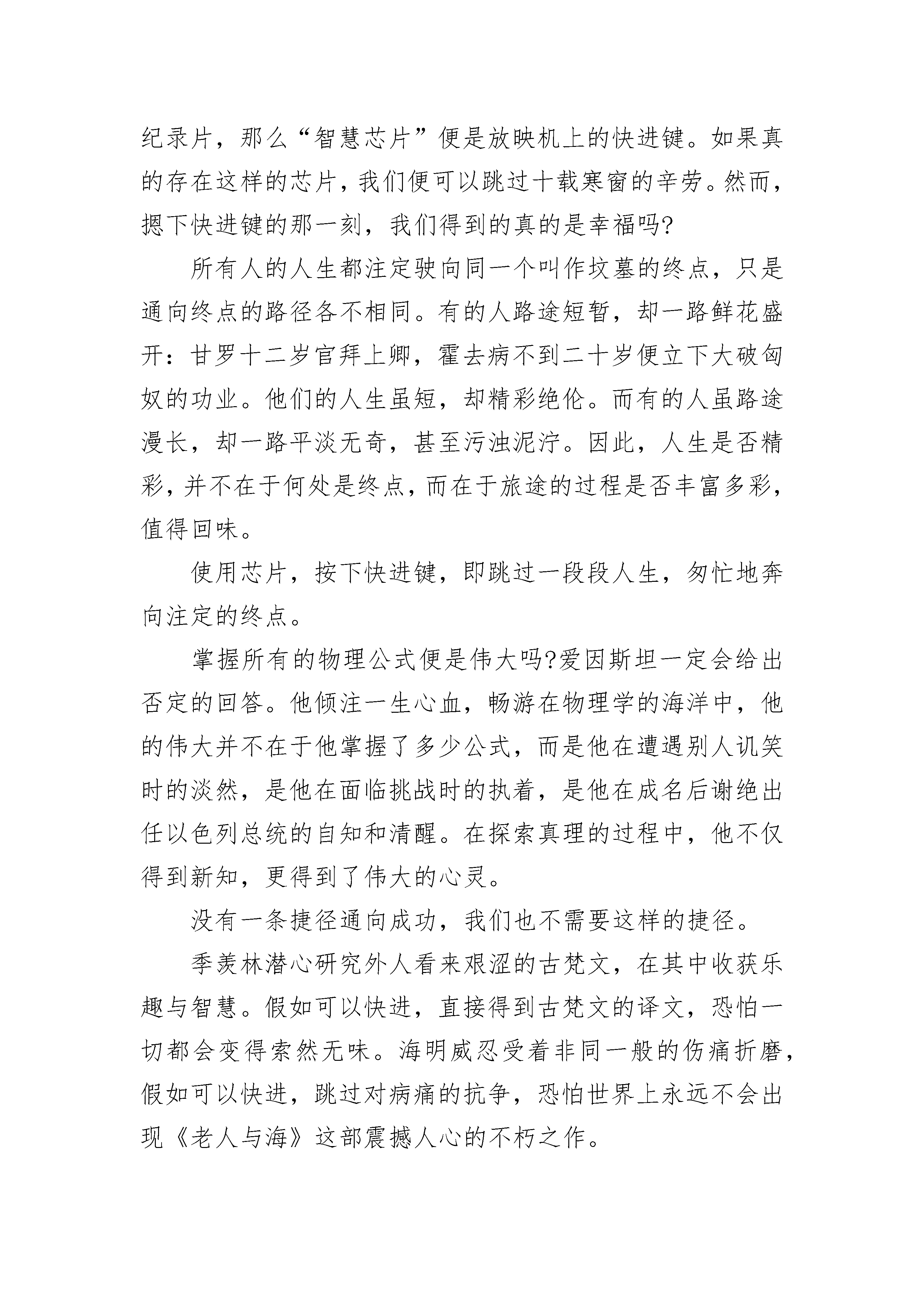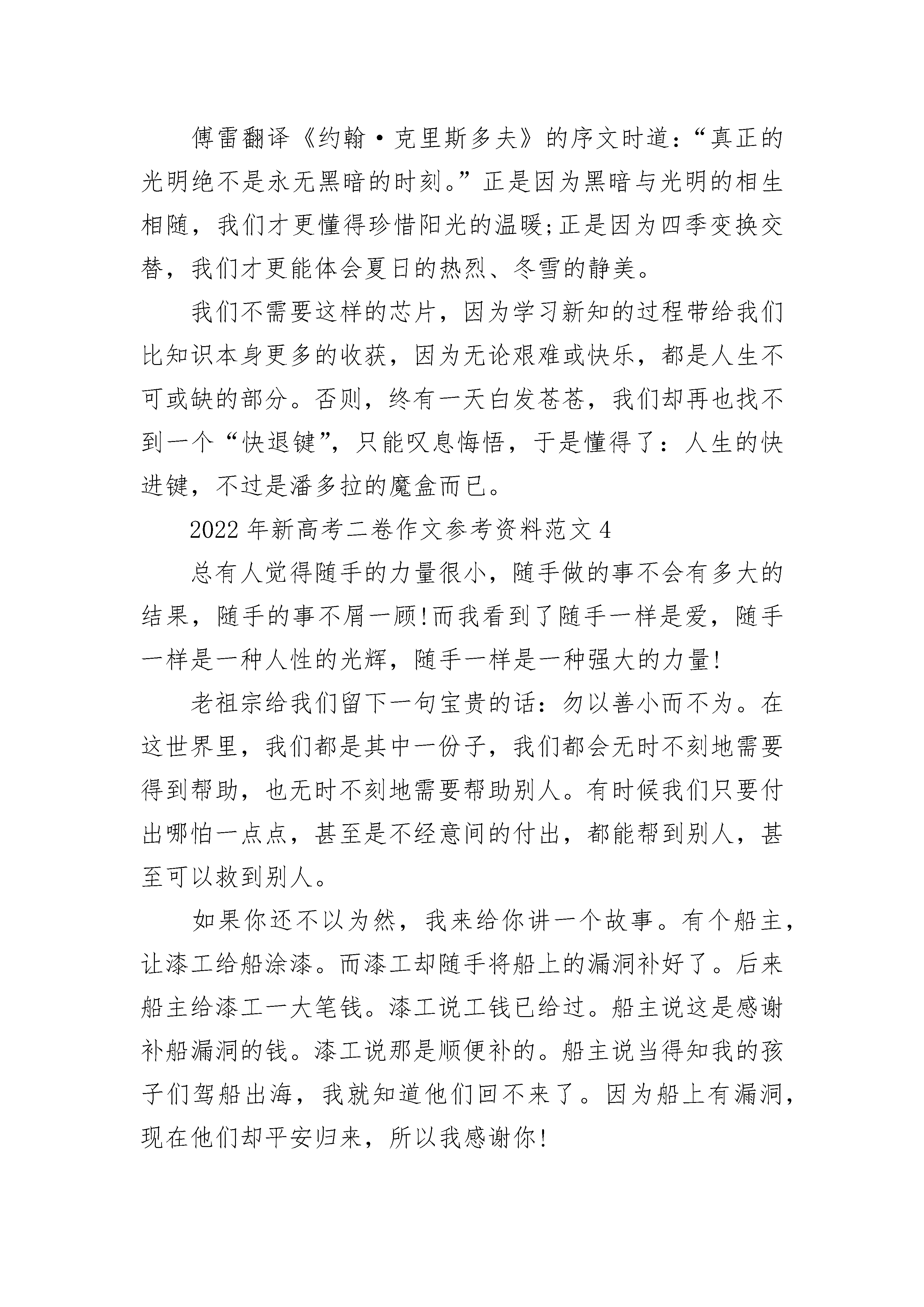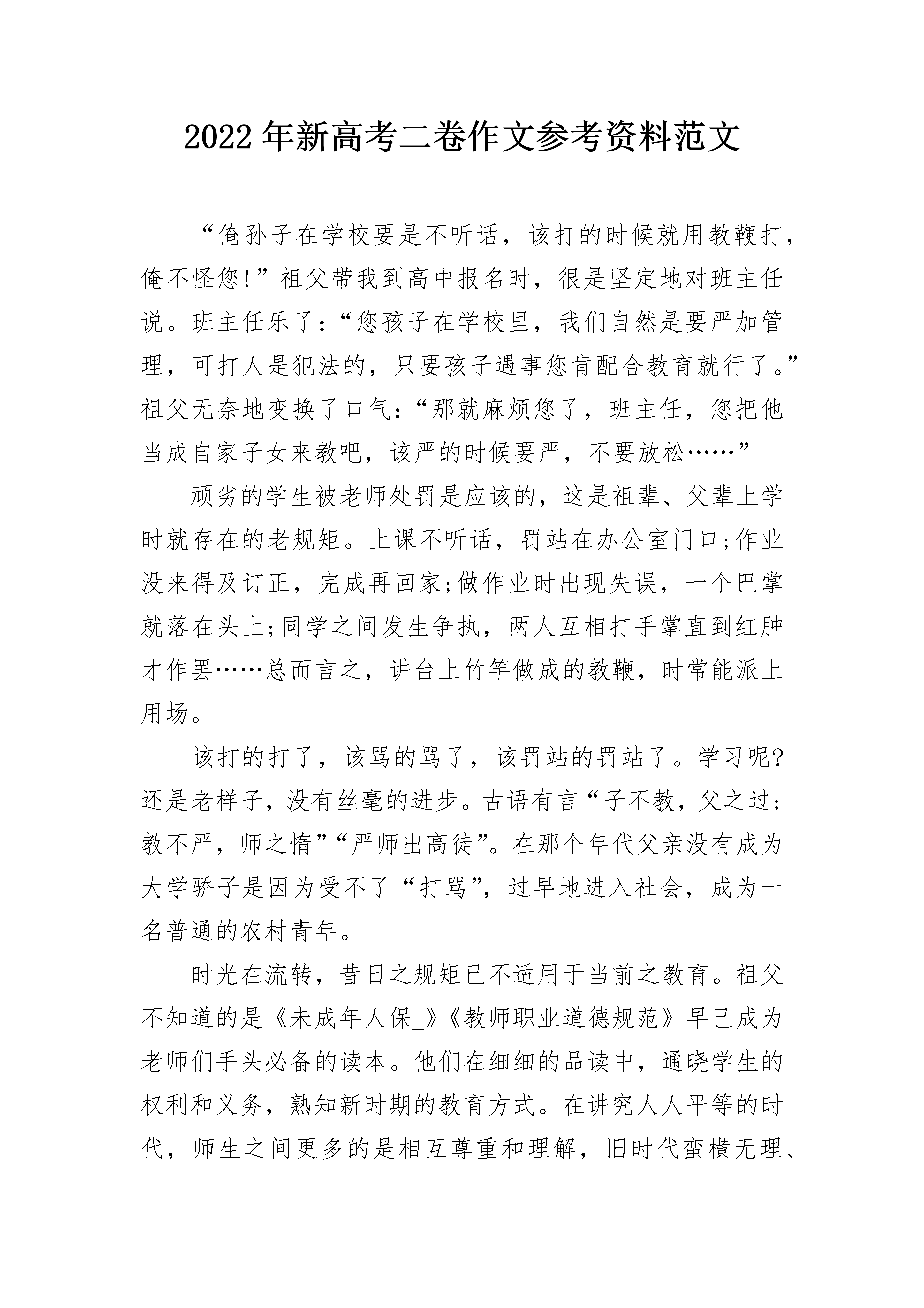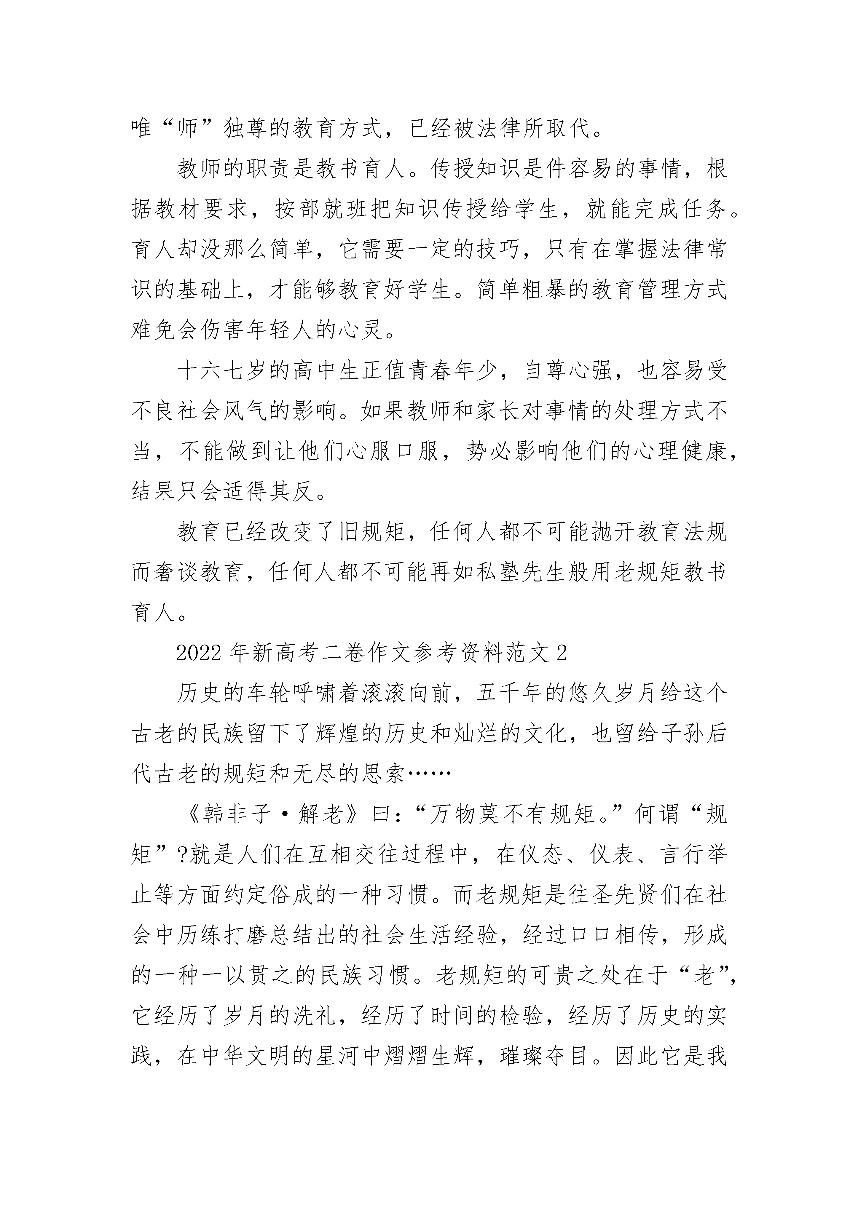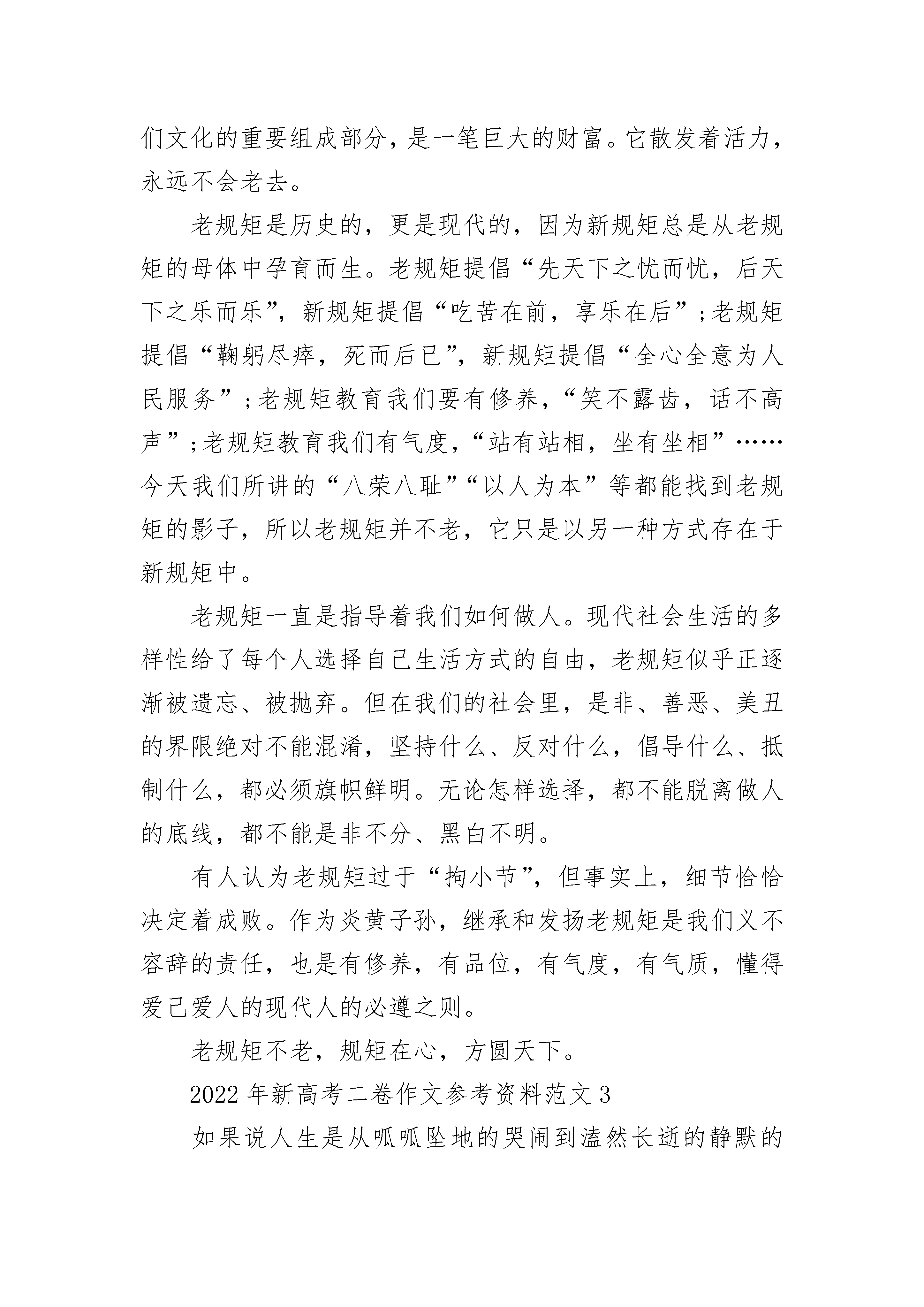 2022年新高考二卷作文参考资料范文“俺孙子在学校要是不听话,该打的时候就用教鞭打,俺不怪您!”祖父带我到高中报名时,很是坚定地对班主任说。班主任乐了:“您孩子在学校里,我们自然是要严加管理,可打人是犯法的,只要孩子遇事您肯配合教育就行了。”祖父无奈地变换了口气:“那就麻烦您了,班主任,您把他当成自家子女来教吧,该严的时候要严,不要放松……”顽劣的学生被老师处罚是应该的,这是祖辈、父辈上学时就存在的老规矩。上课不听话,罚站在办公室门口;作业没来得及订正,完成再回家;做作业时出现失误,一个巴掌就落在头上;同学之间发生争执,两人互相打手掌直到红肿才作罢……总而言之,讲台上竹竿做成的教鞭,时常能派上用场。该打的打了,该骂的骂了,该罚站的罚站了。学习呢?还是老样子,没有丝毫的进步。古语有言“子不教,父之过;教不严,师之惰”“严师出高徒”。在那个年代父亲没有成为大学骄子是因为受不了“打骂”,过早地进入社会,成为一名普通的农村青年。时光在流转,昔日之规矩已不适用于当前之教育。祖父不知道的是《未成年人保_》《教师职业道德规范》早已成为老师们手头必备的读本。他们在细细的品读中,通晓学生的权利和义务,熟知新时期的教育方式。在讲究人人平等的时代,师生之间更多的是相互尊重和理解,旧时代蛮横无理、唯“师”独尊的教育方式,已经被法律所取代。教师的职责是教书育人。传授知识是件容易的事情,根据教材要求,按部就班把知识传授给学生,就能完成任务。育人却没那么简单,它需要一定的技巧,只有在掌握法律常识的基础上,才能够教育好学生。简单粗暴的教育管理方式难免会伤害年轻人的心灵。十六七岁的高中生正值青春年少,自尊心强,也容易受不良社会风气的影响。如果教师和家长对事情的处理方式不当,不能做到让他们心服口服,势必影响他们的心理健康,结果只会适得其反。教育已经改变了旧规矩,任何人都不可能抛开教育法规而奢谈教育,任何人都不可能再如私塾先生般用老规矩教书育人。2022年新高考二卷作文参考资料范文2历史的车轮呼啸着滚滚向前,五千年的悠久岁月给这个古老的民族留下了辉煌的历史和灿烂的文化,也留给子孙后代古老的规矩和无尽的思索……《韩非子·解老》曰:“万物莫不有规矩。”何谓“规矩”?就是人们在互相交往过程中,在仪态、仪表、言行举止等方面约定俗成的一种习惯。而老规矩是往圣先贤们在社会中历练打磨总结出的社会生活经验,经过口口相传,形成的一种一以贯之的民族习惯。老规矩的可贵之处在于“老”,它经历了岁月的洗礼,经历了时间的检验,经历了历史的实践,在中华文明的星河中熠熠生辉,璀璨夺目。因此它是我们文化的重要组成部分,是一笔巨大的财富。它散发着活力,永远不会老去。老规矩是历史的,更是现代的,因为新规矩总是从老规矩的母体中孕育而生。老规矩提倡“先天下之忧而忧,后天下之乐而乐”,新规矩提倡“吃苦在前,享乐在后”;老规矩提倡“鞠躬尽瘁,死而后已”,新规矩提倡“全心全意为人民服务”;老规矩教育我们要有修养,“笑不露齿,话不高声”;老规矩教育我们有气度,“站有站相,坐有坐相”……今天我们所讲的“八荣八耻”“以人为本”等都能找到老规矩的影子,所以老规矩并不老,它只是以另一种方式存在于新规矩中。老规矩一直是指导着我们如何做人。现代社会生活的多样性给了每个人选择自己生活方式的自由,老规矩似乎正逐渐被遗忘、被抛弃。但在我们的社会里,是非、善恶、美丑的界限绝对不能混淆,坚持什么、反对什么,倡导什么、抵制什么,都必须旗帜鲜明。无论怎样选择,都不能脱离做人的底线,都不能是非不分、黑白不明。有人认为老规矩过于“拘小节”,但事实上,细节恰恰决定着成败。作为炎黄子孙,继承和发扬老规矩是我们义不容辞的责任,也是有修养,有品位,有气度,有气质,懂得爱己爱人的现代人的必遵之则。老规矩不老,规矩在心,方圆天下。2022年新高考二卷作文参考资料范文3如果说人生是从呱呱坠地的哭闹到溘然长逝的静默的纪录片,那么“智慧芯片”便是放映机上的快进键。如果真的存在这样的芯片,我们便可以跳过十载寒窗的辛劳。然而,摁下快进键的那一刻,我们得到的真的是幸福吗?所有人的人生都注定驶向同一个叫作坟墓的终点,只是通向终点的路径各不相同。有的人路途短暂,却一路鲜花盛开:甘罗十二岁官拜上卿,霍去病不到二十岁便立下大破匈奴的功业。他们的人生虽短,却精彩绝伦。而有的人虽路途漫长,却一路平淡无奇,甚至污浊泥泞。因此,人生是否精彩,并不在于何处是终点,而在于旅途的过程是否丰富多彩,值得回味。使用芯片,按下快进键,即跳过一段段人生,匆忙地奔向注定的终点。掌握所有的物理公式便是伟大吗?爱因斯坦一定会给出否定的回答。他倾注一生心血,畅游在物理学的海洋中,他的伟大并不在于他掌握了多少公式,而是他在遭遇别人讥笑时的淡然,是他在面临挑战时的执着,是他在成名后谢绝出任以色列总统的自