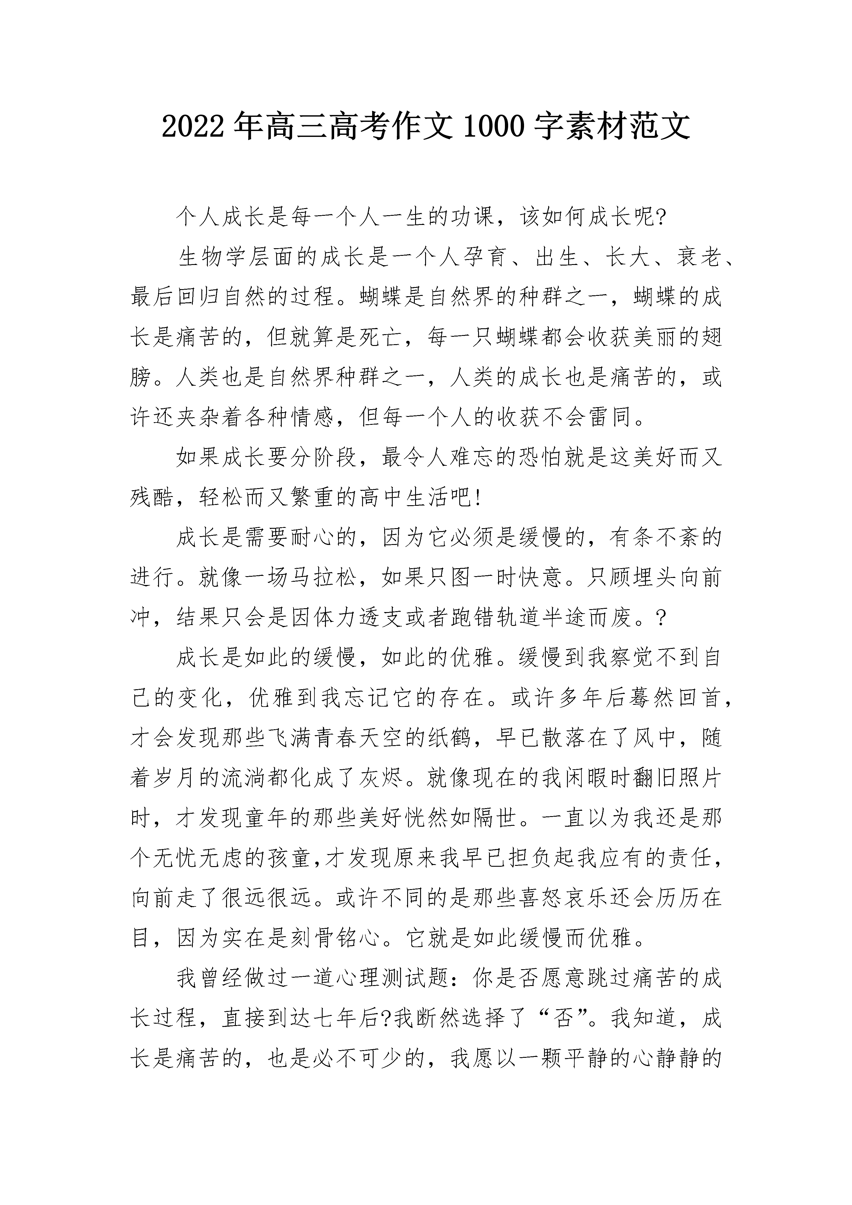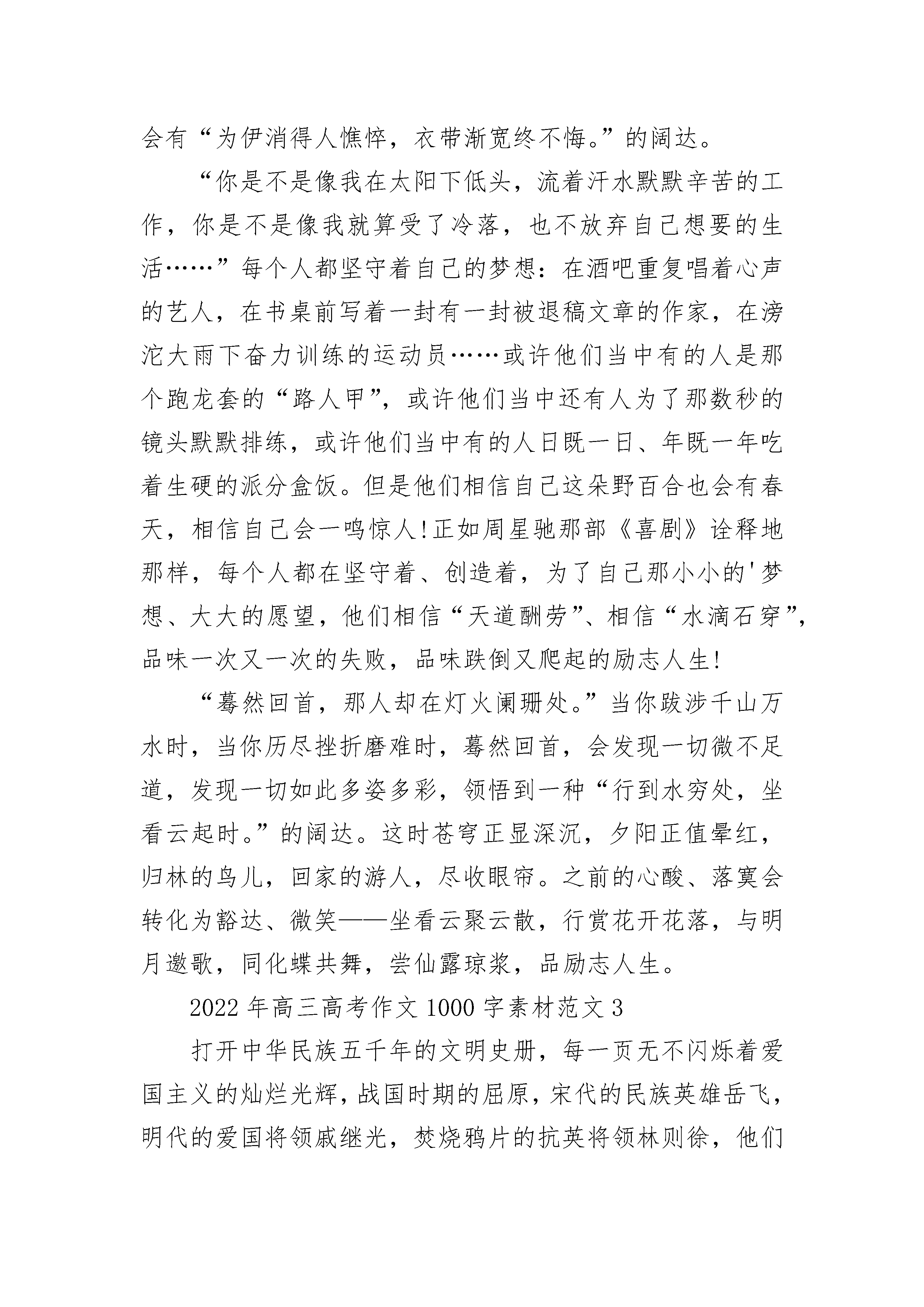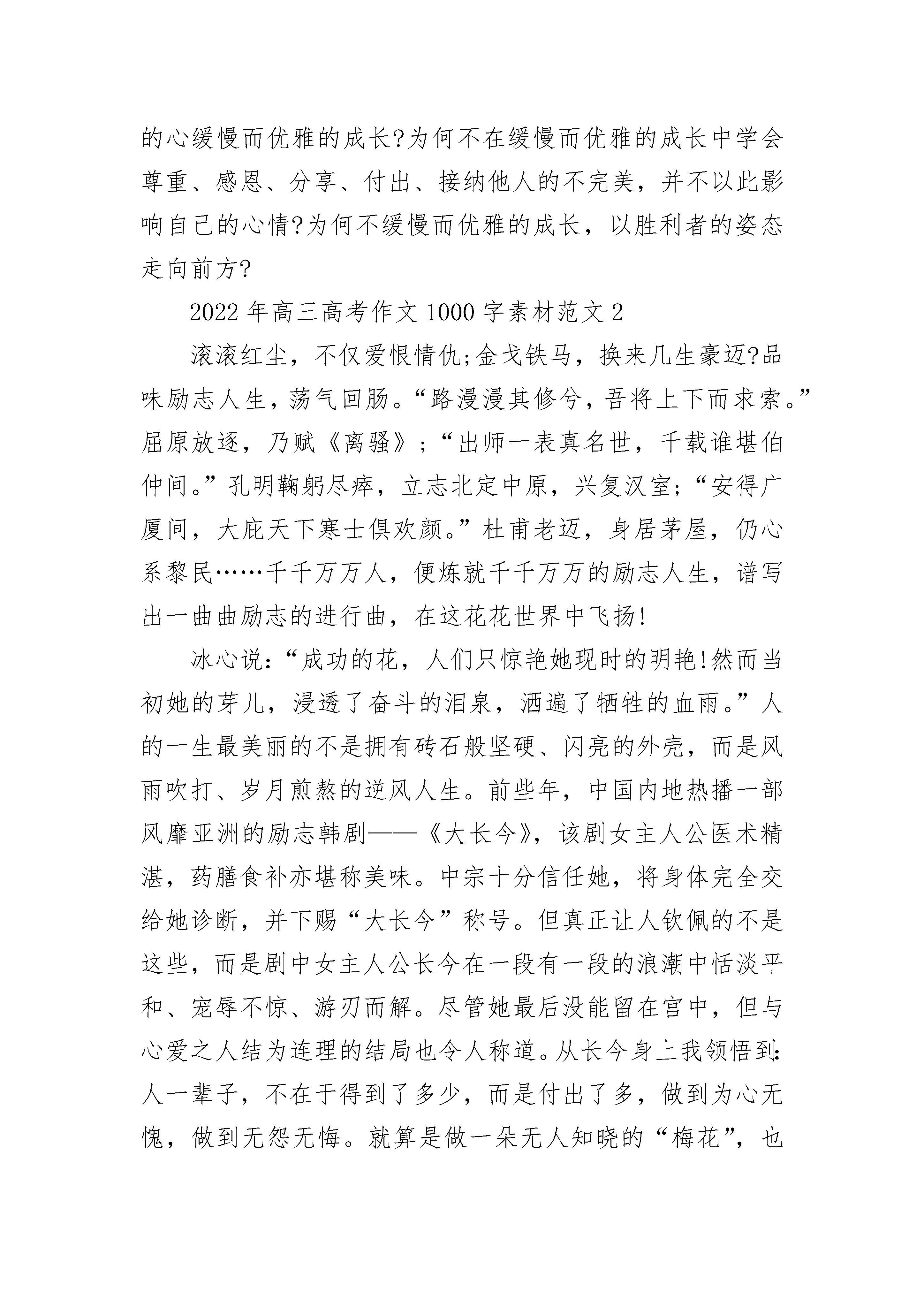 2022年高三高考作文1000字素材范文个人成长是每一个人一生的功课,该如何成长呢?生物学层面的成长是一个人孕育、出生、长大、衰老、最后回归自然的过程。蝴蝶是自然界的种群之一,蝴蝶的成长是痛苦的,但就算是死亡,每一只蝴蝶都会收获美丽的翅膀。人类也是自然界种群之一,人类的成长也是痛苦的,或许还夹杂着各种情感,但每一个人的收获不会雷同。如果成长要分阶段,最令人难忘的恐怕就是这美好而又残酷,轻松而又繁重的高中生活吧!成长是需要耐心的,因为它必须是缓慢的,有条不紊的进行。就像一场马拉松,如果只图一时快意。只顾埋头向前冲,结果只会是因体力透支或者跑错轨道半途而废。?成长是如此的缓慢,如此的优雅。缓慢到我察觉不到自己的变化,优雅到我忘记它的存在。或许多年后蓦然回首,才会发现那些飞满青春天空的纸鹤,早已散落在了风中,随着岁月的流淌都化成了灰烬。就像现在的我闲暇时翻旧照片时,才发现童年的那些美好恍然如隔世。一直以为我还是那个无忧无虑的孩童,才发现原来我早已担负起我应有的责任,向前走了很远很远。或许不同的是那些喜怒哀乐还会历历在目,因为实在是刻骨铭心。它就是如此缓慢而优雅。我曾经做过一道心理测试题:你是否愿意跳过痛苦的成长过程,直接到达七年后?我断然选择了“否”。我知道,成长是痛苦的,也是必不可少的,我愿以一颗平静的心静静的等待,接受命运给我安排的一场又一场舞台剧。淡然处之,安之若泰。可并不是所有人都会选择“否”。在我看来,有些学生已经忘记该怎样成长。在“马拉松”上只顾埋头向前。或许是因为受不了外界的诱惑,迷失了那一颗平静的心,忘记了成长应缓慢而优雅的进行。本应素面朝天单纯无邪的高中生,却把一张张纯真的面孔藏在厚厚的脂粉和水彩下面。或许是为了更美丽,亦或许是为了变得美丽。但那些用脂粉和水彩画出的面孔真的算“美”吗?素面朝天并不是美丽女人的专利,而是作为一个在校高中生的本分。看着我们周围:每一棵树、每一叶草、每一朵花,都不化妆,面对骄阳、面对暴雨、面对风雪,它们都本色而自然。作为万物灵长的人类,为何要将自己隐藏在脂粉和油彩的后面?或许是因为现实的残酷,抛弃了那一颗平静的心,违背了成长应优雅而缓慢的进行。本应心无旁骛的坐在教室学习的高中生,却整日流年忘返于网吧和酒吧之间。或许是学业太过沉重,亦或许是现实太过残酷。但沉溺于虚幻的网络世界就是真的快乐吗?游离于醉生梦死就是真的快乐吗?是否看着满地尸骸或者成堆的酒罐会有成就感?以虚无缥缈的快乐为快乐真的快乐吗?看着我们的周围:每一棵树、每一叶草、每一朵花,都不逃避,面对骄阳、面对暴雪、面对风雪,他们都坚韧而顽强。作为万物灵长的人类,为何要逃避本应有的磨难和痛苦?为何我们不以淡然的姿态迎接命运的安排、以一颗平静的心缓慢而优雅的成长?为何不在缓慢而优雅的成长中学会尊重、感恩、分享、付出、接纳他人的不完美,并不以此影响自己的心情?为何不缓慢而优雅的成长,以胜利者的姿态走向前方?2022年高三高考作文1000字素材范文2滚滚红尘,不仅爱恨情仇;金戈铁马,换来几生豪迈?品味励志人生,荡气回肠。“路漫漫其修兮,吾将上下而求索。”屈原放逐,乃赋《离骚》;“出师一表真名世,千载谁堪伯仲间。”孔明鞠躬尽瘁,立志北定中原,兴复汉室;“安得广厦间,大庇天下寒士俱欢颜。”杜甫老迈,身居茅屋,仍心系黎民……千千万万人,便炼就千千万万的励志人生,谱写出一曲曲励志的进行曲,在这花花世界中飞扬!冰心说:“成功的花,人们只惊艳她现时的明艳!然而当初她的芽儿,浸透了奋斗的泪泉,洒遍了牺牲的血雨。”人的一生最美丽的不是拥有砖石般坚硬、闪亮的外壳,而是风雨吹打、岁月煎熬的逆风人生。前些年,中国内地热播一部风靡亚洲的励志韩剧——《大长今》,该剧女主人公医术精湛,药膳食补亦堪称美味。中宗十分信任她,将身体完全交给她诊断,并下赐“大长今”称号。但真正让人钦佩的不是这些,而是剧中女主人公长今在一段有一段的浪潮中恬淡平和、宠辱不惊、游刃而解。尽管她最后没能留在宫中,但与心爱之人结为连理的结局也令人称道。从长今身上我领悟到:人一辈子,不在于得到了多少,而是付出了多,做到为心无愧,做到无怨无悔。就算是做一朵无人知晓的“梅花”,也会有“为伊消得人憔悴,衣带渐宽终不悔。”的阔达。“你是不是像我在太阳下低头,流着汗水默默辛苦的工作,你是不是像我就算受了冷落,也不放弃自己想要的生活……”每个人都坚守着自己的梦想:在酒吧重复唱着心声的艺人,在书桌前写着一封有一封被退稿文章的作家,在滂沱大雨下奋力训练的运动员……或许他们当中有的人是那个跑龙套的“路人甲”,或许他们当中还有人为了那数秒的镜头默默排练,或许他们当中有的人日既一日、年既一年吃着生硬的派分盒饭。但是他们相信自己这朵野百合也会有春天,相信自己会一鸣惊人!正如周星驰那部《喜剧》诠释地那样,每个人都在坚守着、创造