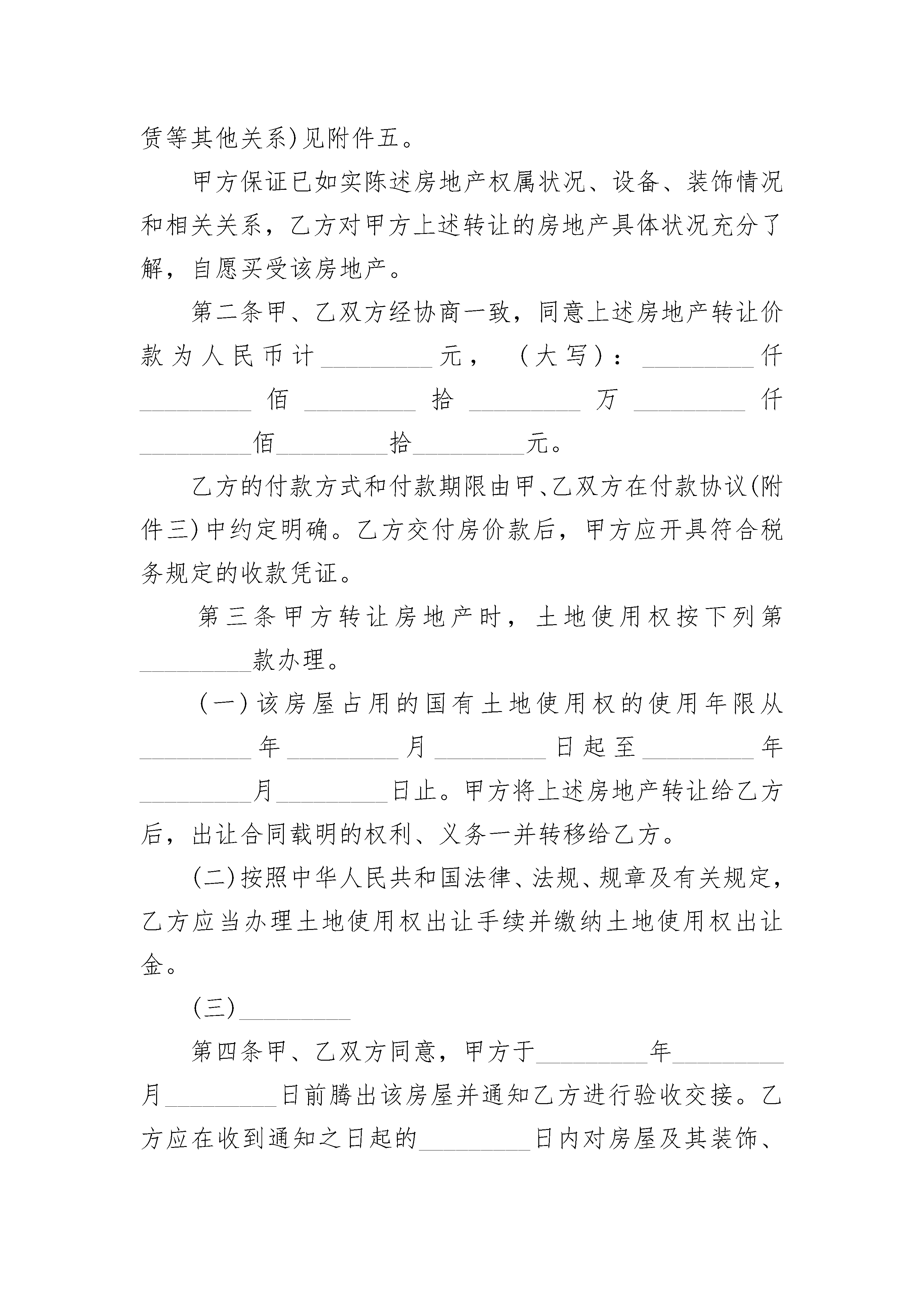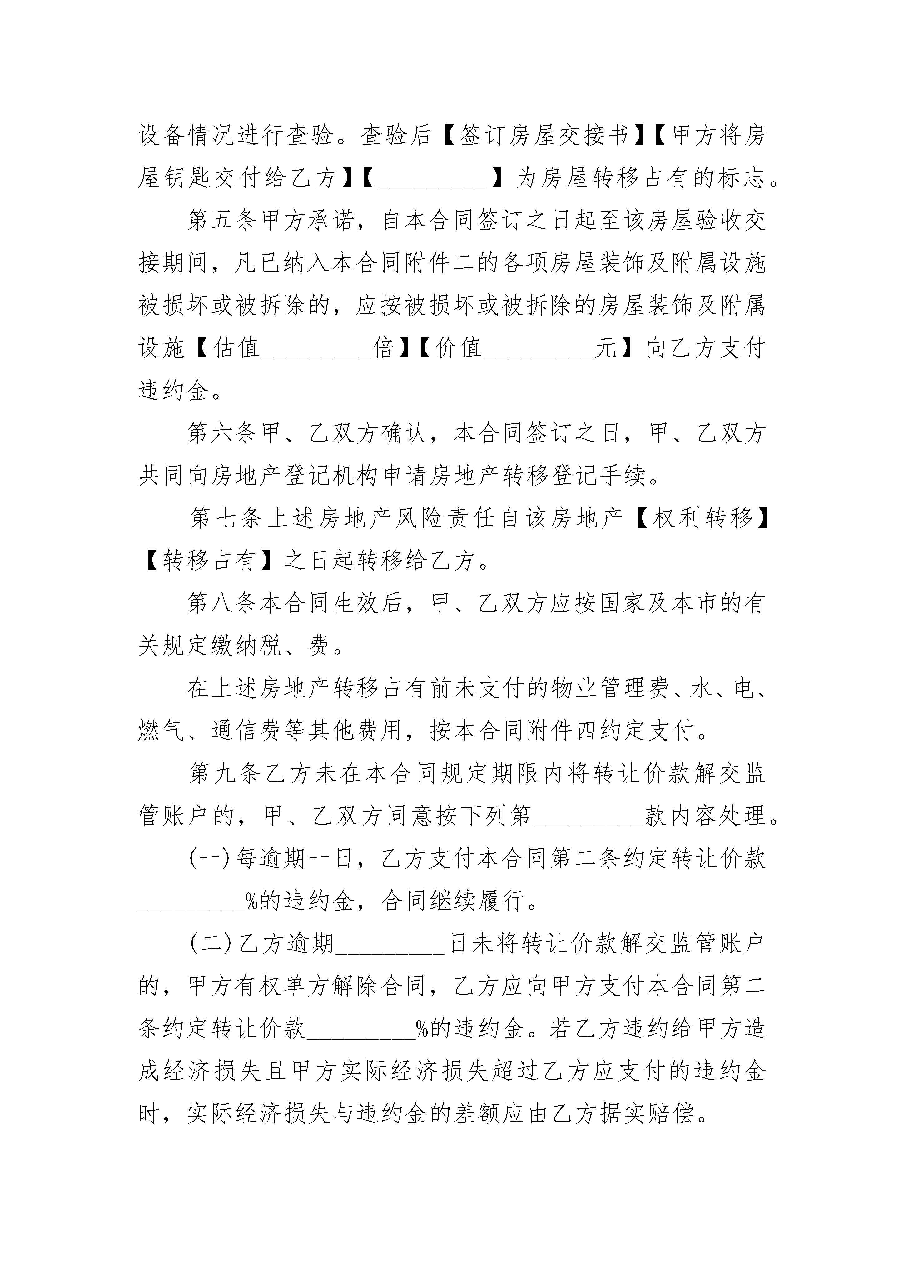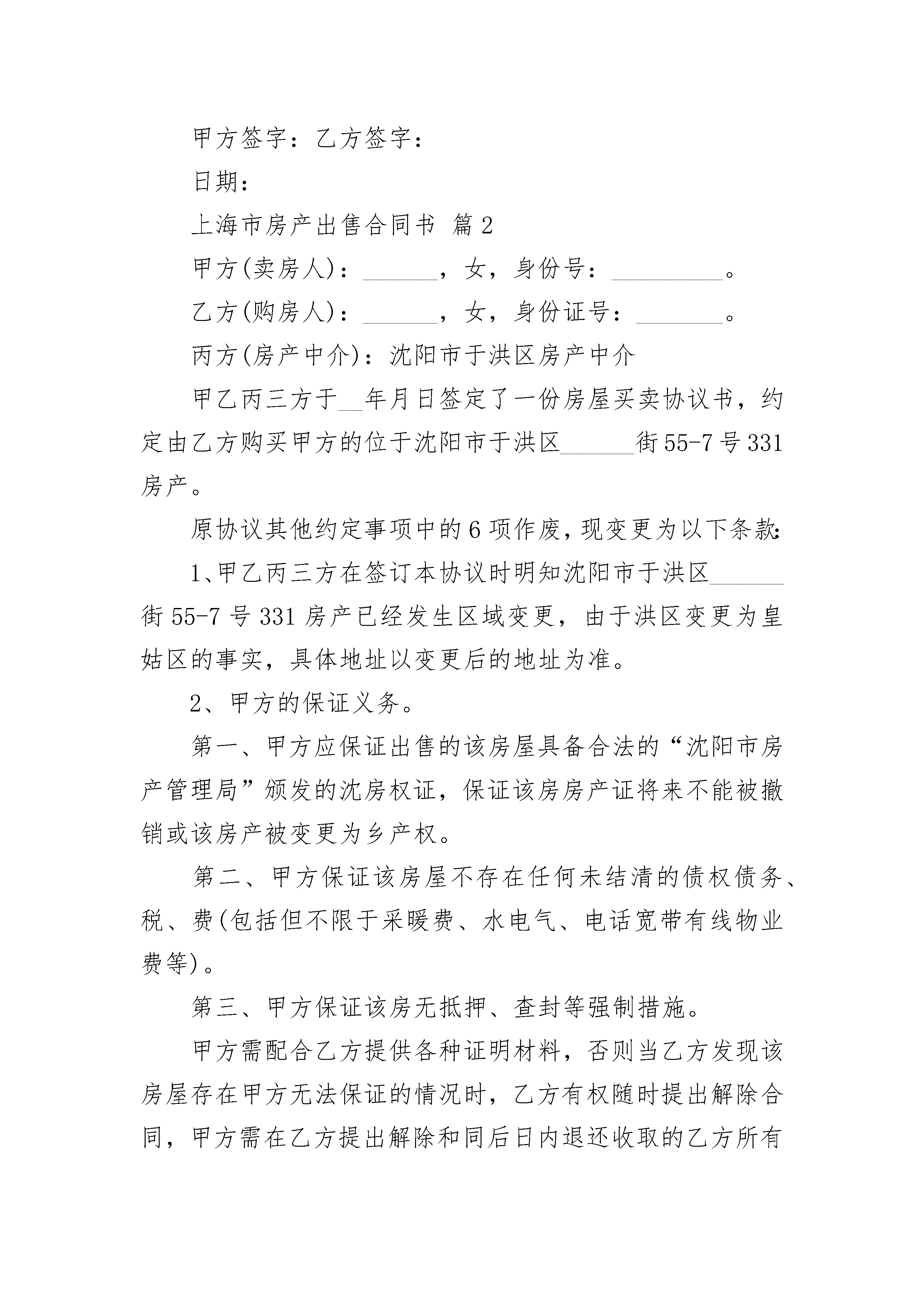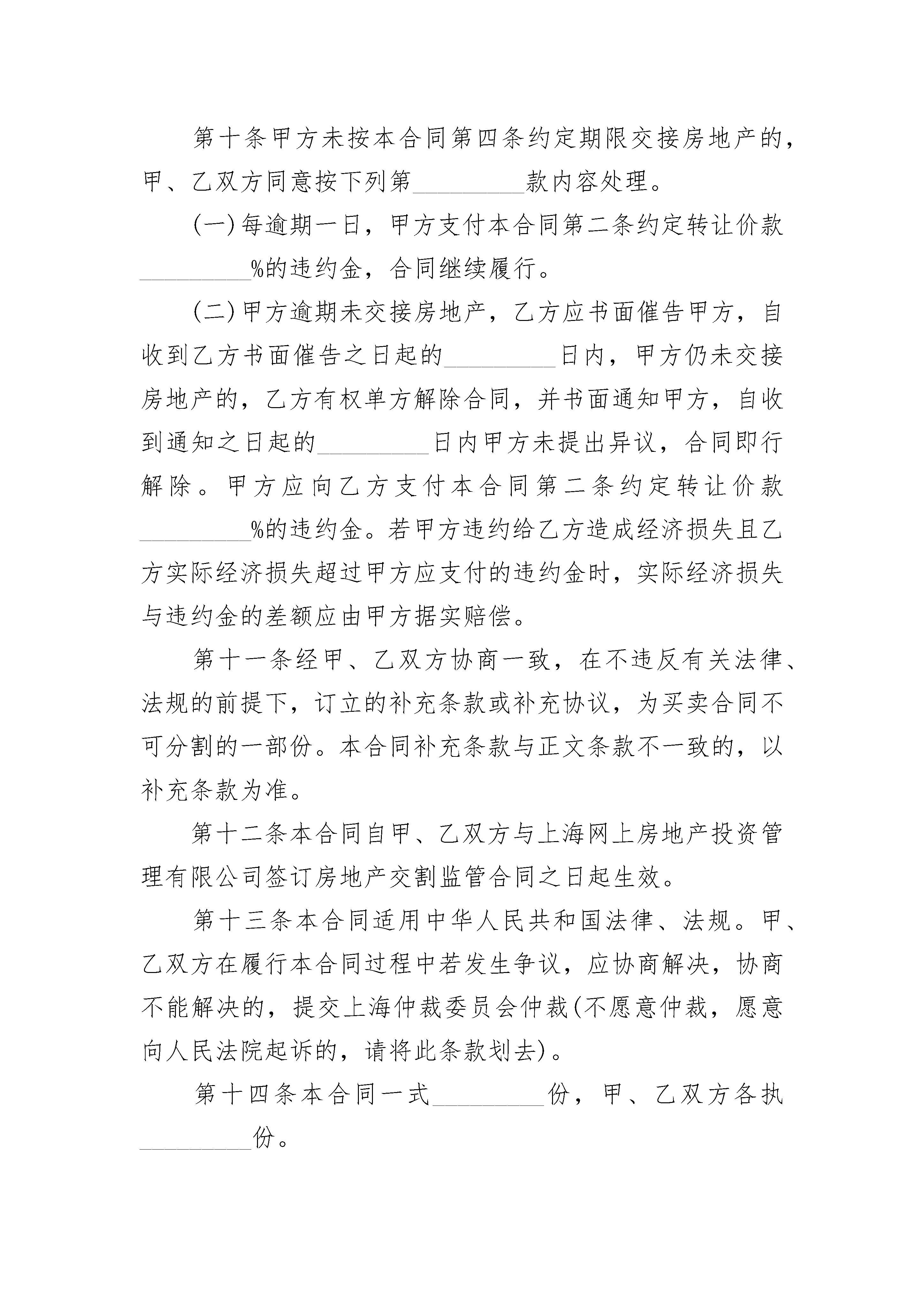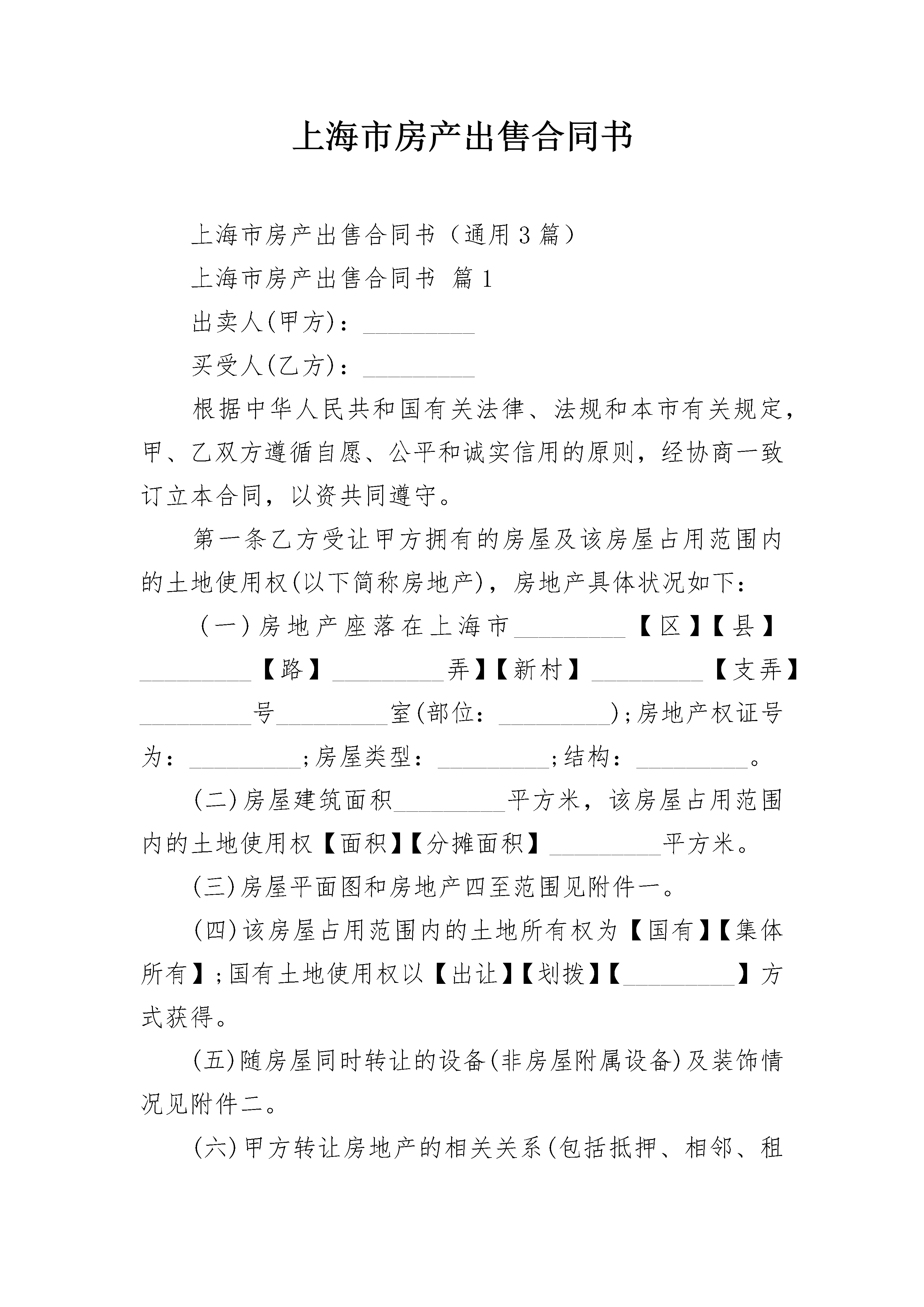 上海市房产出售合同书上海市房产出售合同书(通用3篇)上海市房产出售合同书篇1出卖人(甲方):_________买受人(乙方):_________根据中华人民共和国有关法律、法规和本市有关规定,甲、乙双方遵循自愿、公平和诚实信用的原则,经协商一致订立本合同,以资共同遵守。第一条乙方受让甲方拥有的房屋及该房屋占用范围内的土地使用权(以下简称房地产),房地产具体状况如下:(一)房地产座落在上海市_________【区】【县】_________【路】_________弄】【新村】_________【支弄】_________号_________室(部位:_________);房地产权证号为:_________;房屋类型:_________;结构:_________。(二)房屋建筑面积_________平方米,该房屋占用范围内的土地使用权【面积】【分摊面积】_________平方米。(三)房屋平面图和房地产四至范围见附件一。(四)该房屋占用范围内的土地所有权为【国有】【集体所有】;国有土地使用权以【出让】【划拨】【_________】方式获得。(五)随房屋同时转让的设备(非房屋附属设备)及装饰情况见附件二。(六)甲方转让房地产的相关关系(包括抵押、相邻、租赁等其他关系)见附件五。甲方保证已如实陈述房地产权属状况、设备、装饰情况和相关关系,乙方对甲方上述转让的房地产具体状况充分了解,自愿买受该房地产。第二条甲、乙双方经协商一致,同意上述房地产转让价款为人民币计_________元,(大写):_________仟_________佰_________拾_________万_________仟_________佰_________拾_________元。乙方的付款方式和付款期限由甲、乙双方在付款协议(附件三)中约定明确。乙方交付房价款后,甲方应开具符合税务规定的收款凭证。第三条甲方转让房地产时,土地使用权按下列第_________款办理。(一)该房屋占用的国有土地使用权的使用年限从_________年_________月_________日起至_________年_________月_________日止。甲方将上述房地产转让给乙方后,出让合同载明的权利、义务一并转移给乙方。(二)按照中华人民共和国法律、法规、规章及有关规定,乙方应当办理土地使用权出让手续并缴纳土地使用权出让金。(三)_________第四条甲、乙双方同意,甲方于_________年_________月_________日前腾出该房屋并通知乙方进行验收交接。乙方应在收到通知之日起的_________日内对房屋及其装饰、设备情况进行查验。查验后【签订房屋交接书】【甲方将房屋钥匙交付给乙方】【_________】为房屋转移占有的标志。第五条甲方承诺,自本合同签订之日起至该房屋验收交接期间,凡已纳入本合同附件二的各项房屋装饰及附属设施被损坏或被拆除的,应按被损坏或被拆除的房屋装饰及附属设施【估值_________倍】【价值_________元】向乙方支付违约金。第六条甲、乙双方确认,本合同签订之日,甲、乙双方共同向房地产登记机构申请房地产转移登记手续。第七条上述房地产风险责任自该房地产【权利转移】【转移占有】之日起转移给乙方。第八条本合同生效后,甲、乙双方应按国家及本市的有关规定缴纳税、费。在上述房地产转移占有前未支付的物业管理费、水、电、燃气、通信费等其他费用,按本合同附件四约定支付。第九条乙方未在本合同规定期限内将转让价款解交监管账户的,甲、乙双方同意按下列第_________款内容处理。(一)每逾期一日,乙方支付本合同第二条约定转让价款_________%的违约金,合同继续履行。(二)乙方逾期_________日未将转让价款解交监管账户的,甲方有权单方解除合同,乙方应向甲方支付本合同第二条约定转让价款_________%的违约金。若乙方违约给甲方造成经济损失且甲方实际经济损失超过乙方应支付的违约金时,实际经济损失与违约金的差额应由乙方据实赔偿。第十条甲方未按本合同第四条约定期限交接房地产的,甲、乙双方同意按下列第_________款内容处理。(一)每逾期一日,甲方支付本合同第二条约定转让价款_________%的违约金,合同继续履行。(二)甲方逾期未交接房地产,乙方应书面催告甲方,自收到乙方书面催告之日起的_________日内,甲方仍未交接房地产的,乙方有权单方解除合同,并书面通知甲方,自收到通知之日起的_________日内甲方未提出异议,合同即行解除。甲方应向乙方支付本合同第二条约定转让价款_________%的违约金。若甲方违约给乙方造成经济损失且乙方实际经济损失超过甲方应支付的违约金时,实际经济损失与违约金的差额应由甲方据实赔偿。第十一条经甲、乙双方协商一致,在不