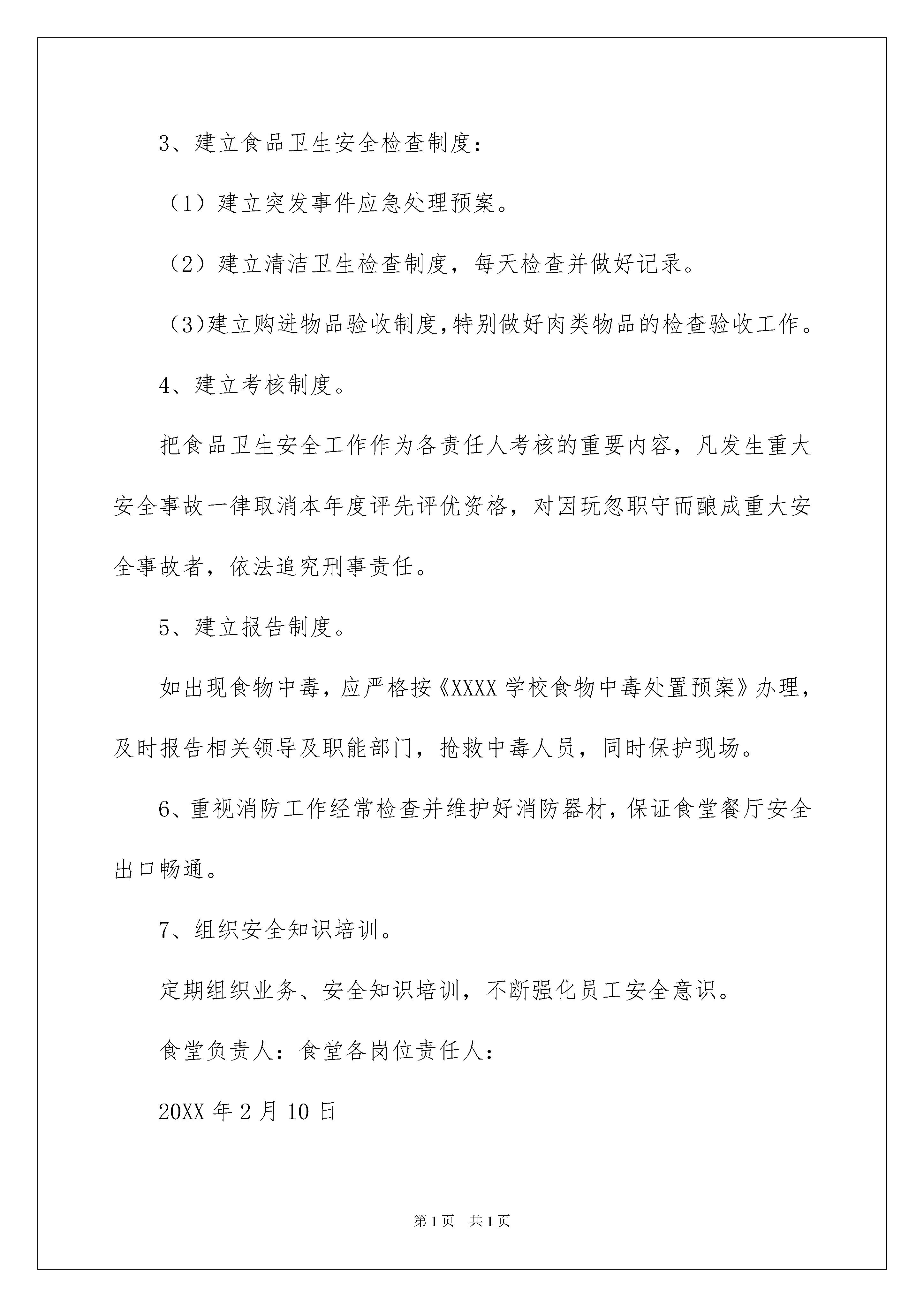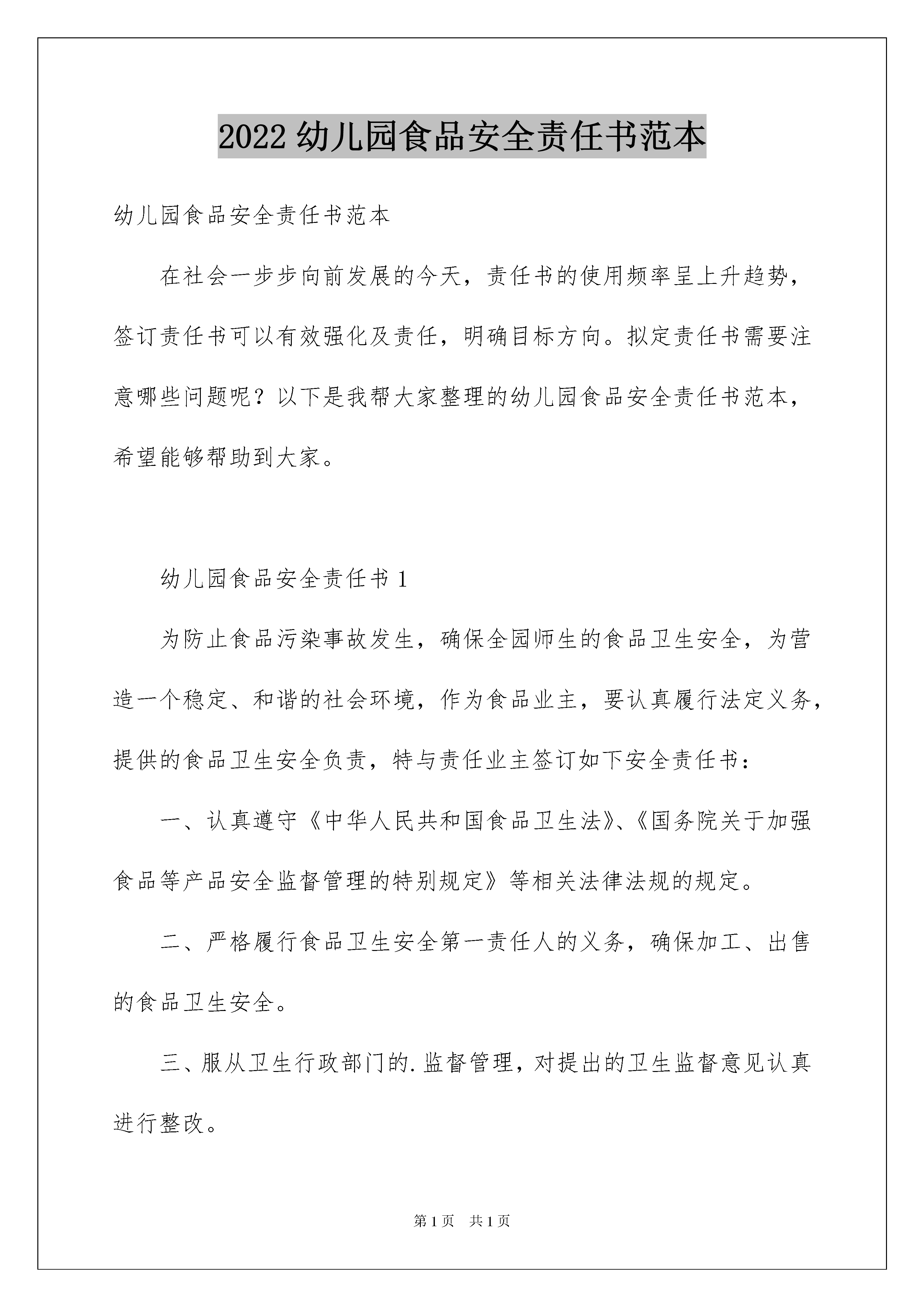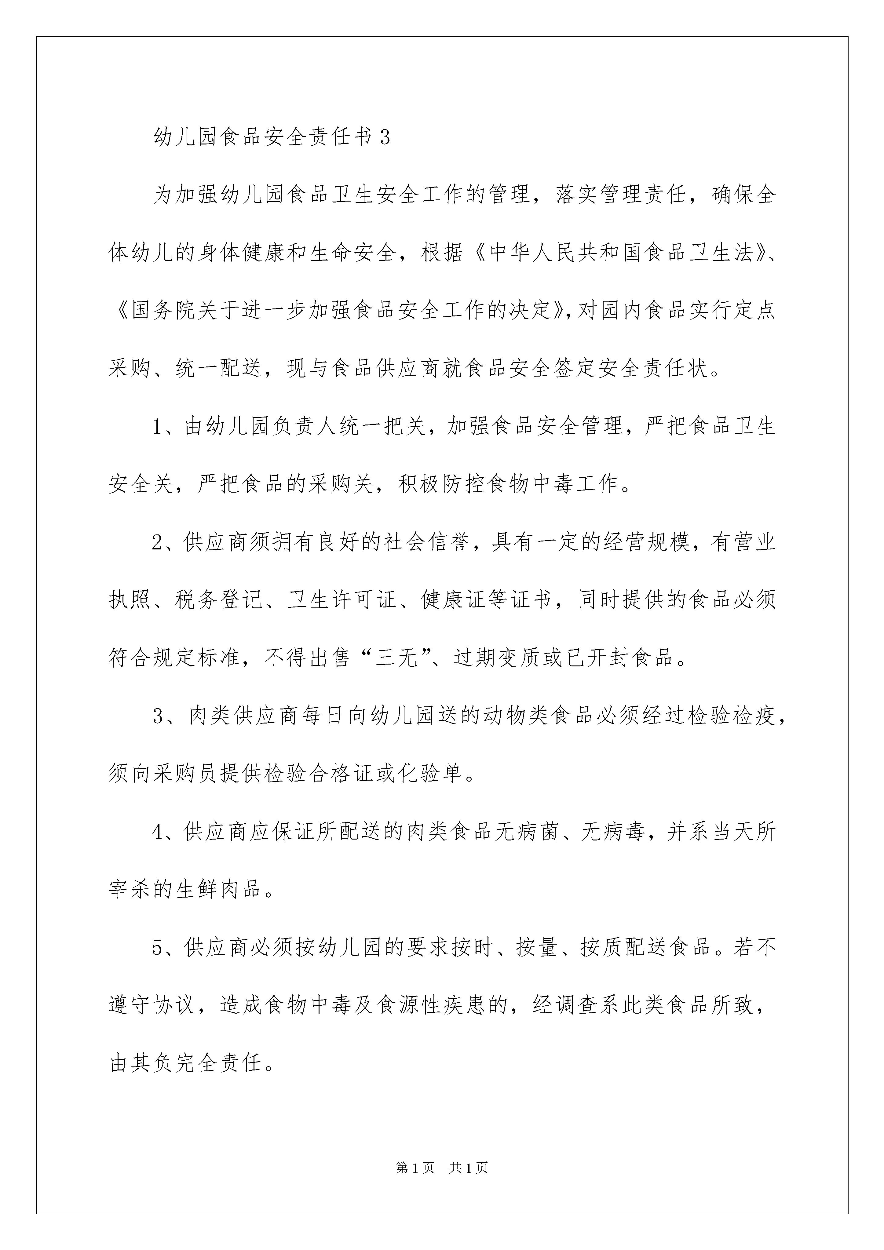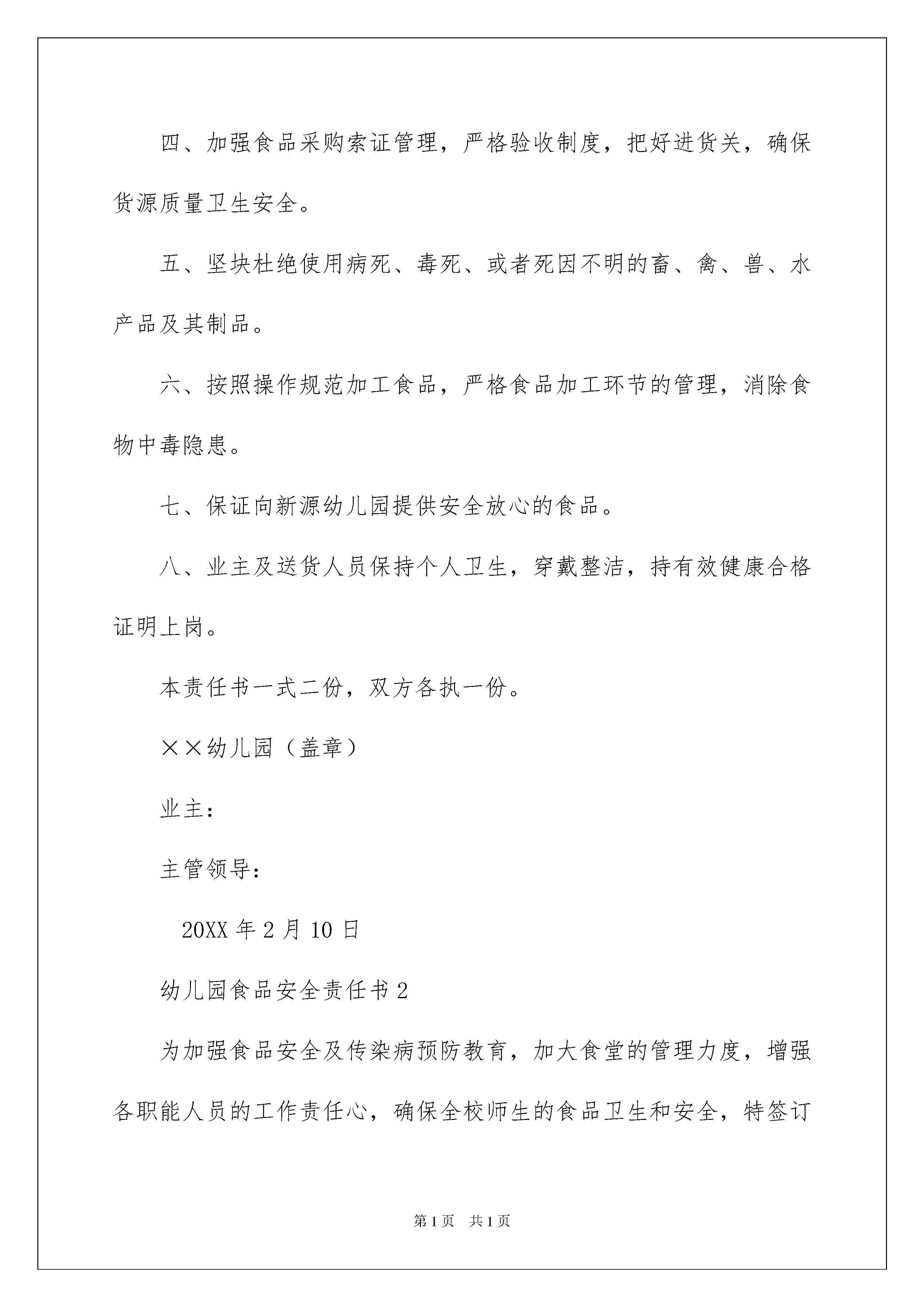 2022幼儿园食品安全责任书范本幼儿园食品安全责任书范本在社会一步步向前发展的今天,责任书的使用频率呈上升趋势,签订责任书可以有效强化及责任,明确目标方向。拟定责任书需要注意哪些问题呢?以下是我帮大家整理的幼儿园食品安全责任书范本,希望能够帮助到大家。幼儿园食品安全责任书1为防止食品污染事故发生,确保全园师生的食品卫生安全,为营造一个稳定、和谐的社会环境,作为食品业主,要认真履行法定义务,提供的食品卫生安全负责,特与责任业主签订如下安全责任书:一、认真遵守《中华人民共和国食品卫生法》、《国务院关于加强食品等产品安全监督管理的特别规定》等相关法律法规的规定。二、严格履行食品卫生安全第一责任人的义务,确保加工、出售的食品卫生安全。三、服从卫生行政部门的.监督管理,对提出的卫生监督意见认真进行整改。四、加强食品采购索证管理,严格验收制度,把好进货关,确保货源质量卫生安全。五、坚块杜绝使用病死、毒死、或者死因不明的畜、禽、兽、水产品及其制品。六、按照操作规范加工食品,严格食品加工环节的管理,消除食物中毒隐患。七、保证向新源幼儿园提供安全放心的食品。八、业主及送货人员保持个人卫生,穿戴整洁,持有效健康合格证明上岗。本责任书一式二份,双方各执一份。××幼儿园(盖章)业主:主管领导:20XX年2月10日幼儿园食品安全责任书2为加强食品安全及传染病预防教育,加大食堂的管理力度,增强各职能人员的工作责任心,确保全校师生的食品卫生和安全,特签订本责任书。1、建立食品卫生安全责任制食堂以管理员、班长为核心开展工作,保管、采购具体负责,层层落实责任制,食堂分别制定出管理员、班长、保管、采购、厨师职责,各类人员必须严格按职责行事。2、完善食堂卫生安全管理制度:(1)建立健全食品卫生安全档案,做好所售食品的留样记录。(2)保持环境卫生,消除有害昆虫的孳生环境,净化进餐环境。加工食品必须做到原料清洗干净,生、熟食品及成品、半成品分开,避免交叉污染。(3)原料采购严格实行索证制度,大宗物品米、面、油、肉等定点采购,不购劣质、变质食品,做好记录台帐。(4)食品原料分类堆放,离地离墙,建标立卡,有遮有盖,定期检查,库房不存放与食品无关的杂物及有毒有害的化学物质。(5)剩余饭菜应充分加热(中心温度达到80℃),班长或管理员品尝后方可出售。(6)餐具清洁消毒,防止传染病的发生。严格防控措施,防止人为破坏或投毒。3、建立食品卫生安全检查制度:(1)建立突发事件应急处理预案。(2)建立清洁卫生检查制度,每天检查并做好记录。(3)建立购进物品验收制度,特别做好肉类物品的检查验收工作。4、建立考核制度。把食品卫生安全工作作为各责任人考核的重要内容,凡发生重大安全事故一律取消本年度评先评优资格,对因玩忽职守而酿成重大安全事故者,依法追究刑事责任。5、建立报告制度。如出现食物中毒,应严格按《XXXX学校食物中毒处置预案》办理,及时报告相关领导及职能部门,抢救中毒人员,同时保护现场。6、重视消防工作经常检查并维护好消防器材,保证食堂餐厅安全出口畅通。7、组织安全知识培训。定期组织业务、安全知识培训,不断强化员工安全意识。食堂负责人:食堂各岗位责任人:20XX年2月10日幼儿园食品安全责任书3为加强幼儿园食品卫生安全工作的管理,落实管理责任,确保全体幼儿的身体健康和生命安全,根据《中华人民共和国食品卫生法》、《国务院关于进一步加强食品安全工作的决定》,对园内食品实行定点采购、统一配送,现与食品供应商就食品安全签定安全责任状。1、由幼儿园负责人统一把关,加强食品安全管理,严把食品卫生安全关,严把食品的采购关,积极防控食物中毒工作。2、供应商须拥有良好的社会信誉,具有一定的经营规模,有营业执照、税务登记、卫生许可证、健康证等证书,同时提供的食品必须符合规定标准,不得出售“三无”、过期变质或已开封食品。3、肉类供应商每日向幼儿园送的动物类食品必须经过检验检疫,须向采购员提供检验合格证或化验单。4、供应商应保证所配送的肉类食品无病菌、无病毒,并系当天所宰杀的生鲜肉品。5、供应商必须按幼儿园的要求按时、按量、按质配送食品。若不遵守协议,造成食物中毒及食源性疾患的,经调查系此类食品所致,由其负完全责任。此责任状一式二份,从20xx年9月1日至20xx年8月31日止。中心小学幼儿园、食品供应商各执一份。中心小学幼儿园(盖章):内类食品供应商(签章):校(园)长(签章):采购员(签章):20xx年9月1日幼儿园食品安全责任书4第一、严格按《中华人民共和国食品卫生法》和卫生部颁发的《学校食堂集体用餐卫生管理规定》等有关法律法规和文件精神,以及学