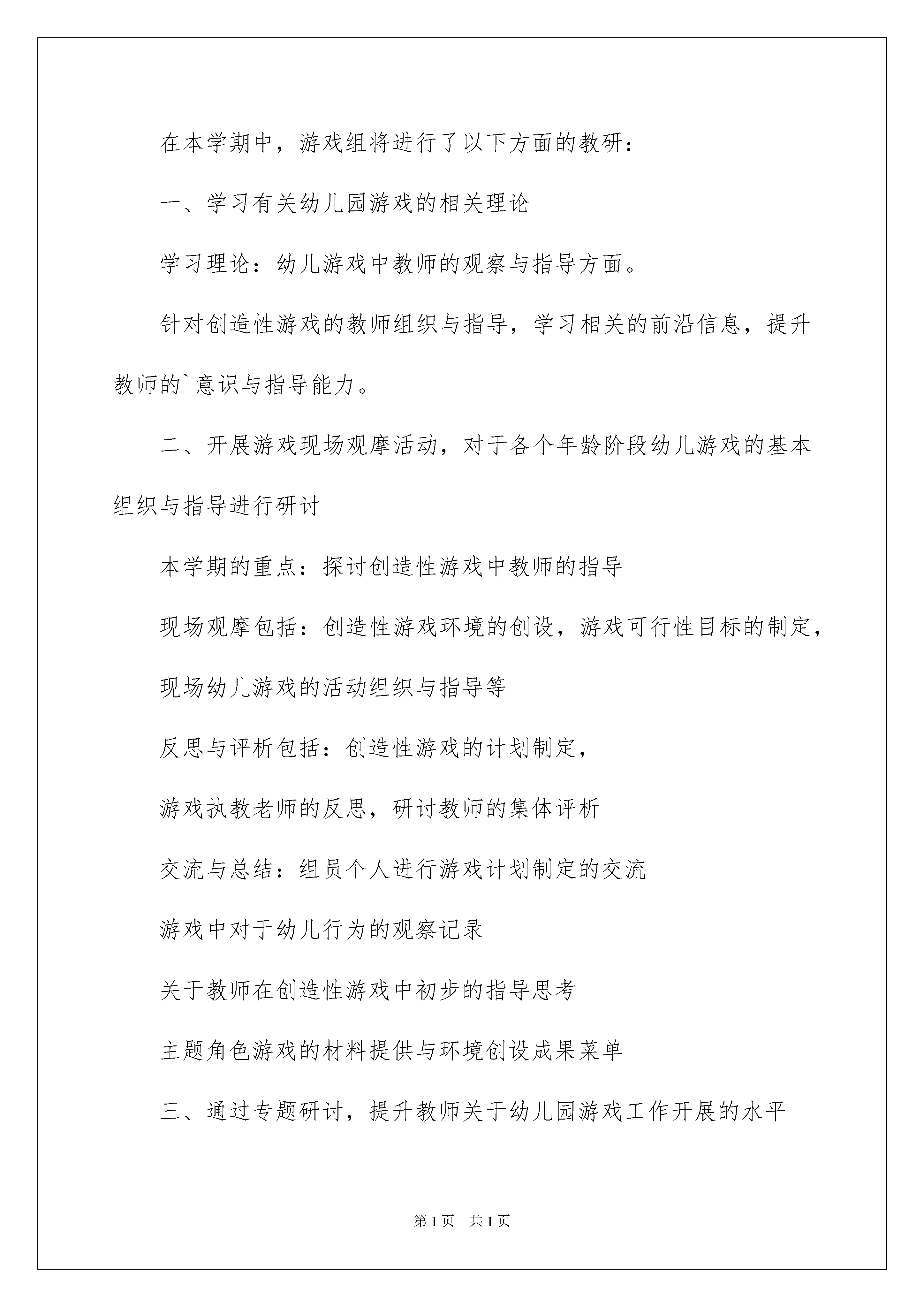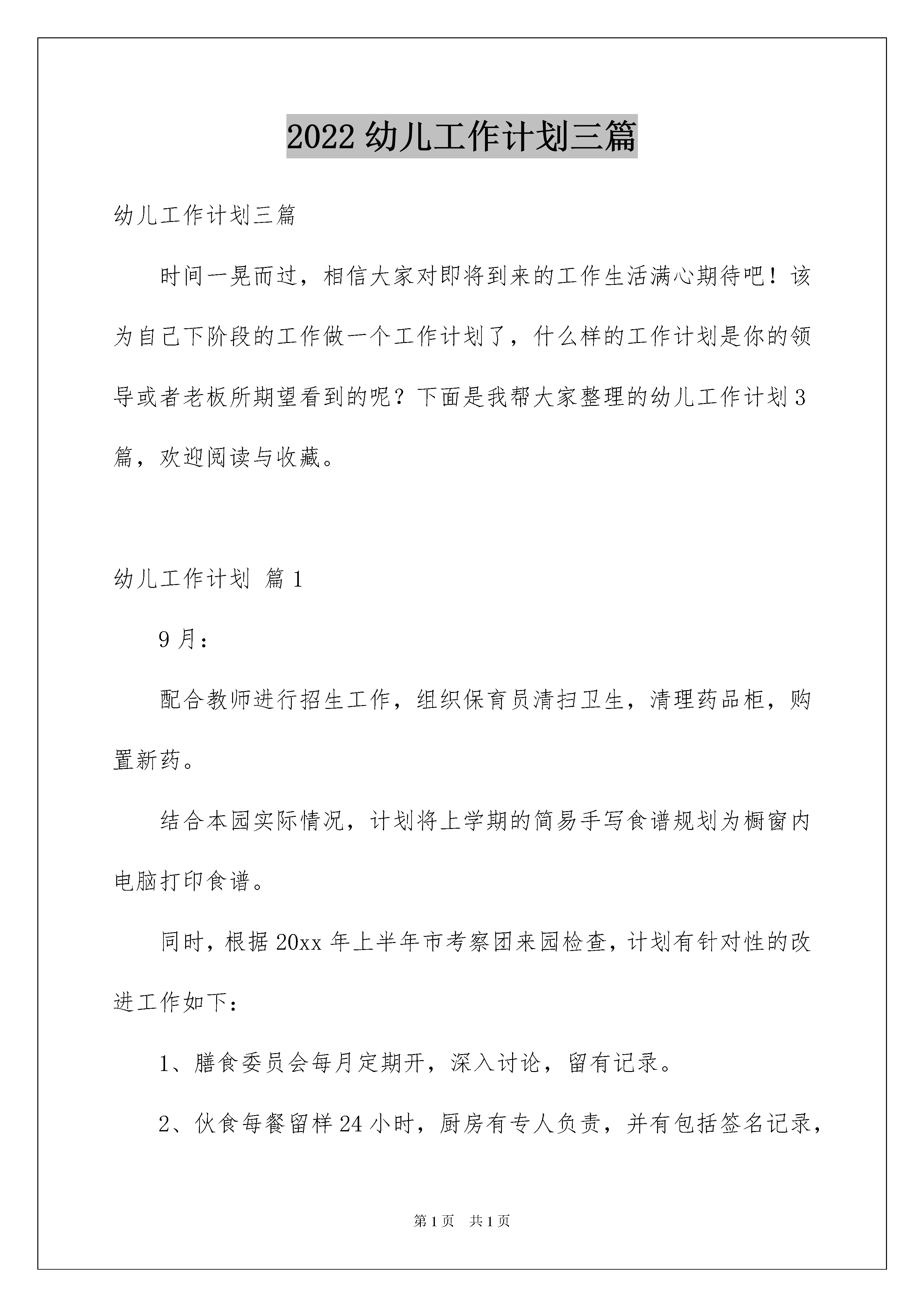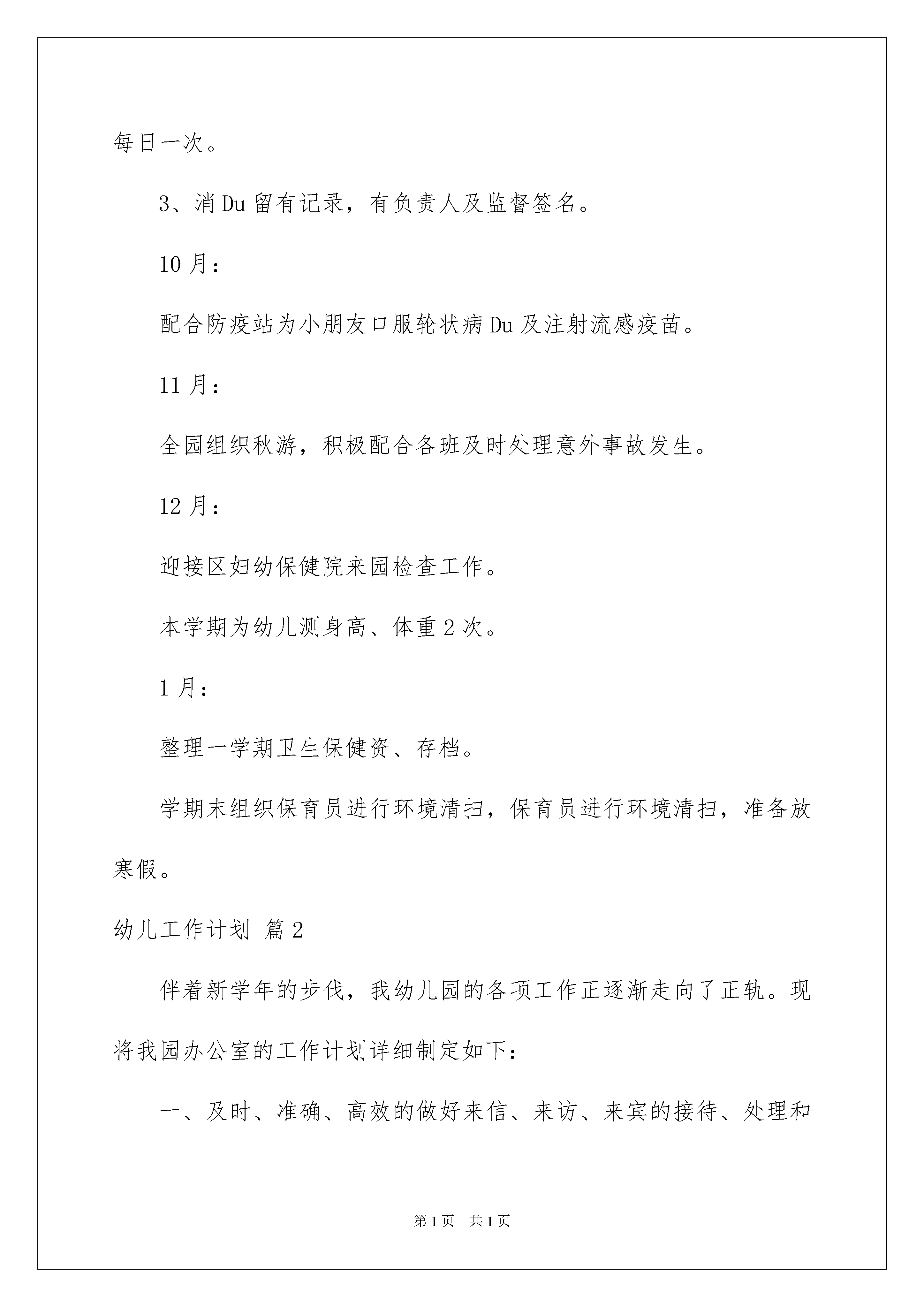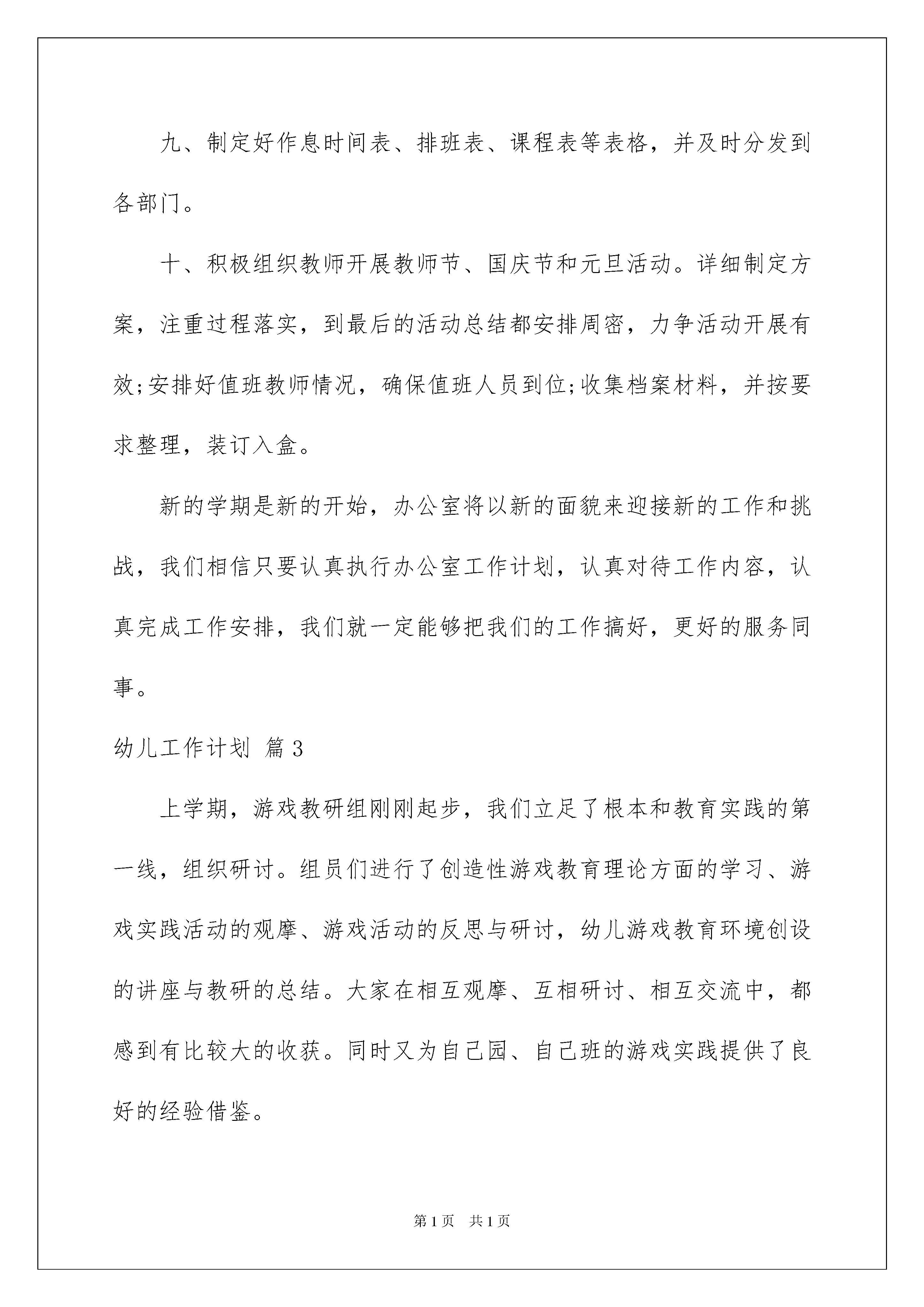 2022幼儿工作计划三篇幼儿工作计划三篇时间一晃而过,相信大家对即将到来的工作生活满心期待吧!该为自己下阶段的工作做一个工作计划了,什么样的工作计划是你的领导或者老板所期望看到的呢?下面是我帮大家整理的幼儿工作计划3篇,欢迎阅读与收藏。幼儿工作计划篇19月:配合教师进行招生工作,组织保育员清扫卫生,清理药品柜,购置新药。结合本园实际情况,计划将上学期的简易手写食谱规划为橱窗内电脑打印食谱。同时,根据20xx年上半年市考察团来园检查,计划有针对性的改进工作如下:1、膳食委员会每月定期开,深入讨论,留有记录。2、伙食每餐留样24小时,厨房有专人负责,并有包括签名记录,每日一次。3、消Du留有记录,有负责人及监督签名。10月:配合防疫站为小朋友口服轮状病Du及注射流感疫苗。11月:全园组织秋游,积极配合各班及时处理意外事故发生。12月:迎接区妇幼保健院来园检查工作。本学期为幼儿测身高、体重2次。1月:整理一学期卫生保健资、存档。学期末组织保育员进行环境清扫,保育员进行环境清扫,准备放寒假。幼儿工作计划篇2伴着新学年的步伐,我幼儿园的各项工作正逐渐走向了正轨。现将我园办公室的工作计划详细制定如下:一、及时、准确、高效的做好来信、来访、来宾的接待、处理和对外联络工作。做到热情接待、询问记录,及时处理,并请示汇报相关领导。二、做好各部门之间的协调工作,督办完成幼儿园总体工作。每月汇总全园考勤和各部门总结。三、做好上传下达工作。上级指令及时记录传达到园长,按园长指令传达到分管领导和教职工。四、做好文件的接收、传递、存档工作。文件到达幼儿园及时签收,做好签发记录。五、信息反馈。各部门工作的进展、完成情况及时反馈到园委会并督办落实到位。六、宣传报道。加强规范幼儿园网站管理。做好园内各项宣传及活动的组织工作。及时报道学校各项工作,向外拓展,树立幼儿园良好形象。七、做好办文、办会工作。做好每次会议的准备、会议纪要和考勤记载工作。八、实事求是的做好园务记录,确保各项考核、评优、评奖活动有据可依。九、制定好作息时间表、排班表、课程表等表格,并及时分发到各部门。十、积极组织教师开展教师节、国庆节和元旦活动。详细制定方案,注重过程落实,到最后的活动总结都安排周密,力争活动开展有效;安排好值班教师情况,确保值班人员到位;收集档案材料,并按要求整理,装订入盒。新的学期是新的开始,办公室将以新的面貌来迎接新的工作和挑战,我们相信只要认真执行办公室工作计划,认真对待工作内容,认真完成工作安排,我们就一定能够把我们的工作搞好,更好的服务同事。幼儿工作计划篇3上学期,游戏教研组刚刚起步,我们立足了根本和教育实践的第一线,组织研讨。组员们进行了创造性游戏教育理论方面的学习、游戏实践活动的观摩、游戏活动的反思与研讨,幼儿游戏教育环境创设的讲座与教研的总结。大家在相互观摩、互相研讨、相互交流中,都感到有比较大的收获。同时又为自己园、自己班的游戏实践提供了良好的经验借鉴。在本学期中,游戏组将进行了以下方面的教研:一、学习有关幼儿园游戏的相关理论学习理论:幼儿游戏中教师的观察与指导方面。针对创造性游戏的教师组织与指导,学习相关的前沿信息,提升教师的`意识与指导能力。二、开展游戏现场观摩活动,对于各个年龄阶段幼儿游戏的基本组织与指导进行研讨本学期的重点:探讨创造性游戏中教师的指导现场观摩包括:创造性游戏环境的创设,游戏可行性目标的制定,现场幼儿游戏的活动组织与指导等反思与评析包括:创造性游戏的计划制定,游戏执教老师的反思,研讨教师的集体评析交流与总结:组员个人进行游戏计划制定的交流游戏中对于幼儿行为的观察记录关于教师在创造性游戏中初步的指导思考主题角色游戏的材料提供与环境创设成果菜单三、通过专题研讨,提升教师关于幼儿园游戏工作开展的水平四、组织专家讲座,帮助教师在理论与实践中得到提高具体教研活动安排:活动日期活动时间活动地点活动内容9月16日第三周14:30一幼奥体(网络)理论学习(关于幼儿游戏指导的理论学习)教研计划交流确定游戏观摩的地点时间待通知8:30一幼奥体专家讲座:《研究性游戏的材料提供与环境创设》10月14日第七周8:30育英幼儿园游戏现场观摩(游戏的环境创设与材料提供)10月28日第九周8:30一幼奥体准备游戏组区开放活动观摩(游戏的计划与目标制定)11月4日第十周8:30一幼奥体建邺区开放周游戏组开放观摩11月25日第十三周8:30幼儿园关于游戏指导方面的讲座:《幼儿游戏中的观察与指导》12月9日第十五周8:30幼儿园游戏现场观摩(幼儿游戏的教师观察)12月23日第十七周14:30幼儿园游戏现场观摩(幼儿游戏