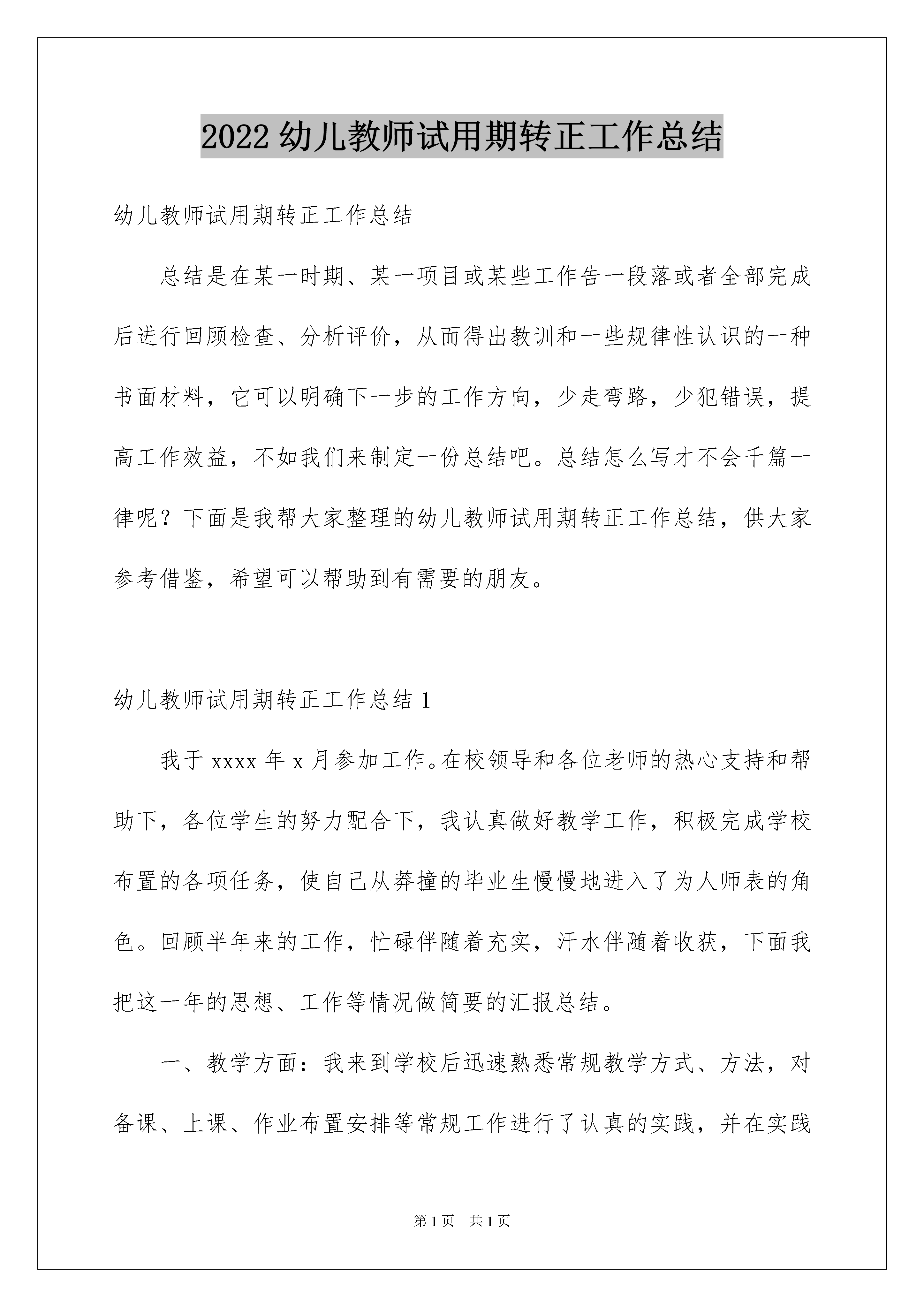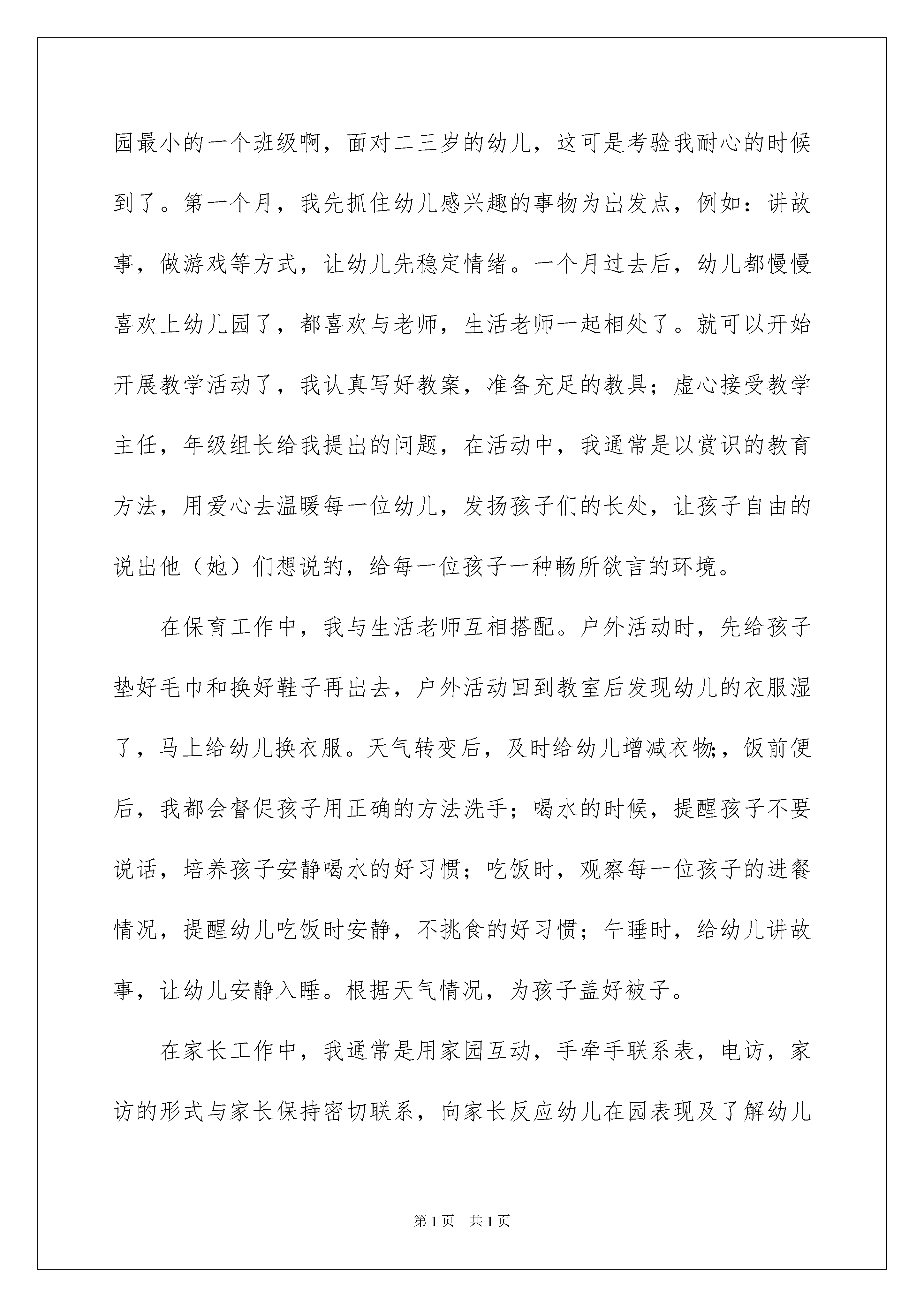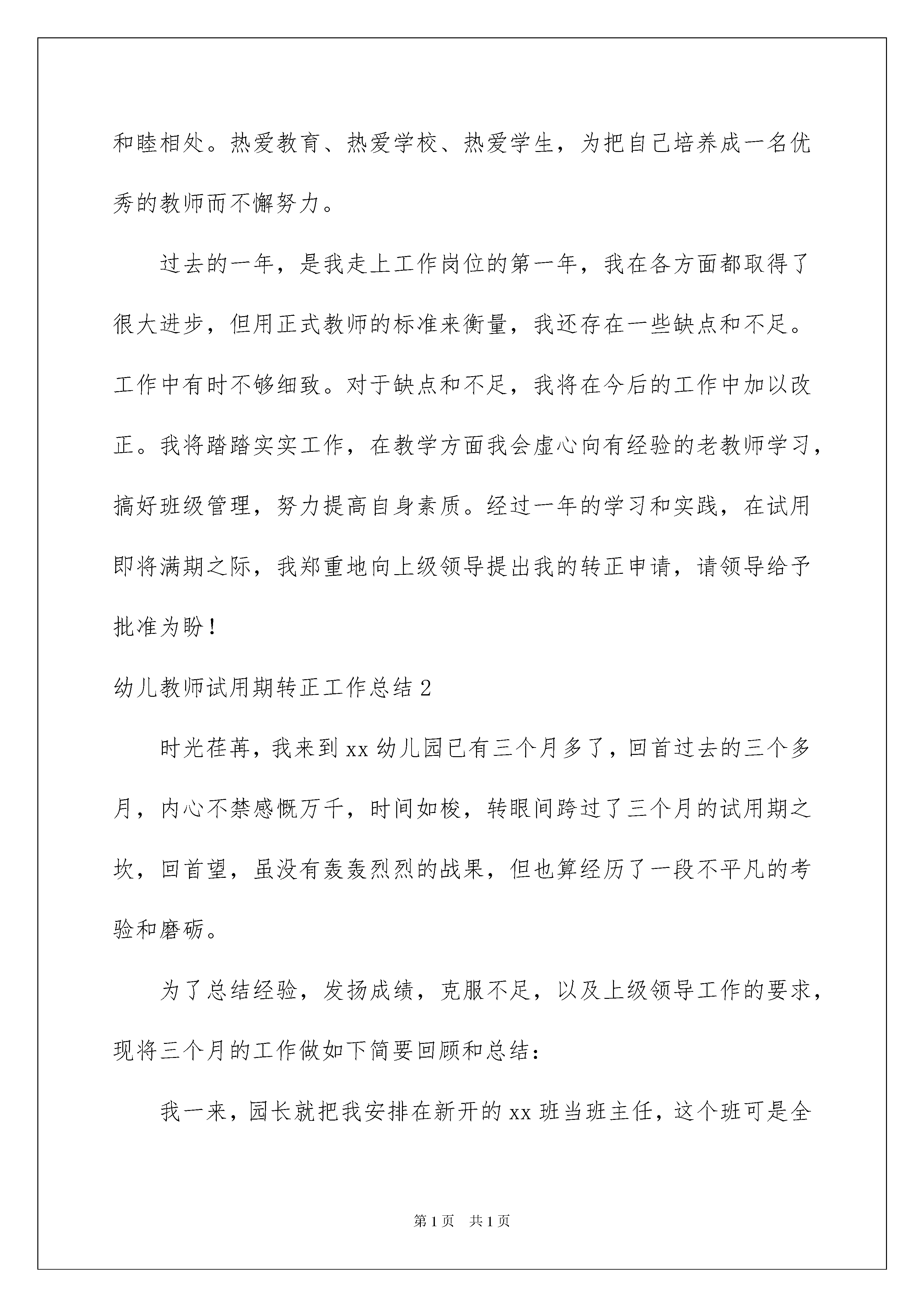 2022幼儿教师试用期转正工作总结幼儿教师试用期转正工作总结总结是在某一时期、某一项目或某些工作告一段落或者全部完成后进行回顾检查、分析评价,从而得出教训和一些规律性认识的一种书面材料,它可以明确下一步的工作方向,少走弯路,少犯错误,提高工作效益,不如我们来制定一份总结吧。总结怎么写才不会千篇一律呢?下面是我帮大家整理的幼儿教师试用期转正工作总结,供大家参考借鉴,希望可以帮助到有需要的朋友。幼儿教师试用期转正工作总结1我于xxxx年x月参加工作。在校领导和各位老师的热心支持和帮助下,各位学生的努力配合下,我认真做好教学工作,积极完成学校布置的各项任务,使自己从莽撞的毕业生慢慢地进入了为人师表的角色。回顾半年来的工作,忙碌伴随着充实,汗水伴随着收获,下面我把这一年的思想、工作等情况做简要的汇报总结。一、教学方面:我来到学校后迅速熟悉常规教学方式、方法,对备课、上课、作业布置安排等常规工作进行了认真的实践,并在实践之中注意查缺补漏,遇到自己无法解决的教学问题就积极向同事们请教,努力做到课前准备好、课中讲解透、课后督促检查严。课堂上力求贴近学生生活,最大限度地运用自己的所学知识,激发学生的学习兴趣,培养学生的实践能力。课后积极和同事们探讨教学中遇到的问题,努力寻找解决方法,在平时有空就去听老教师的课,认真研究学习老教师上课时使用的好的教学方法,取其精华而去其糟粕,努力使自己的教学能力得到不断的进步和提高。二、个人素养方面:作为一名教师,我深切地认识到,信息时代信息更新速度的重要性,所以我一直不断的巩固自己旧的知识并且尽全力通过各种方式方法更新自己所掌握的信息和知识。教书之余,我自觉学习与教育相关的知识,博览群书以拓宽自己的知识面,提高个人的文化知识素养。工作中,严格遵守学校各项规章制度,团结同事,及时完成学校布置的各项任务;勤能补拙,尤其是新教师更要勤奋学习,自觉修养,脚踏实地,奋发图强。三、在生活方面,我严格要求自己,注意自己的一言一行,谨遵“正人先正己”的古训,时刻提醒自己,重视“为人师表”的职业形象,自己能做的事自己做,努力保持正派的工作作风,与校领导和同事们和睦相处。热爱教育、热爱学校、热爱学生,为把自己培养成一名优秀的教师而不懈努力。过去的一年,是我走上工作岗位的第一年,我在各方面都取得了很大进步,但用正式教师的标准来衡量,我还存在一些缺点和不足。工作中有时不够细致。对于缺点和不足,我将在今后的工作中加以改正。我将踏踏实实工作,在教学方面我会虚心向有经验的老教师学习,搞好班级管理,努力提高自身素质。经过一年的学习和实践,在试用即将满期之际,我郑重地向上级领导提出我的转正申请,请领导给予批准为盼!幼儿教师试用期转正工作总结2时光荏苒,我来到xx幼儿园已有三个月多了,回首过去的三个多月,内心不禁感慨万千,时间如梭,转眼间跨过了三个月的试用期之坎,回首望,虽没有轰轰烈烈的战果,但也算经历了一段不平凡的考验和磨砺。为了总结经验,发扬成绩,克服不足,以及上级领导工作的要求,现将三个月的工作做如下简要回顾和总结:我一来,园长就把我安排在新开的xx班当班主任,这个班可是全园最小的一个班级啊,面对二三岁的幼儿,这可是考验我耐心的时候到了。第一个月,我先抓住幼儿感兴趣的事物为出发点,例如:讲故事,做游戏等方式,让幼儿先稳定情绪。一个月过去后,幼儿都慢慢喜欢上幼儿园了,都喜欢与老师,生活老师一起相处了。就可以开始开展教学活动了,我认真写好教案,准备充足的教具;虚心接受教学主任,年级组长给我提出的问题,在活动中,我通常是以赏识的教育方法,用爱心去温暖每一位幼儿,发扬孩子们的长处,让孩子自由的说出他(她)们想说的,给每一位孩子一种畅所欲言的环境。在保育工作中,我与生活老师互相搭配。户外活动时,先给孩子垫好毛巾和换好鞋子再出去,户外活动回到教室后发现幼儿的衣服湿了,马上给幼儿换衣服。天气转变后,及时给幼儿增减衣物;,饭前便后,我都会督促孩子用正确的方法洗手;喝水的时候,提醒孩子不要说话,培养孩子安静喝水的好习惯;吃饭时,观察每一位孩子的进餐情况,提醒幼儿吃饭时安静,不挑食的好习惯;午睡时,给幼儿讲故事,让幼儿安静入睡。根据天气情况,为孩子盖好被子。在家长工作中,我通常是用家园互动,手牵手联系表,电访,家访的形式与家长保持密切联系,向家长反应幼儿在园表现及了解幼儿在家的表现,讨论用最好的方法,和家长一起纠正幼儿的不良的习惯。虚心地听取各位家长的意见,让家长感到放心在这段学习中,让我更深得理解、喜欢孩子,也让我更有耐心、细心和爱心,这正是我们学习和努力的方向。让我增长了见识,也知道了自己的不足。每